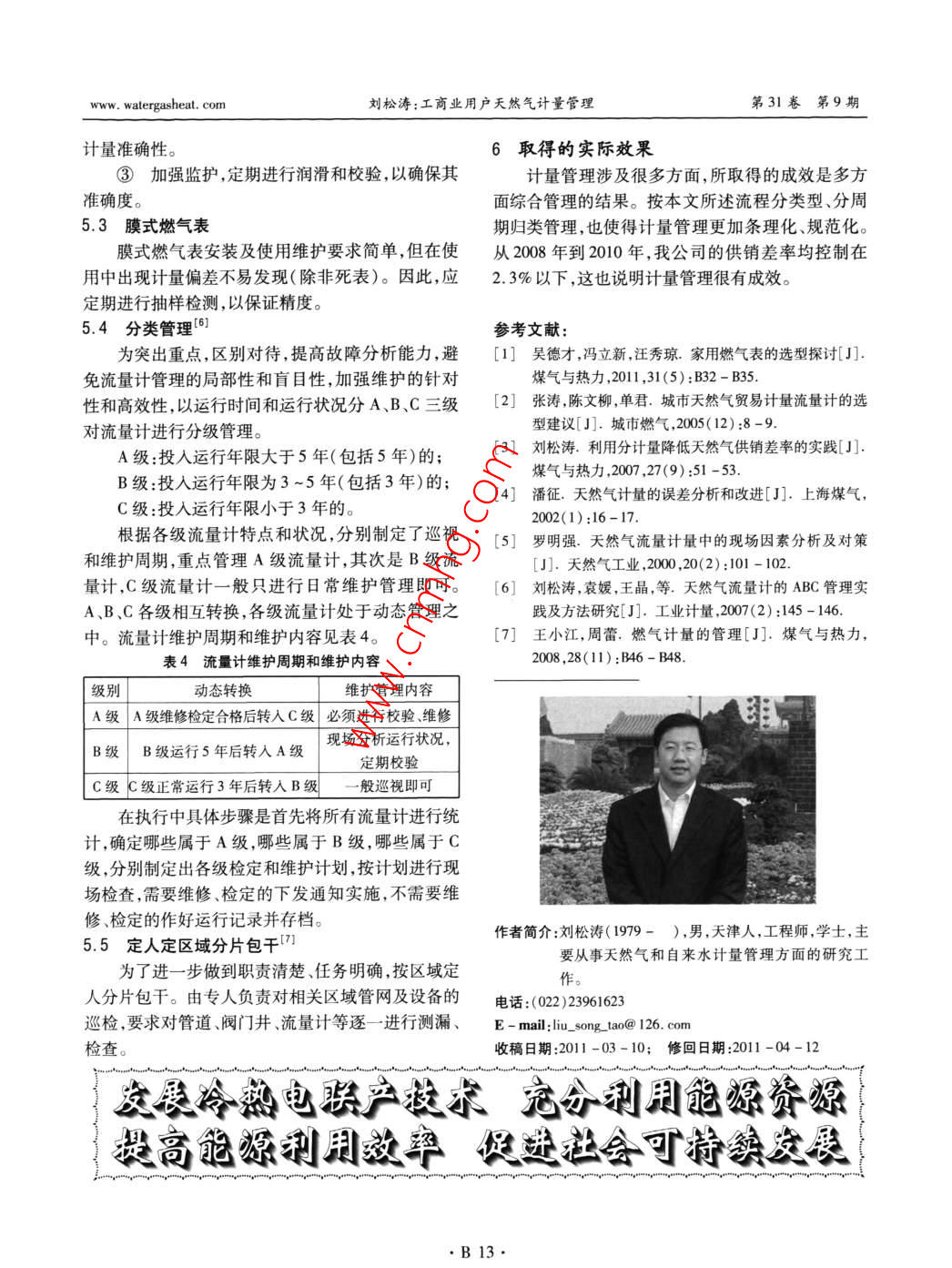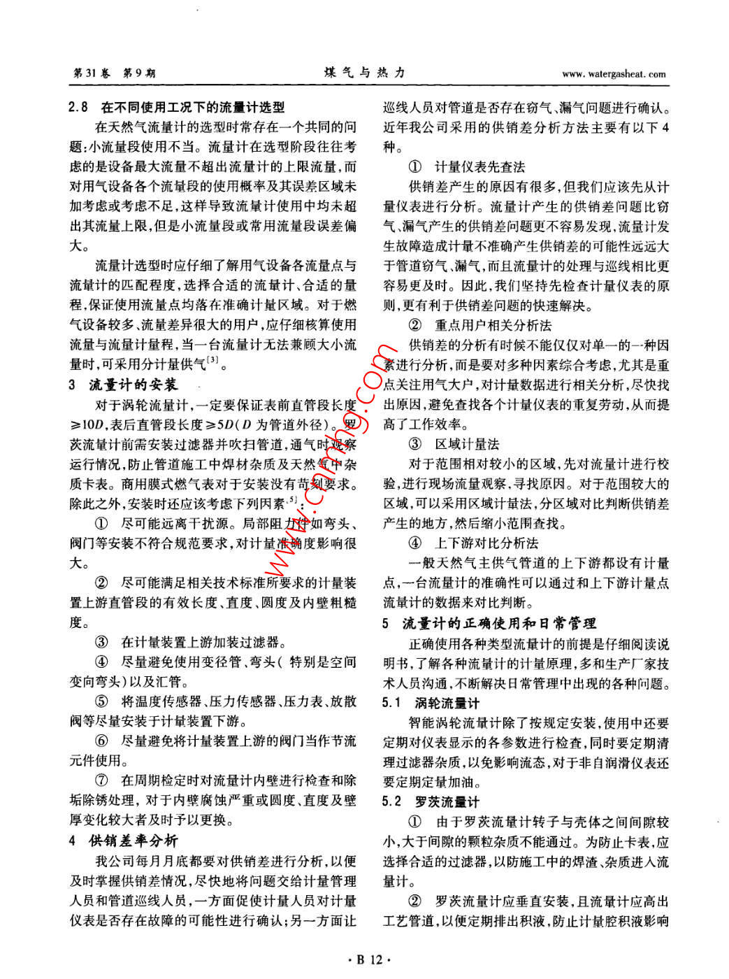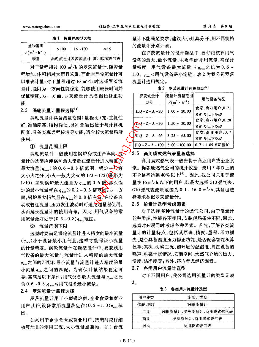 第31卷第9期煤氣與熱力Vol 31 No 92011年9月gas heat工商業(yè)用戶天然氣計(jì)量管理劉松濤(天津市西青經(jīng)濟(jì)開(kāi)發(fā)區(qū)燃?xì)夤?天津300385)摘要:介紹了工商業(yè)用戶天然氣計(jì)量管理的實(shí)際經(jīng)驗(yàn),包括流量計(jì)選型、安裝、誤差分析、日常管理。實(shí)踐表明,這些經(jīng)驗(yàn)在控制供銷(xiāo)差率方面取得了良好的效果。關(guān)鍵詞:流量計(jì)選型;渦輪流量計(jì);羅茨流量計(jì);計(jì)量管理中圖分類(lèi)號(hào):TU996文獻(xiàn)標(biāo)識(shí)碼:B文章編號(hào):1000-4416(2011)09-0B10-04Management of Natural Gas Metering for Industriaand commercial customersLIU SongtaoAbstract: The practical experience in management of natural gas metering for industrial and commercial customers is introduced, including selection, installation, error analysis and routine managementof flowmeters. The practice shows that the experience in these areas achieves a good result in control ofthe quantity difference between supply and marketingKey words: selection of flowmeter; turbine flowmeter; Roots flowmeter; metering manag天然氣以其優(yōu)越品質(zhì)獲得廣泛應(yīng)用,但縱觀燃西青開(kāi)發(fā)區(qū)為了保護(hù)環(huán)境煤炭早已禁止使用,氣行業(yè),供銷(xiāo)差率大是很多燃?xì)夤舅媾R的問(wèn)題。隨著燃油價(jià)格的不斷提高,天然氣就成為企業(yè)生產(chǎn)、筆者在天津市西青經(jīng)濟(jì)開(kāi)發(fā)區(qū)燃?xì)夤矩?fù)責(zé)天然氣供暖和生活的主要能源。在2003年以前,這些用氣計(jì)量管理工作10余年,通過(guò)不斷總結(jié)改進(jìn),取得相企業(yè)一般一個(gè)企業(yè)安裝一個(gè)燃?xì)庹{(diào)壓箱,流量計(jì)安對(duì)較好的實(shí)際效果。裝在調(diào)壓箱內(nèi),實(shí)行總表計(jì)量,每月的供銷(xiāo)差率都在1公司天然氣貿(mào)易計(jì)量現(xiàn)狀12%以上。隨著開(kāi)發(fā)區(qū)的快速發(fā)展和用氣企業(yè)的迅天津市西青經(jīng)濟(jì)開(kāi)發(fā)區(qū)燃?xì)夤疚挥谔旖蚴心纤僭龆喙╀N(xiāo)差率大成為燃?xì)夤咎潛p的主要原因部,西青開(kāi)發(fā)區(qū)內(nèi)共有企業(yè)700多家,大多為外商獨(dú)之一。為此公司于2003年成立計(jì)量管理部,專(zhuān)門(mén)資企業(yè),擁有寶潔松下等世界500強(qiáng)企業(yè)19家,供負(fù)責(zé)天然氣計(jì)量管理。氣區(qū)域面積約20km2?,F(xiàn)有居民用戶11000多戶2流量計(jì)選型約占總用氣量的2%,工商業(yè)用戶445家,約占總用2.1表型管理氣量的98%左右。居民用氣安裝民用膜式C卡為方便表型管理,通過(guò)多年使用考察,逐步將流表,擁有民用灶和熱水器的用戶安裝G2.5燃?xì)獗?量計(jì)供應(yīng)廠家統(tǒng)一,即渦輪表只選擇一個(gè)廠家同系列,羅茨表選擇一個(gè)廠家同一系列,并于本地或附僅擁有民用灶的用戶安裝G1.6燃?xì)獗?只要保證燃?xì)獗碣|(zhì)量和維修更換及時(shí)并做好防盜氣措施近設(shè)有辦事處,這樣方便零配件供應(yīng)和及時(shí)維修。2.2依據(jù)量程選擇表型般來(lái)說(shuō)問(wèn)題不大。因此,本文重點(diǎn)介紹工商業(yè)用依據(jù)量程選擇表型,經(jīng)過(guò)多年的實(shí)際操作,總體戶計(jì)量管理方面的經(jīng)驗(yàn)。效果較好,具體選型見(jiàn)表1B10www.watergasheat.com劉松濤:工商業(yè)用戶天然氣計(jì)量管理第31卷第9期表1按量程表型選擇量計(jì)不能滿足要求,建議大小灶具分開(kāi),用不同規(guī)格量程范圍>10016-100的流量計(jì)分別計(jì)量。≤16/(m3·h-1)在羅茨流量計(jì)的設(shè)計(jì)選型中,要仔細(xì)核算用氣表型咼輪流量計(jì)羅茨流量計(jì)商用膜式燃?xì)獗怼乖O(shè)備的最大最小流量,主要考慮常用流量確保計(jì)對(duì)于量程超過(guò)100m3/h的羅茨流量計(jì)隨著量量精度。用氣設(shè)備最大流量與q=之比為0.6~程增加體積相對(duì)大而且笨重,而此時(shí)渦輪流量計(jì)可1.0。qm<用氣設(shè)備最小流量。表2為我公司羅茨以準(zhǔn)確計(jì)量;對(duì)于量程超過(guò)16m3/h時(shí)選擇羅茨流流量計(jì)選用規(guī)定量計(jì),是因?yàn)橐环矫嫘阅芊€(wěn)定,能夠使用較長(zhǎng)時(shí)間并表2羅茨流量計(jì)選用規(guī)定31保證精度,另一方面,羅茨流量計(jì)具備溫壓修正功羅茨流量計(jì)流量計(jì)流量范圍用氣設(shè)備情況能型號(hào)/(m3·h123渦輪流量計(jì)量程選擇21食堂、商業(yè)用戶、0.21JLQ-Z-A-201.00~20MW及以下鍋爐渦輪流量計(jì)具備測(cè)量范圍(量程比)寬、重復(fù)性食堂、商業(yè)用戶、0.28好準(zhǔn)確度高結(jié)構(gòu)輕便脈沖量輸出便于與計(jì)算機(jī)1Q-z-A-3011.0-300MW及以下鍋爐配套、具備實(shí)現(xiàn)遠(yuǎn)程傳輸?shù)裙δ?適合較大流量場(chǎng)所食堂,商業(yè)用戶、0.7JQ-Z-A-653.25-65.00使用。MW及以下鍋爐①流量范圍上限JQ-Z-A-1005.00~100.000.7-1.05MW鍋爐渦輪流量計(jì)一般使用在鍋爐房或生產(chǎn)車(chē)間,流2.5商用膜式燃?xì)獗砹砍踢x擇量計(jì)的選型應(yīng)使鍋爐最大流量在流量計(jì)進(jìn)入精度的商用膜式燃?xì)獗硪话惆惭b于商業(yè)用戶或企業(yè)食最大流量(q灬)的0.6~0.8倍范圍。鍋爐一般有堂。據(jù)各地燃?xì)夤镜慕y(tǒng)計(jì)數(shù)據(jù),使用5年以上的大小火之分,小火一般為大火的1/3-1/2(最小為不合格率達(dá)到40%以上。因此我公司只用于流/10),如果鍋爐最大流量為qm的0.6倍,那么鍋量在16mh以下的用