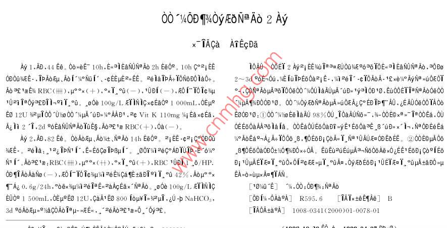 0040B啊%y[NA2Ax lACa AlEcDaAy1.AB,44Ee。00eE1oh,Es3 I EaNUN Ao2hEe0。。1hg°2i10A0002A2E1300963610Ew自aNA,30B000%E·,A0即μ、AO「1°和、cE2E,2la印pA:N60a00E=0u, EquIpE60a21E…,2e·cI0A0A-1 AxeMAn00A01aE%RBC(卌),μ°°x(+),°%(-),10D(-),f°-, CON AO uA3610000U1 fAunA"uDn1y310013, EuooEt Ta na ao00102i10y01-iT°。,oe100g/L. ETIN ICxcEa0910m1,0 Eu D0013。000 y HONAOHA0EAcE們A,dEA00e00TA0E0 12U M2ul00'U1 0 004HA'uDnyoAAD1 2c Vit K 110mg Wi Ea xc Ea. E00D10: 0004%20 Ee iaAU 98%ou. 10aAUNo ".%-00E0xan100Ea0U點(diǎn)n2T,2d° EaNUNa AO IOE,Ao1aRBC(+),0a(OE Eo0aAA3o ia ia. 00EaoUEo y E1 E00aEB'uDnx'i- Na od Ee EaAy2,AD,82。00A和、A、NA14hE0,2E-c21c°0009 AOEa a100、B,6 Di co l, Na10A0EbE。②0EA0E。a:,12 L INTI,Es6 Co lPB「。、0婚2ATUp·E6。,80E60a0D0±80D0x+0A。EE2EμA3-N600 exo iEE' EoDi Ca°EN「。A1:RBC(卌),p°x(+),°x1.°0(+),RBC1011,6/HP.B10E距T,°00x02死T°0A,0yDE6B;10E°±B型0AAaN(-),陽c和始2 e Eta9142%,Ap°°xEA0uxAa們A「AE0.6g/24h,°0ex知ki?e1aEn2 aAcEax NaAo。,o0e10g/LiNc[10知0E]“,00:0:NA0E009 1 500mlOEu E0 12U CaA1 Eo 800 iou* yul. iUb NaHCOOD A R5956 [TATxteESAed9A死μ。9aAb但μ-正E,2白A③E10。y3AOA±a°A]1008-0341(2000)01-0078-01