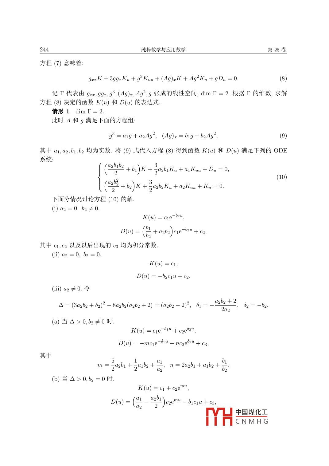 2012年4月純粹數(shù)學(xué)與應(yīng)用數(shù)學(xué)第28卷第2期Pure and Applied MathematicsVol 28 No. 2擬線性熱方程的函數(shù)分離變量解婁丹,謝離麗(西北大學(xué)數(shù)學(xué)系,陜西西安710069)摘要:用群狀結(jié)構(gòu)法研究擬線性熱方程的分離變量解,對于允許和型分離變量解的二階擬線性熱方程給出了一個完整的分類.說明了一些帶有函數(shù)類型反應(yīng)項的方程具有函數(shù)分離變量解,推廣了前人的結(jié)論關(guān)鍵詞:函數(shù)分離變量解;群狀結(jié)構(gòu)法;擬線性熱方程中圖分類號:O175.,2文獻(xiàn)標(biāo)識碼:A文章編號:1008-5513(2012)02-0242051引言本文研究帶有反應(yīng)項的擬線性熱方程ut=(K(uur)x+A(ak(uux+ D(u)的函數(shù)分離變量解,其中K(u),D(u)均為足夠光滑的函數(shù).分離變量法是用來解決數(shù)學(xué)物理中的帶有初邊值條件偏微分方程的有效方法.李點對稱的方法在帶有變系數(shù)的線性偏微分方程的分離變量解的研究中扮演了十分重要的作用2.對非線性的偏微分方程而言,一個自然的問題就是它們是否存在分離變量解.因此,研究非線性偏微分方程的分離變量解是有意義的例如文獻(xiàn)⑧3對帶有熱源項的非線性反應(yīng)-擴(kuò)散方程ut=(D(u)ur)x+ B()Q(u), Bxt0的函數(shù)分離變量解作了具體的研究對于(n+1)維非線性偏微分方程E(t, . u, ux, ut, Urr, Uxt, utt, ..)=0,(2)這里u=u(x,t)C=C( 1, 2,如果方程(2)有形如u=φ(x)+v(t)的解,稱之為和形式的分離變量解;如果方程(2)有形如u=φ(x)(t)的解,則稱之為乘積形式分離變量解如果方程(2)有形如f(u)=g?(x)+v(t)的解,這里f(u)≠t,f(u)≠lnu,稱之為函數(shù)分離變量解.研究表明許多非線性偏微分方程有函數(shù)分離變量解.收稿日期:2011-0基金項目:國家自然科學(xué)基金(10671156)作者簡介:婁丹(1985-),碩士生,研究方向:偏微分方程中國煤化工CNMHG第2期婁丹等:擬線性熱方程的函數(shù)分離變量解243文獻(xiàn)⑧35]中分別研究了方程:ut=(D(uux)x+ b(a)Q(u)utt=(D(uuc)x+b(aQ(a)ut=(A()D(uux)x+ B(a)Q(u)的函數(shù)分離變量解下面將討論帶有反應(yīng)項的擬線性熱方程(1)的函數(shù)分離變量解2群狀結(jié)構(gòu)法如果方程(2)中的E不顯含t,則設(shè)vx=G(x,),u=F(x,u)運用群狀結(jié)構(gòu)法間,得到如下方程組Fr+GF= FGEF.G. F.gm F.G為了獲得方程(2)的函數(shù)分離變量解,令G(x,u)=9(x)h(u),從(3)式第一個方程可以解出F(x,w),得F(x,)=h(u)f(7)(t)=h(sg(y)dy, n(t)=f(n)從而得到如下形式的函數(shù)分離變量解:H(u)=(y)dy +n(t)3擬線性熱方程的函數(shù)分離變量解下面考慮方程(1),根據(jù)群狀結(jié)構(gòu)法理論,把G(x,u)=g(x)h(u),F(x,u)=h(u)f(n)代入到方程(1)中得到∫滿足f= gxK+9(Kh)u+AgK+這里方程(1)具有(5)式確定的函數(shù)分離變量解注意到∫是不依賴x的函數(shù),于是對(6)式兩邊關(guān)于x進(jìn)行微分,得到gxak+ gaghKu+2gg (Kh)u+(Ag)xK +9 (Kh)uh+Ag+ gDu gDh=0.(7)這里考慮h(ω)=1的情況,此時方程(1)有和型的分離變量解:H(u)=t=/9()dy+m(t)中國煤化工CNMHG244純粹數(shù)學(xué)與應(yīng)用數(shù)學(xué)第28卷方程(7)意味著:gxrK+3gg Ku+g Kuu+(Ag)xk+Ag Ku+記r代表由9x,99,g3,(4g)x,Ag2,g張成的線性空間,dim=2.根據(jù)r的維數(shù),求解方程(8)決定的函數(shù)K(u)和D(u)的表達(dá)式情形1dimT=2此時A和g滿足下面的方程組+a2 Ag,(Ag)x=b19+b2 Ag其中a1,a2,b1,b2均為實數(shù).將(9)式代入方程(8)得到函數(shù)K(u)和D(u)滿足下列的ODE系統(tǒng)/a2b162bKu+ajKa+ d)K+5a202Ku+akU+Ku=0下面分情況討論方程(10)的解0,b2≠0K(u)=C1+a202 C1e 02u+其中c1,c2以及以后出現(xiàn)的c3均為積分常數(shù).(i)a2=0,b2=0K(u)D()=-b2C1+c2(i)2≠0.令△=(3a2b2+b2)2-8a2b2(a2b2+2)=(a2b2-2)2,61a2b2+262=-b2≠0時K(u)d(u其中12a2b1+a1b2bK())c2emu-b1c1u+中國煤化工CNMHG第2期婁丹等:擬線性熱方程的函數(shù)分離變量解245其中(c)當(dāng)△=0時K(u)=(c1+c2u)e2,D(u)=-(mc1 +nc2)e-o1u-mc2ue 2u+c3,其中m= a2b1bb2b, n=2a情形2dimr=3此時A和g滿足下面的方程組g9x=019+a2°+a3Aq(11)(Ag)x=b19+b293+b3其中a1,a2,a3,b1,b2,bg均為實數(shù).將(11)式代入方程(8)得到函數(shù)K(u)和D()滿足下列的ODE系統(tǒng)b3+b3)K+(3a3+1)Kn=0,(2a2+a3b2+b2)K+302Kn+Kn=0,(12)+a301+b1)K+3a1Ku+ Du=0下面分情況討論方程(12)的解.令(i)當(dāng)△>0時,分以下幾種情況:(a)a2=0,b2≠0K(u)=cieu +c2e-ouD()=(Ab1-3a1)c(Ab1+3a1)c1e。+e3,其中a3+1(a3+1)62+(303+1)b2=04(b)a2=0,b2=0D()=-(a1a2+b33其中a3=-3,b3=02(c)a2≠0,b2=0.K()D(u)=mc1e-a2+nc2e-2a21中國煤化工CNMHG246純粹數(shù)學(xué)與應(yīng)用數(shù)學(xué)第28卷其中2a2(i)當(dāng)△<0時,K(u)=ea(c1 cos(Bu)+C2 sin(Bu)),C1入-C26C2)+C13+B2其中入2a1a2+=b14結(jié)論本文利用群狀結(jié)構(gòu)法討論了擬線性熱方程的函數(shù)分離變量解問題.結(jié)論是對于某些具有函數(shù)類型反應(yīng)項的方程,能得到函數(shù)分離變量解.參考文獻(xiàn)[1 Bluman G W, Kuwei S Symmetries and Differential Equation M. New York: Springer, 19892 Miller W. Symmetry and Separation of Variables(M. Reading: Addison-Wesley, 1977.3 Qu C Z, Zhang S L. Group foliation method and functional separation of variables to nonlinear diffusionequation J]. Chin. Phys. Lett., 2005, 22(7): 1563-15664 Qu C Z, Zhang S L. Extended group foliation method and functional separation of variables to nonlinearwave equations[J]. Commun. Theor. Phys., 2005, 44: 577-5825 Hu J Y, Qu C Z, Yin Hui. Functional separable solutions to nonlinear diffusion equations by group foliationmethod J. Commun. Theor. Phys., 2007, 47: 193-1996]左蘇麗.運用群狀結(jié)構(gòu)法求非線性波方程的函數(shù)分離變量解門J.