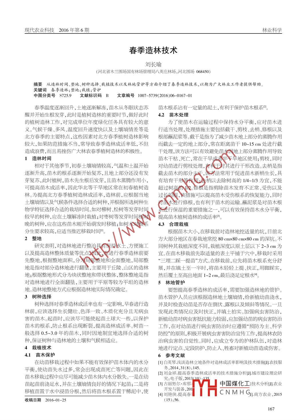 現(xiàn)代農(nóng)業(yè)科技2016 年第6期林業(yè)科學(xué)春季造林技術(shù)劉長瑜(河北省木蘭圍場國有林場管理局八英莊林場,河北圍場068450)摘要從造林時(shí)間、整地樹種選擇、栽植技術(shù)以及林地管護(hù)等方面介紹了春季造林技術(shù),以期為廣大林業(yè)工作者提供幫助。關(guān)鍵詞春 季造林;整地;栽植;管護(hù)中圖分類號S725.9 文 獻(xiàn)標(biāo)識碼B文 章編號1007- -5739(2016)06- -0167-01春季溫度逐漸回升,土地逐漸解凍,苗木從冬眠狀態(tài)蘇苗木根系沾有 - -定量的泥土,有利于保護(hù)苗木根系明。醒并開始生根發(fā)芽,此時(shí)是植樹造林的重要時(shí)節(jié),做好此時(shí)4.2 苗木處理的植樹造林工作,對完成單位年度綠化任務(wù)具有較大的意為了使苗木在運(yùn)輸過程中保持水分平衡,應(yīng)對苗木進(jìn)義。氣候干燥、多風(fēng)、溫度回升速度快以及土壤墑情差等是行適 當(dāng)處理,處理措施主要包括截干剪枝、去梢、修根以及北方春季的主要特點(diǎn),這些因素對北方春季植樹造林影響根部蘸泥漿等 。截干是指為了減少苗木地上部分的蒸騰作用較大,如果防范措施不當(dāng),常導(dǎo)致春季造林成活率低,不但而截去一 -定的地上部分,常在距離苗干10~ 15 cm處進(jìn)行截造成浪費(fèi),而且易挫傷廣大林農(nóng)春季植樹造林的積極性。干處理,該方法可以有效避免苗木因地上部分蒸騰作用導(dǎo)致1造林時(shí)間苗木干枯、死亡,常在千旱或者半干旱地區(qū)使用;剪枝,同時(shí)相對于其他季節(jié),初春土壤墑情較高,氣溫和土溫開始對幼苗進(jìn)行剪枝處理 ,有利于對其進(jìn)行干形改造。去梢是指逐漸升高,苗木的根系逐漸開始復(fù)蘇,且地上部分還沒有發(fā)截去苗 木的部分主干,該方法常用于促進(jìn)苗木新梢生長,具芽復(fù)蘇,此時(shí)植樹,苗木先生根后發(fā)芽,且苗木蒸騰作用小,有培 育干形等作用;去梢以去除樹高的1/4~1/3 為宜,不能可提高苗木成活率,因此華北等干早地區(qū)常在初春植樹造超過樹高的1/2。 修根是指剪除苗木發(fā)育不正常受傷以及林。為提高北方春季植樹造林成活率,造林前,應(yīng)根據(jù)當(dāng)?shù)剡^長的根, 該措施可以提高苗木受傷根系的恢復(fù)能力,同時(shí)土壤墑情以及氣候條件選擇合適的樹種,并根據(jù)所選樹種生對苗木進(jìn)行修根,也有利于苗木的運(yùn)輸。蘸泥漿是對苗木根物學(xué)特征選擇合適的栽培時(shí)間。如對柳樹、松樹等發(fā)芽時(shí)間系進(jìn)行保濕的 重要措施之一, 可以有效保持苗木水分平衡,較早的樹種,應(yīng)在土壤解凍時(shí)栽植;對棗樹等發(fā)芽時(shí)間相對提高苗木植樹造林的成活率。晚的樹種,應(yīng)在這些苗木剛開始萌發(fā)時(shí)移植;如樹木對根系4.3 合理栽植分生要求較高,應(yīng)適當(dāng)推遲移栽時(shí)間"。根據(jù)苗木大小,在移栽前對造林地挖適量的坑,目前北2整地方大部分地區(qū)在春栽地常挖80 cmx80 cmx80 cm的深坑。不研究表明,對造林地進(jìn)行整治具有保持水土、方便施工同樹種其栽植深度不同,栽植深度以原土層以下2~3 cm為以及提高造林整體質(zhì)量等優(yōu)點(diǎn)。因此,在進(jìn)行春季造林前要宜。 在苗木移栽前先取適量的表土平鋪于穴中,移栽時(shí)采用先整地,根據(jù)整地面積,分為局部整地和全面整地,局部整“三埋二踩一提苗”方式。在移栽前,應(yīng)先將苗木根系充分舒地是指對部分造林地進(jìn)行翻墾,主要用于丘陵、山區(qū)的造林展, 并在填土至- -半時(shí), 將苗木輕輕上提、扶正,用腳踩實(shí),地;根據(jù)整地形式分為塊狀整地和帶狀整體,整體整地是指然后覆 土至高出地面1~2 cm,最后澆足定根水田。對造林地進(jìn)行全面翻墾,主要用于平原等較為平坦的造林5 林地管護(hù)地。造林地整地方式應(yīng)根據(jù)造林地實(shí)際情況確定。要想提高春季造林的成活率,需要加強(qiáng)造林地的管護(hù)。3樹種選擇苗木管護(hù)人員應(yīng)該根據(jù)造林地土壤墑情,給新植幼苗澆水,樹種選擇對春季造林成活率也有一-定影響, 早春進(jìn)行造并及時(shí)檢查幼苗 是否存在倒伏露根以及傾斜等情況。一-旦林前,應(yīng)該選擇生長健壯、色澤-致、木質(zhì)化充分且無病蟲發(fā) 現(xiàn)此類情況應(yīng)及時(shí)扶正,并填土拍實(shí)。加強(qiáng)病蟲害防治,害的苗木。起苗時(shí),應(yīng)該盡可能使起苗土球大-些,以保護(hù)新植幼苗對病蟲害 抵抗能力較弱,應(yīng)加強(qiáng)幼苗的病蟲害防治苗木的根系,防止根系出現(xiàn)斷裂,提高造林成活率。樹苗一工作,在對幼苗進(jìn)行病蟲害防治時(shí)應(yīng)遵循“預(yù)防為主、科學(xué)般選擇0.5~3.0年的苗木,同時(shí)因地制宜地選擇合適的樹防控”的原則,積極開展病蟲害害防治宣傳 工作,提高林農(nóng)防種,保證樹種與造林地的土壤和氣候相適應(yīng)。治病蟲害的自覺性。同時(shí),應(yīng)成立專為的護(hù)林隊(duì)伍,對造林4栽植技術(shù)地進(jìn)行定點(diǎn)、定段防護(hù),防止人、牲畜對新植幼苗造成傷害。4.1 苗木保護(hù)6參考文獻(xiàn)在幼苗移栽過程中如果不能有效保護(hù)苗木體內(nèi)的水分[1] 白英琴.淺談造林立地條件對造林成活率影響及技術(shù)措施D.農(nóng)技服平衡,使幼苗失水過多,常會出現(xiàn)成苗死亡等問