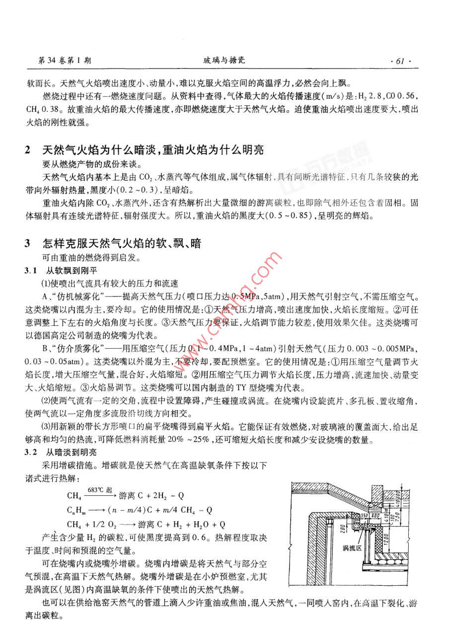第34卷第1期玻璃與搪瓷ol. 34 No I2006年2月glass enamelFeb.2006天然氣火焰孫承緒(華東理工大學(xué)材料科學(xué)與工程學(xué)院,上海200237)摘要:從燃料的組成和燃燒過程以及燃燒產(chǎn)物的成份,分析了天然氣火焰與重油火焰相比較,具有軟、飄、暗的原因,提出了克服這些弊端的方法。關(guān)鍵詞:天然氣;火焰;霧化;增碳中圖分類號:Tq171.6*22文獻(xiàn)標(biāo)識碼:B文章編號:1000-2871(2006)01-0060-02Flame of Natural GasSUN Cheng-xu不同燃料釆用不同的燃燒方式,會(huì)產(chǎn)生不同特性的火焰。不同窯型熔制不同的玻璃,會(huì)對火焰提出不同的要求。作為窯爐工作者,應(yīng)該了解這兩頭,即產(chǎn)生怎樣的火焰和需要什么樣的火焰;還要設(shè)法從噴嘴結(jié)構(gòu)、燃燒技術(shù)等方面使產(chǎn)生的火焰滿足需要。這樣,窯爐才能順利運(yùn)行,取得良好效果。所以,研究火焰熔窯的核心問題之一是火焰。天然氣火焰的特點(diǎn)是軟、飄、暗,或者說是軟飄無力(無剛性)、暗淡無光。它與剛、平(方向性好)、亮,或者說是剛直有力、明亮發(fā)光的重油火焰特點(diǎn)正好相反。顯然,這是不符合玻璃熔窯要求的。1天然氣火焰為什么軟、飄,重油火焰為什么剛、平要從燃料的組成和燃燒過程來看。重油是長鏈碳?xì)浠衔?。玻璃熔窯內(nèi)通常采用霧化燃燒法,燃燒過程是:重油霧化→油滴蒸發(fā)→油霧與空氣混合→著火燃燒。其中霧化階段是燃燒過程的關(guān)鍵。根據(jù)霧化機(jī)理,重油霧化有兩種方式。一是機(jī)械霧化,它是將重油加以高壓(一般為1~3.5MPa,1035am)以較大的速度并以旋轉(zhuǎn)運(yùn)動(dòng)的方式從小孔噴入氣體空間使油霧化,噴出的火焰瘦長、剛性較好;二是介質(zhì)霧化,它是利用一定角度高速噴出的霧化介質(zhì)使油流股分散成細(xì)霧。通常我們采用高壓霧化,霧化介質(zhì)多用壓縮空氣,壓力為0.1-0.7MPa(1-7am),流速為300~400m/s,屬高壓氣體的流出,有一定動(dòng)量。用預(yù)熱的壓縮空氣霧化時(shí),不僅能保持油粘度不變,還能加快霧化介質(zhì)流速和提高火焰溫度。此時(shí)噴出的火焰較短,剛性較強(qiáng)。具有較強(qiáng)剛性的火焰在噴出方向有相當(dāng)沖力(由動(dòng)量轉(zhuǎn)變),克服了促使其向上彎曲(飄)的浮力。所以,重油火焰的方向性好,可以貼液面平射天然氣是以甲烷為主的烷烴類氣體。天然氣在大氣中的燃燒是擴(kuò)散式燃燒。燃燒過程是:天然氣與空氣混合→著火燃燒。其中混合是燃燒過程的關(guān)鍵?;旌闲ЧQ于五要素:①)兩氣流的溫度,2兩氣流的質(zhì)量,(3兩氣流的相對速度,(4)兩氣流的相交角度,⑤5兩氣流的接觸情況。擴(kuò)散式燃燒時(shí),天然氣與空氣兩氣流的情況是:沒有經(jīng)過預(yù)熱,體積差大(1份天然氣燃燒約需10份空氣),密度差較大(天然氣與空氣的密度差為0.58~0.62:1),相對速度和交角小,相遇時(shí)無渦流。所以,單純的擴(kuò)散燃燒混合不良,燃燒不完全,火焰收稿日期:2005-09-23第34卷第1期玻璃與搪瓷6/軟而長。天然氣火焰噴出速度小、動(dòng)量小,難以克服火焰空間的高溫浮力,必然會(huì)向上飄。燃燒過程中還有一燃燒速度問題。從資料中査得,氣體最大的火焰?zhèn)鞑ニ俣?m/s)是:H2.8,C00.56CH0.38。故重油火焰的最大傳播速度,亦即燃燒速度大于天然氣火焰。迫使重油火焰噴出速度要大,噴出火焰的剛性就強(qiáng)。2天然氣火焰為什么暗淡,重油火焰為什么明亮要從燃燒產(chǎn)物的成份來談。天然氣火焰內(nèi)基本上是由CO2水蒸汽等氣體組成屬氣體輻射,具有間斷光譜特征,只有幾條較狹的光帶向外輻射熱量,黑度小(0.2~0.3),呈暗焰。重油火焰內(nèi)除CO2、水蒸汽外,還含有熱解析出大量微細(xì)的游離碳粒,也即除氣相外還包含著固相。固體輻射具有連續(xù)光譜特征,輻射強(qiáng)度大。所以,重油火焰的黑度大(0.5-0.85),呈明亮的輝焰。3怎樣克服天然氣火焰的軟、飄、暗可由重油的燃燒得到啟發(fā)3.1從軟飄到剛(1)使噴出氣流具有較大的壓力和流速A、“仿機(jī)械霧化”——提高天然氣壓力(噴口壓力達(dá)0.5MPa,5atm),用天然氣引射空氣,不需壓縮空氣這類燒嘴以內(nèi)混為主,要冷卻。它的使用情況是:①天然氣壓力增高,噴出速度加快,火焰長度縮短。②可任意調(diào)整上下左右的火焰角度與長度。③天然氣壓力要保證,火焰調(diào)節(jié)能力較差,使用效果欠佳。這類燒嘴可以德國高定公司制造的燒嘴為代表。B、“仿介質(zhì)霧化”—用壓縮空氣(壓力0.1~0.4MPa,1-4atm)引射天然氣(壓力0.003~0.005MPa0.03-0.05am)。這類燒嘴以外混為主,不要冷卻,要配預(yù)燃室。它的使用情況是:①用壓縮空氣量調(diào)節(jié)火焰長度,增大壓縮空氣量,混合好,火焰縮短。②用壓縮空氣壓力調(diào)節(jié)火焰長度,壓力增高,流速加快、動(dòng)量變大、火焰縮短。③火焰易調(diào)節(jié)。這類燒嘴可以國內(nèi)制造的TY型燒嘴為代表。(2)使兩氣流有一定的交角,流程中設(shè)置障礙,產(chǎn)生碰撞或渦流。在燒嘴內(nèi)設(shè)旋流片、多孔板、置收縮角,使兩氣流以一定角度多流股沿切線方向相交(3)用新穎的帶長方形噴口的扁平燒嘴得到扁平火焰。它能保證有效燃燒,對玻璃液的覆蓋面大,給岀足夠高和均勻的熱流,可降低燃料消耗量20%-25%,還可縮短火焰長度和減少安設(shè)燒嘴的數(shù)量。3.2從暗淡到明亮采用增碳
