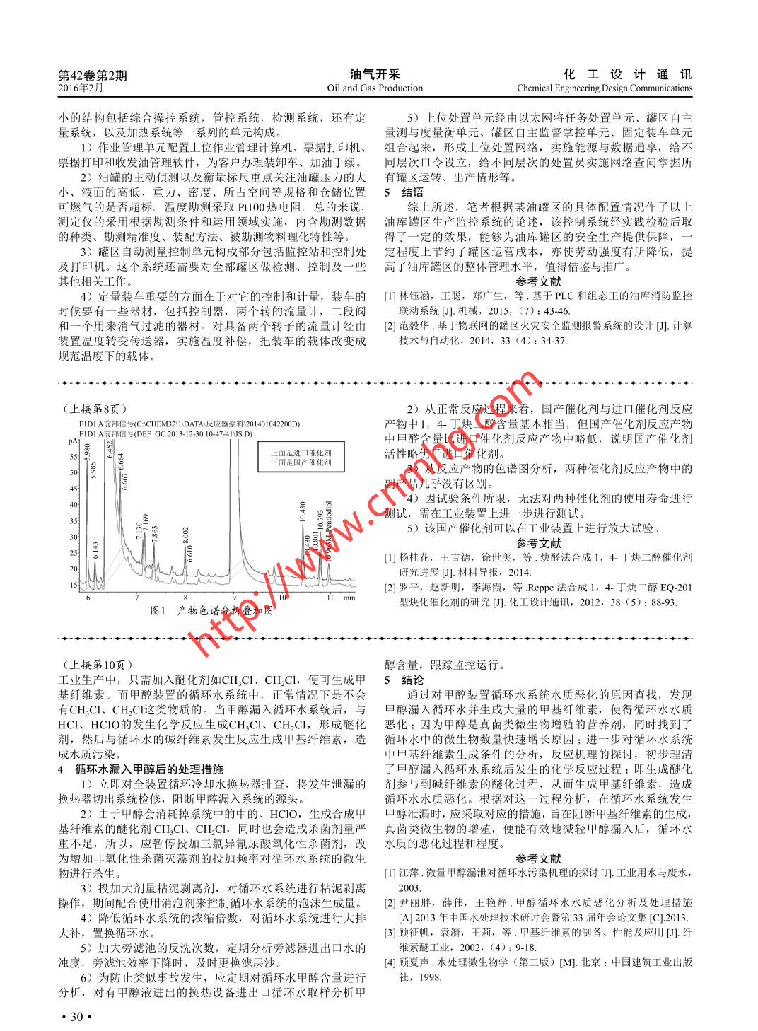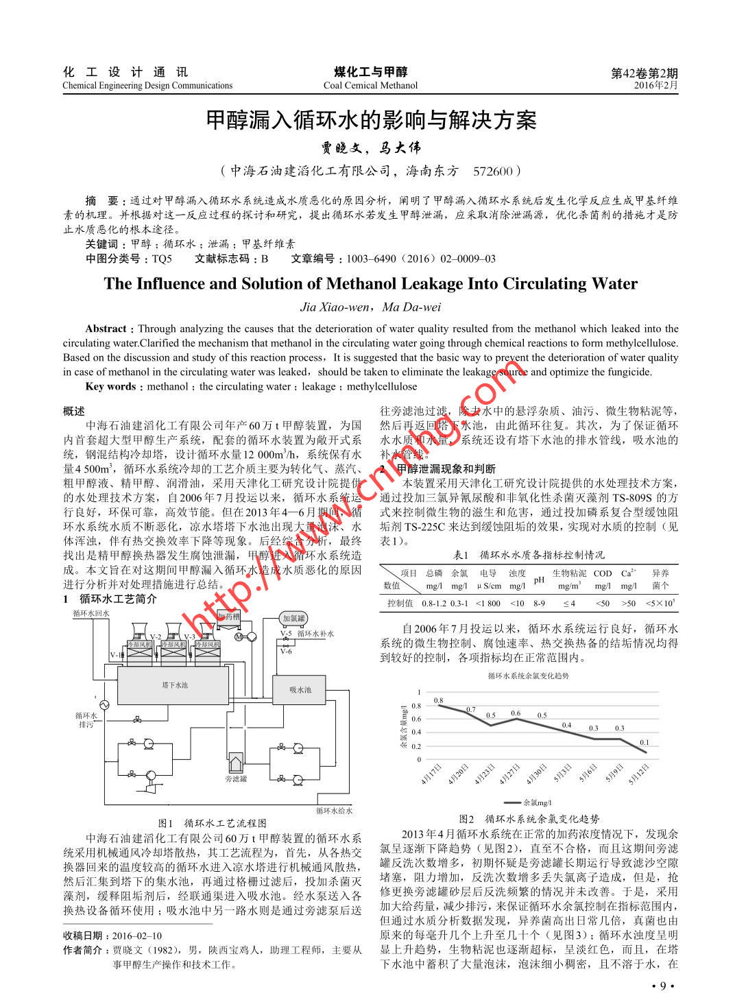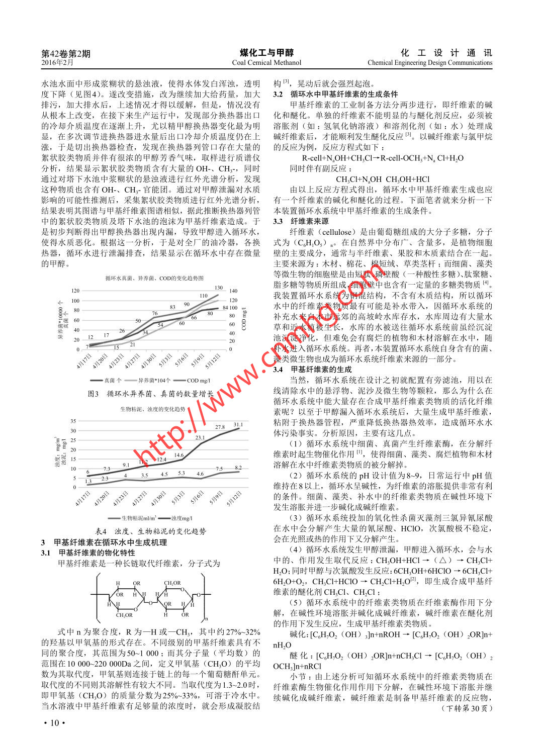 化工設(shè)計通訊煤化工與甲醇第42卷第2期Chemical Engineering Design CommunicationsCoal Cemical Methanol2016年2月甲醇漏入循環(huán)水的影響與解決方案賈曉文,馬大偉(中海石油建滔化工有限公司,海南東方 572600)摘要:通過對甲醇漏入循環(huán)水系 統(tǒng)造成水質(zhì)惡化的原因分析,闡明了甲醇漏入循環(huán)水 系統(tǒng)后發(fā)生化學(xué)反應(yīng)生成甲基纖維.素的機理。并根據(jù)對這一反應(yīng)過程的探討和研究,提出循環(huán)水若發(fā)生甲醇泄漏,應(yīng)采取消除泄漏源,優(yōu)化殺菌劑的措施才是防止水質(zhì)惡化的根本途徑。關(guān)鍵詞:甲醇;循環(huán)水;泄漏;甲基纖維素中圖分類號: TQ5文獻標志碼:B文章編號: 1003- 6490 (2016) 02- 0090 03The Influence and Solution of Methanol Leakage Into Circulating Wateria Xic)-wen, Ma Da-weiAbstract : Through analyzing the causes that the deterioration of water quality resulted from the methanol which leaked into theBased on the discussion and study of this reaction process, It is suggested that the basic way to prevent the deterioration of water qualityin case of methanol in the circulating water was leaked, should be taken to eliminate the leakage source and optimize the fungicide.Key words : methanol ; the circulating water ; leakage ; methylcellulose概述往旁濾池過濾,除去水中的懸浮雜質(zhì)、油污、微生物粘泥等,中海石油建滔化工有限公司年產(chǎn)60萬t甲醇裝置,為國然后再返回塔下水池,由此循環(huán)往復(fù)。其次,為了保證循環(huán)內(nèi)首套超大型甲醇生產(chǎn)系統(tǒng),配套的循環(huán)水裝置為敞開式系水水質(zhì) 和水量,系統(tǒng)還設(shè)有塔下水池的排水管線,吸水池的統(tǒng),鋼混結(jié)構(gòu)冷卻塔,設(shè)計循環(huán)水量12 000m/h,系統(tǒng)保有水補水 管線。量4 500m',循環(huán)水系統(tǒng)冷卻的工藝介質(zhì)主要為轉(zhuǎn)化氣、蒸汽、2 甲醇 泄漏現(xiàn)象和判斷粗甲醇液、精甲醇、潤滑油,采用天津化工研究設(shè)計院提供本裝置采用天津化工研究設(shè)計院提供的水處理技術(shù)方案,的水處理技術(shù)方案,自2006年7月投運以來,循環(huán)水系統(tǒng)運通過 投加三氯異氰尿酸和非氧化性殺菌滅藻劑TS-809S的方行良好,環(huán)保可靠,高效節(jié)能。但在2013年4--6月期間,循式來控制微生物的滋生和危害,通過投加磷系復(fù)合型緩蝕阻環(huán)水系統(tǒng)水質(zhì)不斷惡化,涼水塔塔下水池出現(xiàn)大量泡沫、水垢劑 TS-225C來達到緩蝕阻垢的效果,實現(xiàn)對水質(zhì)的控制(見體渾濁,伴有熱交換效率下降等現(xiàn)象。后經(jīng)綜合分析,最終表1)。找出是精甲醇換熱器發(fā)生腐蝕泄漏,甲醇進入循環(huán)水系統(tǒng)造表1循環(huán)水水質(zhì)各指標控制情況成。本文旨在對這期間甲醇漏入循環(huán)水造成水質(zhì)惡化的原因二項目 總磷 余氯電導(dǎo)濁度.生物粘泥 COD Ca*”異養(yǎng)進行分析并對處理措施進行總結(jié)。數(shù)值入mg/1 mg/l μS/cm mg/1 mg/m’ mg/l mg/l 菌 個1循環(huán)水工藝簡介控制值0.8-1.20.3-1 <1800 <10 8-9 ≤4<50 >50 <5x10*加藥槽_(加氯罐自2006年7月投運以來,循環(huán)水系統(tǒng)運行良好,循環(huán)水VS循環(huán)水補水系統(tǒng)的微生物控制、腐蝕速率、熱交換熱備的結(jié)垢情況均得到較好的控制,各項指標均在正常范圍內(nèi)。循環(huán)水系統(tǒng)余氯變化趨勢塔下水池吸水池0.8循環(huán)水0.5 0.6_ 0.5排污口0.4).4 0.3 0.3- &Q旁速罐 L&Q循環(huán)水給水圖1 循環(huán)水工藝流程圖圖2循環(huán)水系統(tǒng)余 氯變化趨勢中海石油建滔化工有限公司60萬t甲醇裝置的循環(huán)水系2013年4月循環(huán)水系統(tǒng)在正常的加藥濃度情況下,發(fā)現(xiàn)余統(tǒng)采用機械通,風(fēng)冷卻塔散熱,其工藝流程為,首先,從各熱交氯呈逐漸下降趨勢(見圖2),直至不合格,而且這期間旁濾換器回來的溫度較高的循環(huán)水進入涼水塔進行機械通風(fēng)散熱,罐 反洗次數(shù)增多,初期懷疑是旁濾罐長期運行導(dǎo)致濾沙空隙然后匯集到塔下的集水池,再通過格柵過濾后,投加殺菌滅堵塞,阻力增加,反洗次數(shù)增多丟失氯離子造成,但是,搶藻劑,緩釋阻垢劑后,經(jīng)聯(lián)通渠進入吸水池。經(jīng)水泵送入各修更換旁濾罐砂層后反洗頻繁的情況并未改善。于是,采用換熱設(shè)備循環(huán)使用;吸水池中另一路水則是通過旁濾泵后送加大給藥量,減少排污,來保證循環(huán)水余氯控制在指標范圍內(nèi),但通過水質(zhì)分析數(shù)據(jù)發(fā)現(xiàn),異養(yǎng)菌高出日常幾倍,真菌也由收稿日期: 2016 -02-10原來的每亳升幾個.上升至幾十個(見圖3);循環(huán)水濁度呈明作者簡介:賈曉文(1982),男,陜西寶雞人,助理工程師,主要從顯 上升趨勢,生物粘泥也逐漸超標,呈淡紅色,而且,在塔事甲醇生產(chǎn)操作和技術(shù)工作。下水池中蓄積了大量泡沫,泡沫細小稠密,且不溶于水,在●9●第42卷第2期煤化工與甲醇化工設(shè)計通訊2016年2月Coal Cemical MethanolChemical Engineering Design Communications水池水面中形成漿糊狀的懸濁液,使得水體發(fā)白渾濁,透明構(gòu)叫, 晃動后就會強烈起泡。度下降(見圖4)。遂改變措施,改為繼續(xù)加大給藥量,加大3.2 循環(huán)水中甲基纖維素的生成條件排污,加大排水后,上述情況才得以緩解, 但是,情況沒有甲基纖維素的工業(yè)制備方法分兩步進行,即纖維素的堿從根本.上改