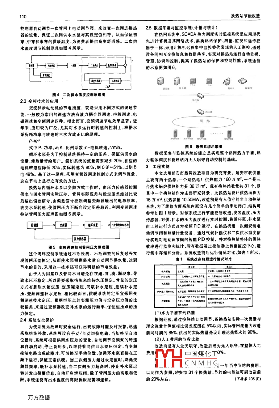 《工業(yè)控制計算機(jī)》2010年第23卷第10期換熱站節(jié)能改造Control of Energy Exchange Station嵇啟春李金(西安建筑科技大學(xué)信息與控制工程學(xué)院,陜西西安710055朱京衛(wèi)(陜西紫光自動化系統(tǒng)工程有限公司,陜西西安710056城市集中供暖已成為我國熱網(wǎng)節(jié)能改造的主要發(fā)展趨勢,采用合理的節(jié)能改措施,以延安城市供熱控制為研究背景,以實(shí)現(xiàn)各換熱站無人值守自動控制、數(shù)據(jù)傳輪、集中監(jiān)控為主要工作,并給出了系統(tǒng)改逵后取得的良好效果。關(guān)鍵詞:換熱站,自動控制,節(jié)能AbstractCity central heating has become a major energy saving heating network trends, this paper reasonable energy-savingmeasures to Yan an city heating control for the research background in order to achieve the heat exchange station auto-matic control, data transmission, centralized monitoring as the main work and transformation of the system is given after thegood results achievedKeywords heat exchange station, automatic control, energy saving城市熱網(wǎng)的熱交換樞紐是換熱站,它發(fā)揮著舉足輕重的作從控制的角度來講,集中供熱換熱站控制系統(tǒng)主要由3個用,要對整個熱網(wǎng)實(shí)現(xiàn)自動控制可以將熱網(wǎng)中的各個換熱站為控制回路。分別是:換熱器二次供水溫度調(diào)節(jié)控制回路;二次供控制小單元,以點(diǎn)及面,實(shí)現(xiàn)整個熱網(wǎng)的自動控制,最終達(dá)到節(jié)回水壓差調(diào)節(jié)控制回路即流量控制;二次回水定壓控制系統(tǒng)。要能的目的實(shí)現(xiàn)熱網(wǎng)的自動控制及未投入自控時存在的問題主要做到以下1換熱站基本的結(jié)構(gòu)與功能幾個方面。簡單地說,一個換熱站就是指熱能交換機(jī)組將熱量從主傳21管網(wǎng)水利平衡系統(tǒng)輸管網(wǎng)系統(tǒng)傳送至熱能用戶方設(shè)施,并聯(lián)結(jié)這兩個系統(tǒng)的樞紐。供暖系統(tǒng)能穩(wěn)定的運(yùn)行,是系統(tǒng)實(shí)現(xiàn)自動控制的前提所以未投入自控控制的換熱站一般有換熱器循環(huán)泵、補(bǔ)水泵、手動首先要解決水利失調(diào)的問題。使用平衡閥可以有效地保證管網(wǎng)調(diào)節(jié)閥等簡單的設(shè)備組成,結(jié)構(gòu)如圖1所示。靜態(tài)水力及熱力平衡,它的工作原理是通過改變閥芯的行程來改變阻力系數(shù)達(dá)到調(diào)節(jié)流量的目的,對于每一環(huán)路只需安裝個平衡閥(安裝于回水管路的直管段上),不需要安裝截止閥,這樣就可以消除個別用戶室溫過低或過高的弊端,并同時達(dá)到節(jié)煤、節(jié)電各15%的目標(biāo);同時,當(dāng)檢測到管網(wǎng)的實(shí)際壓力大于設(shè)圖1未實(shí)現(xiàn)自動控制的換熱站結(jié)構(gòu)圖計壓力時,為保證整個系統(tǒng)仍可穩(wěn)定運(yùn)行,則需要在供暖系統(tǒng)的圖1所示換熱站常存在以下缺點(diǎn):①管網(wǎng)水力失調(diào)熱用戶二次回水管與補(bǔ)水箱之間安裝泄壓閥,更容易實(shí)現(xiàn)水力工況平受熱不均離換熱站近的用戶能達(dá)到甚至超過采暖標(biāo)準(zhǔn)溫度,遠(yuǎn)衡、滿足設(shè)計供水溫度的要求。離換熱站的用戶采暖溫度低不能滿足用戶供熱需求;②二次供22二級網(wǎng)供水溫度控制水溫度難以控制;③系統(tǒng)用電量大等當(dāng)換熱器的二次供水溫度偏離設(shè)定值時,控制調(diào)節(jié)系統(tǒng)就2實(shí)現(xiàn)熱網(wǎng)自動控制的措施自動改變電動調(diào)節(jié)閥的開度,從而改變進(jìn)入換熱器的一次熱媒初步設(shè)計系統(tǒng)結(jié)構(gòu)如圖2所示。的流量,改變傳送到換熱器的熱能,使二次的供水溫度穩(wěn)定在設(shè)定值附近,根據(jù)不同情況,常見的控制方式有經(jīng)驗(yàn)調(diào)節(jié)、分時段調(diào)節(jié)、定溫調(diào)節(jié)。為了做到既經(jīng)濟(jì)運(yùn)行又保證供熱質(zhì)量,可以采用經(jīng)驗(yàn)調(diào)節(jié)方式控制二次供水溫度??刂破鲀?nèi)部設(shè)有氣二次水通度候補(bǔ)償曲線(可由技術(shù)人員根據(jù)本地區(qū)的氣象情況經(jīng)驗(yàn)曲中國煤化工示),分CNMHG溫與二次供水溫度、L次回水溫度與二次供直外品度圖2實(shí)現(xiàn)自動控制的換熱站結(jié)構(gòu)圖水溫度,傳給智能PD圖3溫度補(bǔ)償調(diào)節(jié)曲線換熱站節(jié)能改造控制器自動調(diào)節(jié)一次管網(wǎng)上電動調(diào)節(jié)閥,來改變一次網(wǎng)進(jìn)換熱25數(shù)據(jù)采集與監(jiān)控系統(tǒng)(計量與統(tǒng)計)器的流量,保證二次網(wǎng)供水水溫與其設(shè)定值相符,從而保證初在熱網(wǎng)系統(tǒng)中, SCADA熱力調(diào)度實(shí)時監(jiān)控系統(tǒng)是應(yīng)用現(xiàn)代寒中寒和末寒的供暖溫度,為消費(fèi)者提供高度舒適感。二次供先進(jìn)計算機(jī)及其網(wǎng)絡(luò)技術(shù)集換熱站保護(hù)測量監(jiān)視和遠(yuǎn)傳控水溫度調(diào)節(jié)控制原理如圖4所示制于一體采用計算機(jī)遠(yuǎn)程集中監(jiān)控替代常規(guī)的人工測控通過設(shè)備間相互交換信息和數(shù)據(jù)共享,實(shí)現(xiàn)對換熱站運(yùn)行自動監(jiān)視管理,協(xié)調(diào)和控制,提高了換熱站的保護(hù)和控制性能,系統(tǒng)通信匚款u的示意圖如圖6。器圖4二次供水溫度控制原理圖23變頻技術(shù)的應(yīng)用交流異步電動機(jī)的節(jié