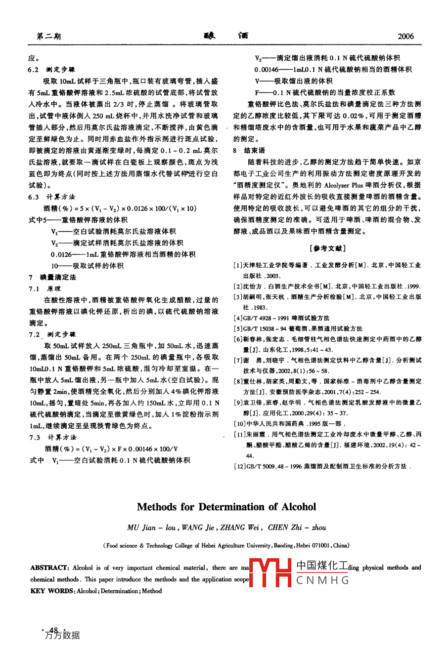第33卷第2期vo.33,No.22006年3月IQUOR MAKINGMar,,2006文章編號:1002-8110(2006)02-0046-03乙醇的測定方法綜述牟建樓,王頡,張偉,陳志周(河北農(nóng)業(yè)大學(xué)食品科技學(xué)院,河北保定071001)摘要:乙醇是一種重要的化工原料,其測定方法很多,主要有物理方法和化學(xué)方法,介紹了乙醇的測定方法和各種方法的適用范國。關(guān)鍵詞:乙醇;測定;方法中圖分類號:0623.41;0656文獻(xiàn)標(biāo)識碼:B乙醇(俗稱酒精)是帶有一個羥基的飽和一元醇,分子式樣品在氣相色譜儀中通過色諧柱時,由于在氣固兩相中C2H3OH。是一種無色透明、易揮發(fā),易燃燒的液體。有酒的吸附系數(shù)不同,而使乙醇與其他組分分離,利用氫火焰離子氣味和刺激的辛辣滋味微甘。比重07893(20/4°)。凝固點化檢測器進(jìn)行鑒定,用內(nèi)標(biāo)法定量。-1173℃。沸點78.2℃。能與水、甲醇、乙醚和氯仿等以任1.2分析步驟。何比例混溶。酒精在國防工業(yè)、醫(yī)療衛(wèi)生、有機(jī)合成、食品工1.2.1標(biāo)準(zhǔn)溶液配制業(yè)、工農(nóng)業(yè)生產(chǎn)中都有廣泛的用途。本文就如何測定乙醇含用5個10mL容量瓶分別準(zhǔn)確量取10.00mL不同濃度的量及各種方法的適用范圍做以下總結(jié)。乙醇溶液標(biāo)準(zhǔn),再分別加人0.50mL內(nèi)標(biāo)溶液,混勻。該溶乙醇含量的測定有物理方法和化學(xué)方法。物理方法有液用于標(biāo)準(zhǔn)曲線的繪制。氣相色譜法1、密度瓶法-2、酒精計法1-2)、折射計測定1.22試樣的制備法?;瘜W(xué)方法重鉻酸鉀比色法1-21、莫爾氏鹽法(、碘量將樣品吸取10.00mL于10mL容量瓶中,準(zhǔn)確加入050滴定法]。mL內(nèi)標(biāo)溶液,混勻。1氣相色譜法1.2.3選擇好色譜條件進(jìn)樣1.1原理通過試驗選擇最佳操作條件,即使乙醇和內(nèi)標(biāo)物獲得完全分離。124標(biāo)準(zhǔn)曲線的繪制收稿日期:2005-11-08分別吸取0.3μL乙醇標(biāo)準(zhǔn)溶液,快速從進(jìn)樣口注入色譜作者簡介:年建樓,(1973-),女,勳教,碩士,方向:農(nóng)產(chǎn)品儀,同時開啟記錄儀記錄譜圖。以標(biāo)樣峰面積和內(nèi)標(biāo)峰面貯藏及加工。積比值對酒精濃度做標(biāo)準(zhǔn)曲線。系統(tǒng)自動采集信號進(jìn)行數(shù)據(jù)處理,終端顯示峰形。由結(jié)果中可以知道標(biāo)準(zhǔn)樣品、蒸餾水、小燒和釀造酒的3.9反應(yīng)后的液體以廢液的形式排出,氣泡連接成串排人峰高,根據(jù)回歸方程曲線圖可以得到標(biāo)準(zhǔn)樣品的濃度,再根大氣中。據(jù)濃度和峰高的關(guān)系算得小燒中氰化物的濃度為7.6524工作曲線10-8mol/L,酸造酒中氰化物的濃度為1.1395×10-mol/L,處4.!對配刺的標(biāo)準(zhǔn)溶液(C2、C3、C、C5、C6)中氰化物含量進(jìn)理結(jié)果如表1所示。行測定。從表2-1可知待測的小燒和釀造酒兩個酒樣中氰化物由結(jié)果可以知道回歸方程Y=394128X+2.12443,其中的含量都低于國家標(biāo)準(zhǔn),精密度較高。相關(guān)系數(shù)R2=0.9985,RSD=2.0。[參考文獻(xiàn)4.2對小燒和釀造酒兩種酒中氰化物的含量進(jìn)行測定4.3數(shù)據(jù)處理1夏金池,牟文利.食品中的有害物質(zhì)[M].中國輕工業(yè)出版社表1待測酒樣數(shù)據(jù)處理結(jié)果1992:10-13釀造灑[2]Dumestre A Biodegradation des cyanide contenus dans deresidus de ladoctorat Universite HenriCN-(x10-°mol/L)76.52中國煤化工標(biāo)準(zhǔn)偏差0[3]常HCNMHG處理,19616(6):6-7精密度1.29[4]GB75009,48-1996.蒸餾酒及配置酒衛(wèi)生標(biāo)準(zhǔn)分析方法[S][5向光明.水中微量氰化物的測定方法[J].分析化學(xué).1984.12(2)[6]郜洪文.異煙酸-巴比妥酸主次波長光度法[J].分析測試學(xué)報∮方數(shù)據(jù)第二期牟建樓,等:乙醇的測定方法綜述20061.2.5用試樣組分峰面積與內(nèi)標(biāo)峰面積的比值查標(biāo)準(zhǔn)曲線凈、擦干的酒精計,再略按一下,靜置后,水平觀測與彎月面得出的值,乘以稀釋倍數(shù),即為試樣中的乙醇含量。相切處的刻度示值。同時測量溫度,換算成20℃時乙醇的體用氣相色譜法測定乙醇含量,回收率高、精密度好、方法積百分?jǐn)?shù)簡便、結(jié)果準(zhǔn)確。氣相色譜法應(yīng)用范圍廣泛,國家標(biāo)準(zhǔn)4-5乙醇測定方法多采用酒精計法,此法簡易迅速,但抗干已將氣相色諧法列為啤酒、葡萄酒、果酒中酒精度的測定方擾性差,結(jié)果準(zhǔn)確度較差,誤差大且只適用于乙醇的水溶液。法之一;氣相色譜法快速測定中藥酒中的乙醇量6;氣相色現(xiàn)行國家標(biāo)準(zhǔn)蒸餾酒及配制酒衛(wèi)生標(biāo)準(zhǔn)中酒精含量試驗方譜法測定果蔬汁飲料、含乳飲料中乙醇含量;氣相色譜法法采用酒精計法2]。測定消毒劑中乙醇含量;氣相色譜法測定乳酸發(fā)酵液中的浸入式折射計測定法微量乙醇9;中國藥典95版酒精度的測定已將氣相色譜法測定步驟:取除氣樣品,經(jīng)過濾,用沉浸式折射計測出列為第一分析方法0。氣相色譜法還可測定工業(yè)冷卻廢水20℃的折光指數(shù)然后按下列公式計算中微量甲醇、乙醇、丙酮、醋酸甲酯、醋酸乙烯的含量酒精含量A(g/100g樣品)=0.323-2.74L+0.2691r2密度瓶法其中—浸入式折光計20℃時的讀數(shù)減去145(145為20℃純水在浸入式折光計中的讀數(shù))以蒸餾法去除樣品中的不揮發(fā)性物質(zhì),用密度瓶法測定L—(d-1)×100,其中d為用比重瓶法測定的樣品餾出液的密度。根據(jù)餾出液(酒精水溶液)的密