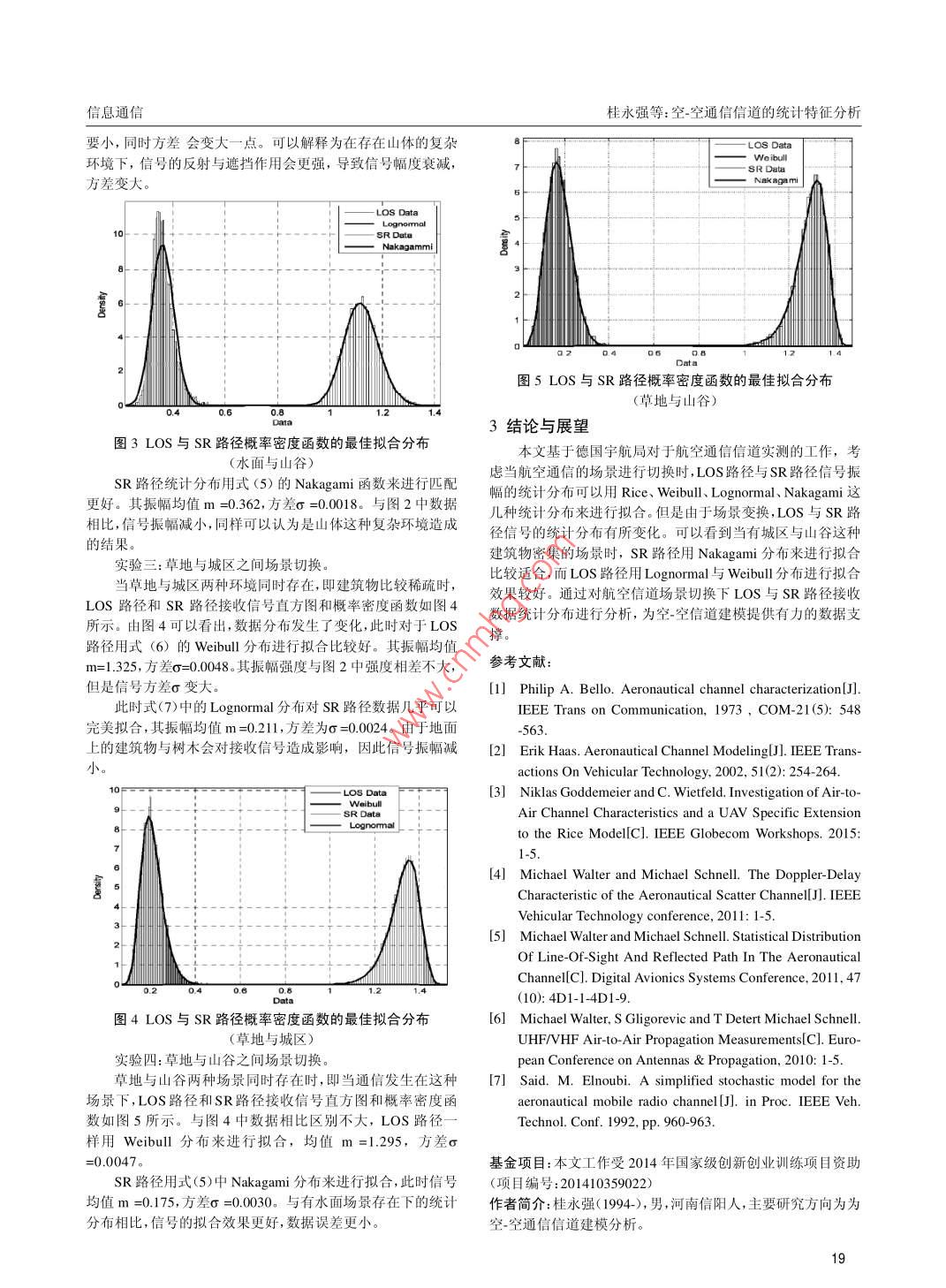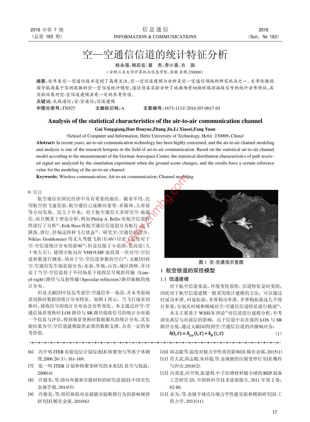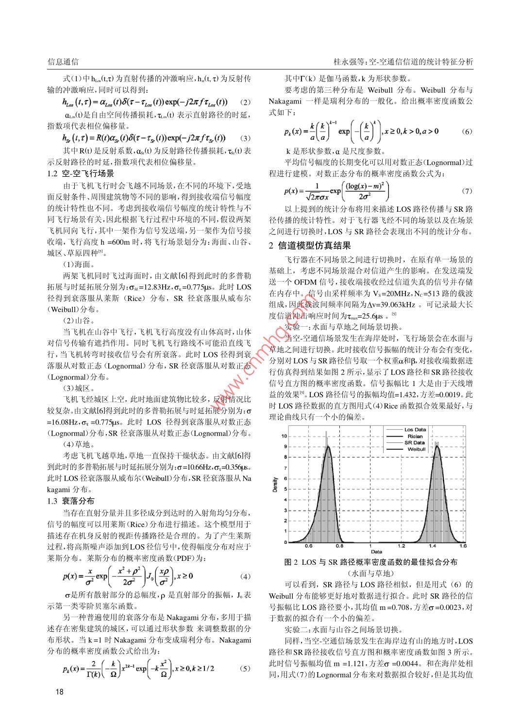 2016年第7期信息通信總第163期)inforMation COMmUnications(Sum. No 163)空一空通信信道的統(tǒng)計特征分析桂永強,韓后岳,章杰,李小喜,方園(合肥工業(yè)大學計算機與信息學院,安徽合肥2300090)摘要:近年來空—空通信技術(shù)受到了高度關(guān)注,空—空信道建模與分析是空—空通信領(lǐng)域的硏究熱點之一。文章依據(jù)徳國宇航局基于實測數(shù)據(jù)的空—空信道統(tǒng)計模型,通過仿真實驗分析了地面場景切換時路徑接收信號的統(tǒng)計分布特征,其實驗結(jié)果對空-空信道建模具有一定的參考價值。關(guān)鍵詞:無線通信;空-空通信;信道建模中圖分類號:TN927文獻標識碼:A文章編號:1673-1131(2016)07-0017-03Analysis of the statistical characteristics of the air-to- air communication channelGui Yongqiang, Han Houyue, Zhang Jie, Li Xiaoxi, Fang Yuan(School of Computer and Information, Hefei University of Technology, Hefei 230009, China)Abstract: In recent years, air-to-air communication technology has been highly concerned, and the air-to-air channel modelingand analysis is one of the research hotspots in the field of air-to-air communication. Based on the statistical air-to-air channelmodel according to the measurements of the German Aerospace Center, the statistical distribution characteristics of path receied signal are analyzed by the simulation experiment when the ground scene changes, and the results have a certain referencevalue for the modeling of the air -to-air channelKeywords: Wireless communication; Air-to-air communication; Channel modeling0引言航空通信在國民經(jīng)濟中具有重要的地位。隨著軍用、民用航空的飛速發(fā)展,航空通信已逐漸向?qū)拵А⒍嗝襟w、大容量等方向發(fā)展。近幾十年來,對于航空通信大多研究空-地通信,而且側(cè)重于理論分析,例如 Philip a.Bll對航空信道特性進行了分析", Erik hass將航空通信信道劃分為航行、起飛飛降落、滑行、停場這四種飛行狀態(tài)凹。研究空-空通信的很少Niklas goddemeier用無人駕駛飛機(UAV)討論了高度對于空空信道統(tǒng)計分布的影響,但是僅限于小范圍,低高度十米左右):德國宇航局在ⅤHF/UHF波段第一次對空空信道參數(shù)進行測量,填補了空空信道參數(shù)的空白,文獻[5]將空空通信發(fā)生場景劃分為:水面、草地、山谷、城區(qū)四種,并討圖1空空通信示意圖論了當空空信道處于不同場景下接收信號視距傳輸(Line-1航空信道的雙徑模型of-sigh)路徑與反射傳輸( Specular reflection)路徑振幅的統(tǒng)1.1信道建模計分布。對于航空信道來說,環(huán)境變化很快,信道特征是時變的,但是文獻5]中僅僅考慮空-空通信單一場景,并未考慮場因此對于航空信道建模一般采用統(tǒng)計建模的方法,可以通過景切換時數(shù)據(jù)的統(tǒng)計分布特征。如圖1所示,當飛行場景切時延功率譜、時延拓展、多普勒功率譜、多普勒拓展這幾個統(tǒng)換時,接收信號的統(tǒng)計分布也會有所變化。本文通過對空空計參量,分別從時域和頻域?qū)湛胀ㄐ判诺捞卣鬟M行描述。通信場景變換時LOS路徑與SR路徑接收信號的統(tǒng)計分布做本文主要基于 WSSUS理論對信道進行建模分析,不考個仿真與評估,得到場景變換服從的統(tǒng)計分布,其實慮電離層與對流層的影響,由于信道中存在強的LOS與SR驗結(jié)果為空-空信道建模提供必要的數(shù)據(jù)支撐,具有一定的參路徑分量,通過文獻[4得到空空通信信道的沖激響應(yīng)為:考價值。h(t, r)=h,o(t,r)+hs (t,T)6]馮開明ITER實驗包層計劃綜述肌核聚變與等離子體物[10等溫度對鈹力學性質(zhì)的影響[J稀有金屬,2015(1)理,2006.26(3):161-169.[111,邱志聰,巫祥超,等.金屬鈹?shù)膲嚎s變形行為[J爆炸7]張一鳴.IER計劃和核聚變研究的未來[J真空與低溫,與沖擊,2016(2)2006(4)12]馮勇進馮開明,張建利中子倍增材料鈹小球的REP制備[8]許德美,等國內(nèi)外鈹和含鈹材料的研究進展中國有色工藝研究磯].中國核科學技術(shù)進展報告,2011年第2卷:金屬學報,2014(5)82-86I9Ⅰ許德美,等.組織缺陷對金屬鈹室溫斷裂行為的影響規(guī)律∏3余為,等金屬半球殼壓縮力學性能實驗和模擬硏究.工研究[稀有金屬,2010(6)程力學,2013(11).信息通信桂永強等:空空通信信道的統(tǒng)計特征分析式(1)中hut)為直射傳播的沖激響應(yīng),ht,v)為反射傳其中r(k)是伽馬函數(shù),k為形狀參數(shù)。輸?shù)臎_激響應(yīng),同時可以得到要考慮的第三種分布是 Weibull分布。 Weibull分布與h2m(,r)=an()6(x-tm(O)exp(-12nftn(1)(2) Nakagami一樣是瑞利分布的一般化。給出概率密度函數(shù)公a1、(U)是自由空間傳播損耗,τ。()表示直射路徑的時延,式如下指數(shù)項代表相位偏移量,hs(4,r)=R(Oa。(O)6(-ts(O)exp(-j2兀p4(x)=x≥0,k>0,a>0(6)其中R(ω)是反射系數(shù),αs(t)為反射路徑傳播損耗,τ(表k是形狀參數(shù),a是尺度參數(shù)示反射路徑的時延,指數(shù)項代表相位偏移量平均信號幅度的長期變化可以用對數(shù)正態(tài)( Lognormal)過2空空飛行場景程進行建模。對數(shù)正態(tài)分布的概率密度函數(shù)公式為:由于飛機飛行時會飛越不同場景,在不同的環(huán)境下,受地P(x)(log(x)-m)面反射條件、周圍建筑物等不同的影響,得到接收端信號幅度的統(tǒng)計特性也不同??紤]到接收端信號幅度的統(tǒng)計特性與不以上提到的統(tǒng)計分布將用來描述LOS路徑傳播與SR路同飛行場景有關(guān),因此根據(jù)飛行過程中環(huán)境的不同,假設(shè)兩架徑傳播的統(tǒng)計特