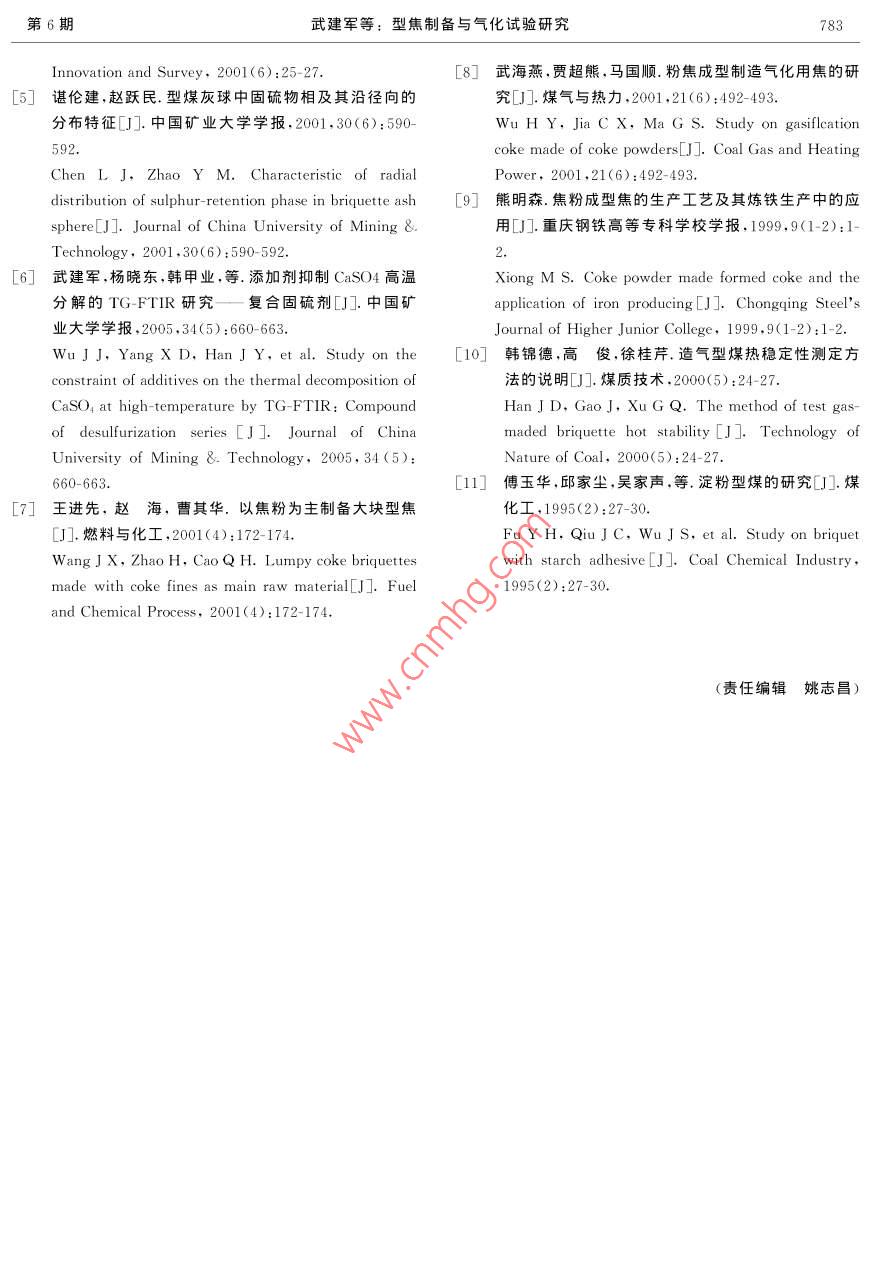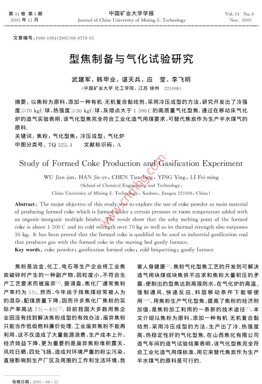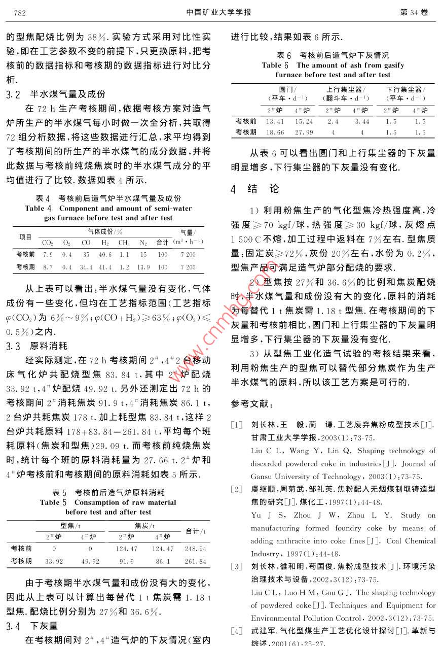 第34卷第6期中國礦業(yè)大學(xué)學(xué)報 Vol. 34 No. 62005年11月 Journal of China University of Mining&. TechnologyNov.2005文章編號:1000-194(2005)06-0779-05型焦制備與氣化試驗研究武建軍,韓甲業(yè),諶天兵,應(yīng)瑩,李飛明(中國礦業(yè)大學(xué)化工學(xué)院,江蘇徐州221008)摘要:以焦粉為原料,添加一種有機(jī)無機(jī)復(fù)合黏結(jié)劑,采用冷壓成型的方法,研究開發(fā)出了冷強(qiáng)度≥70kgf/球,熱強(qiáng)度≥30kgf/球,灰熔點大于1500℃的高質(zhì)量氣化型焦.通過在移動床氣化爐的造氣實驗表明,該氣化型焦完全符合工業(yè)化造氣用煤要求,可替代焦炭作為生產(chǎn)半水煤氣的原料關(guān)鍵詞:焦粉;氣化型焦;冷壓成型;氣化爐中圖分類號:TQ523.4文獻(xiàn)標(biāo)識碼:A Study of Formed Coke Production and Gasification Experiment WU Jian-jun, HAN Jia-ye, CHEN Tian-bing, YING Ying, LI Fei-ming (School of Chemical Engineering and Technology, China University of Mining 8. Technology, Xuzhou, Jiangsu 221008, China) Abstract: The major objective of this study was to explore the use of coke powder as main material of producing formed coke which is formed under a certain pressure at room temperature added with an organic-inorganic multiple binder. The result show that the ashy melting point of the formed coke is above 1 500 C and its cold strength over 70 kg as well as its thermal strength also surpasses 30 kg. It has been proved that the formed coke is qualified to be used as industrial gasification coal that produces gas with the formed coke in the moving bed gasify furnace. Key words: coke powder; gasification formed coke cold briquetting; gasify furnace焦粉是冶金、化工、電石等生產(chǎn)企業(yè)將工業(yè)焦害人身健康焦粉氣化型焦工藝的開發(fā)則可解決炭破碎時產(chǎn)生的一種副產(chǎn)物,因粒度小不符合生造氣用塊煤或塊焦供不應(yīng)求和焦粉大量積壓的矛產(chǎn)工藝要求而被廢棄.據(jù)調(diào)查,焦化廠通常焦粉盾,使制出的型焦達(dá)到高強(qiáng)防水,在氣化爐的高溫、產(chǎn)率約為5%然而,今年由于煉焦煤經(jīng)被人為強(qiáng)制通風(fēng)、快速反應(yīng)、料層移動條件下能夠使的混雜,配煤質(zhì)量下降,因而許多焦化廠焦粉的實用461.用焦粉生產(chǎn)氣化型焦提高了焦粉的經(jīng)濟(jì)附際產(chǎn)率高達(dá)7%~8%2.目前我國大多數(shù)用焦企加值,是焦粉加工利用的一條新的技術(shù)途徑本業(yè)因沒有找到解決焦粉成型的有效辦法,廢棄焦粉文介紹以焦粉為原料,添加一種有機(jī)無機(jī)復(fù)合黏只能當(dāng)作低級燃料廉價處理工業(yè)廢棄焦粉不能再結(jié)劑,采用冷壓成型的方法,生產(chǎn)出了冷、熱強(qiáng)度利用,這不僅造成了大量能源浪費,生產(chǎn)成本上升,高,熱穩(wěn)定性好的氣化型焦在山西焦化有限公司經(jīng)濟(jì)效益下降,更為重要的是廢棄焦粉堆積露天,造氣車間的造氣試驗結(jié)果表明,該氣化型焦完全符風(fēng)吹日曬,四處飛揚,造成對環(huán)境嚴(yán)重的粉塵污染,合工業(yè)化造氣用煤標(biāo)準(zhǔn),用它來替代焦炭作為生產(chǎn)直接影響到生產(chǎn)廠區(qū)及周圍的工作和生活環(huán)境危半水煤氣的原料是可行的收稿日期:2005-06-15780中國礦業(yè)大學(xué)學(xué)報第34卷1原料制備及工藝方案成型水分:10%~14%;型煤干重:(30±1)g/個;1.1原料制備干燥條件:105C(2h);焦粉,破碎至3mm以下;成型溫度:室溫;風(fēng)化煤,粉碎至177m以下;摻混時間:10~15min.黏土,粉碎至125μm以下.2.2黏結(jié)劑對型焦質(zhì)量的影響實驗用粉分析見表1型煤的熱穩(wěn)定性是指型煤在高溫燃燒或氣化表1試驗用粉工業(yè)分析過程中對熱的耐受程度,即型煤在高溫作用下保持 Table 1 Proximate analysis of coke powder原來形狀的性質(zhì)10.型焦的熱穩(wěn)定性是影響型焦名稱 Mad Vad FCad造氣效果的關(guān)鍵因素,而黏結(jié)劑在粉焦成型的過程 wB/%3.11.283.3212.38中起著非常重要的作用,不同的黏結(jié)劑對同一種原1.2工藝方案料煤具有不同的黏結(jié)效果,同一種黏結(jié)劑的不同添粉焦成型工藝見圖1.加量對同一種原料煤也具有不同的黏結(jié)效果.基于粉碎2213Z24這個原理,對同一冶金焦粉,通過使用不同的黏結(jié)粉碎涼干定溶解粉碎劑及其用量,研究黏結(jié)劑對型焦冷熱強(qiáng)度的影響規(guī)律,為最終確定氣化型焦生產(chǎn)配方提供理論基礎(chǔ).定量定量定量定量定最加水定量定量2..13黏結(jié)劑對型焦冷熱強(qiáng)度的影響從圖2可以觀察到:型煤的冷強(qiáng)度隨著Y3配攪拌比的增加而明顯提高,Y3的添加量對型煤冷強(qiáng)度的影響很明顯,在不加Y3時型煤的冷強(qiáng)度很低成型干燥入爐造氣當(dāng)Y3的配比大于2%時型煤的冷強(qiáng)度就達(dá)到圖1粉焦成型工藝流程99%以上,但當(dāng)配比大于4%時,變化就不明顯了 Fig. 1 Process flow of coke powder formedY3對型煤熱穩(wěn)定性的影響也是非常明顯的,從沒影響型焦質(zhì)量的一個重要因素就是黏結(jié)劑.無有Y3時的58.23%增加到Y(jié)3為2%時的機(jī)黏結(jié)劑成型后的冷、熱強(qiáng)度好,熱穩(wěn)定性好,價格9632%,當(dāng)Y3配比增大到4%時,型煤熱穩(wěn)定性低,但防水性能差,型焦的發(fā)熱量降低,灰分提高,的變化就不明顯了,到10%還稍微有點下降有機(jī)黏結(jié)劑成型的型焦機(jī)械強(qiáng)度和防水性能能滿100熱強(qiáng)度足要求,也不會降低發(fā)熱量,但熱穩(wěn)定性差,價格偏高,生產(chǎn