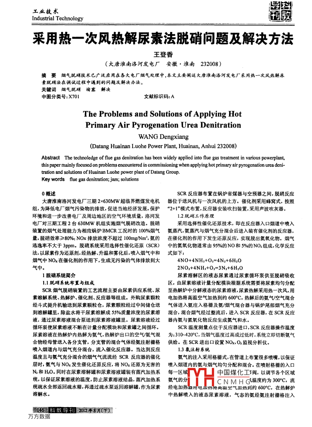 工業(yè)技水Industrial Technology采用熱一次風(fēng)熱解尿素法脫硝向題及解決方法王登香(大唐淮南洛河發(fā)電廠安徼·淮南232008)摘要煙氣脫硝技術(shù)已廣泛應(yīng)用在各大電廠煙氣處理中,本丈主要闡述大唐淮南洛河發(fā)電廠采用熱一次風(fēng)熱解尿素脫硝法在調(diào)試過程中遇到的問題及解決辦法。關(guān)鍵詞煙氣脫硝堵塞解決中圖分類號:X701文獻標(biāo)識碼:AThe Problems and solutions of applying HotPrimary Air Pyrogenation Urea DenitrationWANG Dengxiang(Datang Huainan Luohe Power Plant, Huainan, Anhui 232008)Abstract The technoledge of flue gas denitration has been widely applied into flue gas treatment in various powerplant,this paper mainly focused on problems encountered in commissioning when applying hot primary air pyrogenation urea deni-tration and solutions of Huainan Luohe power plant of Datang Group.Key words flue gas denitration; jam; solutions0概述SCR反應(yīng)器布置在鍋爐省煤器與空預(yù)器之間,脫硝反應(yīng)大唐淮南洛河發(fā)電廠三期2×630MW超臨界燃煤發(fā)電機器位于送風(fēng)機與一次風(fēng)機的上方。催化劑采用蜂窩式,按照組,為降低電廠煙氣污染物的排放,促進當(dāng)?shù)亟?jīng)濟發(fā)展,保護“2+1”模式布置,反應(yīng)器安裝吹掃裝置,采用聲波吹灰器。環(huán)境和進一步改善電廠及周邊地區(qū)的空氣環(huán)境質(zhì)量,洛河發(fā)1.2脫硝工作原電廠對三期工程2臺630MW機組實施煙氣脫硝改造。脫硝采用選擇性催化還原技術(shù),即在反應(yīng)器入口煙道中噴入裝置的煙氣處理能力為相應(yīng)鍋爐BMCR工況時的100%煙氣氨蒸汽,氨蒸汽與煙氣充分混合后進入裝有催化劑的反應(yīng)器,量,脫硝效率≥80%;NOx排放濃度不超過100mgNm3,氨的在催化劑的作用下發(fā)生還原反應(yīng),實現(xiàn)脫出氮氧化物。煙氣逃逸率不大于3ppm。脫硝系統(tǒng)采用選擇性催化還原(SCR)中的氮氧化物通常由95%的NO和5%的NO2組成,化學(xué)反應(yīng)法以尿素作為還原劑,經(jīng)熱解、升溫和霧化后,噴入煙氣中和式如下:煙氣中NOx在催化劑的作用下,生成無污染的氣體排放到大4NO+4NH3+O2=4N2+6H2O氣中。2NO2+4NH3+O2=3N2+6H2O1脫硝系統(tǒng)簡介尿素溶解區(qū)的液態(tài)尿素通過尿素循環(huán)泵供至脫硝吸收1.1脫硝系統(tǒng)布置與組成區(qū),由尿素溶液計量分配模塊根據(jù)系統(tǒng)需要將尿素均勻分配SCR煙氣脫硝裝置的工藝流程主要由尿素供應(yīng)系統(tǒng)、尿至熱解爐中分解液態(tài)的尿素溶液尿素?zé)峤獠捎脽嵋淮物L(fēng)用素溶解系統(tǒng)、熱解爐、催化劑、反應(yīng)器等組成。外購尿素顆粒電加熱將高溫空氣加熱到約600°C,熱解后的氨氣空氣混合經(jīng)斗式提升機輸送到尿素顆粒倉,尿素顆粒經(jīng)過中間儲倉送氣體進入氨注入格柵及氨煙氣混合器與鍋爐尾部煙氣充分到溶解罐里,除鹽水將干尿素溶解成55%質(zhì)量濃度的尿素溶混合,混合煙氣經(jīng)過整流后,進入SCR反應(yīng)器,在SCR反應(yīng)液,通過尿素溶液混合泵送到尿素溶液罐里。尿素溶液經(jīng)過器內(nèi)氨與氮氧化物反應(yīng)生成氮氣和水。循環(huán)泵使尿素溶液不斷在計量分配模塊和尿素罐之間循環(huán)。SCR溫度測量點位于反應(yīng)器進口,SCR反應(yīng)器操作溫度尿紊溶液在熱解爐內(nèi)熱解為氨氣,熱解爐出口的空氣氨氣混為:310420°C,當(dāng)煙氣溫度過高或過低時,系統(tǒng)立即切斷氨氣合物經(jīng)母管送入各分支管,分支管的混合氣體經(jīng)氨注射柵格供給。在SCR進出口設(shè)置NOx,O2監(jiān)視分析儀噴入煙道內(nèi)與煙氣充分混合,流入催化反應(yīng)器。當(dāng)達到反應(yīng)13氯注射系統(tǒng)溫度且與氨氣充分混合的煙氣氣流流經(jīng)SCR反應(yīng)器的催化氨氣的注入采用格柵式在管道上布置很多噴嘴,以保證層時,氨氣與NOx發(fā)生催化還原反應(yīng),將NOx還原為無害的噴入煙道內(nèi)的氨與煙氣均勻分配和混合。在噴射格柵的入口N2和HO同時在尿素溶解罐和尿素溶液罐裝有蒸汽加熱系每一區(qū)域山中國煤化工閥,以調(diào)節(jié)各個區(qū)域統(tǒng),以保證尿素溶液的溫度,防止尿素溶液結(jié)晶,蒸汽加熱系氨氣的CNMHG溫度約為300C流統(tǒng)疏水全部返回疏水箱再通過疏水泵返回溶解罐作為尿素經(jīng)電加熱奮用電加燃符溫空氣加熱到約600C,在熱解爐溶解水。中熱解噴入的液態(tài)尿素溶液,氣態(tài)的氨經(jīng)氨注射柵格注入4科教導(dǎo)刊》2年8月(下)工業(yè)技術(shù)Industrial TechnologySCR反應(yīng)器入口前的煙道中。氨注射柵格(AlG)——安裝于足熱解尿素溶液的需要。③調(diào)試人員經(jīng)驗不足導(dǎo)致:投入尿素SCR入口煙道內(nèi)部帶有注射噴嘴的柵格,柵格噴入的氨流量溶液量過大、過快,導(dǎo)致部分尿素溶液未能及時分解,在手動閥與NOx濃度匹配。前后處結(jié)晶;或在熱解爐出口未達到穩(wěn)定時,就過快地投入尿2脫硝系統(tǒng)調(diào)試素溶液,也會導(dǎo)致部分未能及時的分解而結(jié)晶。2.1調(diào)試期間發(fā)現(xiàn)問題3解決方法脫硝系統(tǒng)進入調(diào)試試噴氨期間,發(fā)現(xiàn)熱解爐出口溫度不根據(jù)以上原因分析,造成結(jié)晶的主要原因是由于投入尿穩(wěn)定,脫硝效率較低,達不到設(shè)計值,同時氨的逃逸率偏大,于素溶液量過大、過快,同時熱解一次風(fēng)量過少,造成熱解爐出是解列脫硝系統(tǒng)
