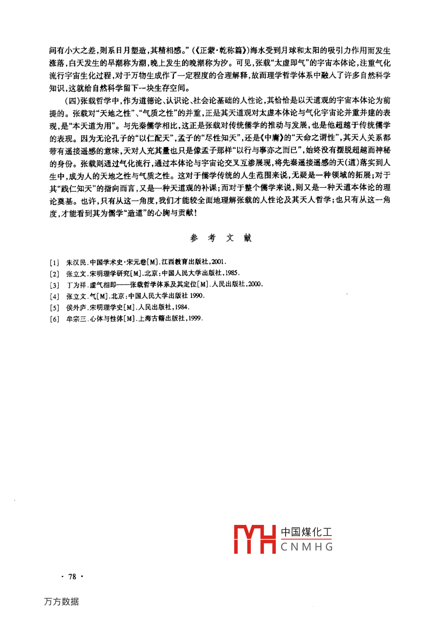 重慶師院學(xué)報(bào)(哲學(xué)社會(huì)科學(xué)版)2003年第3期論張載的氣化流行吳靜(重慶師范大學(xué)歷史系,重慶400047)摘要:本文從儒家學(xué)說結(jié)構(gòu)上探析張載的氣化流行,以透視窩寄在氣化流行過程中的太虛、性與氣的關(guān)系,從而闡示張敢在理學(xué)中的重要地位及理論貢獻(xiàn)。關(guān)鍵詞:張載;太虛;氣化流行;性中圖分類號(hào):B244文獻(xiàn)標(biāo)識(shí)碼:A文章編號(hào):1001-996(200303-004-05理學(xué)最根本的問題就是本體論問題,它的突出特征就是儒學(xué)的哲理化或形上本體化。張載十分重視探討世界本源問題,是繼理學(xué)開山祖—周敦頤之后,對(duì)理學(xué)哲學(xué)本體系統(tǒng)的發(fā)展者。張載試圖為儒學(xué)建立一套博大精深的“性與天道”的本體論學(xué)說以彌補(bǔ)儒學(xué)在這方面的不足和對(duì)抗釋老之學(xué)以虛無為宇宙本體的思想理論。經(jīng)過苦心力索”,對(duì)《易傳)《孟子》以至漢唐《易)學(xué)的探索整理張載建立起了“太虛即氣"的宇宙本體論。太虛無形氣之本體其聚其散變化之客形爾。至靜無感,性之淵源。有識(shí)有知,物交之客感爾??透锌托闻c無感無形,惟盡性者也?!?《張載集正蒙·太和篇》,本文所引張載語皆出自中華書局1978年版《張載集》,以下凡有所引皆只注篇名)以太虛為體,則氣始活浮沉、升降、動(dòng)靜、相感綑組、相蕩勝負(fù)、屈伸,皆氣之活用?;蚓刍蛏⒁鄽庵钣?故云“其聚其散變化之客形爾”?!翱托巍奔磿簳r(shí)之形態(tài)或時(shí)中之形態(tài)皆氣之變化所呈之“相”。氣雖有客形,太虛則遍而一,是常體。落于個(gè)體生命上說,太虛乃人之“性”,是性體最深之根源,所以說“至靜無感性之淵源”。這是就性體自身說,亦是就太虛自身說。因此,“太虛者氣之體”(《橫渠易說·系辭上》)。《語錄》載:“天地之道無非至虛為實(shí),人須于虛中求實(shí)。圣人虛之至,故擇善自精。心之不能虛,由有物榛礙。金鐵有時(shí)而腐時(shí)而摧,凡有形之物即易壞惟太虛無動(dòng)搖,故為至實(shí)。”(《張子語錄》)“金鐵”“山岳”的“腐”與“摧”,說明有形事物之相對(duì)的本質(zhì),而太虛則超形絕象,“無動(dòng)搖”、“為至實(shí)”,這顯然是以有形有限的具體事物之“腐”與“摧”來反襯太虛無形無象而“無動(dòng)搖的性質(zhì),無疑是從本體的角度立言。“太虛者天之實(shí)也。萬物取足于太虛,人亦出于太虛,太虛者心之實(shí)也?!?《張子語錄》太虛作為“天之實(shí)”與“心之實(shí)”的同一性這顯然又是從本體之貫通天人的角度立說?!办o者善之本,虛者靜之本。靜猶對(duì)動(dòng)虛則至一?!?《張子語錄》)從太虛作為“靜之本”而直接提揭其超越動(dòng)靜對(duì)待的“無對(duì)”、“至一”的性質(zhì),只能從本體的角度來把握;而從“善之本”到中國煤化工收稿日期:2003-01-10CNMHG作者簡介:吳靜(198-),女,四川成都人重慶師范大學(xué)歷史示唧±74“至一”的“靜之本”,也顯然是從超越的角度規(guī)定的,放這都可以看作是張載對(duì)太虛本體至高無上超越地位的證明?!疤摬荒軣o氣氣不能不聚而為萬物萬物不能不散而為太虛”“知太虛即氣,則無無”(征正蒙·太和篇》)。顯然,張載反復(fù)強(qiáng)調(diào)太虛與氣的不可分割性脫離氣的太虛是不存在的太虛存在于氣化流行過程中既超越而又內(nèi)在,所謂脫離氣的純粹的虛無實(shí)際上是不存在的存在的只是太虛與氣的統(tǒng)所表現(xiàn)的各種具體事物。各種具體事物之作為氣其與太虛又是冰與水的關(guān)系,“氣之聚散于太虛如冰凝釋于水”。氣雖以“冰”的狀態(tài)存在,但“水”在“冰”之中所以張載說:“氣之為物散入無形,適得吾體;聚為有象不失吾常?!?《正蒙·太和篇》)而對(duì)太虛來說這就是“聚亦吾體散亦吾體知死之不亡者可與言性矣”(《正蒙·太和篇》)。這里的性正像“吾體”一樣,是太虛的主體化表達(dá)。如果從氣的角度看,那么,無論太虛是超越還是內(nèi)在氣都是其惟一的擔(dān)當(dāng)者離開了氣,不僅其內(nèi)在性無從寄存而且其超越性也無法體現(xiàn)故張載說:“知虛空即氣則有無、隱顯、神化、性命,通一無二,顧聚散、出入、形不形,能推本所從來則深于《易)者也?!?《正蒙·太和篇》)推之,氣化流行成為張載哲學(xué)邏輯結(jié)構(gòu)——一從天(太虛)到人(性)到物(質(zhì))的一個(gè)關(guān)鍵環(huán)節(jié),氣化流行在此宇宙生化結(jié)構(gòu)中扮演了一個(gè)非常重要的角色。對(duì)此,張載深入分析,提出氣有“兩”“一”之變合“循環(huán)迭至,聚散相蕩,升降相求,綑缊相揉"的運(yùn)動(dòng)觀?!疤撝畾?陰陽一物也然而有兩體健順而已”(《橫渠易說·系辭下》)“陰陽一物”即一氣具有陰陽健順之分。健則陽,陽為動(dòng);順則陰,陰則靜;動(dòng)靜不息健順不止。張氏強(qiáng)調(diào)這就是“造化之功,發(fā)乎動(dòng),畢達(dá)乎順,形諸明"(《橫渠易說·說卦》)。萬物造化之功是氣之“動(dòng)“靜”、陰(靜)陽(動(dòng))變化的緣故。所以張氏說:“一物兩體氣也。一故神,兩故化,此天所以參也。”“一”中包含“兩”,故能神妙莫測;“兩”交歸于“一”,于是能發(fā)展變化,“兩不立,則一不可見;一不可見,則兩之用息。兩體者,虛實(shí)