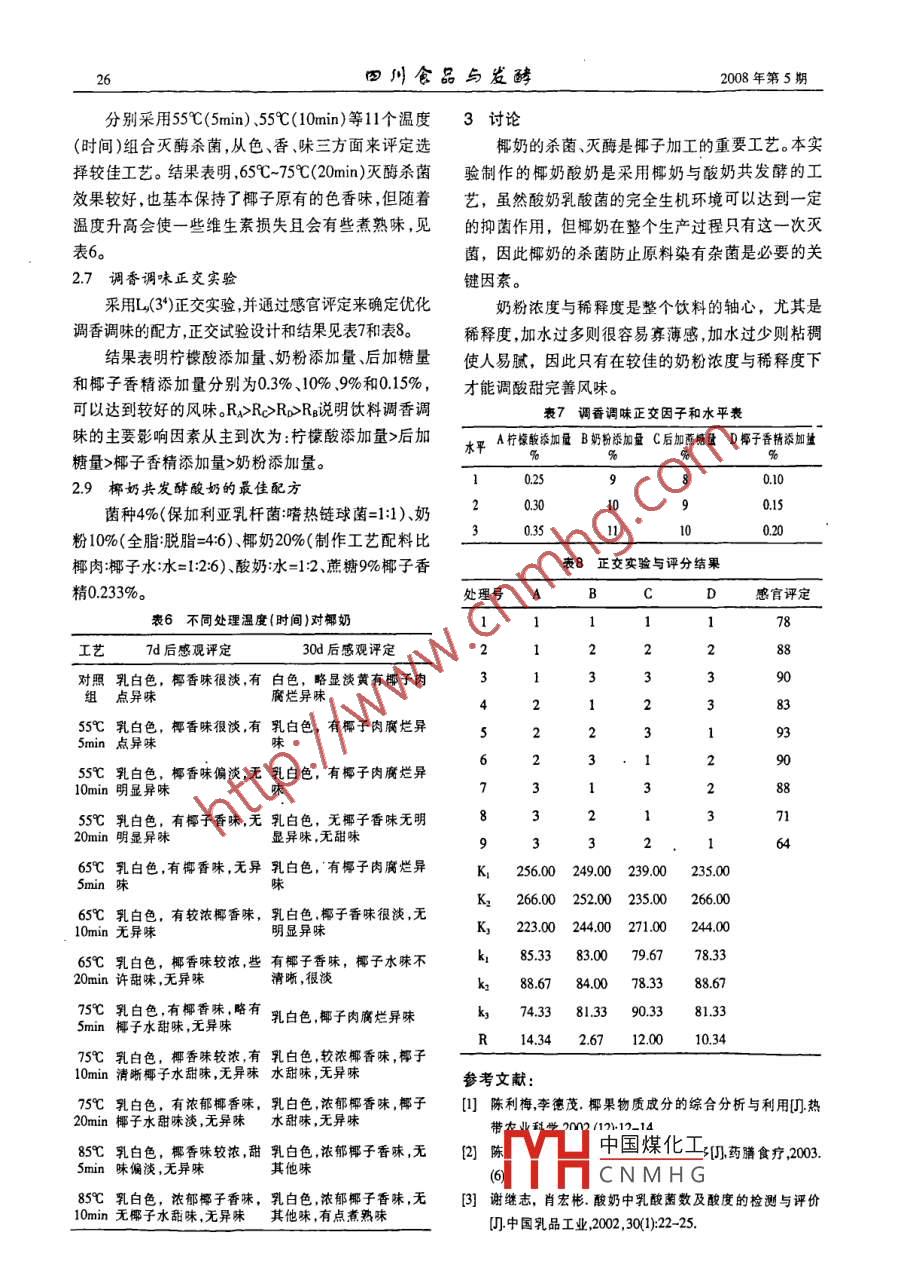 四川食品與發(fā)酵Sichuan Food and Fermentation第44卷(第5期)Vol.44,No5椰奶的加工工藝研究邳煥霞(青島農(nóng)業(yè)大學(xué)食品科學(xué)與工程學(xué)院,山東青島266109)摘要:本文主要是對(duì)椰奶乳酸菌飲料的加工工藝進(jìn)行研究,通過(guò)正交試驗(yàn)得到了椰奶共發(fā)酵酸奶的最佳配方。議驗(yàn)結(jié)果表明,泥合發(fā)酵適宜條件中普通乳酸萬(wàn)(保加利亞乳桿菌:嘴熱鏈球藹比例=11)添加量為4%,奶粉添加量10%(全脂奶粉:脫脂奶粉=46),椰奶20%,其中制作工藝配料比揶肉:椰于水:水為126,酸奶稀釋度1:2,蔗糖%%,椰子香關(guān)鍵詞:椰奶;保加利亞乳酸杄萬(wàn);嚯熱鏈球萬(wàn)中國(guó)圖書分類號(hào):TS275文獻(xiàn)標(biāo)識(shí)碼:A文章編號(hào):1671-6892(2008)05-0024-0004Study on the processing Technique of Coconut MilkShao Huan-xiFood Science Engineering School, Qingdao A grcuural Universiy, Qingdao, Shandong 266109Abstract: The processing technique of coconut milk was studied in this paper. Through the orthogonal experimentbest formula of fermented coconut milk with yoghurt was produced. The final result of pointed out the best craftingconditions, such as Lactobacillus (Lactobacillus bulgaricus: Streptococcus thermophilus was 1: l)dose was 4%, 10%o millpowder(whole milk powder'skim milk powder was 4: 6), 20% coconut milk(the rate of ingredients of processing techniquecoconut:coconut water water was 1-2: 6, the dilution rate of yogurt was 1: 2, 9% saccharose, and 0. 233% coconut flavor.Keywords: Coconut milk; Lactobacillus Bulgaricus; Streptococcus Thermophilus0前言嗜熱鏈球菌( Str theromophilus)(SR8-1)和保加椰奶是一種植物蛋白飲料。椰奶飲料因其不含利亞乳酸桿菌(L. Bulgaricus)(BR6-1)膽固醇,含豐富的蛋白質(zhì)、必需氨基酸、維生素和不13儀器設(shè)備飽和脂肪酸,易于被人體吸收,具有保健功能等特性全自動(dòng)高壓滅菌鍋、電熱恒溫培養(yǎng)箱、電熱恒溫深受廣大消費(fèi)者的喜愛(ài)。水浴鍋、高壓均質(zhì)機(jī)等。本論文主要通過(guò)椰奶的制取與滅酶殺菌,椰奶14操作要點(diǎn)活性乳酸菌飲料的生產(chǎn)對(duì)椰奶乳酸菌飲料的加工工(1)菌種制備藝進(jìn)行研究,并最終確定椰奶共發(fā)酵酸奶的最佳配分別取保加利亞乳桿菌和嗜熱鏈球菌在還原乳方培養(yǎng)基中連續(xù)活化3代后按1:1比例制備發(fā)酵用菌材料與方法種11材料與試劑(2)椰奶的制取與滅酶殺菌材料:全脂奶粉,脫脂奶粉,椰子,糖。精選新鮮的椰子,用水清洗后,在沸水中熱燙試劑:高甲氧基果膠(HMP),低甲氧基果膠5min后瀝干;將椰果肉椰子水用打漿機(jī)打漿;將制LMP),羧甲基纖維素(CMC),海藻酸丙二醇酯備的椰奶加熱至70℃左右保溫20min滅酶殺菌處理(PGA),椰子香精,檸檬酸。然后中國(guó)煤化工1.2菌種CNMHG收稿日期:2008-10-8作者簡(jiǎn)介:邵煥霞(1981-),女,山西運(yùn)城人,助教。研究方向:食品工程第44卷(總第145期)邵煥霞:椰奶的加工工藝研究將全脂奶粉、脫脂奶粉、白砂糖和水?dāng)嚢杌旌暇?全脫脂奶粉配比對(duì)酸奶品質(zhì)的影響勻后均質(zhì);將均質(zhì)后的乳液加熱至90℃,保溫5mn-全脂脫脂滋氣味組織狀態(tài)色澤20min殺菌;殺菌乳冷卻至42℃-45℃后,與制備的椰100酸度適宜少許奶香奶混合,接種3%~4%的酸奶菌種發(fā)酵3h-4.5h,使酸55酸度適宜少許奶香有少許乳清,酸度較高味道較佳除了2:8樣品奶充分凝固后迅速冷卻至10℃以下。較粗糙外其余均為乳白色15感官評(píng)定酸度稍高有番薯味口感細(xì)膩根據(jù)乳酸菌飲料的色澤、組織狀態(tài)、粘稠度、滋010較濃番薯味味和氣味等指標(biāo)進(jìn)行綜合評(píng)分。樣品隨機(jī)提供給5位表4制作工藝對(duì)椰奶品質(zhì)的影響審評(píng)人員,分別打分后取平均分。藝②工藝③工藝④2結(jié)果與分析分層,上層為水下層為呈粉狀奶體21茵種添加量對(duì)酸奶風(fēng)味的影響香氣酸奶香味酸奶香味酸奶香味酸奶香味用奶粉1%,糖10%,接種總量分別為2%、3%椰香味淡椰奶味很淡椰奶味很淡椰奶味淡口感清爽味口感清甜較口感清爽4%、5%,選用嗜熱鏈球菌和保加利亞乳桿菌兩種菌風(fēng)咪酸甜較為著實(shí)口感濟(jì)甜覺(jué)稀薄略帶好酸味味覺(jué)有點(diǎn)偏甜種以1的比例接種進(jìn)行實(shí)驗(yàn)結(jié)果表明,添加4%菌種單調(diào)味感濃厚量制作的酸奶較好。菌種篩選實(shí)驗(yàn)感官評(píng)分見(jiàn)表1。酸甜感敉好般一般一般表1菌種添加量對(duì)酸奶品質(zhì)的影響表5椰奶添加量對(duì)椰奶品質(zhì)的影響10%15%20%色澤四者色澤相當(dāng),無(wú)特別顏色組織形態(tài)全部分層,上層為水下層為奶體滋氣味香味濃香味較濃香味很濃酸度一般酸度適中酸度適中淡淡酸奶香味凝乳時(shí)間35-4h30-35h25-30h25h無(wú)擇香味椰香味椰香味很淡較淡椰香味椰香味凝乳狀態(tài)凝固性一般,凝固性好,凝固性、凝固性質(zhì)構(gòu)好質(zhì)構(gòu)很好質(zhì)枃很好質(zhì)構(gòu)很好口感清爽、無(wú)粉狀質(zhì)感乳清析出狀態(tài)無(wú)無(wú)微量析出少許析出風(fēng)味有較濃有較濃酸甜適宜有些許44-464.1-443.8-4.13.8-4.1有點(diǎn)偏甜甜味甜味無(wú)明顯甜甜味滯留感滯留感味滯留感滯留感表2奶粉添加量對(duì)酸奶品質(zhì)的影響酸甜惑好一般較差較好較差%色澤為乳白色,無(wú)特別顏色滋氣味2.4酸奶稀釋度對(duì)酸奶風(fēng)味的彩響聞起來(lái)味道好酸奶酸味較濃酸奶香味有奶香味組織狀態(tài)用與酸