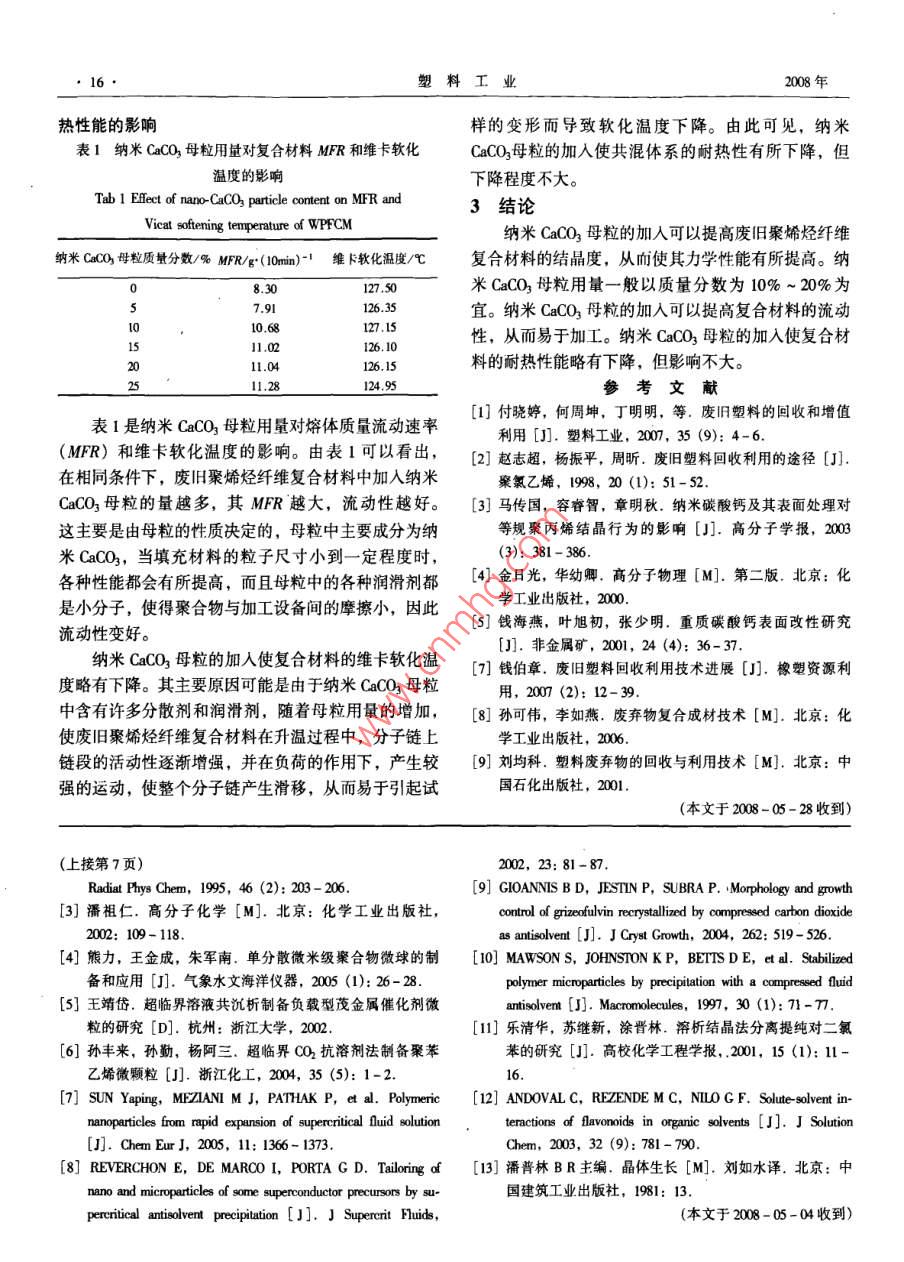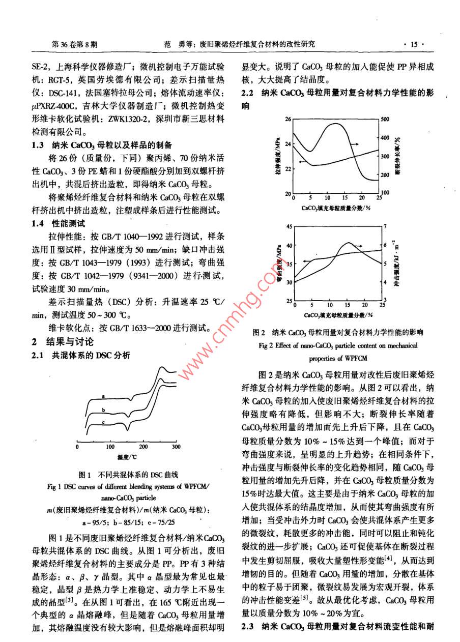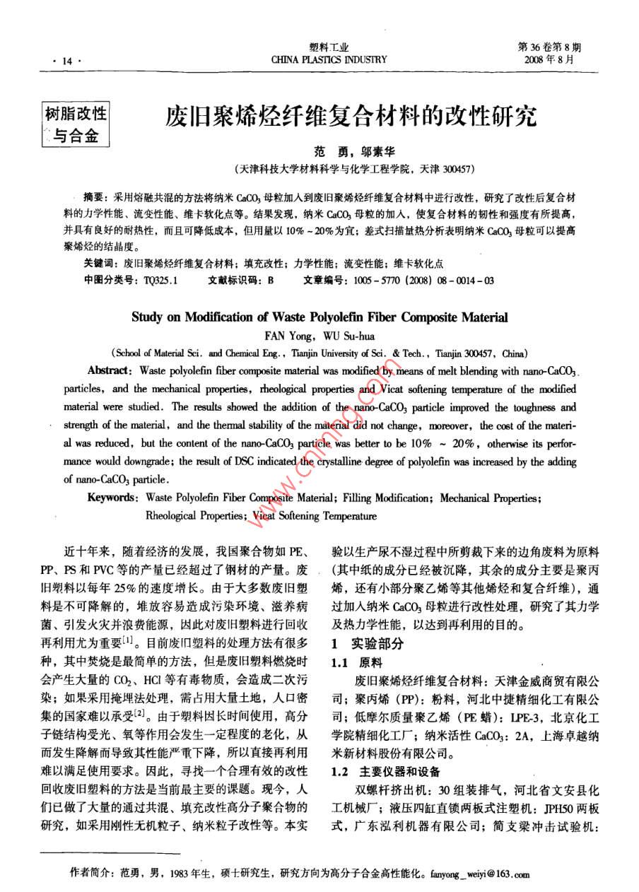 塑料工業(yè)第36卷第8期●14.CHINA PLASITICS INDUSTRY2008年8月樹脂改性廢舊聚烯烴纖維復(fù)合材料的改性研究:與合金范勇,鄔素華(天津科技大學(xué)材料科學(xué)與化學(xué)工程學(xué)院,天津300457)摘要:采用熔融共混的方法將納米CaCO3母粒加人到廢舊聚烯烴纖維復(fù)合材料中進(jìn)行改性,研究了改性后復(fù)合材料的力學(xué)性能、流變性能、維卡軟化點(diǎn)等。結(jié)果發(fā)現(xiàn),納米CaCO3母粒的加入,使復(fù)合材料的韌性和強(qiáng)度有所提高,并具有良好的耐熱性,而且可降低成本,但用量以10% ~ 20%為宜;差式掃描址熱分析表明納米CaCO3母粒可以提高案烯烴的結(jié)晶度。關(guān)鍵詞:廢舊聚烯烴纖維復(fù)合材料;填充改性;力學(xué)性能;流變性能;維卡軟化點(diǎn)中圖分類號(hào): TQ325.1文獻(xiàn)標(biāo)識(shí)碼: B文章編號(hào): 1005-5770 (2008) 08- 0014-03Study on Modification of Waste Polyolefin Fiber Composite MaterialFAN Yong,WU Su-hua(School of Malerial Sei. and Chemical Eng,Tanjin Univrsity of Sei. & Tech. , Tianjin 300457, China)Abstract: Waste polyolefin fiber composite material was modifed by means of melt blending with nano-CaCO3.particles, and the mechanical properties, rheological properties and Vicat softening temperature of the modifiedmaterial were studied. The results showed the addition of the nano-CaCO3 particle improved the toughness andstrength of the material, and the themmal stability of the material did not change, moreover, the cost of the materi-al was reduced, but the conlent of the nano-CaCO3 particle was better to be 10% ~ 20%,otherwise is perfor-mance would downgrade; the result of DSC indicated the cytalline degree of polyolef'n was increased by the addingof nano-CaCO3 particle.Keywords: Waste Polyolefin Fiber Composite Material; Filling Modification; Mechanical Properties;Rheological Properties; Vicat Softening Tempeature近十年來,隨著經(jīng)濟(jì)的發(fā)展,我國聚合物如PE、驗(yàn)以生產(chǎn)尿不濕過程中所剪裁下來的邊角廢料為原料PP、PS和PVC等的產(chǎn)量已經(jīng)超過了鋼材的產(chǎn)量。廢(其中紙的成分已經(jīng)被沉降,其余的成分主要是聚丙.舊塑料以每年25%的速度增長。由于大多數(shù)廢舊塑烯,還有小部分聚乙烯等其他烯烴和復(fù)合纖維),通料是不可降解的,堆放容易造成污染環(huán)境、滋養(yǎng)病過加人納米CaCO3母粒進(jìn)行改性處理,研究了其力學(xué)菌、引發(fā)火災(zāi)并浪費(fèi)能源,因此對(duì)廢舊塑料進(jìn)行回收及熱力學(xué)性能,以達(dá)到再利用的目的。再利用尤為重要川。目前廢I口塑料的處理方法有很多1實(shí)驗(yàn)部分種,其中焚燒是最簡單的方法,但是廢舊塑料燃燒時(shí)1.1 原料會(huì)產(chǎn)生大量的CO2、HCI等有毒物質(zhì),會(huì)造成二次污廢舊聚烯烴纖維復(fù)合材料:天津金威商貿(mào)有限公染;如果采用掩埋法處理,需占用大量土地,人口密司;聚丙烯(PP): 粉料,河北中捷精細(xì)化工有限公集的國家難以承受2。由于塑料因長時(shí)間使用,高分司;低摩爾質(zhì)量聚乙烯(PE蠟): IPE-3, 北京化工子鏈結(jié)構(gòu)受光、氧等作用會(huì)發(fā)生- -定程度的老化,從學(xué)院精細(xì)化工廠;納米活性CaCO3: 2A,上海卓越納而發(fā)生降解而導(dǎo)致其性能嚴(yán)重下降,所以直接再利用米新材料股份有限公司。難以滿足使用要求。因此,尋找一一個(gè)合理有效的改性1.2主要 儀器和設(shè)備回收廢舊塑料的方法是當(dāng)前最主要的課題?,F(xiàn)今,人雙螺桿擠出機(jī): 30組裝排氣,河北省文安縣化們已做了大量的通過共混、填充改性高分子聚合物的工機(jī)械廠;液壓四缸直鎖兩板式注塑機(jī): JPHSO 兩板研究,如采用剛性無機(jī)粒子、納米粒子改性等。本實(shí)式,廣東泓利機(jī)器有限公司;簡支梁沖擊試驗(yàn)機(jī):作者簡介:范勇,男,1983 年生,碩士研究生,研究方向?yàn)楦叻肿雍辖鸶咝阅芑?。fanyong_ weinj@ 163. com第36卷第8期范勇等: 廢舊聚烯烴纖維復(fù)合材料的改性研究15SE-2,.上??茖W(xué)儀器修造廠; 微機(jī)控制電子萬能試驗(yàn)顯變大。說明了CaCO3 母粒的加入能促使PP異相成機(jī): RCT-5, 英國勞埃德有限公司;差示掃描量熱核,大大提高了結(jié)晶度。儀: DSC-141,法國塞特拉母公司;熔體流動(dòng)速率儀:2.2納米CaCO3母粒用量對(duì)復(fù)合材料力學(xué)性能的影μPXRZ40OC,吉林大學(xué)儀器制造廠;微機(jī)控制熱變.響形維卡軟化試驗(yàn)機(jī): ZWK1320-2, 深圳市新三思材料300檢測(cè)有限公司。400 x1.3納米CaCO3母粒以及樣品的制備是2將26份(質(zhì)量份,下同)聚丙烯、70份納米活00性CaCO3、3份PE蠟和1份硬酯酸分別加到雙螺桿擠22-200出機(jī)中,共混后擠出造粒,即得納米CaCO3母粒。將聚烯烴纖維復(fù)合材料和納米CaCO3母粒在雙螺20 3101520250桿擠出機(jī)中擠出造粒,注塑成樣條后進(jìn)行性能測(cè)試。CaCO,填充母粒質(zhì)分?jǐn)?shù)/%1.4 性能測(cè)試?yán)煨阅?按CB/T 1040- -1992 進(jìn)行測(cè)試,樣條選用I型試樣,拉伸速度為50mm/min;缺口沖擊強(qiáng)度:按GB/T 1043- 1979 (1993) 進(jìn)行測(cè)試;彎曲強(qiáng)35 ;度:按GB/T 1042- -1979 (9341- -2000)進(jìn)行測(cè)試,試驗(yàn)速度30 mn/min。差示掃描量熱(DSC) 分析:升溫速率259C/25 51015202min,測(cè)試溫度50 ~ 300 C。維卡軟化點(diǎn):按CB/T 1633- 2000進(jìn)行測(cè)試。圖2納米CaCO,母粒用量對(duì)復(fù)合材料力學(xué)性能的影響2結(jié)果與討論.Fig 2 Efct of nano-CaCO3 partic