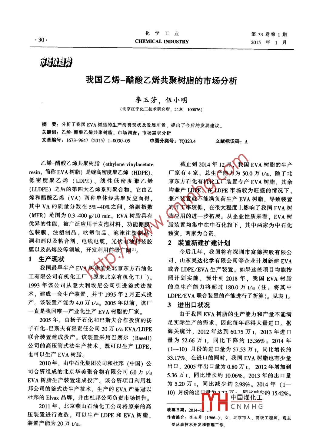 化學(xué)工業(yè)第33卷第1期●30●CHEMICAL INDUSTRY2015年1月市級(jí)周勢(shì)我國(guó)乙烯-醋酸乙烯共聚樹脂的市場(chǎng)分析李玉芳,伍小明(北京江寧化工技術(shù)研究所,北京10076)摘要: 分析了我國(guó)EVA樹脂的生產(chǎn)消費(fèi)現(xiàn)狀及發(fā)展前景,提出了今后的發(fā)展建議。關(guān)鍵詞:乙烯~醋酸乙烯共聚樹脂;市場(chǎng)調(diào)查;市場(chǎng)需求分析文章編號(hào): 1673-9647 (2015) 1-0030-05中圖分類號(hào): TQ323.4文獻(xiàn)標(biāo)識(shí)碼: A乙烯=醋酸乙烯共聚樹脂(ethylene vinylacetate截止到2014年12月,我國(guó)EVA樹脂的生產(chǎn)resin,簡(jiǎn)稱EVA樹脂)是繼高密度聚乙烯(HDPE)、廠家有4家,總生產(chǎn)能力為50.0萬Va,除了北低密度聚乙烯(LDPE)、 線性低密度聚乙烯京東方石化有機(jī)化工廠裝置專產(chǎn)EVA樹脂,其余(LLDPE)之后的第四大乙烯系列聚合物。它由乙均兼產(chǎn)LDPE。在LDPE市場(chǎng)較為旺盛的情況下,烯和醋酸乙烯(VA)兩種單體經(jīng)共聚反應(yīng)而得,兼產(chǎn)裝置就不能滿負(fù)荷生產(chǎn)EVA樹脂,導(dǎo)致裝置其中VA的質(zhì)量分?jǐn)?shù)在5%~40%之間,熔融指數(shù)的開工率較低,在很大程度上影響了我國(guó)EVA樹(MFR)范圍為0.3-400 g/l0 min。EVA樹脂具有脂應(yīng)用的進(jìn)-步拓展。從企業(yè)性質(zhì)來看, EVA樹優(yōu)異的性能,被廣泛應(yīng)用于發(fā)泡材料,功能棚膜、脂裝置均集中在中石化旗下,其中兩家為中石化包裝膜、注塑制品、吹塑制品、泡沫注塑制品、獨(dú)資,兩家為合資。調(diào)和劑以及粘合劑、電線電纜,光伏電池封裝膠2裝置新建擴(kuò)建計(jì)劃膜以及熱熔膠等領(lǐng)域,開發(fā)利用前景廣闊"。今后幾年,我國(guó)將有深圳市富德控股有限公1生產(chǎn)現(xiàn)狀司、山東昊達(dá)化學(xué)有限公司等企業(yè)計(jì)劃新建EVA我國(guó)最早生產(chǎn)EVA樹脂的是北京東方石油化或者LDPE/EVA生產(chǎn)裝置。如果這些項(xiàng)目均能按工有限公司有機(jī)化工廠(原來北京有機(jī)化工廠)。照計(jì)劃實(shí)施,預(yù)計(jì)到2018年,我國(guó)EVA樹脂1993年該公司從意大利埃尼公司引進(jìn)釜式法技的總生產(chǎn)能力將超過180.0萬t/a (注:將其中術(shù),建成-套生產(chǎn)裝置,并于1995年2月正式投LDPE/EVA聯(lián)合裝置的產(chǎn)能進(jìn)行了折算)。見表1。產(chǎn)。該裝置產(chǎn)能為4.0萬t/a。2005 年以前,該廠3進(jìn)出口狀況一直是我國(guó)唯一產(chǎn)業(yè)化生產(chǎn)EVA樹脂的廠家。由于我國(guó)EVA樹脂的生產(chǎn)能力和產(chǎn)量不能滿2005年,由揚(yáng)子石化和巴斯夫合作投資的揚(yáng)足實(shí)際生產(chǎn)的需求,因此每年都得大量進(jìn)口。據(jù)子石化-巴斯夫有限責(zé)任公司20萬Va EVALDPE海關(guān)統(tǒng)計(jì),2012 年達(dá)到60.75萬t, 2013年進(jìn)口聯(lián)合裝置建成投產(chǎn)。該裝置采用巴塞爾(Basell)量為52.66 萬t,同比下降約15.36%; 2014 年公司的高壓管式法生產(chǎn)技術(shù),既可以生產(chǎn)LDPE,(1-10)月份的進(jìn)口量為57.53萬t,同比增長(zhǎng)約也可以生產(chǎn)EVA樹脂。2010年,由中石化集團(tuán)公司和杜邦(中國(guó))公33.17%。在進(jìn)口的同時(shí),我國(guó)EVA樹脂也有少量司合資組成的北京華美聚合物有限公司6.0萬Va出口,2005年出口量為0.80萬t,2012 年增加到EVA樹脂生產(chǎn)裝置建成投產(chǎn)。該合資項(xiàng)目利用杜5.36萬t,同比增長(zhǎng)約10.06%。2013 年的出口量邦公司的釜式法生產(chǎn)技術(shù),生產(chǎn)的EVA產(chǎn)品冠以為5.20萬t,同比減少約2.98%。2014年(1-杜邦的Elvax品牌,并由杜邦公司負(fù)責(zé)市場(chǎng)銷售。中國(guó)煤化工!>約15.42%。2011年,北京燕山石油化工公司將原來的高收稿日期: 2014-1DHCNM HG壓裝置進(jìn)行改造,可以生產(chǎn)LDPE和EVA樹脂,作者簡(jiǎn)介:李玉芳(1966-), 女,北京市人,高級(jí)工程師,現(xiàn)主裝置產(chǎn)能為20萬l/a。要從事技術(shù)開發(fā)和管理工作。第1期李玉芳等:我國(guó)乙烯-醋酸乙烯共聚樹脂的市場(chǎng)分析表1我國(guó)2014- -2017 年EVA樹脂新建擴(kuò)建計(jì)劃企業(yè)名稱建設(shè)地點(diǎn)產(chǎn)能/(萬ta-l)預(yù)計(jì)投產(chǎn)年份生產(chǎn)工藝深圳富德控股有限公司吉 林松原20.0以甲醇制烯烴為原料山東昊達(dá)化學(xué)有限公司山東滕州10.02015管式法臺(tái)塑公司浙江寧波7.22014釜式法.神華集團(tuán)陜西榆林30.02017LDPEEVA聯(lián)合裝置盛宏集團(tuán)江蘇連云港35.0201620萬/a為釜式法,15萬Va為管式法上海焦化集團(tuán)公司.安徽蕪湖.管式法,LDPE/EVA聯(lián)合裝置上海石油化工公司上海-湛江中科廣東湛江中石化與科威特合資項(xiàng)目, LDPE/EVA聯(lián)合裝置2005--2013年我國(guó)EVA樹脂的進(jìn)出口量統(tǒng)計(jì)見表3近幾年我國(guó)進(jìn)口EVA樹脂來源地表2所示。來源地2011年 2012年2012年2014年(1-10)月中國(guó)臺(tái)灣17.9518.2417.3114.56表2 2005- -2013年我國(guó)EVA樹脂的進(jìn)出口統(tǒng)計(jì)韓國(guó)9.45 12.3111.2221.50進(jìn)口出口新加坡4.846.125.60年份進(jìn)口量/ 平均進(jìn)口價(jià)/出口量/ 平均出口價(jià)/日本5.186.304.954.08萬t(美元.r)(美元)4.073.06200539.391 314.640.801 407.91泰國(guó)3.436.27.605.4436.851 354.251.581 495.01加拿大2.013.362.471.502007 42.741 534.022.411 687.42比利時(shí)0.680.460.390.762008 ,1 955.581 914.26巴西1.032.790.782009 50.561 499.993.931 448.70法國(guó)0.66 0.78