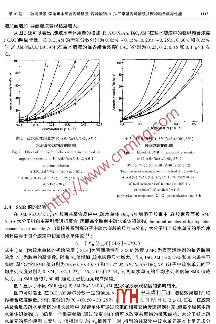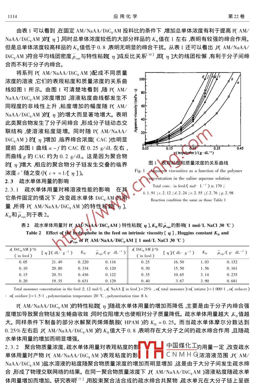第22卷第10期應(yīng)用化學(xué)Vol 22 No. 102005年10月CHINESE JOURNAL OF APPLIED CHEMISTRY0ct.2005孿尾疏水締合丙烯酰胺/丙烯酸鈉/ⅳ-二辛基丙烯酰胺共聚物的合成與性能耿同謀*吳文輝“重慶師范大學(xué)化學(xué)學(xué)院重慶4004北京理工大學(xué)材料科學(xué)與工程學(xué)院北京100061)摘要采取三元膠束共聚法合成了孿尾疏水締合丙烯酰胺丙烯酸鈉/N,N-二辛基丙烯酰胺共聚物[R(AM/ NaAA/ DiCe aM)]采用FTR、HNMR測(cè)試技術(shù)進(jìn)行了結(jié)構(gòu)表征研究了水溶液的粘度行為。當(dāng)總單體濃度在1.70-3.20mol/L、DiC3AM摩爾分?jǐn)?shù)為0.05%-0.40%和SMR值為70-25時(shí)在30℃、1ml/LNaCl溶液中AM/NaAA/DiC3AM)的特性粘數(shù)η]為3.67~26.38dL/ huggins常數(shù)k為0.220~3.90平均線團(tuán)密度p、.0.16-0.681gdL隨總單體濃度的增加、疏水單體用量減少[n增加K、p灬減少在礦化度為1934μgg鹽水溶液中隨總單體質(zhì)量濃度、疏水單體用量的增加及SMR值的減少水溶液的表觀粘度增加、臨界締合濃度降低。結(jié)果表明 P AM/NaAA/DiC AM)旳粘度性質(zhì)和締合行為取決于其特性粘數(shù)η]的大小、疏水單體用量及其嵌段長(zhǎng)度和分布關(guān)鍵詞孿尾膠束聚合水溶性聚合物疏水締合合成粘度中圖分類(lèi)號(hào)631.3文獻(xiàn)標(biāo)識(shí)碼∶A文章編號(hào)1000518(2005)10-111205疏水改性聚丙烯酰胺是一類(lèi)重要的疏水締合水溶性聚合物因其獨(dú)特的分子自組裝行為和溶液性能而備受關(guān)注。但是該類(lèi)共聚物的疏水單體多為N單尾( single-tailed)取代的疏水丙烯酰胺單體21在膠束聚合中疏水單元的組分隨轉(zhuǎn)化率的升高而降低34。 Candau等5研究表明用烷基或芳基將N-單尾取代的疏水丙烯酰胺單體氮原子上的氫原子取代后生成N八-雙取代丙烯酰胺疏水單體的極性降低可以使共聚物的平均組分不隨轉(zhuǎn)化率、表面活性劑與疏水單體的摩爾比率( surfactant to hydrophobic monomer molar ratio簡(jiǎn)稱SMR值)的改變而改變渃N,N雙取代丙烯酰胺為N,N孿尾(twintailed)雙取代丙烯酰胺ρ個(gè)疏水長(zhǎng)鏈在同1個(gè)N原子上疏水密度較大增粘效果顯著增強(qiáng)。但早期的研究多為N,孿尾雙取代丙烯酰胺/丙烯酰胺二元共聚物相對(duì)分子質(zhì)量較低溶解性、增粘效果較差-9。本文利用氧化還原體系在較低的溫度和較高的總單體濃度下合成了孿尾疏水締合丙烯酰胺/丙烯酸鈉N、-二辛基丙烯酰胺三元共聚牣簡(jiǎn)稱Ⅸ AM/NaAA/dicΔM)]并研究了它們的結(jié)構(gòu)組成與水溶液粘度間的關(guān)系。1實(shí)驗(yàn)部分1.1試劑和儀器丙烯酰膩AM)過(guò)硫酸銨、尿素、碳酸氬鈉均為分析純?cè)噭┲榛蛩徕c(SS)乙二胺四乙酸二敏(EDTA)丙烯酸均為化學(xué)純?cè)噭?八-二甲基胺基乙基2-甲基丙烯酸釀DM)99%孿尾疏水單體N、二辛基丙烯酰胺(DiC3AM)按文獻(xiàn)5]方法采用肖特-鮑曼( Schotten- Baumann)?;饔弥苽洹?Nicolet-560型傅立葉變換紅外光譜儀〔美國(guó));ARⅹ-400型核磁共振儀(瑞士 Brucker公司)D40.51mm型 Ubbelohde粘度計(jì)(北京玻璃儀器廠)LVDV-Ⅱ+型 Brookfield旋轉(zhuǎn)粘度計(jì)(0號(hào)轉(zhuǎn)子)(美國(guó)1.2RAM/NaAA/DCAM)的合成H中國(guó)煤化工于燒杯加入0.041-0.327 DiCe AM和6.016gCNMN凹拌0.5~1h,轉(zhuǎn)移到2004-12-26收稿200504-15修回中國(guó)石油化工集團(tuán)公司十五重大科技攻關(guān)項(xiàng)目(Pl00043)通訊聯(lián)系歉據(jù)1962生男博士高級(jí)工程師; E-mail gengtongmou@sin,com;研究方向水溶性高分子第10期耿同謀等孿尾疏水締合丙烯酰胺丙烯酸鈉N-二辛基丙烯酰胺共聚物的合成與性能1113500mL三口瓶中。冰浴條件下在裝有通氮?dú)夤?、?dǎo)氮?dú)夤芎蛿嚢柩b置的三口瓶中加入50mL蒸餾水并加入14.468~14.915gAM、4.989~5.044g丙烯酸、4 mg edta、10mg尿素和2mgDM攪拌使其完全溶解。用NaOH溶液調(diào)節(jié)pH值約為7加入3.450g碳酸氫鈉再用NaOH溶液調(diào)節(jié)pH=10.0。通N氣攪拌0.5h后加入8mg過(guò)硫酸銨使總單體濃度在1.70~3.20mo/L其中 DiCe AM疏水單體摩爾分?jǐn)?shù)為0.05%~0.40%SMR值為20~70 o( naaa)=25%m(總單體)m引發(fā)劑)=1000:1m(還原劑)氧化劑)=1.5:1。換成水浴恒溫20℃繼續(xù)通N2氣,恒溫反應(yīng)8h,即得PAM/NaAA′DiCoM)膠體。將買(mǎi)AM/ NaAA/diCo aM)膠體剪碎加水溶脹、溶解后倒入丙酮中沉淀并用甲醇洗滌將沉淀得到的rAM/ NaAA/ diCe am〕用無(wú)水乙醇提取8h以除去殘留的SDS和水分最后在50℃真空干燥6h粉碎放入干燥器中備用。1.3R( AM/NaAA/DC3AM)水溶液粘度的測(cè)試準(zhǔn)確稱取提純的rAM/NaAA/ DICs AM)NaCl加入蒸餾水溶解后轉(zhuǎn)移到100mL容量瓶中稀釋至刻度配成一定聚合物質(zhì)量濃度的1.000 mol/L NaCl溶液迕稀溶液范圍內(nèi)采用粘度計(jì)用逐步稀釋外推法測(cè)定RAM/ NaAa/ dic3AM)在1.000mol/ L Nacl溶液中的特性粘數(shù)η吸及 Huggins常數(shù)K1將提純的ⅨAM/NaAA/ DiCo AM)在攪拌下加入鹽水中使其溶解在亞濃溶液范圍內(nèi)采用旋轉(zhuǎn)粘度計(jì)(0號(hào)轉(zhuǎn)子)測(cè)定RAM/NaAA/DiC3AM)鹽水溶液的表觀粘度鹽水礦化度為19334μg/gCa21143μg/g、Mg2863kg/g、HCO3:734wg/g,其余為Na、Cl)。測(cè)試溫度為85℃剪切速率為7.34s-。2結(jié)果與討論2.1 P AM/NaAA/ DICoAM)結(jié)構(gòu)的表征IAM/NaA/DC3AM)的FTIR譜圖各峰歸屬3371和3202cm為伯酰胺一NH2基團(tuán)的對(duì)稱和非對(duì)稱伸縮振動(dòng)峰;686與1562cm處有2個(gè)峰分別為酰胺、C00上的C=0的伸縮振動(dòng);1616cm-為酰胺