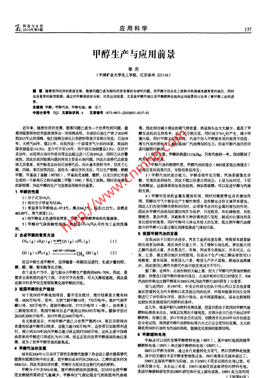 瓦驕花卓朱霸應(yīng)用科學(xué)137甲醇生產(chǎn)與應(yīng)用前景徐慶(中國礦業(yè)大學(xué)化工學(xué)院,江蘇徐州21116)摘戛隨著我國經(jīng)濟的高速發(fā)展,能灝問題已成為制約經(jīng)濟發(fā)展的全球性問題。而甲醇不僅在化工原料中扮演越來越重要的地位,同時也是重要的新型能源。通過對甲醇現(xiàn)狀的分析,對其應(yīng)用前最尤其是甲醇汽油以及甲醇燃料電池的應(yīng)用前景的討論來了解甲醇工業(yè)的進關(guān)鍵調(diào)甲醉;甲醇汽油;甲醇電池;碳化T.中圖分類號TQ2文獻(xiàn)標(biāo)識碼文章編號1673-9671-(2010)051-0137 01近年來,隨著經(jīng)濟的發(fā)展,能源問題已成為一個世界性的問題。 據(jù)等。因此相對減少理論的尾氣排放量.熱量損失也大大減少。提高了甲美國能源部和世界能源理事會-項預(yù)測表明,全球的石油生產(chǎn)將于2010年醇發(fā)動機的總熱效率,由于其可燃點低,同時減少NO、的產(chǎn)生,堿少環(huán)到2015年達(dá)到頂峰,他們預(yù)測全球化石類燃料資源開采期分別是:石油39境污染。同時甲醇辛烷值較高,汽油中加入甲醇能有效的提高辛烷值,年,天然氣60年,煤211年。而我同是一個富煤貧氣少油的國家,我國的增大汽油的游標(biāo)號,減輕煉油廠汽油增加的壓力。但是甲醉汽油仍有許煤炭儲量是145G,至少可開采116年,而中國石油儲量是3.3G.,僅供開多問題期待解決。采20年。而我國石油對外依存度遠(yuǎn)遠(yuǎn)超過進口石油30%這- -國際公認(rèn)的警1)能量含量。甲醇的熱111kJAg,只有汽油的一半。因而限制了戒線。因此在我國能源問題的體現(xiàn)主要是石油問題。因此石油替代品就顯汽車的行駛距離。得尤其重要,而甲醇是良好的石油替代品。而在基本原料當(dāng)中,僅次于乙2) 甲醇汽油的物理性質(zhì)。甲醇汽油的混合( M85或者低比例混合)烯,丙烯,苯位居第四位。其作為-碳化學(xué)的支柱,可以生產(chǎn)酷酸,醋酸出現(xiàn)反常的高蒸汽壓,導(dǎo)致烴類易揮發(fā)。甲酯,甲基叔丁基醚(MTBE),甲基叔戊基醚,酸酐,以及21世紀(jì)有機3)甲醇汽油的混合能力。甲醇是極性化合物,汽油是碳?xì)浠虾铣傻?個新基石之稱的碳酸二甲酯( DMC)等化工原料。同時亦是潛在物,呈現(xiàn)的是弱極性,因此不能以任意比例混合。上.層為高烴層, 下層的新能源。因此甲醇的生產(chǎn)與發(fā)展顯得格外的重要。為高醇層,這就需要添加某些助劑,例如高碳醇,可以促進甲醇與汽油1甲醇的性質(zhì)的互溶。1)分子式為CH.0。,4)甲醇對發(fā)動機金屬有腐蝕作用,同時對橡膠管也具有腐蝕作2)相對分子質(zhì)量為32.04。用。而醇在空氣中被氧化產(chǎn)生酸性物質(zhì),這些酸也會給金屬帶來腐蝕。3)常溫常壓甲醉熔點-97.8C。沸點64.5C。閃點12.22C。 自燃點因此人們在使用醇類燃料的同時,必須要考慮到對金屬的腐蝕的作用,因此在甲醇汽油添加抗腐蝕劑作為保護,月前胺類,有機磷酸類,有機463.89C。蒸氣密度1.11。4)純甲醇是無色透明易揮發(fā),可燃,略帶醇香味的有毒液體。羧酸類,氮雜環(huán)類,屏蔽酚類五種防腐劑進行復(fù)配,制成的抗腐蝕劑具5)甲醇對氣體溶解性很強,特別是CO2與Hs,可作為工業(yè)的洗滌有比較好的效果。同時甲醇對人體也有較大的危害,低比例甲醇汽油排放出的甲醛叮以通過催化削降低排放氣體的污染。2合成甲醇的常用方法5我國甲醇汽油的發(fā)展在我國由于日前經(jīng)濟進步,汽車工業(yè)的迅速發(fā)展,導(dǎo)致原本就緊缺CH。(g) +HD0(g)川加熱C(g) +3H2(g)(1)的石油更加閑難?,F(xiàn)在油價日益上升,為了緩解石油危機,曾經(jīng)提出用乙醇汽油的方案,并在黑龍江,吉林,河南等全部地區(qū),并在河北,山C0(g) +3H2z(g) cat50-100CH. OH(g)(2)東,江蘇,湖北部分地區(qū)封閉使用。但是由于生產(chǎn)1噸乙醇需要使用3.3反應(yīng)中除生成甲醇外,還伴隨著一些副反應(yīng)進行,生成少量的烴,噸糧食,成本很高,而我國人口多,糧食生產(chǎn)并不富裕,耕地在逐漸減醇,醛,醚,酸和酯等化合物。少,因此使用乙醇作為替代汽油月前在我國并不可行。在T業(yè)生產(chǎn)當(dāng)中, 造氣部分占甲醇生產(chǎn)能耗的60% -70%。 因此,若據(jù)了解,近兩年,石油價格的大幅上漲,拉大了甲醇與汽柴油價格的能省去高耗能的造氣T段,不但可節(jié)省投資,可大大降低能耗,因此最差距。即便在日前甲醇價格相對高位、石油價格相對低位的情況下,93#汽油的價格也比精甲醇高43000元噸,因此甲醇汽油的研發(fā)1分重要。近新興的是甲烷直接制取氧化得甲醇的方法。而與此同時,在1997年, 中美合作研究組隊中國山西以及其他富煤3我國甲醇的生產(chǎn)現(xiàn)狀對于我國的甲醇規(guī)劃項目,據(jù)不完全統(tǒng)計,統(tǒng)計結(jié)果是大概有88地區(qū)把煤轉(zhuǎn)化為汽車燃料以及其他應(yīng)用的經(jīng)濟.環(huán)境和能源利用生命周項、4850萬噸年。其中,天然氣制甲醇14項, 770萬噸年;焦?fàn)t氣制甲期進行了評估即3K評估,報告中指出,在中國富煤地區(qū),具有比較獨特醇11項, 305萬噸/年;煤制甲醇63項,3775萬噸年(一期)。如果算上比較好的發(fā)展煤制代用燃料的條件。二期規(guī)劃項目,我國甲醇項目總產(chǎn)能則達(dá)到6395萬噸/年。據(jù)保守估計近幾年, 煤基甲醇光油燃料發(fā)展迅速,但是月前由于我國的甲醉汽油燃料標(biāo)準(zhǔn)尚未出臺,導(
