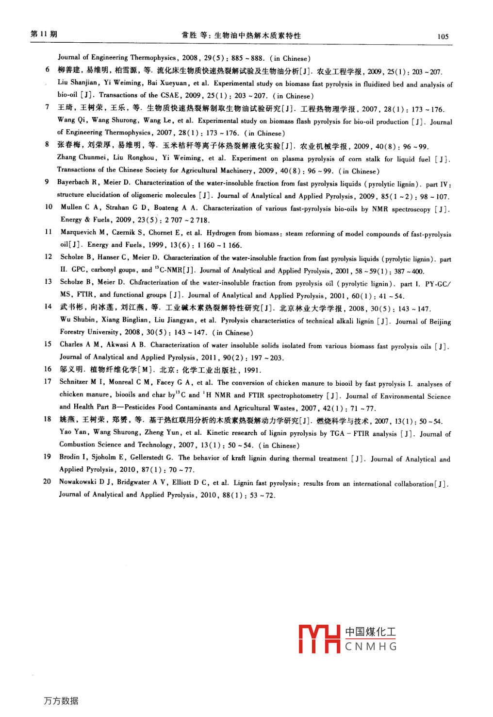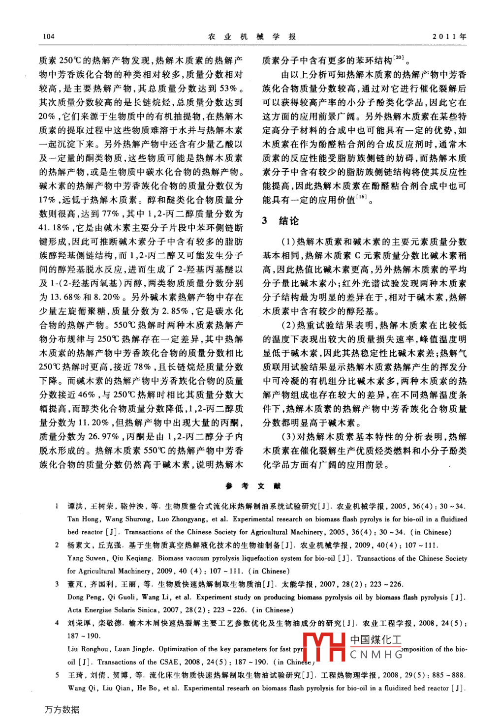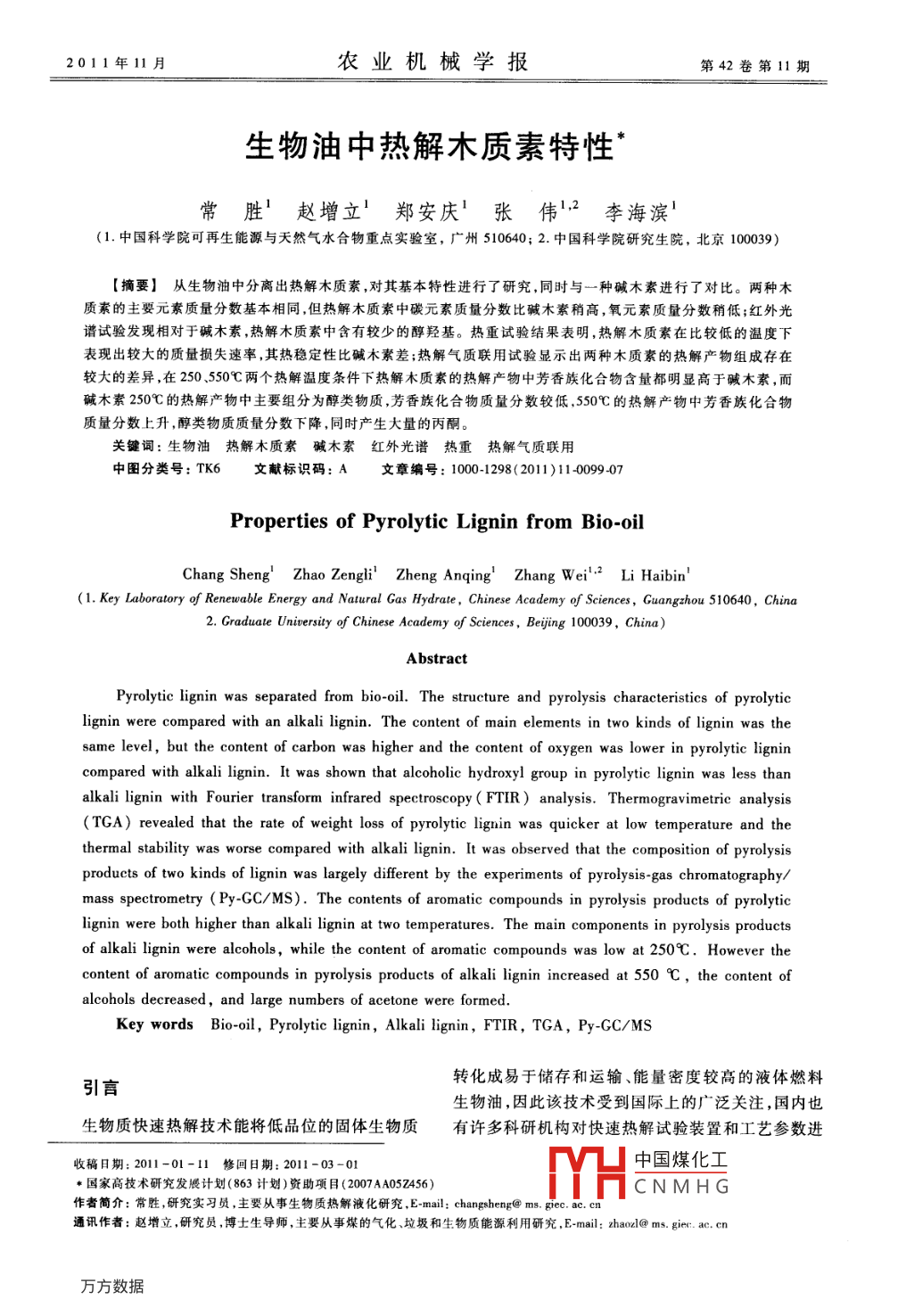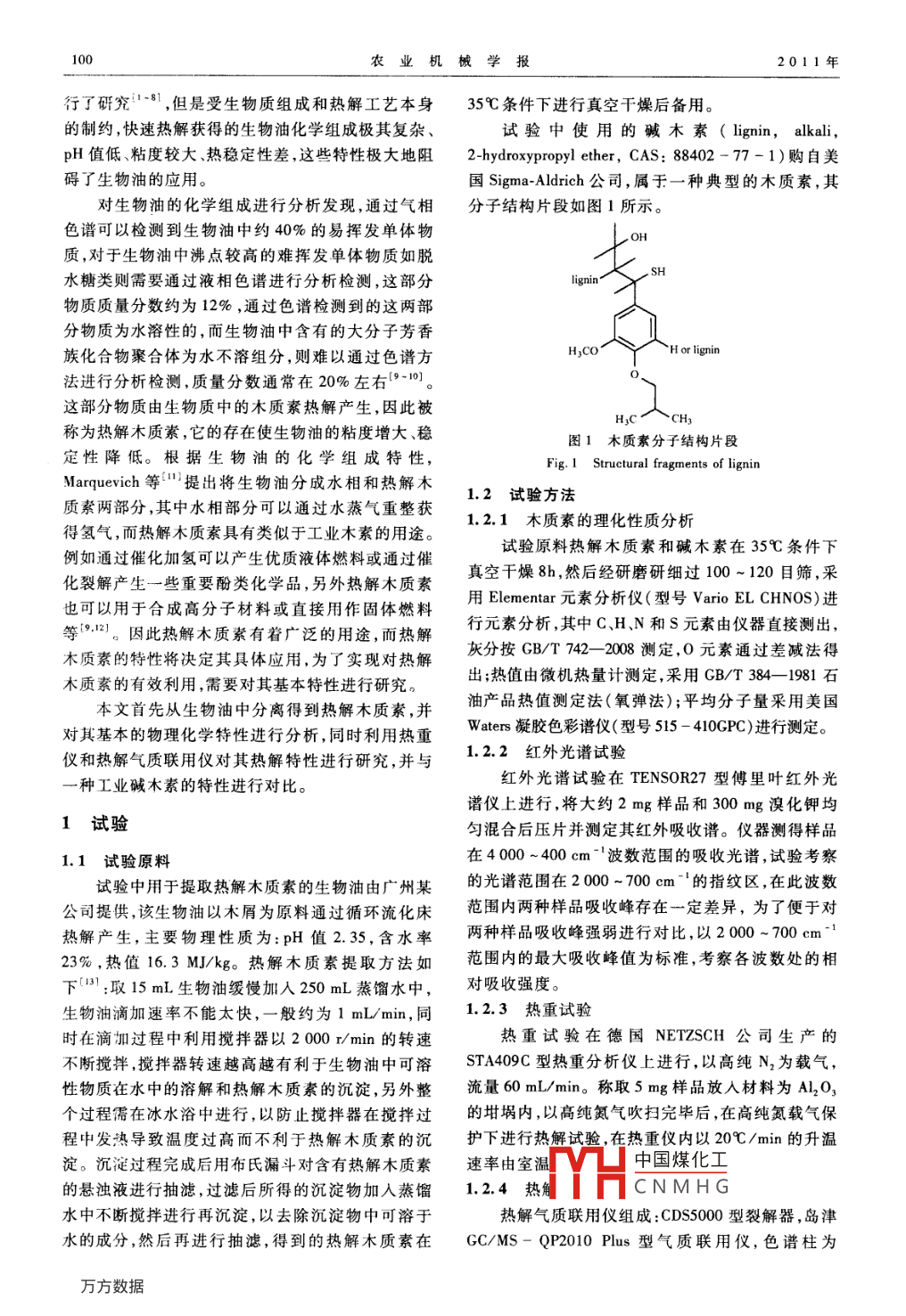 2011年11月農(nóng)業(yè)機械學(xué)報第42卷第11期生物油中熱解木質(zhì)素特性常勝趙增立!鄭安慶張偉·2李海濱(1.中國科學(xué)院可再生能源與天然氣水合物重點實驗室,廣州510640;2.中國科學(xué)院研究生院,北京100039)【摘要】從生物油中分離出熱解木質(zhì)素,對其基本特性進行了研究,同時與一種堿木素進行了對比。兩種木質(zhì)素的主要元素質(zhì)量分?jǐn)?shù)基本相同,但熱解木質(zhì)素中碳元素質(zhì)量分?jǐn)?shù)比堿木素稍高,氧元素質(zhì)量分?jǐn)?shù)稍低;紅外光譜試驗發(fā)現(xiàn)相對于堿木素,熱解木質(zhì)素中含有較少的醇羥基。熱重試驗結(jié)果表明,熱解木質(zhì)素在比較低的溫度下表現(xiàn)出較大的質(zhì)量損失速率,其熱穩(wěn)定性比堿木素差;熱解氣質(zhì)聯(lián)用試驗顯示出兩種木質(zhì)素的熱解產(chǎn)物組成存在較大的差異,在250、550℃兩個熱解溫度條件下熱解木質(zhì)素的熱解產(chǎn)物中芳香族化合物含量都明顯高于堿木素,而堿木素250℃的熱解產(chǎn)物中主要組分為醇類物質(zhì),芳香族化合物質(zhì)量分?jǐn)?shù)較低,550℃的熱解產(chǎn)物中芳香族化合物質(zhì)量分?jǐn)?shù)上升,醇類物質(zhì)質(zhì)量分?jǐn)?shù)下降,同時產(chǎn)生大量的丙酮。關(guān)鍵詞:生物油熱解木質(zhì)素堿木素紅外光譜熱重?zé)峤鈿赓|(zhì)聯(lián)用中圖分類號:TK6文獻標(biāo)識碼:A文章編號:10001298(2011)11009907Properties of Pyrolytic Lignin from Bio-oilChang Sheng Zhao Zengli Zheng Anqing Zhang Wei'2Li Haibin'(1. Key Laboratory of Renewable Energy and Natural Gas Hydrate, Chinese Academy of Sciences, Guangzhou 510640, China2. Graduate University of Chinese Academy of Sciences, Beijing 100039,ChiAbstractPyrolytic lignin was separated from bio-oil. The structure and pyrolysis characteristics of pyrolyticignin were compared with an alkali lignin. The content of main elements in two kinds of ligninsame level, but the content of carbon was higher and the content of oxygen was lower in pyrolytic lignincompared with alkali lignin. It was shown that alcoholic hydroxyl group in pyrolytic lignin was less thanalkali lignin with Fourier transform infrared spectroscopy( FTIR )analysis. Thermogravimetric analysis(TGA) revealed that the rate of weight loss of pyrolytic lignin was quicker at low temperature and thethermal stability was worse compared with alkali lignin. It was observed that the composition of pyrolysisroducts of two kinds of lignin was largely different by the experiments of pyrolysis-gas chromatography/mass spectrometry(Py-GC/MS). The contents of aromatic compounds in pyrolysis products of pyrolyticlignin were both higher than alkali lignin at two temperatures. The main components in pyrolysis productsof alkali lignin were alcohols, while the content of aromatic compounds was low at 250C. However thecontent of aromatic compounds in pyrolysis products of alkali lignin increased at 550 C, the content ofalcohols decreased, and large numbers of acetone were formedKey words Bio-oil, Pyrolytic lignin, Alkali lignin, FTIR, TGA, Py-GC/MS引言轉(zhuǎn)化成易于儲存和運輸、能量密度較高的液體燃料生物油,因此該技術(shù)受到國際上的廣泛關(guān)注,國內(nèi)也生物質(zhì)快速熱解技術(shù)能將低品位的固體生物質(zhì)有許多科研機構(gòu)對快速熱解試驗裝置和工藝參數(shù)進收稿日期:2011-01-11修回日期:2011-03-01中國煤化工國家高技術(shù)研究發(fā)展計劃(863計劃)資助項目(2007A057456)CNMHG作者簡介:常勝,研究實習(xí)員,主要從事生物質(zhì)熱解液化研究, E-mail: changsheng@ms,gee,a通訊作者:趙增立,研究員,博士生導(dǎo)師,主要從事煤的氣化、垃圾和生物質(zhì)能源利用研究,E- mail: zhao@ms.gie.ae,cn100農(nóng)業(yè)機械學(xué)報2011年行了研究8,但是受生物質(zhì)組成和熱解工藝本身35℃條件下進行真空干燥后備用。的制約,快速熱解獲得的生物油化學(xué)組成極其復(fù)雜、試驗中使用的堿木素( lignin, alkalipH值低、粘度較大、熱穩(wěn)定性差,這些特性極大地阻2- hydroxypropyl ether,CAS:88402-77-1)購自美礙了生物油的應(yīng)用。國 Sigma- Aldrich公司,屬于一種典型的木質(zhì)素,其對生物油的化學(xué)組成進行分析發(fā)現(xiàn),通過氣相分子結(jié)構(gòu)片段如圖1所示。色譜可以檢測到生物油中約40%的易揮發(fā)單體物質(zhì),對于生物油中沸點較高的難揮發(fā)單體物質(zhì)如脫水糖類則需要通過液相色譜進行分析檢測,這部分物質(zhì)質(zhì)量分?jǐn)?shù)約為12%,通過色譜檢測到的這兩部分物質(zhì)為水溶性的,而生物油中含有的大分子芳香族化合物聚合體為水不溶組分,則難以通過色譜方H or lignin法進行分析檢測,質(zhì)量分?jǐn)?shù)通常在20%左右1。這部分物質(zhì)由生物質(zhì)中的木質(zhì)素?zé)峤猱a(chǎn)生,因此被稱為熱解木質(zhì)素,它的存在使生物油的粘度增大、穩(wěn)圖1木質(zhì)素分子結(jié)構(gòu)片段定性降低。根據(jù)生物油的化學(xué)組成特性,Fig. I Structural fragments of ligninMarquevich等提出將生物油分成水相和熱解木質(zhì)素兩部分,其中水相部分可以通過水蒸氣重整獲12試驗方法得氫氣,而熱解木質(zhì)素具有類似于工業(yè)木素的用途1,2.1木質(zhì)素的理化性質(zhì)分析試驗原料熱解木質(zhì)素和堿木素在35℃條件下化裂解產(chǎn)生一些重要酚類化學(xué)品,另外熱解木質(zhì)素真空干燥8,然后經(jīng)研磨研細過10010日篩,采也可以用于合成高分子材料或直接用作固體燃料 Elementar元