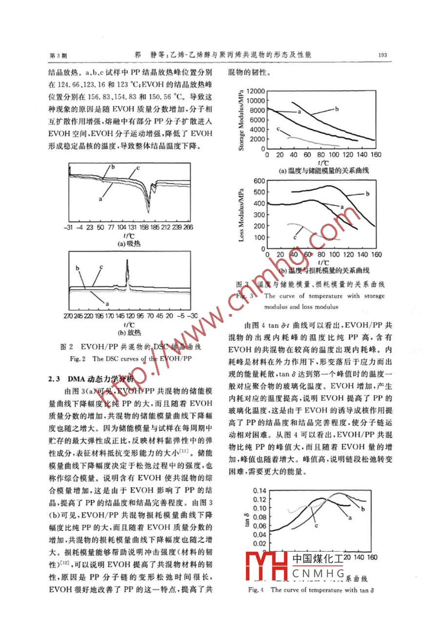 第30卷第3期大連工業(yè)大學(xué)學(xué)報(bào)Vol. 30 No. 32011年5月Journal of Dalian Polytechnic UniversityMay.2011文章編號(hào):1674-1404(2011)03-0191-04乙烯-乙烯醇與聚丙烯共混物的形態(tài)及性能郭靜',張旭',陳榮榮',王金香2(1.大連工業(yè)大學(xué)化工與材料學(xué)院,遼寧大連116034;2. 江蘇華亞化纖有限公司,江蘇宜興214253 ) .摘要:以聚丙烯接枝馬來(lái)酸酐(PP-gMAH)為增容劑,共混聚丙烯(PP)與乙烯-乙烯醇(EVOH)制備可潤(rùn)濕性PP.用掃描電鏡(SEM)、動(dòng)態(tài)粘彈譜儀(DMA)和差示掃描最熱儀(DSC)分析了EVOH/PP共混物的形態(tài)結(jié)構(gòu).力學(xué)性能和熱性能。用接觸角測(cè)定儀表征了共混物的可潤(rùn)濕性。SEM結(jié)果表明共混物呈明顯兩相結(jié)構(gòu),EVOH作為分散相呈球形分散在連續(xù)相PP中。分散相EVOH的尺寸大小隨著EVOH質(zhì)量分?jǐn)?shù)增加而增大。DMA結(jié)果表明PP與EVOH共混物的玻璃化溫度、損耗模量和儲(chǔ)能模量隨著EVOH的質(zhì)量分?jǐn)?shù)增加而增大。共混物的DSC曲線出現(xiàn)雙熔融峰和雙結(jié)晶峰,熔融峰和熱結(jié)晶峰的位置與EVOH質(zhì)量分?jǐn)?shù)有關(guān)。共混物的可潤(rùn)濕性隨EVOH質(zhì)量分?jǐn)?shù)增加而增強(qiáng)。關(guān)鍵詞:乙烯~乙婦醇/聚丙烯共混物;動(dòng)態(tài)力學(xué)性;河潤(rùn)濕性中圖分類(lèi)號(hào): TQ325. 14文獻(xiàn)標(biāo)志碼: AStudy on the morphology and properties of EVOH/PP blendsGUO Jing', ZHANG Xu', CHEN Rong-rong' ,WANG Jin-xiang2( 1. School of Chemistry Engineering and Material, Dalian Polytechnic University, Dallan 116034, China;2. Jiangsu Huaya Chemical Fiber Company Limited, Yixing 214253, China )Abstract: With PP-g-MAH as compatibilizer, the polypropylene (PP) and poly(ethylene -co-vinylalcohol) (EVOH) blend was preparated by extruder. The morphology and properties of PP/EVOHblend was investigated by scanning electron microscopy(SEM),dynamic mechanical analysis(DMA)and differential scanning calorimetry(DSC). SEM shows that the blends are clearly biphasic, EVOHas dispersed phases distributed in PP matrix with spherical. The diameter of EVOH particles increasesas the EVOH content in the blend increases. The DMA shows the loss modulus and the glasstransition temperature increases as the EVOH content increases. The storage modulus increases alongwith the EVOH content increases. The DSC shows the blends show double crystallographic peak anddouble molten peak. The position of peak is influenced as the EVOH content. In addition, thehydrophilicity of the EVOH/PP blend increase as increasing the content of EVOH.Key words: EVOH/PP blend; dynamic mechanical properties; hydrophilicity0引言域[3]。為了克服這些缺陷,擴(kuò)展聚丙烯的應(yīng)用范圍,許多研究者致力改善聚丙烯可潤(rùn)濕性的研聚丙烯(PP)因具有優(yōu)異的化學(xué)穩(wěn)定性、卓越究[*5],已經(jīng)開(kāi)發(fā)的方法包括表面接枝共聚、等離的介電性能、低廉的成本和良好的可加工性使其子體表面整理、化學(xué)法表面性、共混改性等。在各在薄膜、片材及各種制品在日常生活中大量地應(yīng)種改性方法中,共混改性以其方法簡(jiǎn)單、成本低、用。但由于其分子結(jié)構(gòu)規(guī)整.沒(méi)有極性基團(tuán),因此無(wú)污中國(guó)煤化工乙烯醇共聚物存在表面能低、可潤(rùn)濕性差、易積聚靜電等問(wèn)題,.(EV(T出CNMHC蘆低、阻隔性?xún)?yōu).這嚴(yán)重影響了它的應(yīng)用效果,限制其應(yīng)用領(lǐng)良、伸出工對(duì)、x山收漢八、剛石1.、抗靜電性好等收稿日期: 2010-05-18.作者簡(jiǎn)介:郭靜(1962-).女 ,教授.92大連工業(yè)大學(xué)學(xué)報(bào)第30檢特點(diǎn),在工程塑料及共混功能材料的制備方面有2結(jié)果與討論廣泛的應(yīng)用前景,已有報(bào)道將EVOH與PP復(fù)合2.1共混物形態(tài)分析或共混制備具有阻隔性薄膜940,而將其與聚丙烯共混制備可潤(rùn)濕性的聚丙烯的研究卻鮮見(jiàn)報(bào)由圖1可見(jiàn),EVOH/PP共混物具有兩相結(jié)道。本文作為利用EVOH改善PP可潤(rùn)濕性研構(gòu),根據(jù)共混比例可以推斷EVOH作為分散相究的一部分.重點(diǎn)研究了EVOH/PP共混物形態(tài)呈球形分散在連續(xù)相聚丙烯中。對(duì)比圖1兩圖可結(jié)構(gòu),熱性質(zhì)和動(dòng)態(tài)力學(xué)性能.并通過(guò)接觸角的測(cè)見(jiàn),試樣a中分散相EVOH在PP中出現(xiàn)幾率明顯試評(píng)價(jià)了共混物的可潤(rùn)濕性。小于試樣c.界面黏合性好于試樣c,粒子大小(0.1~1.0 μm)略小于試樣c(0. 3~1.38 μm)。1實(shí)驗(yàn)這是因?yàn)?- .方面聚合物的共混過(guò)程是分散與合.并的過(guò)程,在相同剪切應(yīng)力作用下,EVOH質(zhì)量1.1主要原料聚丙烯(PP),牌號(hào)71735,中國(guó)石油遼陽(yáng)石化分?jǐn)?shù)增加,其因碰撞而合并(凝聚)的幾率增大,導(dǎo)分公司烯烴廠; EVOH共聚物,T102.其中乙烯醇致粒子尺寸增加;另一方面由于試樣a.c加入的質(zhì)量分?jǐn)?shù)為32%,熔體流動(dòng)速率為每10 minPP g-MAH的量相同,其對(duì)EVOH產(chǎn)生相互作2.8g(190 C,2 160 g);聚丙烯接枝馬來(lái)酸酐用的分子數(shù)相同,EVOH質(zhì)最分?jǐn)?shù)增加后可能有(PP-g MAH).自制。部分EVOH沒(méi)有機(jī)會(huì)與PP-g-MAH作用,導(dǎo)致1.2 EVOH/PP 共混物制備相容性下降,界面黏合性降低。EVOH在90 C真空烘箱中干燥8h后與PP以及聚丙烯接枝馬來(lái)酸酐( PP-g-MAH)按質(zhì)量配比為: 15/80/5 .20/75/5和25/70/5的比例進(jìn)行預(yù)混合,然后在單