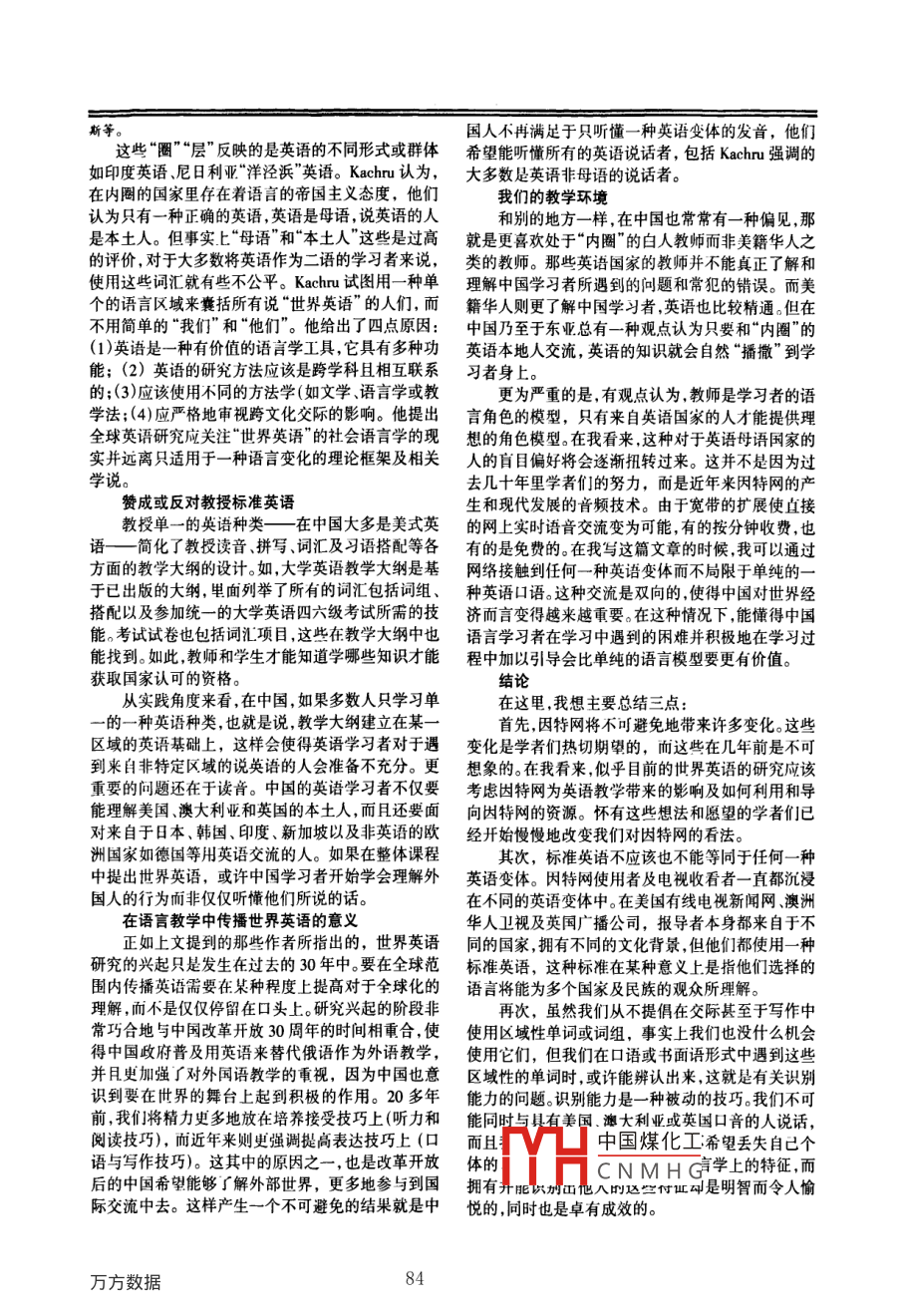 文章編號:1001-8794(2009)1-0083-02世界英語與中國葉晗修(上海市徐匯區(qū)業(yè)余大學,上海200032)摘要:世界在變化、時代在發(fā)展,英語這一公認的通用語言的變化更是讓人始料不及。由于英語在世界上的重要地位和它的廣泛使用、人們在使用英語的過程中不斷發(fā)展他們使用的英語,形成了各種帶有某個國家或地區(qū)特色的英語變體。該文通過對“世界英語"概念及語言學家 Kachru提出的三個同心團等理論的介紹,旨在為英語語言的教學打開一扇新的窗戶,結(jié)合中國英語語言環(huán)境的特點,使人們了解到在全球非、美、歐等不同國家英語語言的多元化發(fā)展的同時,“世界英語"的新特點和由此給中國英語語言教學帶來的新思考。關(guān)鍵詞:世界英語;語言學;社會政治;內(nèi)圈;外圈;擴展圈;第二語言中圖分類號:H31文獻標識碼:A英語全球化的背景與相關(guān)理論語”的論文。全球英語是基于政治及語言學的背景發(fā)展起來在過去的30年里,人們將注意力越來越多地投向英語的,在牛津大學出版社的網(wǎng)站www.askoxford.com上作為母語或外語的多樣性上,這種語言的多樣性被賦予很多有如下總結(jié):種名稱,如“新世界英語"(Pat, Weber&Hol984),“非母語制正如我所說的英語的發(fā)展有其政治背景,因此政治化的度化的多樣性”(Kahu1982,199a)或“英語的本土化形式”莢語也粉演了很多角色。( Strevens1992)。Plaf似乎是第一個使用“英語”復數(shù)的作者●它作為一種民族的語言、官方的語言、行政的語言、交人們也覺得復數(shù)形式有用,因為將語言的多樣性描述為世界際的語言,第二或第三有時甚至是第四語言如新加坡有四種語言而不是英語的方言使得各種語言變體和英式莢語或美式官方語言英語具有同等的地位。此外,復數(shù)形式也表達了語言的多種仝世界的莢語語言形式是多種多樣的,從標準英語到不同的種美。洋涇浜"英語,另外還有許多英語變體處于這兩者之間。有關(guān)新世界英語的研究也受到了廣泛的關(guān)注●英語作為民族語言的地位已牢圍樹立,在諸如英國、新Plat!等(1984)給新世界英語下了定義,認為世西蘭、澳大利亞等國家,而在魎北克(加拿大)、南非以及美國界英語應符合如下標準的一些州或地方,英語仍然受到一些少數(shù)法語者的挑戰(zhàn)?!瘛半S著教育體系的發(fā)展,世界英語也得到了發(fā)展?!斑@●雖然英語是商務(wù)、教育及政府來往中比較重要的語言,一標準排除了母語的各種變體。但在一個國家里,并不一定為絕大多數(shù)人奉為第一語言。有●”它在一個地區(qū)得到了發(fā)展,而在那個地區(qū)英語的母語時人們反對使用莢語這種“殖民地語言”,或者稱當?shù)氐臉I(yè)種變體不被當?shù)氐拇蠖鄶?shù)人所使用?!边@排除了移民所使用的語言變體為標準語,這在非洲的許多地方很常見語言變體,如在美國有來自說西語或葡語國家的移民所說的值得一提的語言學上的特征包括以下幾點英語●一些單詞作為區(qū)域性的方言正逐步成為英語單詞并被●“在使用它的區(qū)域中,人們用這種語言說話或?qū)懽?這吸收為標準英語。例如: budgerigar(澳大利亞語), bungalow(南種語言起到了一定的功能。”換言之,一種新的英語是用于將亞語), and trek(南非語)。其他單詞例如 bluey, chotapeg和英語作為第二語言的說話者之間的國際交流。這排除了純粹dng,同樣也出自這三個區(qū)域但卻仍然是方言單詞,很少被的外語變體例如法式英語或日式英語。理解并使用?!瘛霸诰哂衅浔旧淼囊恍┱Z言特征外,它變得本土化’或●另有一些英語單詞,而今在英國已是過時語或方言,卻‘本國化…普遍存在于以前的英國語言文化搖籃中。例如“gret'在苿種另一個非常有影響力的著作就是 BrajB. Kachru意義上應為"cmy",在如今的蘇格蘭是個普通單詞,而在其他寫的“世界英語:方法、問題及資源”。從1978年以莢語國家卻幾乎很少有人知曉并使用。因在其普通單詞的意義上賦予新來, Kachru便處于那場理解英語的各種形式是如何遍及全世界的運動中。他同樣使用了“世界英語"這●一些區(qū)城性的單詞因其是和英語有關(guān)聯(lián)的語種而被直個術(shù)語來闡述在英語為非母語的國家中,英語在各些區(qū)域種差異很大的文化中的各種形式和功能。 Kachru用性的詞匯則在該地區(qū)被創(chuàng)新了詞義或語義。單詞的含義也可了三個同心圈—內(nèi)圈、外圈、擴展圈來展示英能因區(qū)域的不同而不同。如“Bm在美國義為“ Tramp”,而在語的“傳播與分層英國卻被釋為“ backside●一些單詞描述與特定的地理文化相關(guān)聯(lián)的物體如加拿中國煤化工美話,美國、國merang. haka, teepee等CNMHG在那里英語是制度以下有關(guān)世界英語的理論是基于南非的 Natel化或納、巴基斯坦印度、新加坡、菲律賓等大學 Rodrik Wade發(fā)表的一篇題為“南非黑人的英·擴展圈:美語是外語的國家。如中國、日本韓國、俄羅國人不再滿足于只聽懂一種英語變體的發(fā)音,他們這些圈“層”反映的是英語的不同形式或群體希望能聽懂所有的英語說話者,包括 Kachru強調(diào)的如印度英語、尼日利亞“洋涇浜”英語。 Kachru認為,大多數(shù)是英語非母語的說話者。在內(nèi)圈的國家里存在著語言的帝國主義態(tài)度,他們我們的教學環(huán)境認為只有一種正確的英語