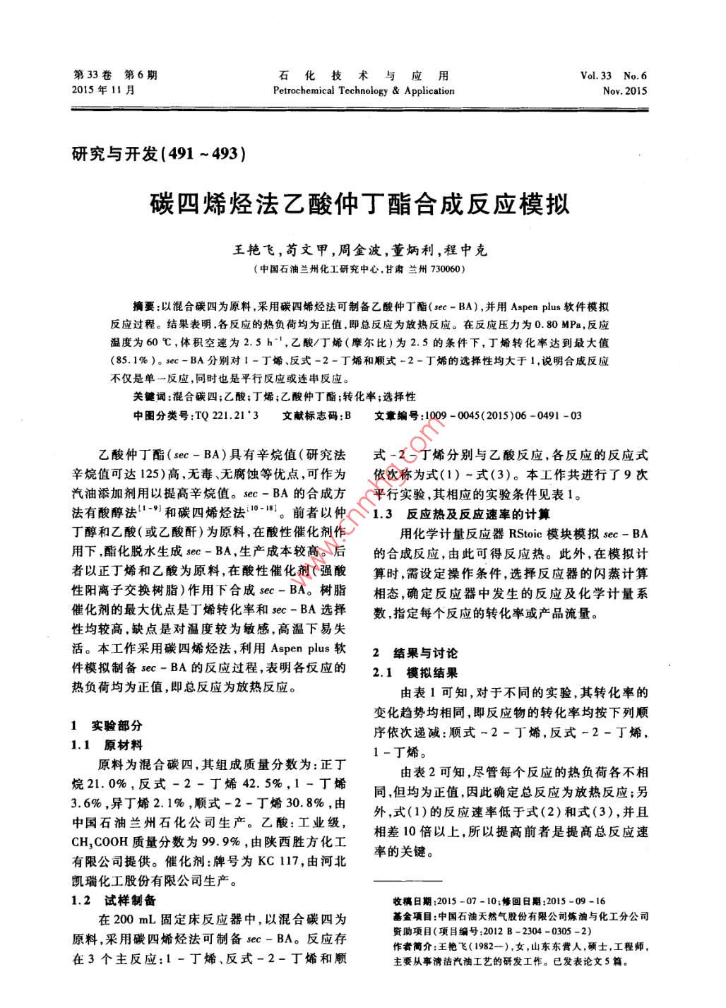 第33卷第6期石化技術(shù)與應(yīng)Vol.33 No.62015年11月Petrochemical Technology & ApplicationNov. 2015研究與開發(fā)(491 ~493 )碳四烯烴法乙酸仲丁酯合成反應(yīng)模擬王艷飛,茍文甲,周金波,董炳利,程中克(中國石油蘭州化工研究中心,甘肅蘭州730060)摘要:以混合碳四為原料,采用碳四烯烴法可制備乙酸仲丁酯(sec - BA),并用Aspen plus軟件模擬反應(yīng)過程。結(jié)果表明,各反應(yīng)的熱負荷均為正值.即總反應(yīng)為放熱反應(yīng)。在反應(yīng)壓力為0.80 MPa,反應(yīng)溫度為60 C,體積空速為2.5 h-' ,乙酸/丁烯(摩爾比)為2.5的條件下,丁烯轉(zhuǎn)化率達到最大值(85.1%)。sec-BA分別對1-丁烯、反式-2-丁烯和順式-2-丁烯的選擇性均大于1,說明合成反應(yīng)不僅是單一反應(yīng),同時也是平行反應(yīng)或連串反應(yīng)。關(guān)鍵詞:混合碳四;乙酸;丁烯;乙酸仲丁酯;轉(zhuǎn)化率;選擇性中團分類號:TQ 221.21'3文獻標志碼:B文章編號 :1009 - 0045(2015)06 -0491 -03乙酸仲丁酯(sec-BA)具有辛烷值(研究法式-2-丁烯分別與乙酸反應(yīng),各反應(yīng)的反應(yīng)式辛烷值可達125)高,無毒、無腐蝕等優(yōu)點,可作為依次稱為式(1) ~式(3)。本工作共進行了9次汽油添加劑用以提高辛烷值。sec- BA的合成方平行實驗,其相應(yīng)的實驗條件見表1。法有酸醇法"-9)和碳四烯烴法10-18。前者以仲1.3反應(yīng)熱及反應(yīng)速率的計算丁醇和乙酸(或乙酸酐)為原料,在酸性催化劑作用化學計量反應(yīng)器RStoic 模塊模擬sec - BA用下,酯化脫水生成sec- BA,生產(chǎn)成本較高。后的合成反應(yīng),由此可得反應(yīng)熱。此外,在模擬計者以正丁烯和乙酸為原料,在酸性催化劑(強酸算時,需設(shè)定操作條件,選擇反應(yīng)器的閃蒸計算性陽離子交換樹脂)作用下合成sec-BA。樹脂相態(tài),確定反應(yīng)器中發(fā)生的反應(yīng)及化學計量系催化劑的最大優(yōu)點是丁烯轉(zhuǎn)化率和sec- BA選擇數(shù),指定每個反應(yīng)的轉(zhuǎn)化率或產(chǎn)品流量。性均較高,缺點是對溫度較為敏感,高溫下易失活。本工作采用碳四烯烴法,利用Aspen plus 軟2結(jié)果與討論件模擬制備sec- BA的反應(yīng)過程,表明各反應(yīng)的2.1模擬結(jié)果 .熱負荷均為正值,即總反應(yīng)為放熱反應(yīng)。由表1可知,對于不同的實驗,其轉(zhuǎn)化率的變化趨勢均相同,即反應(yīng)物的轉(zhuǎn)化率均按下列順1實驗部分序依次遞減:順式-2-丁烯,反式-2-丁烯,1.1 原材料1-丁烯。原料為混合碳四,其組成質(zhì)量分數(shù)為:正丁由表2可知,盡管每個反應(yīng)的熱負荷各不相烷21. 0%,反式-2-丁烯42. 5%,1-丁烯同,但均為正值,因此確定總反應(yīng)為放熱反應(yīng);另3.6%,異丁烯2.1% ,順式-2-丁烯30.8%,由外,式(1)的反應(yīng)速率低于式(2)和式(3),并且中國石油蘭州石化公司生產(chǎn)。乙酸:工業(yè)級,相差10倍以上,所以提高前者是提高總反應(yīng)速CH,COOH質(zhì)量分數(shù)為99.9%,由陜西勝方化工率的關(guān)鍵。有限公司提供。催化劑:牌號為KC 117,由河北凱瑞化工股份有限公司生產(chǎn)。1.2 試樣制備收稿日期:2015 -07 -10:修回日期:2015-09-16在200mL固定床反應(yīng)器中,以混合碳四為基金項目:中國石油天然氣股份有限公司煉油與化工分公司原料,采用碳四烯烴法可制備sec- BA。反應(yīng)存資助項目(項目編號:2012 B-2304 -0305 -2)作者簡介:王艷飛(1982-),女,山東東營人,碩士,工程師, .在3個主反應(yīng):1 -丁烯、反式-2-丁烯和順主要從事清潔汽油工藝的研發(fā)工作。已發(fā)表論文5篇。●492●石化技術(shù)與應(yīng)用第33卷表1實驗條件及反應(yīng)結(jié)果實驗1實驗2實驗3實驗4實驗5實驗6實驗7實驗8實驗9碳四原料體積空速/h-2.51.61.82.02.22.42.62.83.0反應(yīng)壓力/MPa0.790.760.750.780.650.850.81反應(yīng)溫度/心60°606(656:乙酸/丁烯(摩爾比).12..0。2..9,1.9進料速率/(g.h-)混合碳四30019224026428812336360乙酸519.1316.4373.7395.5478.5498.3488.4609.1563.6轉(zhuǎn)化率/%1-丁烯68.70 .71.3577.3473.2771.9670.5271.0571.8564:49反式-2-丁烯80.7277.8286. 9486.0484.1380.8377.17順式-2-丁烯87. 68.83.8490.7091.0189.7789.7086.3088.90B4.21表2模擬結(jié)果100p反應(yīng)速率/(kmol .h)熱負荷/90序號式(1)式(2)式(3) (k.h-1)實驗1 0.00013223 0.001 834290.001 4439472.50022工8(實驗2 00008790 0.001 13177 0.000 8883621.447 65實驗3 0.000107 180.001 42246 0.001 07545 32. 508 527實驗4 0.00011282 0.001 56415 0.001 19902 32.545 39實驗50.00012189 0.001 67497 0.001 30096 47.640 6560.5.0 2.5 3.0實驗6 0.00013031 0.001 83531 0.00 4181284.663 76實驗7 0.00014223 0.001 910270.001 47807 63.539 11圈2丁烯轉(zhuǎn)化率與體積空速的關(guān)系實驗80.00015489 0.00211727 0.001 63972 84.387 49實驗9 0.000 148960.002 10435 0.001 6641679.308 162.3 sec-BA對丁烯的選擇性2.2 反應(yīng)速率與體積空速的關(guān)系選擇組分(P)對參考組分(A)的選擇性由圖1可知,在乙酸/丁烯(簡稱酸烯比,摩(Sp,)為爾比,下同)為2.5,反應(yīng)壓力為0. 80 MPa,反應(yīng)[1]..溫度為60 C的條件下,隨著體積空速增加,反Sp.=[1式-2-丁烯和順式-2-丁烯的反應(yīng)速率提高,二者增長趨勢相似且前者高于后者。這表明提式中:&P為P物質(zhì)量的變量;0A為A物質(zhì)量的高體積空速有利于提高丁烯合成sec-BA的反應(yīng)變量;下標Real為反應(yīng)的實際狀況;下標Ideal為速率,但同時也提高了整個體系的負荷。反應(yīng)的理想狀況。2.5p一般情況下,Sp,為0~1。若P由A以外的反式-2-T烯其他組分生成,則Sp.A大于1。本工