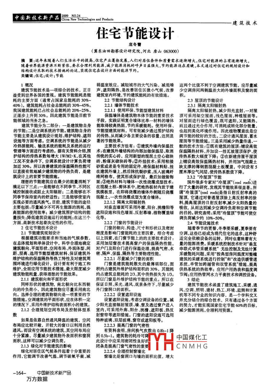 中國新技木新產(chǎn)品3mM02mmhh建筑技術住宅節(jié)能設計底冬曹(冀東油田勘察設計研究院,河北唐山063000)摘要:近年來隨著人們生活水平的提高,住宅產(chǎn)業(yè)蓬勃發(fā)晨,人們對居住條件和質(zhì)量需求逐漸增大,住宅對能源的占有逐漸增大隨著世界能源資源不斷緊張,要求合理利用能源,減少能源消耗的呼聲日益強大,節(jié)約能源迫在眉睫,本文通過對住宅的規(guī)劃設計和結(jié)構(gòu)設計采取的技術措施的論述,實現(xiàn)住宅在設計方面的能源節(jié)約。關鍵詞:住宅;設計;節(jié)能1概況弱溫室效應,減輕城市的大氣污染,減低噪這兩個比值不利于空調(diào)建筑節(jié)能,應盡量減建筑節(jié)能技術是一項綜合的技術,正日聲,遮陽隔熱,是改善居住區(qū)微小氣候,改善少空調(diào)房間兩側(cè)溫差大的外墻面積及窗的面受到世界各國的重視。建筑節(jié)能能耗是能建筑室內(nèi)環(huán)境,節(jié)約建筑能耗的有效措施的主要方面(通常占國家總能耗的30%22節(jié)能結(jié)構(gòu)設計23屋頂?shù)墓?jié)能設計%)。建筑能耗占社會總能耗的30%-45%。22.1墻體節(jié)能技術231隔離太陽輻射熱我國建筑能耗已占社會總能耗的20%-25%22.1.1使用環(huán)保、節(jié)能型建筑材料隔離太陽輻射熱,減少陽光直射,一對屋正逐步上升到30%。因此建筑節(jié)能是目前節(jié)保溫墻體是建筑物本體節(jié)能的重要技術頂可采用架空屋面淺色屋面種植屋面等能領域的當務之急手段,實踐證明復合墻體比單一材料的墻體對屋面進行綠色覆蓋,既可遮陽,又能隔熱建筑節(jié)能分為二部分:一是建筑物自身能取得較高熱阻,節(jié)約采暖能耗。使用環(huán)保、而且通過光合作用,可消耗或轉(zhuǎn)化部分能量的節(jié)能;二是空調(diào)系統(tǒng)的節(jié)能。建筑物自身的節(jié)能型建筑材料,可有效減少通過圍護結(jié)構(gòu)也起到美化環(huán)境作用。因此植物覆蓋法是空節(jié)能主要是從建筑設計規(guī)劃維護結(jié)構(gòu)遮陽的傳熱,從而減少各主要設備的容量達到顯調(diào)節(jié)能的較好的方法。二設計通風屋面、蓄水設施等方面考慮。空調(diào)系統(tǒng)的節(jié)能是從減少著的節(jié)能效果屋面等節(jié)能措施。三是采用減少熱量傳遞冷熱源能耗、輸送系統(tǒng)的能耗及系統(tǒng)的運行主要技術方法有:①建筑外墻內(nèi)保溫技般的技術方法:①既有建筑的屋頂:鋪設高效管理等方面進行考慮的。據(jù)有關資料介紹圍術:在建筑外墻結(jié)構(gòu)的內(nèi)部加做保溫層取消保溫隔熱材料,并加設一掛瓦坡屋頂保護,使護結(jié)構(gòu)的傳熱系數(shù)每增大1wM2K,在其他傳統(tǒng)的實心磚,應用新型的混泥土空心砌塊傳熱系數(shù)大幅度下降;②在新建房屋平屋頂工況不變條件下,空調(diào)系統(tǒng)設計計算負荷增磚、粉煤灰砌塊磚等;②外掛技術:采用粘接上鋪設高效保溫隔熱材料,并用加氣混凝土加近30%。所以改善建筑的保溫隔熱性能可砂漿或者是專用的固定件將保溫材料點、掛塊支撐的薄鋼筋混凝土板覆蓋,中間設有5直接有效地減少建筑物的冷熱負荷,是建在建筑外墻上,然后抹抗裂砂漿壓人玻璃纖厘米厚空氣間層使傳熱系數(shù)值下降。筑設計上的首要節(jié)能措施維網(wǎng)格布,使其形成保護層,最后加做裝飾232“冷屋頂”節(jié)能理想的節(jié)能建筑應在最少的能量消耗下面;③絕熱材料與墻體一次性澆灌成型技術:國外很多專家對“冷屋頂( cool roofs)進滿足以下三點:一是能夠在不同季節(jié)、不同區(qū)在混凝土框-剪體系中把絕熱板材內(nèi)放于建行了大量的研究發(fā)現(xiàn)其節(jié)能效果很顯著。所域控制接收或阻止太陽輻射;二是能夠在不筑模板里,在即將澆灌的墻體外側(cè)隨后澆灌謂“冷屋頂"( cool roofs)是指日射反射率高的同季節(jié)保持室內(nèi)的舒適性;三是能夠使室內(nèi)混凝土,一次性澆灌成型為復合墻體。屋頂,它通過對普通屋頂涂上高反射率的涂實現(xiàn)必要的通風換氣。目前,建筑節(jié)能的途徑221,2隔離太陽輻射熱料提高屋頂?shù)娜丈浞瓷渎蕼p少太陽熱量的主要包括:盡量減少不可再生能源的消耗,提對垂直墻面可采用外廓陽臺挑檐陽等吸收,從而達到減少空調(diào)冷負荷和空調(diào)節(jié)能高能源的使用效率;減少建筑圍護結(jié)構(gòu)的能遮陽設施和淺色墻面、反射幕墻、植物覆蓋綠的目的。研究表明:采用冷屋頂”節(jié)能可使空量損失;降低建筑設施運行的能耗;在這三個化等。調(diào)負荷減少約10%-50%方面高新技術起著決定性的作用。222門窗的節(jié)能設計24節(jié)能設施技術2住宅節(jié)能技術設計門窗的朝向、構(gòu)造、尺寸和形狀以及密封隨著季節(jié)的更替冬季要采暖,夏季要有21節(jié)能建筑規(guī)劃設計程度是影響門窗能耗的主要因素,綜合考慮空調(diào)這些已經(jīng)成為現(xiàn)代住宅的追求這種舒根據(jù)建筑功能要求和當?shù)氐臍夂騾?shù),以上因素,在門窗節(jié)能上的的主要技術設計:適完全依賴設備的運轉(zhuǎn),同時也意味著有大在總體規(guī)劃和單體設計中,科學合理地確定采用加層窗技術提高窗戶的保溫隔熱性能,量的能源消費。采暖系統(tǒng)控制技術針對“垂直建筑朝向、平面形狀、空間布局、外觀體型、間對戶門及陽臺門進行保溫處理,提高氣密、水串聯(lián)式單