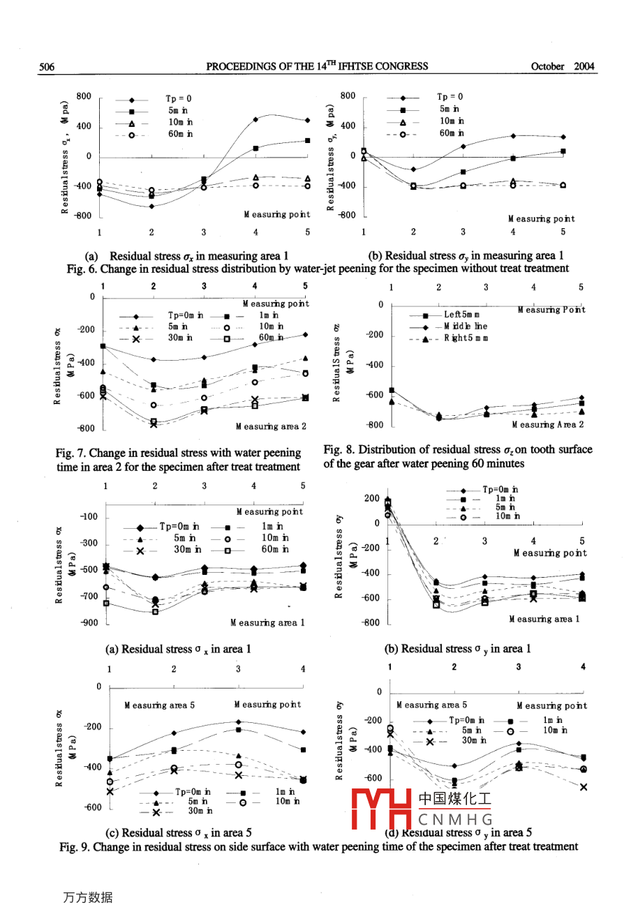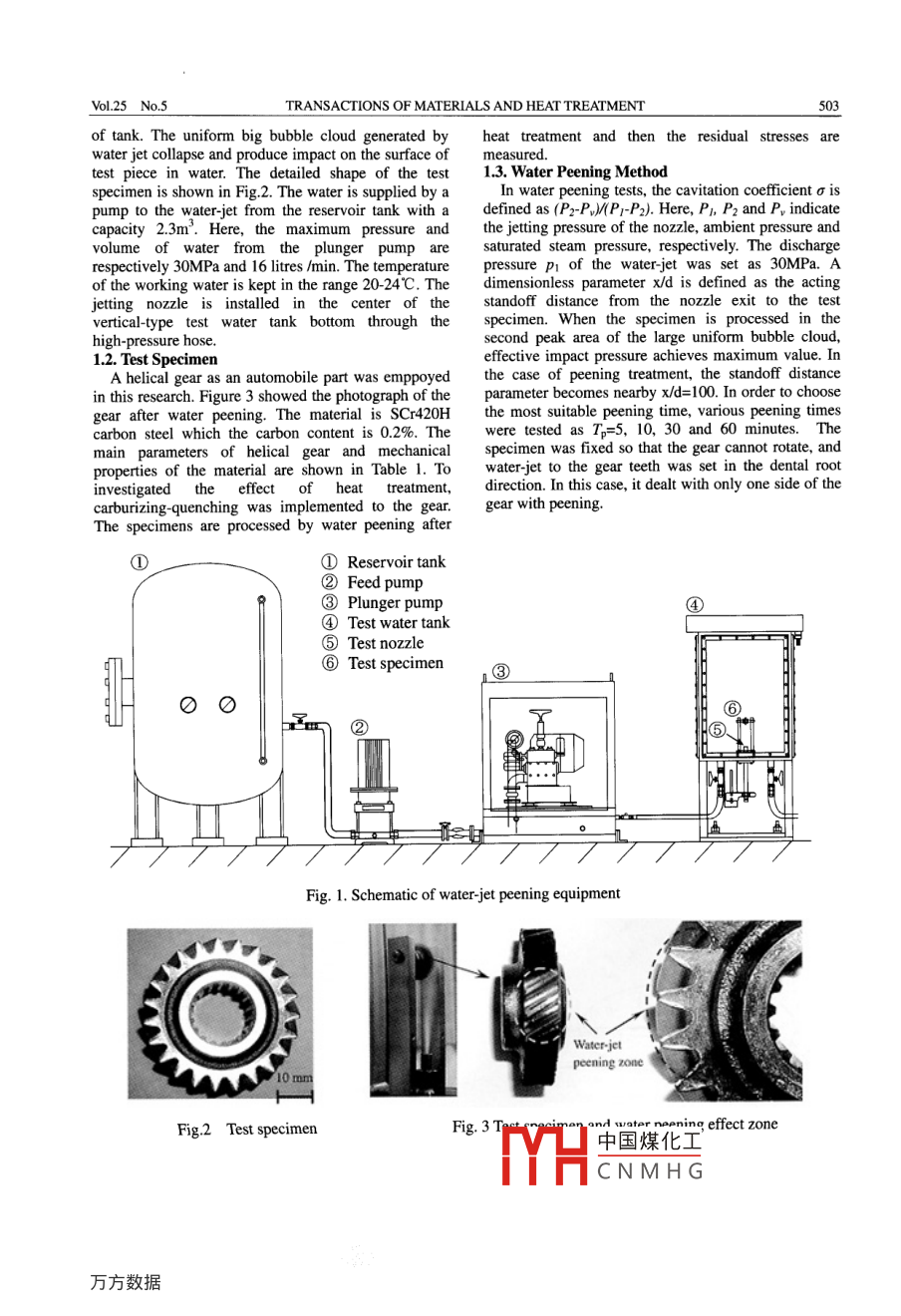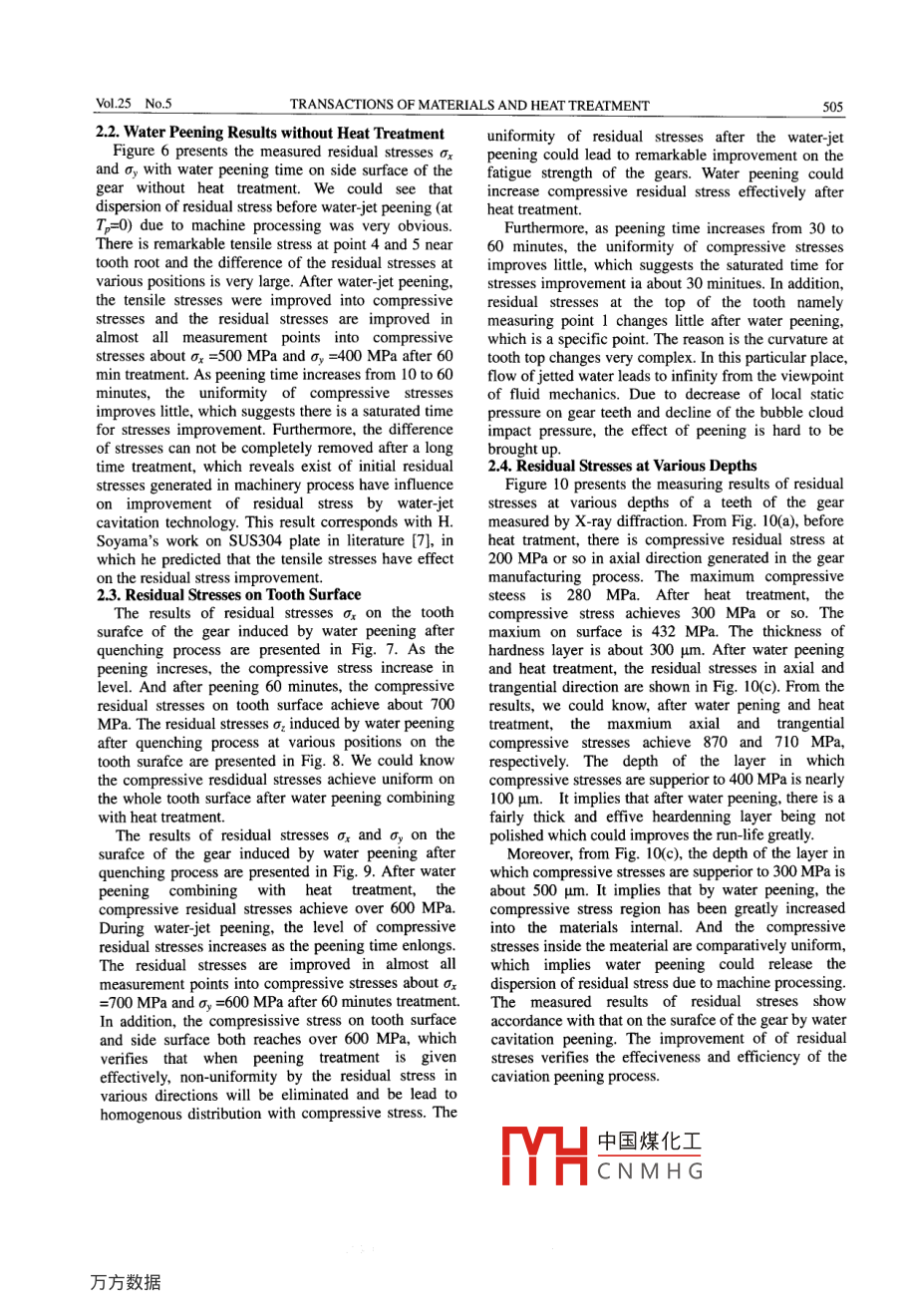 TRANSACTIONS OF MATERIALS AND HEAT TREATMENTVol.25 No.5PROCEEDINGS OF THE 14TH IFHTSE CONGRESSOctober 2004Residual Stress Improved by Water Jet Peening for A Quenched GearDong- Ying Ju', H. Tsuda, Vincent Jji', T. Uchiyama, R. Oba41. Department of Material Science and Engineering, Saitama Institute of Technology, Fusaiji 1690, Okabe,369-0293, Saitama, Japan2. Experiment and Analysis Dept, SUZUKI MOTOR Co, Hamamatsu -nishi, 1432-8611, Japan3. LM3, ENSAM University, 151, Boulevard de l'Hopital 75013, Paris, France4. High-Tech Research Center; Saiama Institute of Technology, JapanAbstract: In this paper, a running cost is cheap from the thing used for harmless peening treatment to the environment,health which an influence is rare in toward processing material like heat being only water fundamentally, and economical,and the characteristics is hard to get are given. There is some research about the residual stress improvement by water-jetpeening during the high-speed water. In this study, a big bubble cloud ceremony water-jet peening which dissolves theproblem of the form of the aplicable thing by exposing the whole of the applicable thing in the big bubble cloud as the wayof dealing with peening eficiently in a short time is proposed by this research. Moreover, the uniform compression residualstress is added around the surface of the processing side, and connected with the remarkable improvement of the faiguestrength of the part. Futermore, and safety processing is very pssible, and it thinks about the thing which has possiblehigh practical use, and wriers to get rid of the problems of the way of processing it with peening until now. Waterjetpeening was given by this research during high-speed water with big bubble cloud-type water toward tooth gearmanufactured by SCr420H3V2 to open the efet of water-jet peening during the high-speed water. A change was measuredat the time as the sutra of the residual stress on the surface of the test sttlement by the X-ray method, and the validity ofthis law was verified.Key words: Water Jet Peening, Residual Sress, Surface Improving, Quenched GearTHE normal cavitation often causes local height shockstrengthening mechanism in materials induced by waterpressure which reaches the level of GPa, so that thepeening process. Compressive residual stress inducedcavitation behavior might introduce damage on thby water peening has been used in evaluation for thesurface of machinery parts after long use duration [1-3].surface strengthening effect as a quantitativeOn the other hand, cavitation technology could beTherefore, not only on the surface but also at variousapplied in modifying the strength of materials surfacedepths of inside the material, the residual stress inducedas an attractive new peening technology. By inducingby water peening should be investigated. As a step tocavitation of ultrahigh speed water due to water-jet, thesolve these problems and furthermore to develop thenumerous impacts induced by the cavitation bubbleswater peening technique into industrial application, theimpact can produce compressive residual stress onresidual stresses introduced by water peening and heatmaterial surface in the similar way as that by shottreatment are investigated in this study.peening [4, 5]. Hirano et al. used the technique toIn the present paper, the residual stresses in a helicalrealize an improvement in thefatigue strength of agear of SCR420H carbon steel used in automobiles waspre-cracked specimen [6]. It has been verified that theinvestigated by X-ray diffraction. The residual stressescompressive residual stress can increase the fatigueon the surface and at various depths under the surfacelife of materials. Soyama et al. studied the optimumof the tooth of the gear were measured. Effect ofcavitation jet conditions during peening process ofpeening condition such as the peening time and heatSUS304 and SUP7 steel plates [7, 8]. The authorstreatment were investigated. Results of residual stressstudied a Carbon steel gear after water peening aninduced by water peening without and combining withclarified high level comprehensive stresses generatedheat treatment were compared. From the measuredon the surface of the gear [9-10]. However, there areresidual stresses, optimum condition of peening timestill some problems remain open in spite of theseand effctiveness of surface strengtheningreeffective results in above investigations. One point isdiscussed.that most of engineering parts are treated by thermalchemical process. Will the water peening technique be1. Experimentaleffective when the part has been processed by a heat1.1. Water Peening Equipmenttreatment? Will it be weaken for the water peeningThe schematic of the water jet equipment which caneffect after a heat treatment process? Is there anyjet ultahigh speed water bubble cloud with cavitationvariation of the optimum condition in the water peeningprocess for a heat treated part? Another problem is the中國煤化工igh pressur waterisa jet nozzle to the topMHCNMHGVol.25_ No.5TRANSACTIONS OF MATERIALS AND HEAT TREATMENT503of tank. The uniform big bubble cloud generated byheat treatment and then the residual stresses arewater jet collapse and produce impact on the surface ofmeasured.est piece in water. The detailed shape of the test1.3. Water Peening Methodspecimen is shown in Fig.2. The water is supplied by aIn water peening tests, the cavitation coefficient σ ispump to the water-jet from the reservoir tank with adefined as (Pz-P,)M(P1-P2). Here, P, P2 and Pv indicatecapacity 2.3m'. Here, the maximum pressure anthe jtting pressure of the nozzle, ambient pressure andvolume of water from the plunger pump aresaturated steam pressure, respectively. The dischargerespectively 30MPa and 16 litres /min. The temperaturepressure p1 of the water-jet was set as 30MPa. Aof the working water is kept in the range 20-24'C. Thedimensionless parameter x/d is defined as the actingjetting nozzle is installed in the center of thestand