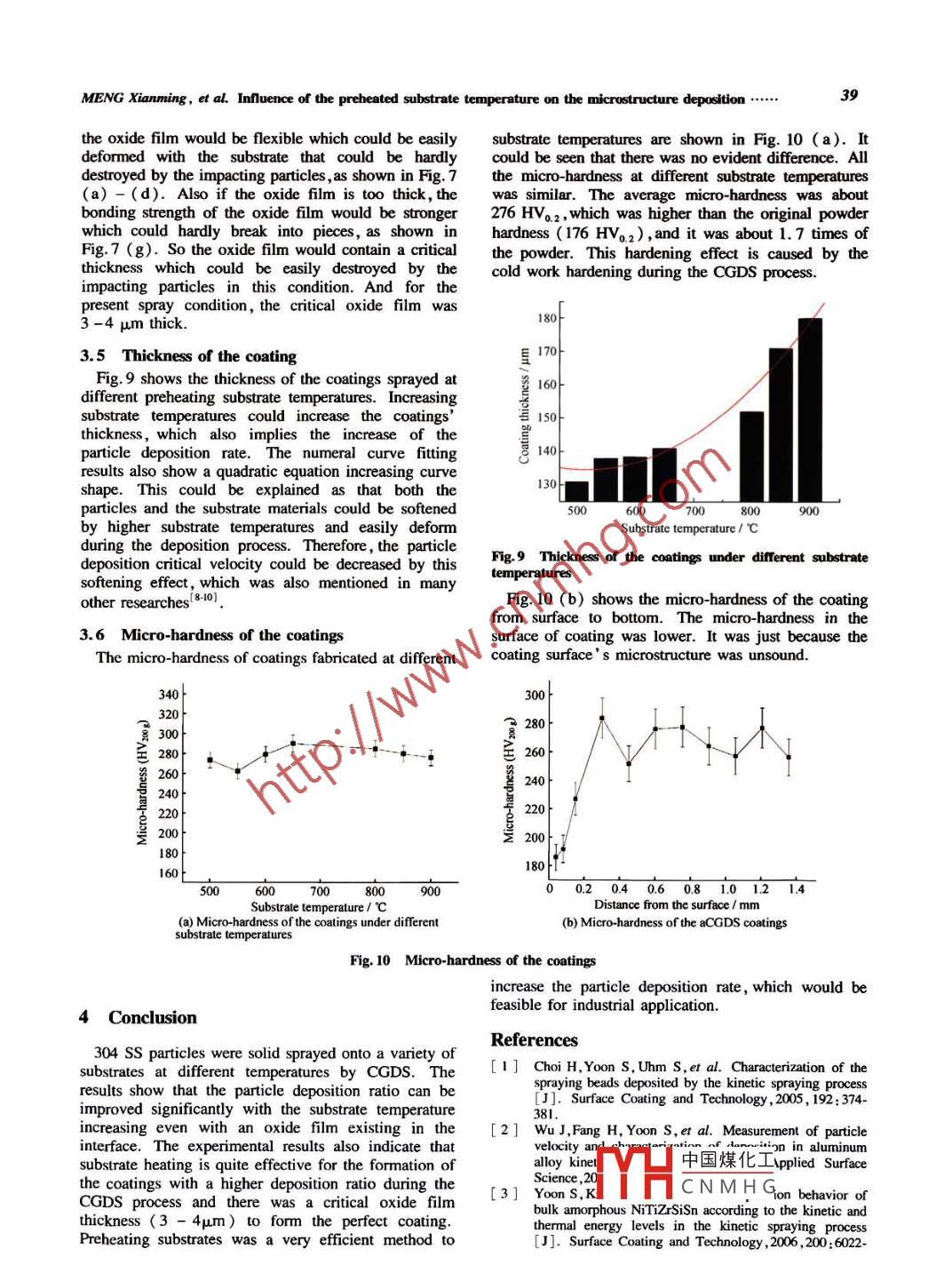 38Baosteel Technical Research, VoL.5, No. I, Mar. 2011was very low with many defects. This was resultedsubstrate preheating temperatures were 800 C andfrom the hard oxide flm, which could make it diffcult850C, noxide films occurred in the interfacefor the impacted particles to deposit and the cracksbetween the coating and the substrate. So this is a veryappeared in the edge of the oxide film. When theinteresting phenomenon to be further discussed.CoatingOxide filmSubstrateOxide flm20 pm20 pum20四(a) 500C(b)550"C(c) 600CInterface20 m20umI20 μm(d) 650"C(e) 800C(I) 850CC oating20m(g) 900CFig7 Interface morphology at different substrate temperaturesFig. 8 shows the particles deposition process when ansuddenly broken into pieces and fallen off theoxide film exists. In the first stage,the particles with asubstrate.I Finally , the particles successfully depositedhigh velocity vertically impacted onto the oxide filmon the cleaned and hot substrate and formed a densityand then some cracks occurred in the oxide film. Icoating. The experimental results showed that thethe secondary stage , the following particles continu-oxide film thickness was an important factor in theously impacted onto the oxide film,the oxide film was particle deposition process. If the oxide film is thin,.↑Rebound↑ Rebound↑ ReboundImpactCrack(aRebound Rebound中國煤化工_MYHCNMHGFig.8 Schematic of the particle deposition characteristics onto a substrate with an oxide film.40Baosteel Technical Research, Vol.5, No. 1, Mar. 20116029.[13] ZahiriSH, Fraser D, Gulizia s, et al. Efect of. [4]Borchers C, Gairtner F, Stoltenhoff T, et al. Micro-processing conditions on porosity formation in cold gastructural andmacroscproperties of cold sprayeddynamic spraying of copper 「J 1,Journal of Thermalcopper coatings [J]. Jourmal of Applied Physics , 2003,93( 12) :10064-10070.[14] Van Steenkiste T H,and Teets R E.[5] LiCJ,Li W Y and Wang Y Y. Formation of metaAluminum coatings via kinetie spray with relatively largestable phases in cold-sprayed soft metallic deposit [ J].powder particles [J]. Surface Coating and Technology ,Surface Coating and Technology ,2005 , 198 :469-473.2002,154 :237-252.[6 ] Dykhuizen R C ,Smith M F,Gilmore D L,er al. Impactof high velocity cold spray particles [ J]. Journal ofThermal Spray Technology , 1999 ,8(4) :559-564.[ 7 ] Borchers C, Girtner F, Stoltenhoff T, et al. Micro-structural bonding features of cold sprayed face centeredcubic metals [ J]. Journal of Applied Physics ,2004 , 96(8) :4288- 4292.[8] Schmidt T, Assadi H, Girtner F,et al. From particleacceleration to impact and bonding in cold spraying [ J] .Journal of Thermal Spray Technology ,2009,18 :794-808.Raletz F, Vardelle M and E'o G. Critical particleMENG XianmingZHANG JunbaoLIANG YongliCoating and Technology ,2006 ,201 :1942-1947.[10] Gilmore D L, Dykhuizen R C,Neiser R A,er al. Particlevelocity and deposition effciency in the cold sprayprocess [ J]. Journal of Thermal Spray Technology,1999 ,8(4) :576-582.[11] Assadi H, Girtner F, Stoltenhoff T, et al. Bondingmechanism in cold gas spraying [ J ]. Acta Materialia,2003 ,51(15) :43794394.[12] LeeJH, Shin S, Kim H J, et al. Effect of gastemperature on critical velocity and deposition charac-ZHAO Jie .teristics in kinetic spraying[ J]. Applied SurfaceScience ,2007 ,253:3512-3520.中國煤化工MHCNMH G.