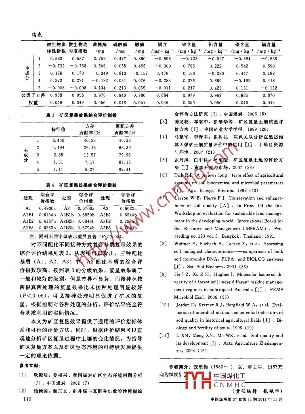 ★節(jié)能與環(huán)?!锩禾康V區(qū)復(fù)墾效果評(píng)價(jià)*錢奎梅王麗萍(中國礦業(yè)大學(xué),江蘇省徐州市,221116)摘要本文構(gòu)建以礦區(qū)復(fù)墾土壤肥力狀況、生態(tài)質(zhì)量以及環(huán)境質(zhì)量3個(gè)準(zhǔn)則層20項(xiàng)指標(biāo)為礦區(qū)復(fù)墾效果評(píng)價(jià)指標(biāo)體系,為避免因素賦權(quán)的主觀性,采用主成分分析法的方差貢獻(xiàn)率確定各評(píng)價(jià)指標(biāo)的權(quán)重,結(jié)合模糊綜合評(píng)判方法建立各評(píng)價(jià)指標(biāo)的隸屬度函數(shù),采用因子加權(quán)求和法計(jì)算礦區(qū)復(fù)墾效果的評(píng)價(jià)總分值。關(guān)鍵詞礦區(qū)復(fù)墾土壤 復(fù)墾效果評(píng)價(jià)指標(biāo)體系 評(píng)價(jià)方法中圖分類號(hào)TD997. 1文獻(xiàn)標(biāo)識(shí)碼BPreliminary study of reclamation effect evaluation of reclaimed mine soilQian Kuimei, Wang Liping(China University of Mining and Technology, Xuzhou, 221116,China)Abstract A reclamation effect evaluation index system was built, which contains 3 levels 20indicators, mine substrate fertility, ecological quality and environmental quality. Principal com-ponent analysis was used to determine the weight of each index in order to avoid the subjectivityof empowerment factors in the existing evaluation methods. The membership function of the e-valuation index was established by fuzzy comprehensive evaluation method and the total score ofmining substrate reclamation effect evaluation was calculated using factor-weighted sum.Key words reclaimed mine soil, reclamation effect, evaluation index system, evaluationmethods煤炭作為一次性能源,占我國能源構(gòu)成比例的壤在生態(tài)系統(tǒng)的范圍內(nèi),維持生物的生產(chǎn)能力、保74%左右。煤炭開采、洗選、利用過程中產(chǎn)生大量護(hù)環(huán)境質(zhì)量及促進(jìn)動(dòng)植物健康的能力。煤矸石和粉煤灰等工業(yè)固體廢物。以煤矸石為主的本文在綜合分析礦區(qū)復(fù)墾效果的基礎(chǔ)上,提出礦區(qū)復(fù)墾土壤很難通過正常生態(tài)延續(xù)來恢復(fù)其生態(tài)礦區(qū)復(fù)墾的評(píng)價(jià)指標(biāo)體系,并對(duì)初步選擇的指標(biāo)進(jìn)功能,需要人為創(chuàng)造有助于植被生長(zhǎng)的環(huán)境以強(qiáng)化行主成分分析,根據(jù)主成分分析結(jié)果確定各個(gè)指標(biāo)其生態(tài)恢復(fù)過程。礦區(qū)復(fù)墾的目標(biāo)是生態(tài)環(huán)境改的權(quán)重,再結(jié)合模糊綜合評(píng)判方法建立各評(píng)價(jià)指標(biāo)善,生物的生物量和多樣性提高。而目前關(guān)于礦區(qū)的隸屬度函數(shù),采用因子加權(quán)求和法計(jì)算礦區(qū)復(fù)墾復(fù)墾效果多集中在礦區(qū)復(fù)墾土壤的理化性質(zhì)方面,效果的評(píng)價(jià)總分值,進(jìn)行礦區(qū)復(fù)墾效果評(píng)價(jià)。不能綜合地反映出礦區(qū)總體復(fù)墾效果。作為一個(gè)復(fù)1評(píng)價(jià)指標(biāo)體系確定原則雜的功能實(shí)體,煤炭礦區(qū)復(fù)墾效果不能夠直接測(cè)定,但可以通過土壤質(zhì)量相關(guān)指標(biāo)來推測(cè)。煤炭礦1.1 相關(guān)性原則區(qū)復(fù)墾效果包括礦區(qū)復(fù)墾土壤肥力質(zhì)量、土壤生態(tài)評(píng)價(jià)指標(biāo)必須與土壤功能相聯(lián)系,能夠清晰地環(huán)境質(zhì)量及土壤健康質(zhì)量3方面的綜合量度,即土表征土中國煤化工量及其時(shí)間變化的可量化MHCNMHG能的直接或間接指*基金項(xiàng)目:江蘇省省級(jí)環(huán)保科技項(xiàng)目(2007024)標(biāo),例如,一個(gè)水域的水文特征是土壤阻截和儲(chǔ)存109 .降雨的間接指標(biāo),而降雨之后的土壤蓄水能力是一值、電導(dǎo)率、質(zhì)地、根系深度、容重、水分傳導(dǎo)率個(gè)直接指標(biāo)。和有效持水量,用于監(jiān)測(cè)由土壤和作物管理措施引1.2 靈敏性和可區(qū)別性起的土壤質(zhì)量的變化。另外,由于礦區(qū)復(fù)墾中利用土壤性質(zhì)在不同的土壤系統(tǒng)之間差異很大,很了煤矸石等礦區(qū)基質(zhì),故此處還需考慮礫石含量。多典型土壤參數(shù)平均值的標(biāo)準(zhǔn)差達(dá)到50%。在選土壤肥力狀況指標(biāo)見表1的P準(zhǔn)則層。定的指標(biāo)中,我們需要考慮樣品之間的細(xì)微變化,2.2土壤生 態(tài)環(huán)境質(zhì)量指標(biāo)例如,不同樣品之間某一參數(shù)的差異可能為5%,礦區(qū)復(fù)墾的重要目標(biāo)之一是礦區(qū)復(fù)墾土壤生態(tài)而其平均值95%的置信區(qū)間等于其平均值的50%,環(huán)境的改善,包括土壤中生長(zhǎng)的植物、土壤動(dòng)物、而該指標(biāo)的顯著性變化在很多年之后才能發(fā)現(xiàn)。土壤微生物等的改善,其中應(yīng)用最多的是土壤微生般來說,利用簡(jiǎn)單的統(tǒng)計(jì)方法可以很容易發(fā)現(xiàn)評(píng)價(jià)物指標(biāo)。多數(shù)研究認(rèn)為,土壤微生物(包括微生物指標(biāo)時(shí)間上的差異。不能采用在- -定時(shí)間內(nèi)觀察不生物量、土壤呼吸)是土壤質(zhì)量變化最敏感的指到顯著變化的指標(biāo)。標(biāo)。土壤動(dòng)物是土壤環(huán)境質(zhì)量和健康質(zhì)量的重要指1.3 實(shí)踐性示特征,特別是無脊椎動(dòng)物,如線蟲、蚯蚓等能夠評(píng)價(jià)指標(biāo)必須具有-定的實(shí)踐性,測(cè)定方法明敏感地反映土壤中有毒物質(zhì)