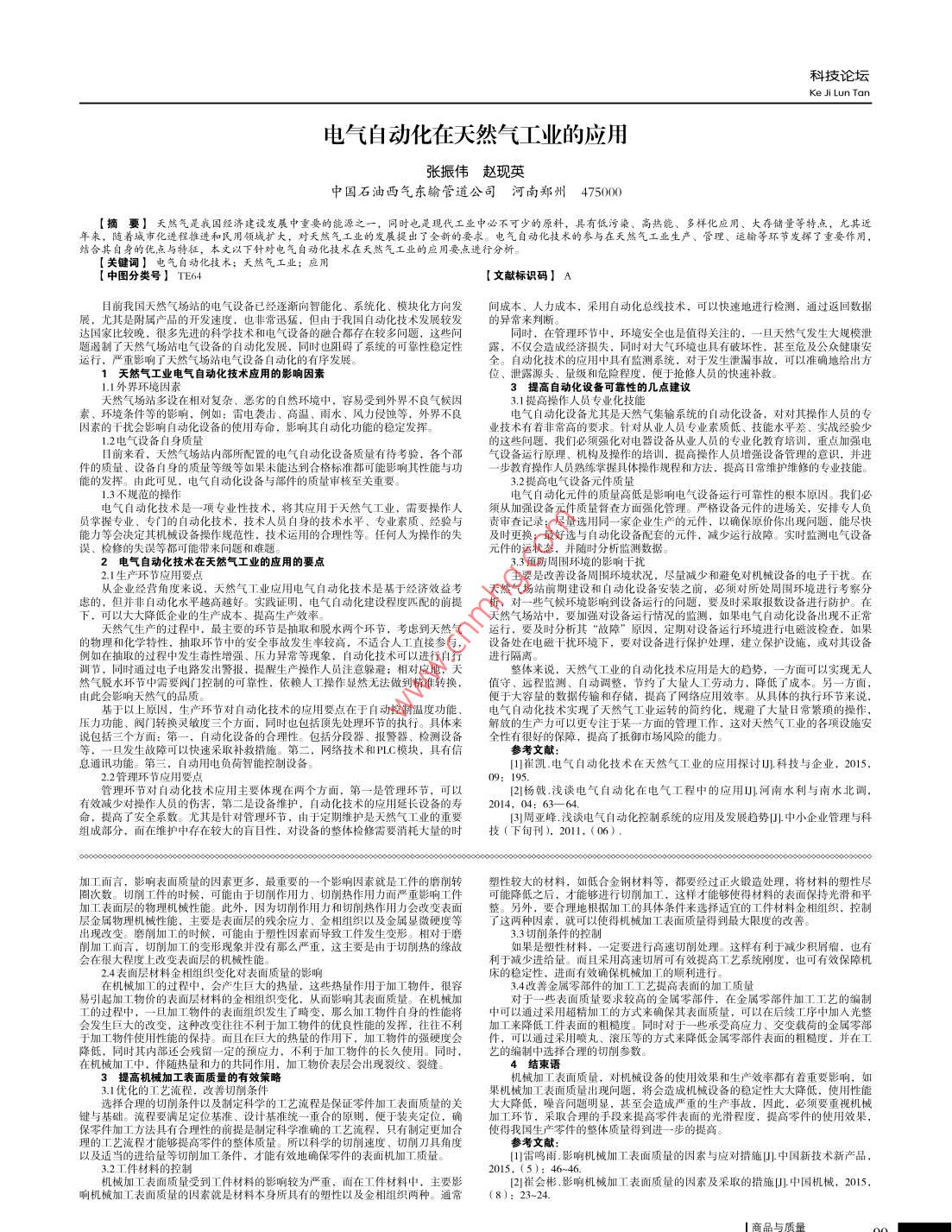 科技論壇Ke ji Lun tan電氣自動化在天然氣工業(yè)的應(yīng)用張振偉趙現(xiàn)英中國石油西氣東輸管道公司河南鄭州475000【摘要】天然氣是我國經(jīng)濟建設(shè)發(fā)展中重要的能源年來,隨著城市進和民用領(lǐng)域擴大,對天然氣工業(yè)的發(fā)展提出了全新的要求。電氣自動化技術(shù)的參與在天然氣工業(yè)生產(chǎn)、管理、運翰等環(huán)節(jié)發(fā)揮了重要作用結(jié)合其自身的優(yōu)本文以下針對電氣自動化技術(shù)在天然氣工業(yè)的應(yīng)用要點進行分析?!娟P(guān)鍵詞】比技術(shù);天然氣工業(yè);應(yīng)用【中圖分類號【文獻標(biāo)識碼】A展,尤其是附屬產(chǎn)品的開發(fā)速度也非常迅猛,但由于我國自動化類化方向發(fā)間成本、人力成本,采用自動化總線技術(shù),可以快速地進行檢測,通過返回數(shù)據(jù)達(dá)國家比較晚,很多先進的科學(xué)技術(shù)和電氣設(shè)備的融合都存在較多問題,這些問同時,在管理環(huán)節(jié)中,環(huán)境安全也是值得關(guān)注的,一旦天然氣發(fā)生大規(guī)模泄題遏制了天然氣場站電氣設(shè)備的自動化發(fā)展,同時也阻礙了系統(tǒng)的可靠性穩(wěn)定性露,不僅會造成經(jīng)濟損失,同時對大氣環(huán)境也具有破壞性,甚至危及公眾健康安運行,嚴(yán)重影響了天然氣場站電氣設(shè)備自動化的有序發(fā)展。全。自動化技術(shù)的應(yīng)用中具有監(jiān)測系統(tǒng),對于發(fā)生泄漏事故,可以準(zhǔn)確地給出方1天然氣工業(yè)電氣自動化技術(shù)應(yīng)用的影響因素位、泄露源頭、量級和危險程度,便于搶修人員的快速補救3提高自動化設(shè)備可靠性的幾點建議天然氣場站多設(shè)在相對復(fù)雜、惡劣的自然環(huán)境中,容易受到外界不良?xì)夂蛞?.1提高操作人員專業(yè)化技素、環(huán)境條件等的影響,例如:雷電襲擊、高溫、雨水、風(fēng)力侵蝕等,外界不良?xì)庾詣踊O(shè)備尤其是天然氣集輸系統(tǒng)的自動化設(shè)備,對對其操作人員的專因素的干擾會影響自動化設(shè)備的使用壽命,影響其自動化功能的穩(wěn)定發(fā)揮業(yè)技術(shù)有著非常高的要求。針對從業(yè)人員專業(yè)素質(zhì)低、技能水平差、實戰(zhàn)經(jīng)驗少12電氣設(shè)備自身質(zhì)量的這些問題,我們必須強化對電器設(shè)備從業(yè)人員的專業(yè)化教育培訓(xùn),重點加強電目前來看,天然氣場站內(nèi)部所配置的電氣自動化設(shè)備質(zhì)量有待考驗,各個部氣設(shè)備運行原理、機構(gòu)及操作的培訓(xùn),提高操作人員增強設(shè)備管理的意識,并進件的質(zhì)量、設(shè)備自身的質(zhì)量等級等如果未能達(dá)到合格標(biāo)準(zhǔn)都可能影響其性能與功一步教育操作人員熟練掌握具體操作規(guī)程和方法,提高日常維護維修的專業(yè)技能能的發(fā)揮。由此可見,電氣自動化設(shè)備與部件的質(zhì)量審核至關(guān)重要3.2提高電氣設(shè)備元件質(zhì)1.3不規(guī)范的操作電氣自動化元件的質(zhì)量高低是影響電氣設(shè)備運行可靠性的根本原因。我們必電包氣自動化技術(shù)是一項專業(yè)性技術(shù),將其應(yīng)用于天然氣工業(yè),需要操作人須從加強設(shè)備元件質(zhì)量督查方面強化管理。嚴(yán)格設(shè)備元件的進場關(guān),安排專人負(fù)能力等會決定其機械設(shè)備操作規(guī)范性,技術(shù)運用的合理性等。任何人為操作的失及時更換;最好選與自動化設(shè)備配套的元件,減少運行故障。實時監(jiān)測電氣設(shè)備誤、檢修的失誤等都可能帶來問題和難題元件的運狀態(tài),并隨時分析監(jiān)測數(shù)據(jù)。2電氣自動化技術(shù)在天然氣工業(yè)的應(yīng)用的要點3.3預(yù)防周圍環(huán)境的影響干擾主要是改善設(shè)備周圍環(huán)境狀況,盡量減少和避免對機械設(shè)備的電子干擾。在企業(yè)經(jīng)營角度來說,天然氣工業(yè)應(yīng)用電氣自動化技術(shù)是基于經(jīng)濟效益考天然氣場站前期建設(shè)和自動化設(shè)備安裝之前,必須對所處周圍環(huán)境進行考察分慮的,但并非自動化水平越高越好。實踐證明,電氣自動化建設(shè)程度匹配的前提析,對一些氣候環(huán)境影響到設(shè)備運行的問題,要及時采取報數(shù)設(shè)備進行防護。在下,可以大大降低企業(yè)的生產(chǎn)成本、提高生產(chǎn)效天然氣場站中,要加強對設(shè)備運行情況的監(jiān)測,如果電氣自動化設(shè)備出現(xiàn)不正常天然氣生產(chǎn)的過程中,最主要的環(huán)節(jié)是抽取和脫水兩個環(huán)節(jié),考慮到天然氣行,要及時分析其“故障”原因,定期對設(shè)備運行環(huán)境進行電磁波檢查,如果的物理和化學(xué)特性、抽取環(huán)節(jié)中的安全事故發(fā)生率較高,不適合人工直接參與,設(shè)備處在電磁干擾環(huán)境下,要對設(shè)備進行保護處理,建立保護設(shè)施,或?qū)ζ湓O(shè)備例如在抽取的過程中發(fā)生毒性增強、壓力異常等現(xiàn)象,自動化技術(shù)可以進行自行進行隔離然氣脫水環(huán)節(jié)中需要閥門控制的可靠性,依賴人工操作顯然無法做到精準(zhǔn)轉(zhuǎn)換,值守、遠(yuǎn)程監(jiān)測、自動調(diào)整,節(jié)約了大量人工勞動力,降低了成本。另一方面由此會影響天然氣的品質(zhì)基于以上原因,生產(chǎn