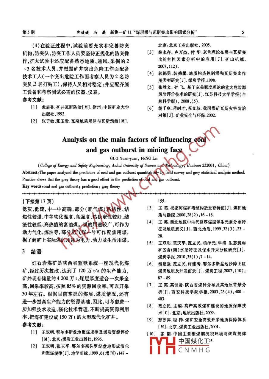 午劉小平張普選黃陵礦區(qū)紅石巖煤礦煤層煤質(zhì)特征010年黃陵礦區(qū)紅石巖煤礦煤層煤質(zhì)特征高午,劉小平,張普選(陜西省紅石巖煤礦陜西黃陵727307)摘要:根據(jù)地層與構(gòu)造情況,分析了黃陵礦區(qū)紅石巖井田含煤地層構(gòu)造特點(diǎn),以及可采煤層2號(hào)煤層的煤質(zhì)特征。關(guān)鍵詞:煤礦;煤層;煤質(zhì);特征中圖分類號(hào):P618.11文獻(xiàn)標(biāo)識(shí)碼文章編號(hào):1671-749X(2010)05-0016-02部厚,兩翼薄,背斜軸部最薄。上部以灰黑色泥巖,0前言粉砂巖為主,一般厚30m左右,井田南部含1號(hào)紅石巖煤礦位于鄂爾多斯盆地黃隴侏羅紀(jì)煤田煤(相當(dāng)于礦區(qū)的0號(hào)煤),厚0~0.5m。中部為灰黃陵礦區(qū)北部,行政區(qū)劃屬陜西省黃陵縣店頭鎮(zhèn),煤黑色粉砂巖灰白色細(xì)砂巖,含有植物化石,一般厚礦距黃陵縣城32km,有礦區(qū)公路相連,距210國道15m。向井田東北部相變?yōu)榛野咨辛I皫r,其上約38km,交通方便。礦井面積19935km2,批準(zhǔn)生含12號(hào)煤(相當(dāng)于礦區(qū)的1號(hào)煤)厚065-0.7m產(chǎn)規(guī)模60萬ta,開采2號(hào)煤層。礦井1968年10下部為灰黑色泥巖砂質(zhì)泥巖煤層,一般厚10m左月以小煤窯形式開始生產(chǎn),1983年改擴(kuò)建為60萬右。2號(hào)煤為本區(qū)主要可采煤層厚0.02~6.22m,Ua的中型礦井,1992年1月正式投產(chǎn),1997年達(dá)一般2.84m。底部砂質(zhì)泥巖含植物根化石或鮞狀產(chǎn)。2007年11月~2008年11月進(jìn)行了第二次120結(jié)核為煤層底板。與三迭系地層呈假整合接觸。萬ta技改,200年元月通過驗(yàn)收并投產(chǎn)。本文結(jié)侏羅系中統(tǒng)直羅組(J2z):厚50.5~79.96m合近年來勘查及開采的資料,對(duì)該礦煤層、煤質(zhì)特征般60-70m。上部以淺紫灰色粗砂巖為主,含肉紅進(jìn)行論述,為建設(shè)高產(chǎn)高效煤礦提供基礎(chǔ)資料。色長石,泥鈣質(zhì)膠結(jié)較堅(jiān)硬。下部淺灰白色粗砂巖1地層構(gòu)造及煤層概況含較多黑色礦物、黃鐵礦,鏡煤化樹干,局部含礫石相變?yōu)楹[粗砂巖。局部砂巖有石油顯示,與延安1地層與構(gòu)造組呈整合接觸關(guān)系。侏羅系中統(tǒng)安定組(J2a)為紫根據(jù)鉆孔揭露及出露地層本區(qū)地層由老至新紅色夾灰綠斑塊狀的細(xì)砂巖、粉砂巖、夾泥巖。細(xì)砂如下所示。巖可相變?yōu)橹幸淮至I皫r粉砂巖含少量的云母片、三選系上統(tǒng)永坪組(Ty):零星出露于白石村石英小顆粒,易風(fēng)化破碎。砂巖中含肉紅色長石泥高皇廟、厚子坪、車村一帶,為含煤地層的基底主要鈣質(zhì)膠結(jié)。厚2.312-81.45m,一般51m,與直羅巖性為黃綠灰綠色厚層狀中細(xì)粒長石砂巖和石英組呈整合接觸關(guān)系。白堊系下統(tǒng)洛河組(K1)出露長石砂巖。夾灰深灰色粉砂巖泥巖及煤線局部于井田西南部溝谷中以棕紅色中一細(xì)粒砂巖為主,砂巖含油。厚層狀,局部夾粉砂巖透鏡體。砂巖的顆粒成份以侏羅系中統(tǒng)延安組(Jy):厚度23.51-807石英為主泥質(zhì)膠結(jié)具大型斜交層理。與侏羅系呈Ⅱ,一般厚50~60m,東南部厚,西北部變薄向斜軸假整合接觸。r凵中國煤化工頁均有1-2m植收稿日期:2010-03-18被CNMHG有鈣質(zhì)結(jié)核。構(gòu)業(yè)學(xué)院煤田地質(zhì)與勒查專業(yè),學(xué)士學(xué)位,工程師,現(xiàn)任紅石若煤礦技造形又水口吧形以舊別造變動(dòng)控制表現(xiàn)術(shù)科科長,研究方向?yàn)榈V井地質(zhì)在煤層底板上主要為寬緩的波狀起伏。煤礦區(qū)內(nèi)主第5期高午劉小平張普選黃陵礦區(qū)紅石巖煤礦煤層煤質(zhì)特征要的兩個(gè)波狀起伏為南峪口波峰和羅家峪波谷,軸分特征向近北西向,地層傾角2°~3°,一般小于2°。另外,灰分(A):2號(hào)煤層原煤灰分6.46%在煤礦開采過程中見到為數(shù)不多的、小于5m的斷~30.05%,平均14.01%??蓪俚椭谢颐骸8∶夯覍?未見巖漿巖,構(gòu)造較簡單。分變化在3.50%~14.82%之間,平均為6.64%。1.2煤層揮發(fā)分(V):原煤揮發(fā)分31.00%~42.13%延安組地層為本區(qū)的含煤地層,共含煤3層,自平均33.87%,浮煤揮發(fā)分30.45%~36.41%,平均上而下分別為1ˉ號(hào)煤、1ˉ2號(hào)煤、2號(hào)煤。33.10%,屬中高揮發(fā)分煤。1號(hào)煤(相當(dāng)于礦區(qū)的0號(hào)煤):位于延安組煤中有害組分:2號(hào)煤層原煤全硫(Sd)變化在頂部,分布于井田南部秋林子向斜軸附近,見煤點(diǎn)0.27%~1.51%之間,平均為0.54%。以低硫煤為個(gè),煤層厚度0.3~0.5m,均不可采,煤層結(jié)構(gòu)簡主,特低一低中硫煤少量。各種硫中以有機(jī)硫?yàn)橹?單,至2號(hào)煤層間距為56~67m。硫化鐵硫次之,硫酸鹽硫少量。2號(hào)煤層原煤磷分12號(hào)煤(相當(dāng)于礦區(qū)的1號(hào)煤):位于延安組(P)變化在0.0293%-0.2289%之間,平均為中下部,分布于井田北部,地表出露于白石村至胡蘆0.1301%,可屬中一高磷煤。溝一帶,見煤點(diǎn)4個(gè),均不可采,煤層厚度為0652號(hào)煤層煤類有二種:肥氣煤一號(hào),y值一般為0.7m,煤層結(jié)構(gòu)簡單,至2號(hào)煤層間距為5~12m。9.2~11m/m,曲線形狀平滑下降,焦渣特征3~5。屬不可采煤層出焦率74%~79%,粘結(jié)性較好。弱粘煤二號(hào),y值2號(hào)煤層:位于延安組下部,是煤礦區(qū)內(nèi)唯一可0~11m/m,-般為71m/m,曲線形狀平滑下降一采煤層,分布于全煤礦區(qū),地表出露于白石村至西房平滑激降。焦渣特征2~4。出焦率73.5%~81%溝及車村一