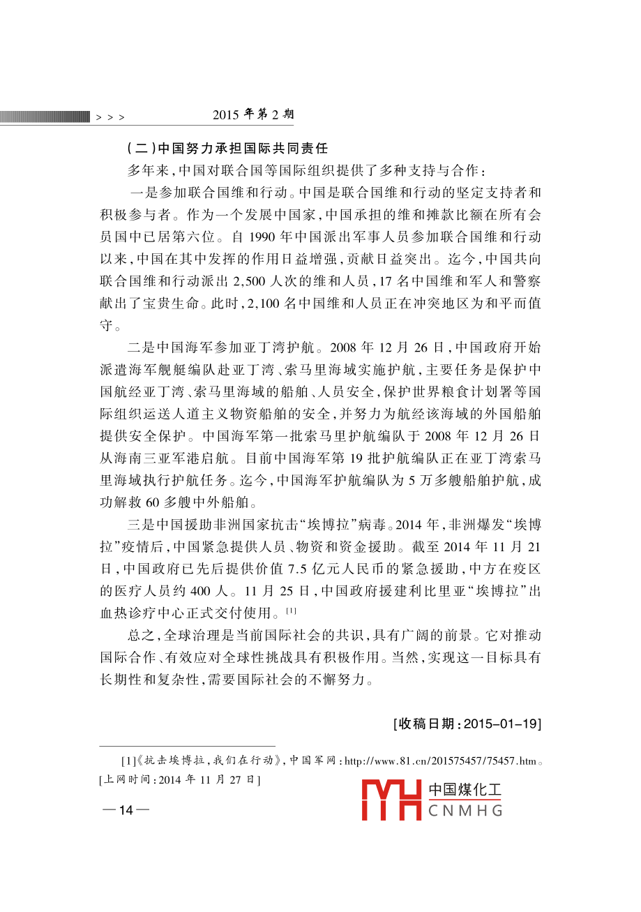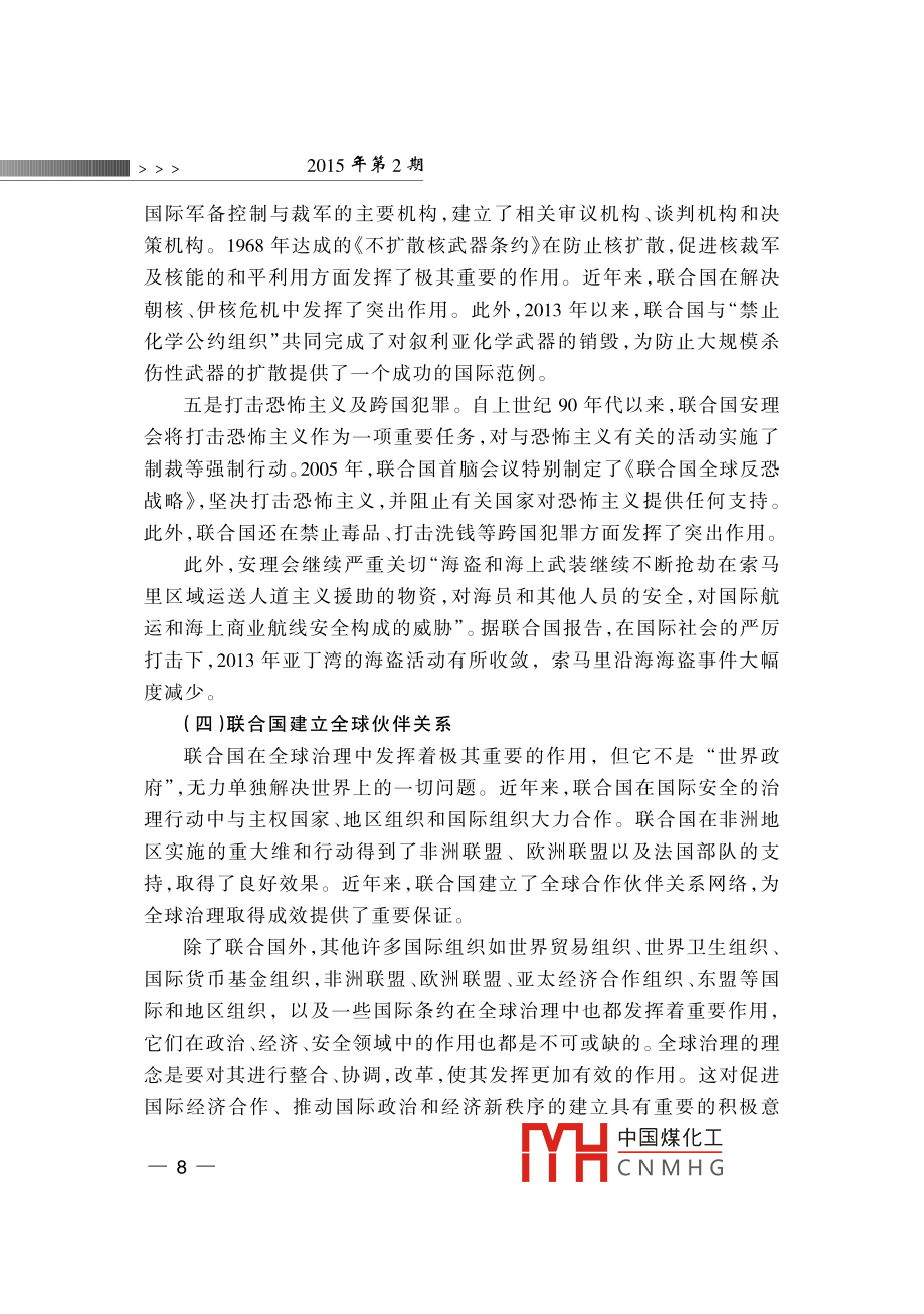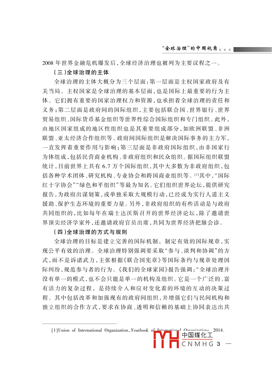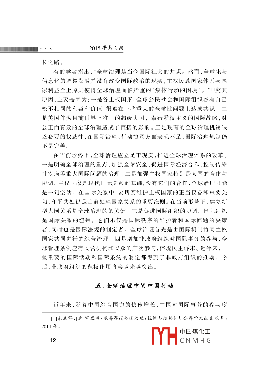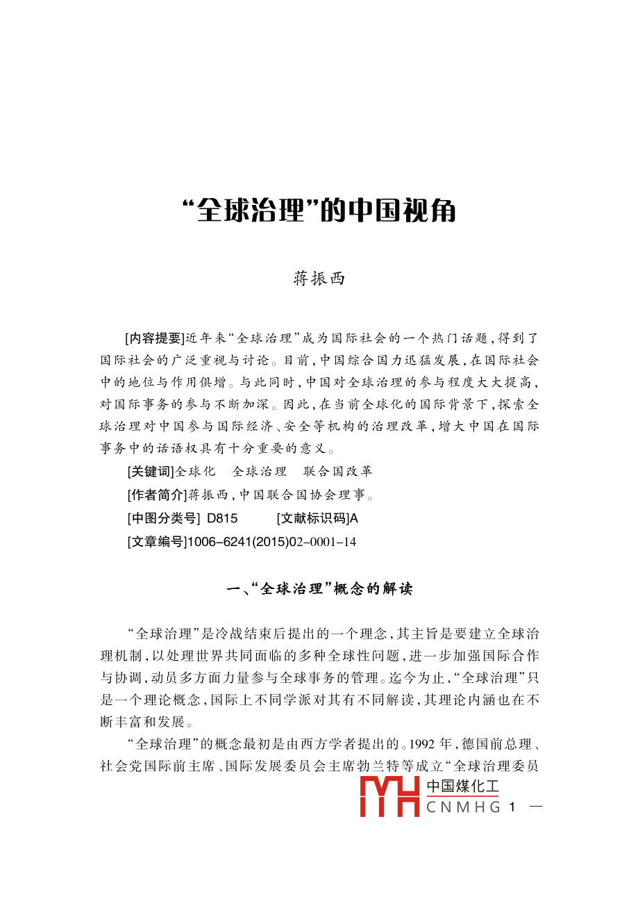 全球治理”的中國視角蔣振西[內(nèi)容提要]近年來“全球治理”成為國際社會的一個熱門話題,得到了國際社會的廣泛重視與討論。目前,中國綜合國力迅猛發(fā)展,在國際社會中的地位與作用俱增。與此同時,中國對全球治理的參與程度大大提高對國際事務(wù)的參與不斷加深。因此,在當前全球化的國際背景下,探索全球治理對中國參與國際經(jīng)濟、安全等機構(gòu)的治理改革,增大中國在國際事務(wù)中的話語權(quán)具有十分重要的意義。[關(guān)鍵詞]全球化全球治理聯(lián)合國改革作者簡介]蔣振西,中國聯(lián)合國協(xié)會理事。[中圖分類號]D815[文獻標識碼]A[文章編號]1006-6241(2015)02-0001-14“全球治理”概念的解讀¨全球治理”是冷戰(zhàn)結(jié)束后提出的一個理念,其主旨是要建立全球治理機制,以處理世界共同面臨的多種全球性問題,進一步加強國際合作與協(xié)調(diào),動員多方面力量參與全球事務(wù)的管理。迄今為止,“全球治理”只是一個理論概念,國際上不同學(xué)派對其有不同解讀,其理論內(nèi)涵也在不斷豐富和發(fā)展。¨全球治理”的概念最初是由西方學(xué)者提出的。1992年,德國前總理、社會黨國際前主席、國際發(fā)展委員會主席勃蘭特等成立“全球治理委員中國煤化工CNMHG 12015年第2期會”,專門研究這一問題。該委員會在1995年聯(lián)合國成立50周年時,發(fā)表了標題為《我們的全球家園》的專題報告,呼吁國際社會開展廣泛合作,共同應(yīng)對在全世界范圍出現(xiàn)的公共問題。迄今,該報告已經(jīng)發(fā)表20年了。20年來,國際形勢發(fā)生了巨大變化:2001年發(fā)生了針對美國的“9ll”恐怖主義襲擊;美國在阿富汗和伊拉克發(fā)動了兩場戰(zhàn)爭;2008年,世界性金融危機爆發(fā),國際經(jīng)濟陷亼低迷。在此背景下,¨全球治理”概念再次受到關(guān)注(一)“全球治理”的定義1995年發(fā)表的《我們的全球家園》報告中對“全球治理”作了以下闡述:“全球治理是個人與機構(gòu),公共部門與私營部門管理共同事務(wù)的多種方式的總合。它是使相互沖突或不同利益的各方得以調(diào)和并采取聯(lián)合行動的持續(xù)過程。這既包括通過擁有權(quán)力的官方正式機構(gòu)和機制強制執(zhí)行,也包括有關(guān)人員或機構(gòu)認為是符合他們利益的非正式安排?!边@是迄今對“全球治理”較為權(quán)威的解釋,其中強調(diào)了全球治理參與者的多元化和所處理問題的多樣性,拓展了現(xiàn)有國際治理機制的治理方式。(二)全球治理的范圍全球治理是一個廣泛的世界議程,包括眾多領(lǐng)域:一是全球安全,包括國家間或區(qū)域性的武裝沖突、一些國家爆發(fā)的內(nèi)戰(zhàn)和動亂、國際核武器的擴散、常規(guī)武器的貿(mào)易與非法流通等;二是國際經(jīng)濟發(fā)展,包括保護全球金融市場、處理債務(wù)危機等;三是生態(tài)環(huán)境的保護,包括資源的合理利用與開發(fā)、生物多樣性的保護、應(yīng)對氣候變化等;四是打擊國際恐怖活動,以及走私、毒品交易等跨國犯罪活動;五是保護基本人權(quán),提供人道主義救援、防止流行疾病的傳播等。《我們的全球家園》報告將全球治理的對象確定為世界共同面對的全球性問題,涵蓋政治、經(jīng)濟、安全、文化等多個領(lǐng)域。報告還著重強調(diào)了軍事變革、軍備競賽、軍火貿(mào)易、武裝沖突等多種安全威脅,并提到了經(jīng)濟發(fā)展不平衡造成南北國家差距擴大、發(fā)展中國家貧困等問題。此外,[1 ]the Commission on Global Governance, Our Global Neighborhood, Oxford University1995中國煤化工CNMHG全球治理”的中國視角<<<2008年世界金融危機爆發(fā)后,全球經(jīng)濟治理也被列為主要議程之(三)全球治理的主體全球治理的主體大概分為三個層面:第一層面是主權(quán)國家政府及有關(guān)當局。主權(quán)國家是全球治理的基本層面,也是國際上最重要的行為主體。它們擁有重要的國家治理權(quán)力和資源,也承擔著全球治理的責任和義務(wù);第二層面是政府間的國際組織,主要包括聯(lián)合國、世界銀行、世界貿(mào)易組織、國際貨幣基金組織等世界性綜合國際組織和專門組織。此外,由地區(qū)國家組成的地區(qū)性組織也是其重要組成部分,如歐洲聯(lián)盟、非洲聯(lián)盟、亞太經(jīng)濟合作組織等。政府間國際組織是解決國際事務(wù)的主力軍,直發(fā)揮著重要作用與影響;第三層面是非政府國際組織,由非國家行為體組成,包括民營商業(yè)機構(gòu)、非政府組織和民眾組織。據(jù)國際組織聯(lián)盟統(tǒng)計,目前世界上共有6.7萬個國際組織,其中大多數(shù)為非政府組織,包括各種學(xué)術(shù)團體、研究機構(gòu)、專業(yè)協(xié)會和跨國商業(yè)組織等。山其中,“國際紅十字協(xié)會”“綠色和平組織”等最為知名。它們組織世界論壇,提供研究報告,為政府出謀劃策,或單獨采取大規(guī)模行動,已經(jīng)成為實行人道主義援助、保護生態(tài)環(huán)境的重要力量。另外,非政府組織的有些活動是與政府共同組織的,比如每年在瑞士達沃斯召開的世界經(jīng)濟論壇,除了邀請世界頂尖經(jīng)濟學(xué)家外,還邀請政府官員出席,共同為世界經(jīng)濟把脈會診。(四)全球治理的方式與規(guī)則全球治理的目標是建立完善的國
