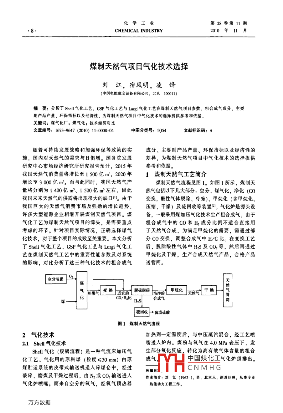化學(xué)工業(yè)第28卷第11期8CHEMICAL INDUSTRY2010年11月煤制天然氣項目氣化技術(shù)選擇劉江,宿鳳明,凌鋒(中國電能成套設(shè)備有限公司,北京10011)摘要:分析了She'氣化工藝,CSP氣化工藝與Lugi氣化工藝在煤制天然氣項目參數(shù)、粗合成氣成分、主要副產(chǎn)品產(chǎn)量、環(huán)保指標(biāo)以及經(jīng)濟性,為煤制天然氣項目中氣化技術(shù)的選擇提供參考和依據(jù)。關(guān)鍵詞:煤氣化廠;煤氣化;技術(shù)經(jīng)濟對比文章編號:1673-9647(2010)11-0008-04中圖分類號:TQ54文獻標(biāo)識碼:A隨著可持續(xù)發(fā)展戰(zhàn)略和加強環(huán)保等政策的實成分、主要副產(chǎn)品產(chǎn)量、環(huán)保指標(biāo)以及經(jīng)濟性的施,國內(nèi)對天然氣的需求與日俱增。國務(wù)院發(fā)展差異,為煤制天然氣項目中氣化技術(shù)的選擇提供研究中心市場經(jīng)濟研究所研究報告預(yù)計,2015年參考和依據(jù)。我國天然氣消費量將增長至1500億m,2020年1煤制天然氣工藝簡介增長至3000億m3。而與此同時,我國天然氣產(chǎn)煤制天然氣流程見圖1。如圖1所示,煤制天量將分別為1400億m3、1500億m3左右,因此然氣包括以下幾大部分:空分、煤氣化,凈化(C0我國未來天然氣的供需將出現(xiàn)很大的缺口。由于變換,酸性氣體脫除、冷凍)、甲烷化(含甲烷化、我國巨大的天然氣消費市場及強勁的增長趨勢,壓縮、干燥)及硫回收等裝置2。氣化爐是源頭許多大型能源企業(yè)相繼開展煤制天然氣項目。煤備,一般采用煤加壓氣化技術(shù)生產(chǎn)粗合成氣。由于氣化工藝為煤制天然氣項目的源頭,是需要重點粗合成氣中的CO和H2成分比例不適合直接用考慮的環(huán)節(jié)。針對項目實際情況,正確選擇煤氣于天然氣合成,為滿足甲烷化的需要,需通過部化技術(shù),對于整個項目的成敗至關(guān)重要。本文分析分C0變換,調(diào)整合成氣中H/C比。在變換工藝了She氣化工藝、GSP氣化工藝與Lurg氣化工后,脫除酸性氣體中HS及CO2等,然后再通過藝在煤制天然氣工藝中的重要性能參數(shù)及對系統(tǒng)甲烷化及干燥,生產(chǎn)合成天然氣產(chǎn)品,合格產(chǎn)品的影響,對比分析了這三種氣化技術(shù)的粗合成氣送管網(wǎng)??辗盅b置煤天化/氣變換適宜的脫硫脫碳凈的甲烷化天然號干燥CO/H2比合成氣硫回收卜硫或硫圖1煤制天然氣流程2氣化技術(shù)加熱到一定溫度后,與中壓蒸汽混合,經(jīng)工藝噴2IShe氣化技術(shù)嘴送人爐內(nèi)。煤粉與氧氣在40MPa表壓下,發(fā)Shel.氣化(廢鍋流程)是一種氣流床加壓氣生部分氧化反應(yīng),轉(zhuǎn)化為高有效氣體含量的粗合化工藝。氣化用的原料煤(粒度≤30mm)由原成氣中國煤化工氣化爐頂排出。煤貯運系統(tǒng)的皮帶式輸送機送入碎煤倉中,經(jīng)過收稿日CNMHG破碎、磨煤及干燥過程后,由N2或CO2輸送進人作者簡介:劉江(1962-),男,北京人,副總經(jīng)理,從事專業(yè)氣化爐噴嘴;而來自空分的氧氣,經(jīng)氧氣預(yù)熱器熱能動力工程工作第11期劉江等:煤制天然氣項目氣化技術(shù)選擇氣化爐頂部的煤氣溫度約1600℃,由后部返回2.3 Lurgi碎煤加壓氣化技術(shù)的冷煤氣混合激冷至900℃左右進人廢鍋回收熱urgi氣化屬于固定床碎煤加壓氣化工藝。該量。 Shell氣化爐氣化工藝如圖2所示。工藝采用的原料粒度為5-50mm,氣化劑采用水蒸汽與純氧;原料煤從氣化爐上部加入,在爐內(nèi)從上至下依次經(jīng)過干燥、干餾、半焦氣化、殘焦燃高壓蒸汽燒、灰渣排出等物理化學(xué)過程。氣化溫度為700~1100℃,氣化壓力為30-40MPa。 Lurgi碎煤加壓氣化爐如圖4所示。中壓蒸汽合成氣圖2Shl氣化爐工藝旋轉(zhuǎn)爐篦‖合成氣氣化劑22GSP氣化技術(shù)GSP氣化是一種氣流床加壓氣化工藝。該工藝排灰鎖斗首先將原料煤(原料以煤為例)進行破碎、磨煤灰和干燥,干燥后的煤粉用高壓№2(高于氣化壓力約1MPa)或CO2(做甲醇時用CO2)輸送到氣化圖4 Lurgi氣化爐工藝爐頂部的燒嘴,煤粉與氧氣和蒸汽在氣化爐內(nèi)瞬間(≈10s)完成反應(yīng),反應(yīng)溫度為1400-1600℃,3不同氣化工藝主要技術(shù)參數(shù)對比氣化壓力通常為25-40MPa;反應(yīng)后的氣體進31爐參數(shù)和粗合成氣成分入反應(yīng)室下部的激冷室進行激冷,液態(tài)渣也流入比較三種氣化工藝主要參數(shù)和所產(chǎn)粗合成氣激冷室凝固,通過灰鎖排入渣池。CSP氣化爐工成分如表1所示。藝如圖3所示。表1三種氣化工藝主要參數(shù)和所產(chǎn)粗合成氣成分于煤粉|純氧項目She氣化GSP氣化 Lurgi氣化參數(shù)氣化壓力MPa423~40低壓蒸汽氣化溫度r℃C1300-17001350-1750700-1100純氧純氧+水蒸汽純氧+水蒸汽出口合成氣度粗合成氣摩爾合成氣去下游分?jǐn)?shù)%灰水處理dH中國煤化工CNMHGS 27-32爐渣CH+C?圖3GSP氣化爐工藝08~1.108-1.1化學(xué)工業(yè)CHEMICAL INDUSTRY2010年第28卷三種氣化技術(shù)中,由于 Lurgi氣化技術(shù)的氣化量、廢水排放量及廢水的處理難度有較大區(qū)別,溫度比較低,溫度范圍控制在700-1100℃之間,有必要進行對比分析因此其合成氣中CH4摩爾分?jǐn)?shù)能到7%-12%,遠由于 Shell氣化為干法氣流床氣化,而且選擇高于She及CSP氣化技術(shù)的005%。粗合成氣中廢鍋流程,因此在生產(chǎn)過程中產(chǎn)生的廢水最少。較高的CH4含量能夠有效控制后續(xù)裝置的規(guī)模及GSP氣化技術(shù)采用水激冷流程,氣化爐產(chǎn)生的廢水相