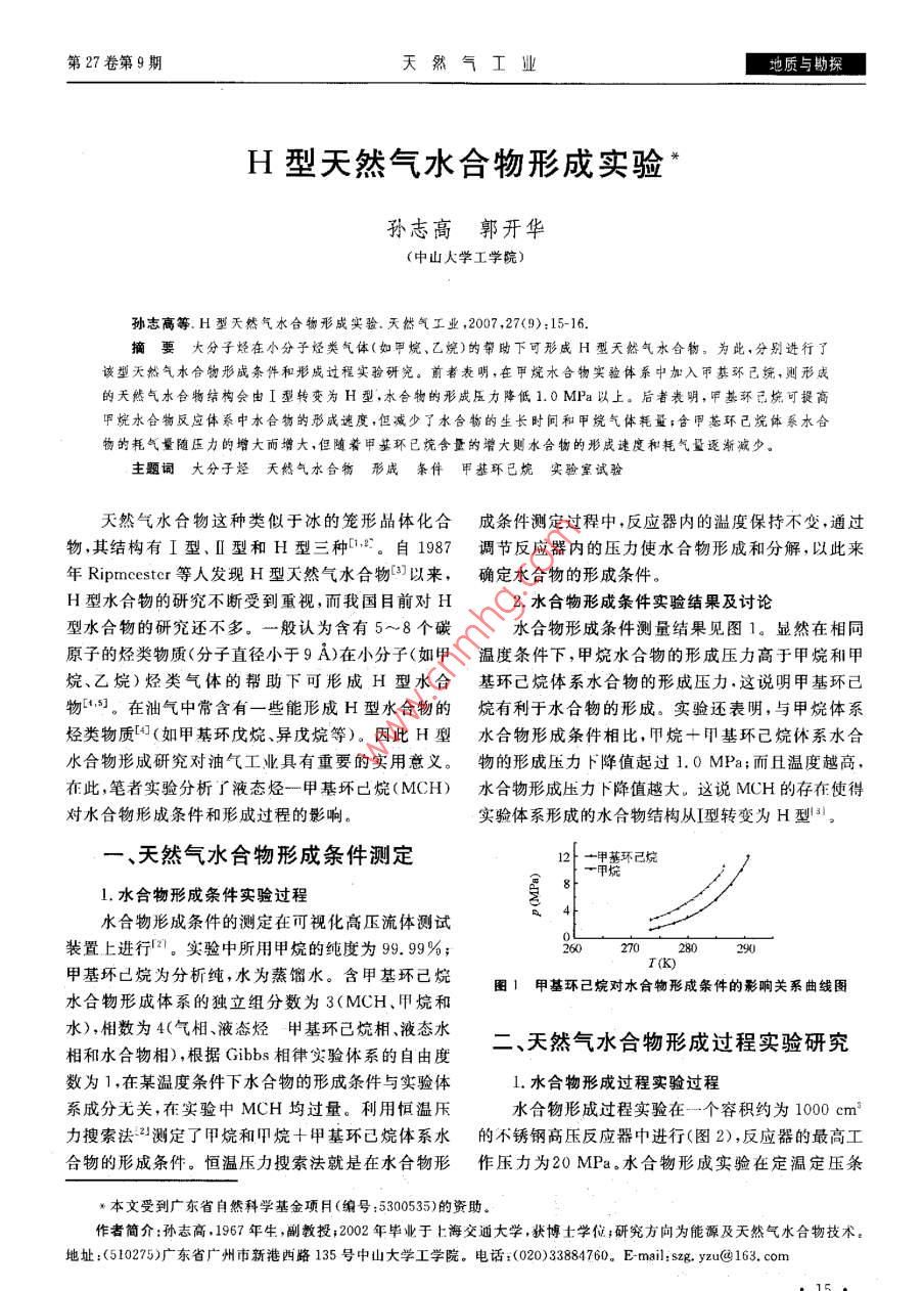 第27卷第9期天然氣工業(yè)地質(zhì)與勘探H型天然氣水合物形成實驗孫志高郭開華(中山人學工學院孫志高等.H型天然氣水合物形成實驗.天然氣工業(yè),2007,27(9):15-16摘要大分子烴在小分子烴類氣體(如甲烷、乙烷)的塑助下可形成H型天然氣水合物。為此,分別進行了該型天然氣水合物形成條件和形威過程實驗研究。前者表明,在甲烷水合物實驗體系中加入甲基環(huán)己統(tǒng),則形成的天然氣水合物結(jié)構(gòu)會由I型轉(zhuǎn)變?yōu)镠型,水合物的形成壓力降低1.0MPa以上。后者表明,甲基環(huán)已烷可提高烷水合物反應(yīng)體系中水合物的形成速度,但減少了水合物的生長時間和甲垸氣體耗量;含甲基環(huán)己烷體系水合物的耗氣量隨壓力的增大而增大,但隨著甲基環(huán)已烷含量的增大則水合物的形成速度和耗氣量逐漸減少。主題詞大分子烴天然氣水合衙形成條件甲基環(huán)已烷實驗窒試驗天然氣水合物這種類似于冰的籠形品體化合成條件測定過程中,反應(yīng)器內(nèi)的溫度保持不變,通過物,其結(jié)構(gòu)有I型、Ⅱ型和H型三種。自1987調(diào)節(jié)反應(yīng)器內(nèi)的壓力使水合物形成和分解,以此來年 Ripmeester等人發(fā)現(xiàn)H型天然氣水合物3以來,確定水合物的形成條件H型水合物的研究不斷受到重視,而我國目前對H2.水合物形成條件實驗結(jié)果及討論型水合物的研究還不多。一般認為含有5~8個碳水合物形成條件測量結(jié)果見圖1。顯然在相同原子的烴類物質(zhì)(分子直徑小于9A)在小分子(如甲溫度條件下,甲烷水合物的形成壓力高于甲烷和甲烷、乙烷)烴類氣體的幫助下可形成H型水合基環(huán)己烷體系水合物的形成壓力,這說明甲基環(huán)己物5。在油氣中常含有一些能形成H型水合物的烷有利于水合物的形成。實驗還表明,與甲烷體系烴類物質(zhì)(如甲基環(huán)戊烷、異戊烷等)。因此H型水合物形成條件相比,甲烷+甲基環(huán)己烷休系水合水合物形成研究對油氣工業(yè)具有重要的實用意義。物的形成壓力下降值起過1.0MPa;而且溫度越高,在此,筆者實驗分析了液態(tài)烴一甲基壞已烷(MCH)水合物形成壓力卜降值越大。這說MCH的存在使得對水合物形成條件和形成過程的影響。實驗體系形成的水合物結(jié)構(gòu)從型轉(zhuǎn)變?yōu)镠型3、天然氣水合物形成條件測定一甲基環(huán)己烷甲烷1.水合物形成條件實驗過程水合物形成條件的測定在可視化高壓流體測試裝置上進行。實驗中所用甲烷的純度為99.99%甲基環(huán)已烷為分析純水為蒸餾水。含甲基環(huán)己烷圖1甲基環(huán)已烷對水合物形成條件的影響關(guān)系曲纟水合物形成體系的獨立組分數(shù)為3(MCH、甲烷和水),相數(shù)為4(氣相、液態(tài)烴甲基環(huán)己烷相、液態(tài)水相和水合物相),根據(jù) Gibbs相律實驗體系的自由度二、天然氣水合物形成過程實驗研究數(shù)為1,在某溫度條件下水合物的形成條件與實驗體1.水合物形成過程實驗過程系成分無關(guān),在實驗中MCH均過量。利用恒溫壓水合物形成過程實驗在一個容積約為1000cm3力搜索法2測定了甲烷和甲烷十甲基環(huán)已烷體系水的不銹鋼高壓反應(yīng)器中進行(圖2),反應(yīng)器的最高工合物的形成條件。恒溫壓力搜索法就是在水合物形作壓力為20MPa。水合物形成實驗在定溫定壓條本文受到廣東省自然科學基金項月(編號:5300535)的資助作者簡介:孫志高,1967年生,副教投;2002年畢業(yè)于上海交通大學,獲博土學位;研究方向為能源及天然氣水合物技術(shù)地址:(510275)廣東省廣州市新港西路135號中山大學工學院。電話:(020)33884760。 E-mail:sg.yu@163,com地質(zhì)與謝探天然氣工業(yè)2007年9月成的影響。水合物形成速度和單位體積水合物中甲量流量計單問間進液真空系烷含量隨壓力的增大而增大,但隨著甲基環(huán)己烷含量的增大,水合物形成速度逐漸降低,而且水合物形成結(jié)束時單位體積水合物中的甲烷含量也減少甲基環(huán)己烷加快水合物形成速度的原因是因為甲烷+甲基環(huán)已烷體系水合物形成的壓力比甲烷水合物形成的壓力低(圖1),這樣在相同的壓力和溫度圖2水合物形成實驗裝置示意圖條件下甲烷+甲基環(huán)已烷水合物形成體系具有更大驅(qū)動力(水合物形成實驗壓力與相平衡壓力之差),件下進行。反應(yīng)器抽真空后加入300g左右的水及因而水合物形成速度比較快。但由于甲基環(huán)已烷的適量的甲基環(huán)己烷,向反應(yīng)器中充入甲烷氣體,反應(yīng)密度比水小,覆蓋在水的上面,妨礙了水合物形成過器中壓力在0.5MPa左右,低于實驗溫度條件下水程中甲烷氣體在水中的溶解。當水合物形成一段時合物的形成壓力。當溫度達到設(shè)定的實驗溫度并穩(wěn)間后,由于甲烷不能及時補充溶解到水中,因而水合定后,調(diào)節(jié)壓力調(diào)節(jié)器使反應(yīng)釜中壓力達到實驗壓物快速形成時間偏短,水合物形成速度很快下降,形力。實驗過程中水合物形成的耗氣量由氣體質(zhì)量流成的水合物中包含較多的未水合的液態(tài)水。甲基環(huán)量計測量,流量計的測量范圍為0~1L/min,測量精烷含量增加,這種現(xiàn)象更為明顯度為士2%。實驗過程中溫度、氣體流量由數(shù)據(jù)采集結(jié)論系統(tǒng)釆集2水合物形成過程結(jié)果與討論實驗測量了甲基環(huán)己烷對甲烷水合
