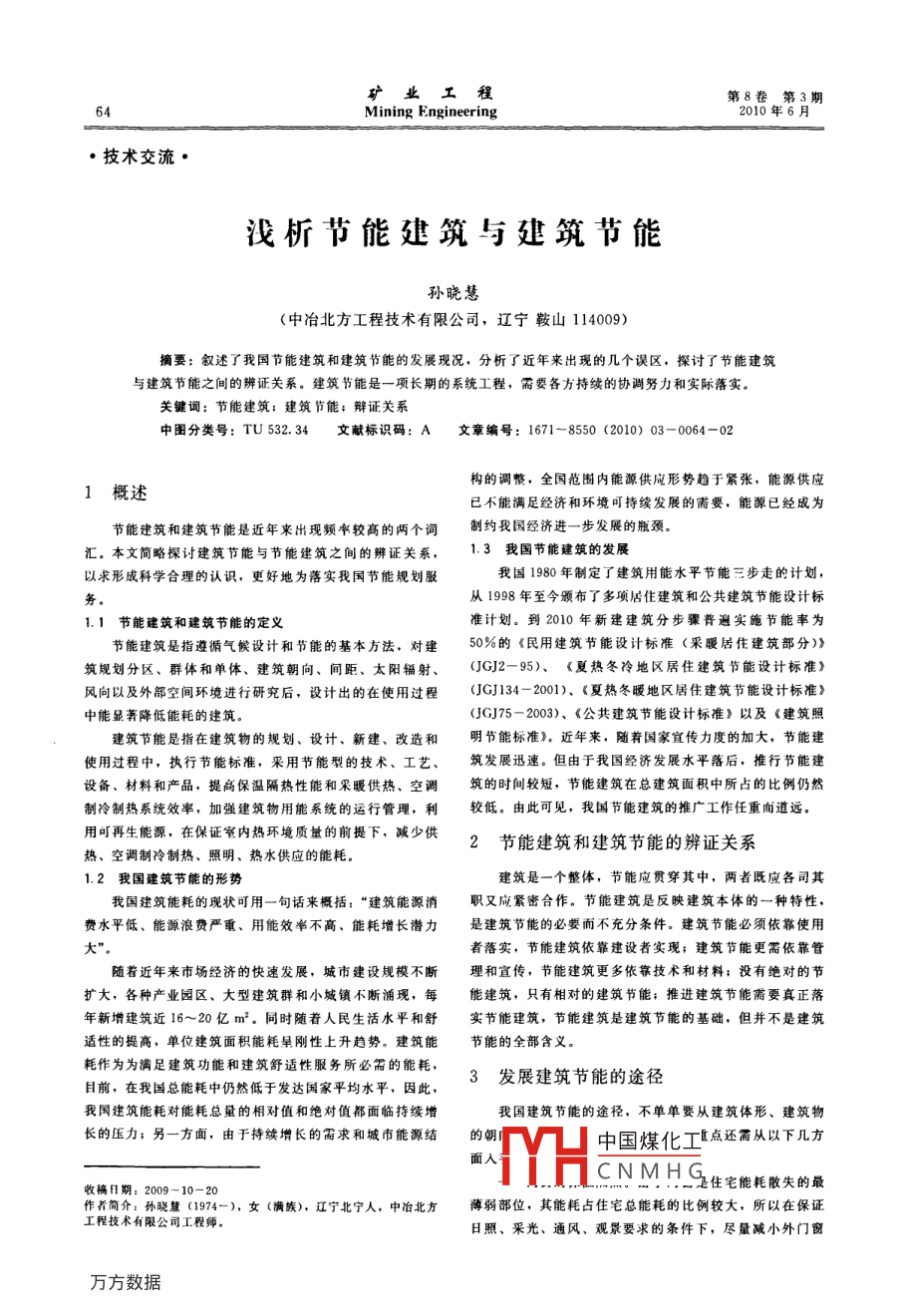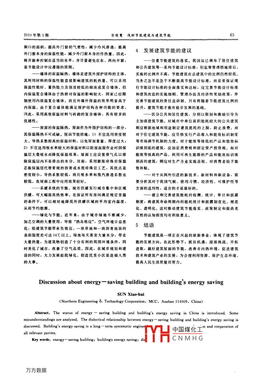 第8卷第3期Mining Engineering2010年6月·技術交流·淺析節(jié)能建筑亐建筑節(jié)能孫曉慧(中冶北方工程技術有限公司,遼寧鞍山114009)摘要:敘述了我國節(jié)能建筑和建筑節(jié)能的發(fā)展現(xiàn)況,分析了近年來出現(xiàn)的幾個誤區(qū),探討了節(jié)能建筑與建筑節(jié)能之間的辨證關系。建筑節(jié)能是一項長期的系統(tǒng)工程,需要各方持續(xù)的協(xié)調(diào)努力和實際落實關鍵詞:節(jié)能建筑;建筑節(jié)能;辯證關系中圖分類號:TU532.34文獻標識碼:A文章編號:1671-8550(2010)03-0064-02概述構的調(diào)幣,全國范圍內(nèi)能源供應形勢趨于緊張,能源供應已不能滿足經(jīng)濟和環(huán)境可持續(xù)發(fā)展的需要,能源已經(jīng)成為節(jié)能建筑和建筑節(jié)能是近年來出現(xiàn)頻率較高的兩個詞制約我國經(jīng)濟進一步發(fā)展的瓶頸。匯。本文簡略探討建筑節(jié)能與節(jié)能建筑之間的辨證關系,1.3我國節(jié)能建筑的發(fā)展以求形成科學合理的認識,更好地為落實我國節(jié)能規(guī)劃服我國1980年制定了建筑用能水平節(jié)能三步走的計劃,從1998年至今頒布了多項居住建筑和公共建筑節(jié)能設計標1.1節(jié)能建筑和建筑節(jié)能的定義準計劃。到2010年新建建筑分步驟普遍實施節(jié)能率為節(jié)能建筑是指遵循氣候設計和節(jié)能的基本方法,對建50%的《民用建筑節(jié)能設計標準(釆暖居住建筑部分)》筑規(guī)劃分區(qū)、群體和單體、建筑朝向、間距、太陽輻射、(JGJ2-95)、《夏熱冬冷地區(qū)居住建筑節(jié)能設計標準》風向以及外部空間環(huán)境進行研究后,設計出的在使用過程(JGJ134-2001)、《夏熱冬曖地區(qū)居住建筑節(jié)能設計標準》中能顯著降低能耗的建筑(JGJ75-2003)、《公共建筑節(jié)能設計標準》以及《建筑照建筑節(jié)能是指在建筑物的規(guī)劃、設計、新建、改造和明節(jié)能標準》。近年來,隨著國家宜傳力度的加大,節(jié)能建使用過程中,執(zhí)行節(jié)能標準,采用節(jié)能型的技術、工藝、筑發(fā)展迅速。但由于我國經(jīng)濟發(fā)展水平落后,推行節(jié)能建設備、材料和產(chǎn)品,提高保溫隔熱性能和采暖供熱、空調(diào)筑的時間較短,節(jié)能建筑在總建筑面積中所占的比例仍然制冷制熱系統(tǒng)效率,加強建筑物用能系統(tǒng)的運行管理,利較低。由此可見,我國節(jié)能建筑的推廣工作任重而道遠用可再生能源,在保證室內(nèi)熱環(huán)境質(zhì)量的前提下,減少供熱、空調(diào)制冷制熱、照明、熱水供應的能耗2節(jié)能建筑和建筑節(jié)能的辨證關系1.2我國建筑節(jié)能的形勢建筑是一個整體,節(jié)能應貫穿其中,兩者既應各司其我國建筑能耗的現(xiàn)狀可用一句話來概括:“建筑能源消職又應緊密合作。節(jié)能建筑是反映建筑本體的一種特性,費水平低、能源浪費嚴重、用能效率不高、能耗增長潛力是建筑節(jié)能的必要而不充分條件。建筑節(jié)能必須依靠使用者落實,節(jié)能建筑依靠建設者實現(xiàn);建筑節(jié)能更需依靠管隨著近年來市場經(jīng)濟的快速發(fā)展,城市建設規(guī)模不斷理和宣傳,節(jié)能建筑更多依靠技術和材料;沒有絕對的節(jié)擴大,各種產(chǎn)業(yè)園區(qū)、大型建筑群和小城鎮(zhèn)不斷涌現(xiàn),每能建筑,只有相對的建筑節(jié)能;推進建筑節(jié)能黹要真正落年新增建筑近16~20億m2。同時隨著人民生活水平和舒實節(jié)能建筑,節(jié)能建筑是建筑節(jié)能的基礎,但并不是建筑適性的提高,單位建筑面積能耗呈剛性上升趨勢。建筑能節(jié)能的全部含義耗作為為滿足建筑功能和建筑舒適性服務所必需的能耗前,在我國總能耗中仍然低于發(fā)達國家平均水平,因此,3發(fā)展建筑節(jié)能的途徑我國建筑能耗對能耗總量的相對值和絕對值都面臨持續(xù)增我國建筑節(jié)能的途徑,不單單要從建筑體形、建筑物長的壓力男一方面,由于持續(xù)增長的需求和域市能源結的V中國煤化工【點還需從以下幾方面入CNMHG收稿日期:2009-10-20住宅能耗散失的最作者簡介:孫曉慧(1974-),女(滿族),遼寧北寧人,中冶北方薄弱部位,其能耗占住宅總能耗的比例較大,所以在保證工程技術有限公司工程師。日照、采光、通風、觀景要求的條件下,盡量減小外門窗2010年第3期孫曉戇淺析節(jié)能建筑與建筑節(jié)能洞口的面積,提高外門窗的氣密性,減少冷風滲透,提高外門窗本身的保溫性能,減少外門窗本身的傳熱量。因此,4發(fā)展建筑節(jié)能的建議將開窗率控制在適當?shù)乃?并盡量避免在東、西向開窗注重節(jié)能建筑的落實。我國雖已頒布了居住建筑是節(jié)能設計中應遵循的原則和公共建筑等一系列節(jié)能設計標準,但監(jiān)督管理措施滯墻體的保溫隔熱:墻體是建筑外圍護結構的主體,實施的比例并不高,節(jié)能建筑在總建筑中的比例仍然較低其所用材料的保溫性能直接影響建筑的耗熱量。可以采用當務之急不是急于不斷提高節(jié)能設計標準,而是要保證現(xiàn)保溫性能好、蓄熱能力及強度較低的砌塊或復合墻體。但行節(jié)能設計標準的全面落實和達標,應完善節(jié)能設計標準內(nèi)保溫復合墻體由于熱橋?qū)Ρ氐挠绊戄^大,國家已經(jīng)限和建筑改造的實施細則、管理辦法及經(jīng)濟性獎勵政策,并制使用內(nèi)保溫