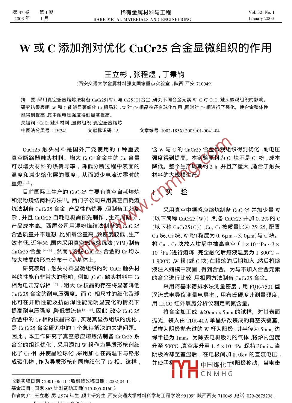 第32卷第1期稀有金屬材料與工程Vol. 32, No. 1003年1月RARE METAL MATERIALS AND ENGINEERINGJanuary 2003W或C添加劑對(duì)優(yōu)化CuCr25合金顯微組織的作用王立彬,張程煜,丁秉鈞(西安交通大學(xué)金屬材料強(qiáng)度國(guó)家重點(diǎn)實(shí)驗(yàn)室,陜西西安710049)摘要采用真空感應(yīng)熔煉法制備CuCr25(W),與Cr25(C)合金 研究不同合金元素W C對(duì)CuCr觸頭微觀組織的影響。研究結(jié)果表明,W和C能夠顯著細(xì)化Cr相晶粒,W對(duì)Cr相晶粒還有球化作用同時(shí)對(duì)Cr相進(jìn)行了強(qiáng)化。使合金整體性能得到提高其中耐電壓強(qiáng)度得到顯著提高。關(guān)鍵詞:CuCr觸頭材料;濕微組織真空感應(yīng)熔煉中圖法分類號(hào):TM241文獻(xiàn)標(biāo)識(shí)碼:A文章編號(hào):1002-185X(2003 )01 -0041-04CuCr25觸頭材料是國(guó)外廣泛使用的1種重要.含W與C的CuCr25合金微觀組織得到優(yōu)化,耐電壓真空斷路器觸頭材料。增大CuCr合金中的Cu含量強(qiáng)度得到提高。本實(shí)驗(yàn)原料為Cr塊不是Cr粉,成本可以增大材料的熱傳導(dǎo)率,降低分?jǐn)噙^(guò)程中表面的降低。整個(gè)生產(chǎn)周期約2h并且產(chǎn)量大,適合于觸頭溫度和減少熔化層的厚度,從而減少電流過(guò)零時(shí)的材料的大規(guī)模生產(chǎn)。重燃1.21。目前國(guó)際上生產(chǎn)的CuCr25主要有真空自耗熔煉1實(shí)驗(yàn)和混粉燒結(jié)兩種方法13。西門子公司采用真空自耗熔煉法制備CuCr25合金,產(chǎn) 品性能優(yōu)異,但制備工藝復(fù)采用真空中頻感應(yīng)熔煉制備CuCr25并加少量W雜,并且CuCr25自耗電極需預(yù)先制作,生產(chǎn)周期長(zhǎng),(以下簡(jiǎn)稱CuCr25(W))制備CuCr25并加0.2%的C產(chǎn)品成本高。西屋公司用混粉燒結(jié)法制備的CuCr25(以下稱CuCr25(C) ,Cu, Cr按質(zhì)量比為75:25,配置合金質(zhì)量并不理想,比如氧含量高,致密度較低,生產(chǎn)Cu塊、Cr塊、W粉(粒度為0. 6μum~3. 0μm)與C塊。效率低。近年來(lái)國(guó)內(nèi)采用真空感應(yīng)熔煉法(VIM)制備將Cu, Cr塊放入坩堝中抽高真空(1x10-Pa~3xCuCr25合金(4-61 ,然而,這些CuCr25合金的Cr均以10-2Pa )進(jìn)行熔煉,完全融化后熔液溫度為1 800C ~較大枝晶的形態(tài)分布于Cu基體上。1 900C ,W粉(或C塊)在精煉的后期加入然后將熔研究表明,觸頭材料顯微組織的對(duì)CuCr觸頭材液注入蠟?zāi)V心?得到合金。為與不加入合金元素料的性能有非常大的影響。例如CuCr 觸頭材料中Cr的合金進(jìn)行比較用相同方法制備CuCr25合金。相為電擊穿弱相17],粗大Cr枝晶的存在將顯著降低采用阿基米德排水法測(cè)量密度,用FQR-7501型CuCr25合金的耐電壓強(qiáng)度。而Cr相尺寸的細(xì)化及球渦流式電導(dǎo)儀測(cè)量電導(dǎo)率,用布氏硬度計(jì)測(cè)量硬度,化可在開(kāi)斷性能及抗融焊性能無(wú)明顯變化的情況下用LECO紅外氧氮分析儀測(cè)定氧氮含量。提高耐電壓強(qiáng)度降低截流值l8~ 10)。因此改變CuCr25將合金加工成φ20mmx5mm的試樣,對(duì)其表面合金中的Cr相的枝晶形態(tài),實(shí)現(xiàn)其顯微組織的優(yōu)化,拋光,裝入由TDR-40A單晶爐改裝成的真空滅弧室,是CuCr25合金研究中的1個(gè)急待解決的關(guān)鍵問(wèn)題。試樣為陰極拋光過(guò)的W桿為陽(yáng)極,其半徑為5mm,邊因此,本工作研究了真空感應(yīng)熔煉法制備CuCr25系緣半徑為1mm。為除去電極吸附的氣體將爐內(nèi)溫度合金的組織優(yōu)化,采用添加W粉作為異質(zhì)形核劑細(xì)升至500C真空度升至1.5x10-3Pa ,保持30mino當(dāng)化了Cr相,并使晶粒球化,采用加C在高溫下與鉻形陰極冷卻至室溫后,在電極間加8. OkV的直流電壓,成碳化物,作為異質(zhì)形核劑同樣細(xì)化了Cr相。這樣,并 使陰桃中國(guó)煤化工陽(yáng)極移動(dòng),當(dāng)電擊"THCNMH G收到初稿日期:2001-06-11 ;收到修改稿日期:2002-04-11基金項(xiàng)目:國(guó)家863計(jì)劃資助項(xiàng)目( 715-005-0160 )作者簡(jiǎn)介:王立彬男,1974 年生碩士研究生西安交通大學(xué)材料科學(xué)與工程學(xué)院99109*陜西西安710049 ,電話029-2675208 ,萬(wàn)芳數(shù)據(jù)”agingg@ 263. net稀有金屬材料與工程32卷穿發(fā)生時(shí),停止移動(dòng),計(jì)算擊穿電場(chǎng)強(qiáng)度。然后下移陰圖3為VIM制備的CuCr25(W)合金的顯微組織極準(zhǔn)備下1次測(cè)試。每個(gè)試樣測(cè)量100次,為排除老形貌,其成分分析見(jiàn)表1。Cr 相以顆粒狀在基體中均煉的影響,計(jì)算擊穿場(chǎng)強(qiáng)時(shí)均取后60個(gè)數(shù)據(jù)。表1 CuCr25W1 合金成分分布(質(zhì)量分?jǐn)?shù))Table 1 Compositional distribution of CuCr25W1 alloy2實(shí)驗(yàn)結(jié)果 與討論AlloyingAverage alloCopper richChromium richelementcompositionphase2.1成分及微觀形貌Cu/%74.1197.89 .4.52 .熔煉時(shí)在電磁攪拌作用下Cu ,Cr充分混合,快速Cr/ %24.651.9592.85凝固條件下Cr受重力影響產(chǎn)生的偏析降低。圖1為W/% _1.240.162.63VIM制備的CuCr25合金的典型組織,顯示為枝晶,而且大部分以大枝晶存在, 單純采用快冷很難進(jìn)-步細(xì)勻形核,Cr 晶粒尺寸已經(jīng)達(dá)到5μm~ 10μm消除了枝化Cr相。在斷路器的運(yùn)行過(guò)程中枝晶尤其是大枝晶晶并使Cr晶粒球化。Cr晶粒中的灰白斑點(diǎn)(如圖4)(許多大枝晶達(dá)100um),不利于從Cr相向Cu相基體經(jīng)能譜分析W含量相對(duì)很高(如圖5)達(dá)到20.67%,散熱,因而耐電壓強(qiáng)度低。晶粒界面模糊;由Cr-W