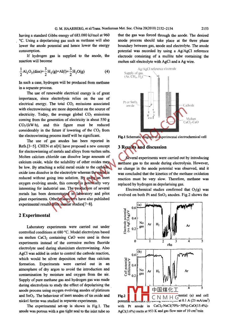 藏巴science DirectTransactions ofNonferrous MetalsSociety of ChinaELSEVIER PressTrans. Nonferrous Met. Soc. China 20(2010)2152-2154www.tnmsc.cnDepolarised gas anodes for aluminium electrowinningGMHAARBERG.E KVALHEIM. A.P. RATVIKSJ. XIAO T. MOKKELBOST1. Department of Materials Science and Engineering,Norwegian University of Science and Technology(NTND), No-7491 Trondheim, Norway;2. SINTEF Materials and Chemistry, NO- 7465 Trondheim, NorwayReceived 23 October 2009; accepted 30 March 2010Abstract: Consumable carbon anodes are used in the electrowinning of aluminium by the Hall-Heroult process. Emissions of cO2may be eliminated by introducing an inert oxygen evolving anode, which however will require a higher anode potential. Analternative approach is to use a natural gas or hydrogen gas anode to reduce the CO2 emissions and lower the anode potentialPreliminary laboratory experiments were camied out in an altermative molten salt electrolyte consisting of CaCIz-Cao-NaCl at 680CPorous anodes of platinum and tin oxide were tested during electrolysis at constant current. The behaviour of inert anode candidatematerials such as tin oxide and nickel ferrite were also studiedKey words: anodes; natural gas; aluminium electrowinningcurrent efficiency, energy consumption and cell size1 Introduction(amperage) have been greatly improved. However, theprocess still suffers from the use of consumable carbonAluminium is produced solely by the Hall-Heroult anodes, which leads to emissions of CO2 of about 1.5 kgprocess, which was patented independently by Hall and per kg Al in addition to the extra cost and labour forHeroult in 1886. The overall primary cell reaction isproducing and replacing anodes. Considerable researchefforts have not led to the development of an inert2 Al203(diss)+=(s)Al(+cO2(g)(1) oxygen evolving anode, although some candidatematerials have been identified. Among them SnOz andThe standard Gibbs energy is 689.309 kJ/mol at 960C. nickel ferrites are considered promising. By using anPure anhydrous solid alumina is dissolved in a molten inert anode the cell reaction becomesfluoride electrolyte based on cryolite(Na3AlF6)containingsome AIF, as well as CaF2lll. Modern cells are equipped IAl2O3(diss -Al()+=O2(g)with so called prebaked carbon anodesrating at955-965oC. The current efficiency with respect to with a standard Gibbs energy of 1 283. 316 kJ/mol at 960aluminium can be as high as 96% and the corresponding C. Hence, the decomposition voltage will increase byenergy consumption may be -14 kW.h/kg Al in cells about 1 V when using an inert anode. This increase mayrunning at-300 ka or higher. The annual production of be compensated by being able to redesign the cellsprimary aluminium was about 38 million tons in 2007, reduce the ohmic voltage drop in the electrolytemaking it the most important electrowinning process[2An alternative way of reducing the anodic coAlthough the basic principles of the process remain production is to use an oxidizable gas to depolarise theunchanged, great technological developments have taken anode process. By introducing methane gas to the anode,place. The main improvements are related to the reaction can change toenvironmental issues. Scrubbing of the exit gas hasminimized the emissions of harmful and toxic gaseous Iand particulate constituents to the working atmosphere22H:4=AO21H2Oand to the air. also some key performance data such asCNMHGCorresponding author: G M. HAARBERG; Tel: +47-95071825: E-mail: geir. m haarberg @materialntnu.noDol:l0.1016S10036326(09)604349G.M. HAARBERG, et al/Trans. Nonferrous Met. Soc. China 20(2010)2152-21542153having a stibbs energy of 683.080 kJ/mol at 960 that the gas was forced through the anode. The desired°C. Usingarising gas such as methane will also anode process should take place at the three phasepotential and hence lower the energy boundary between gas, anode and electrolyte. The anodepotential was recorded by using a Ag/AgCl referenceIf hydrogen gas is supplied to the anode, the electrode consisting of a mullite tube containing thereaction will becomemolten salt electrolyte with AgCl and a Ag wire1A2o3(is)+3x12)=A0+3Og)(4)Ag/AgCl reference electrodeSIn such a case, hydrogen will be produced from methaneIn a separate process.The use of renewable electrical energy is of greatimportance, since electrolysis relielectrical energy. The total COz emissions associatedt or snCathodewith electrowinning are more dependent on the source ofelectricity. Today, the average global COz emissionscoming from the generation of electricity is about 550 gMoltenCO,/(kW.h), and this figure must be reducedCaCI.-Caoconsiderably in the future if lowering of the COz fromthe electrowinning process itself will be significant.Fig 1 Schematic diagram of experimental electrochemical cellRefs. [3-5]. CHEN et al[] have proposed a new concept 3 Results and discussionfor electrowinning of metals and alloys from molten saltsMolten calcium chloride can dissolve large amounts ofSeveral experiments were carried out by introducingcalcium oxide, while the solubility of other oxides may methane gas to the anode during electrolysis. However,be low. By attaching a solid metal oxide to the cathode, no change in the anode potential was observed, and itoxide ions dissolve in the electrolyte whereas the metal is was concluded that the kinetics of the methane oxidationreduced without going into solution By using an inert reaction must be very slow. Therefore, methane wasoxygen evolving anode,cept is potentiallyreplaced by hydrogen as depolarising gasinteresting for industrial use. The production of sevElectrochemical studies confirmed that O2(g) wasmetals has been demonstrated in laboratory and pilotplant experiments. Other researchers have also published evolved on both Pt and SnO2 anodes. Fig. 2 shows theexperimental results from similar studies[7-8](a)2 Experimental區(qū)三04Laboratory experiments were carried out underNoArH2controlled conditions at 680C Model electr