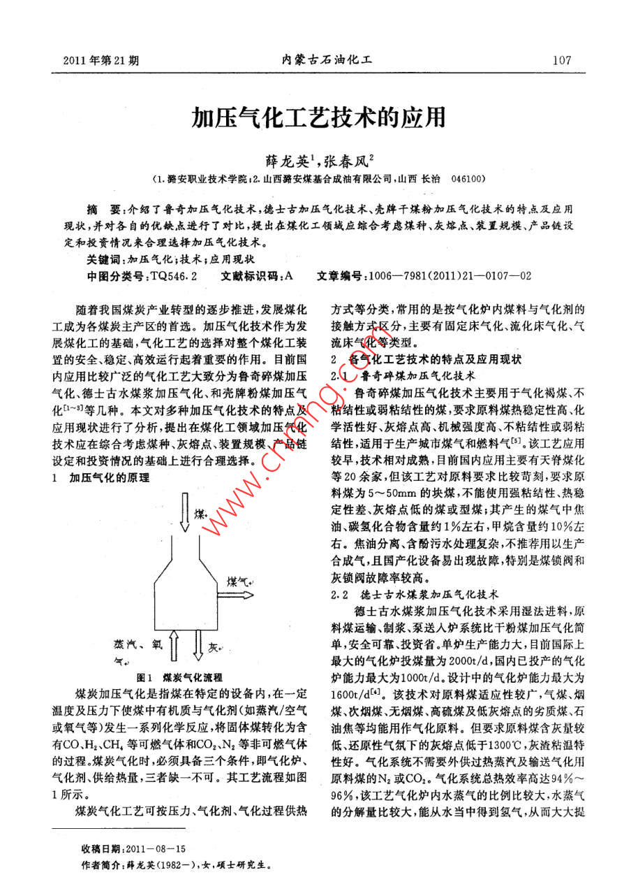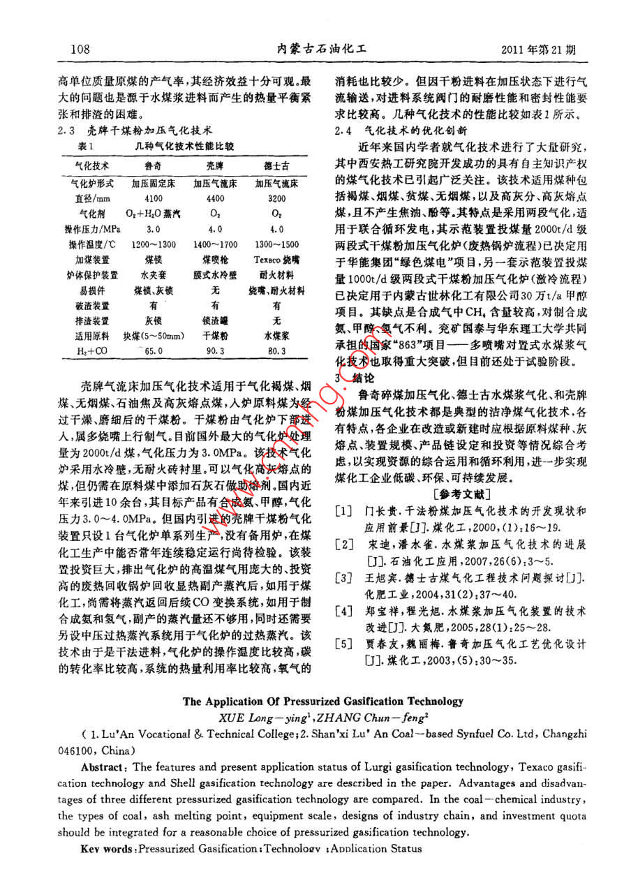 108內(nèi)蒙古石油化工2011年第21期高單位質(zhì)量原煤的產(chǎn)氣率,其經(jīng)濟(jì)效益十分可觀。最消耗也比較少。但因千粉進(jìn)料在加壓狀態(tài)下進(jìn)行氣大的問題也是源于水煤漿進(jìn)料而產(chǎn)生的熱量平衡緊流輸送,對進(jìn)料系統(tǒng)閥門的耐磨性能和密封性能要張和排渣的困難。求比較高。幾種氣化技術(shù)的性能比較如表1所示。2.3殼牌干煤粉加壓氣化技術(shù)2.4氣化技術(shù)的 優(yōu)化創(chuàng)新表1幾種氣化技術(shù)性能比較近年來國內(nèi)學(xué)者就氣化技術(shù)進(jìn)行了大量研究,氣化技術(shù)魯奇德士古其中西安熱工研究院開發(fā)成功的具有自主知識產(chǎn)權(quán)氣化爐形式加壓固定床 加壓氣流床 加壓氣流床的煤氣化技術(shù)已引起廣泛關(guān)注。該技術(shù)適用煤種包直徑/mm410044003200括褐煤煙煤、貧煤、無煙煤,以及高灰分、高灰熔點(diǎn)氣化劑O+H20蒸汽0煤,且不產(chǎn)生焦油、酚等。其特點(diǎn)是采用兩段氣化,適操作壓力/MPa3.04.04.用于聯(lián)合循環(huán)發(fā)電,其示范裝置投煤量2000t/d級操作溫度/C 1200~1300 1400~17001300~1500兩段式干煤粉加壓氣化爐(廢熱鍋爐流程)已決定用加煤裝置煤鎖煤嗖槍Texeco燒嘴于華能集團(tuán)“綠色煤電”項(xiàng)目,另一套示范裝置投煤爐體保護(hù)裝置水夾套膜式水冷壁耐火材料量1000t/d級兩段式干煤粉加壓氣化爐(澈冷流程)易損件煤鎖、灰鎖無燒嘴、麗火材料已決定用于內(nèi)蒙古世林化工有限公司30萬t/a甲醇破渣裝置有項(xiàng)目。其缺點(diǎn)是合成氣中CH,含量較高,對制合成排渣裝置灰鎖鎖資瞻適用原料塊煤(5~50mm) 干煤粉水煤漿氨、甲醇、氫氣不利。兗礦國泰與華東理工大學(xué)共同H2+CO”65.090. 380.3承擔(dān)的國家“863”項(xiàng)目一多噴嘴 對置式水煤漿氣化技術(shù)也取得重大突破,但目前還處于試驗(yàn)階段。殼牌氣流床加壓氣化技術(shù)適用于氣化褐煤、煙3結(jié)論煤、無煙煤、石油焦及高灰熔點(diǎn)煤,人爐原料煤為經(jīng)魯奇碎煤加壓氣化、德士古水煤漿氣化、和殼牌過干燥、磨細(xì)后的千煤粉。干煤粉由氣化爐下部進(jìn)粉煤加壓氣化技術(shù)都是典型的潔凈煤氣化技術(shù),各人,屬多饒嘴上行制氣。目前國外最大的氣化爐處理有特點(diǎn),各企業(yè)在改造或新建時應(yīng)根據(jù)原料煤種、灰量為2000t/d煤,氣化壓力為3. 0MPa.該技術(shù)氣化熔點(diǎn)、裝置規(guī)模、產(chǎn)品鏈設(shè)定和投資等情況綜合考爐采用水冷壁,無耐火磚襯里??梢詺饣呋胰埸c(diǎn)的慮,以實(shí)現(xiàn)資源的綜合運(yùn)用和循環(huán)利用,進(jìn)-步實(shí)現(xiàn)煤,但仍需在原料煤中添加石灰石做助熔劑.國內(nèi)近煤化工企業(yè)低碳、環(huán)保、可持續(xù)發(fā)展。[參考文獻(xiàn)]年來引進(jìn)10余臺,其目標(biāo)產(chǎn)品有合成氨、甲醇,氣化[1] 門長貴.干法粉煤加壓氣化技術(shù)的開發(fā)現(xiàn)狀和壓力3.0~4.0MPa.但國內(nèi)引進(jìn)的殼牌干煤粉氣化應(yīng)用前景[].煤化工,2000,(1):16~19.裝置只設(shè)1臺氣化爐單系列生產(chǎn),沒有備用爐,在煤[2]宋迪,潘水雀.水煤漿加壓氣化技術(shù)的進(jìn)展化工生產(chǎn)中能否常年連續(xù)穩(wěn)定運(yùn)行尚待檢驗(yàn)。該裝[J].石油化工應(yīng)用,2007 ,26(6):3~5. .置投資巨大,排出氣化爐的高溫煤氣用龐大的、投資[3]王旭賓.德士古煤氣化工程技術(shù) 問題探討DJ].高的廢熱回收鍋爐回收顯熱副產(chǎn)蒸汽后,如用于煤化肥工業(yè),2004,31(2):37~40.化工,尚需將蒸汽返回后續(xù)CO變換系統(tǒng),如用于制[4] 鄭寶祥,程光旭.水煤漿加壓氣化裝置的技術(shù)合成氨和氫氣,副產(chǎn)的蒸汽量還不夠用,同時還需要改進(jìn)[J].大氮肥,2005 ,28(1):25~28.另設(shè)中壓過熱蒸汽系統(tǒng)用于氣化爐的過熱蒸汽。該[5] 賈春友,魏麗梅.魯奇加壓氣化工藝優(yōu)化設(shè)計技術(shù)由于是干法進(jìn)料,氣化爐的操作溫度比較高,碳[J].煤化工,2003, (5):30~35.的轉(zhuǎn)化率比較高,系統(tǒng)的熱量利用率比較高,氧氣的The Application Of Pressurized Gasification TechnologyXUE Long-ying' ,ZHANG Chun- feng2( 1. Lu'An Vocational & Technica! College;2. Shan'xi Lu' An Coal~ based Synfuel Co. Ltd, Changzhi046100, China)Abstract: The features and present application status of Lurgi gasification technology, Texaco gasifi-cation technology and Shell gasification technology are described in the paper. Advantages and disadvan-tages of three different pressurized gasification technology are compared. In the coal一chemical industry,the types of coal, ash melting point, equipment scale ,designs of industry chain, and investment quotashould be integrated for a reasonable choice of pressurized gasification technology.Kev words :Pressurized Gasification :Technoloev ;Application Status