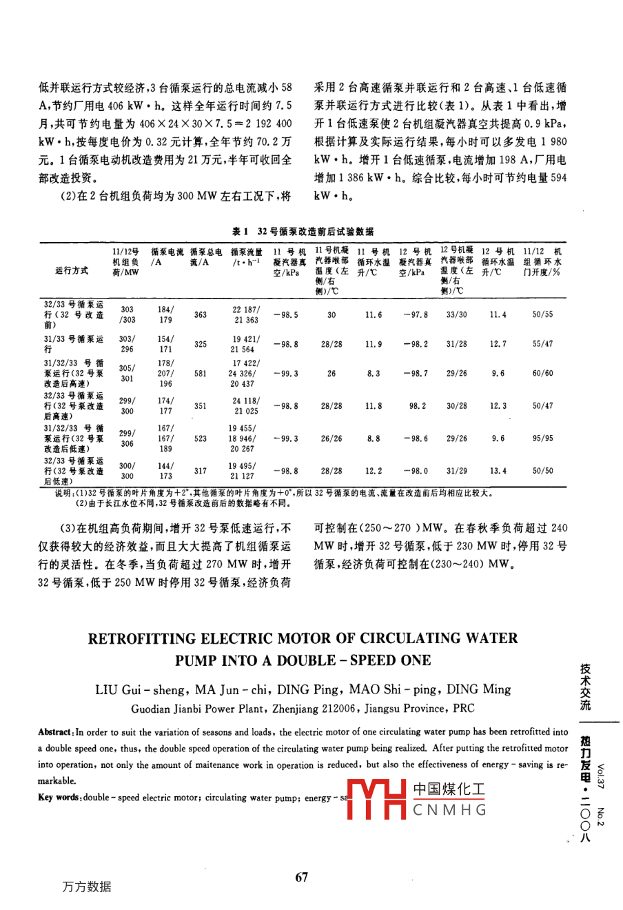 循環(huán)水泵電動(dòng)機(jī)雙速改造劉桂生,馬駿馳,丁平,冒士平,丁銘國(guó)電諫壁發(fā)電廠,江蘇鎮(zhèn)江212006[摘要]為適應(yīng)季節(jié)和負(fù)荷變化,將1臺(tái)循環(huán)水泵電動(dòng)機(jī)改為雙速電機(jī)動(dòng),改造投用后,不但運(yùn)行維護(hù)量少且節(jié)能效果明顯[關(guān)鍵詞]循環(huán)水泵;雙速電動(dòng)機(jī);凝汽器;節(jié)能[中圖分類號(hào)]TM3[文獻(xiàn)標(biāo)識(shí)碼]B[文章編號(hào)]1002-3364(2008)02-0066-02國(guó)電諫壁發(fā)電廠六期2×330MW機(jī)組汽輪機(jī)型(1)根據(jù)三相繞組對(duì)稱和繞組系數(shù)盡可能高的原號(hào)為N330-16.67/538/538,配置有4臺(tái)PHZ1600-則,在不更換定子鐵芯的前提下,將同一繞組變?yōu)?61100型50%容量的循環(huán)水泵(循泵,分別為31號(hào)~34極(371r/min)及18極(333r/min)。號(hào)),單泵流量為23400m3/h,揚(yáng)程為16m,配套電動(dòng)(2)對(duì)電動(dòng)機(jī)的相關(guān)參數(shù)進(jìn)行核算,防止在18極機(jī)型號(hào)為YL1800-16/1730-1,功率為1800kW,電時(shí)電動(dòng)機(jī)產(chǎn)生異常振動(dòng)及噪聲。壓為6000V,轉(zhuǎn)速為371r/min。2×330MW機(jī)組的(3)通過改變外部接線實(shí)現(xiàn)333/min(18極)和循環(huán)水系統(tǒng)采用母管制運(yùn)行方式。在運(yùn)行中,循環(huán)水371r/min(16極)2種轉(zhuǎn)速的切換。量只能通過增減循環(huán)水泵臺(tái)數(shù)來調(diào)節(jié),在春秋季70%(4)當(dāng)電源電壓在(5.6~6.6)kV之間變化時(shí),保負(fù)荷和冬季90%以上負(fù)荷時(shí),2臺(tái)循泵運(yùn)行水量偏少電動(dòng)機(jī)在2種轉(zhuǎn)速下的輸出功率維持在相對(duì)應(yīng)的額3臺(tái)循泵運(yùn)行水量偏多。對(duì)此,擬將1臺(tái)循泵電動(dòng)機(jī)定值內(nèi)由單轉(zhuǎn)速改為雙轉(zhuǎn)速,以實(shí)現(xiàn)循泵雙速運(yùn)行和節(jié)能降(5)允許全壓起動(dòng),最低起動(dòng)電壓不低于70%額耗定電壓,可帶負(fù)荷起動(dòng),電動(dòng)機(jī)繞組為F級(jí)絕緣,部件3臺(tái)溫升滿足B級(jí)要求。允許冷態(tài)下連續(xù)起動(dòng)2次1循泵電動(dòng)機(jī)改造方法熱態(tài)下起動(dòng)1次。(6)在2種轉(zhuǎn)速下三相磁場(chǎng)對(duì)稱,振動(dòng)值不大于根據(jù)循泵的性能曲線,其轉(zhuǎn)速改變不太大時(shí),泵的0.05mm技效率近似不變,流量揚(yáng)程功率則與轉(zhuǎn)速近似成一次(7)在2種轉(zhuǎn)速情況下電動(dòng)機(jī)的繞組均有較高的分術(shù)方、二次方、三次方關(guān)系下降。2X300MW機(jī)組循泵布系數(shù),具有良好的運(yùn)行性能,不應(yīng)有異常的電磁噪聲流電動(dòng)機(jī)繞組極數(shù)為16極,定子槽數(shù)為108槽、轉(zhuǎn)子槽數(shù)為132槽,雙鼠籠結(jié)構(gòu)。如將繞組極數(shù)改為18極,2運(yùn)行效果分析熱轉(zhuǎn)速將變?yōu)?3r/min,此時(shí)泵的流量揚(yáng)程功率分別為原轉(zhuǎn)速(37lr/mn)時(shí)的88.8%、0.789%、71.0%(1)在2臺(tái)機(jī)組負(fù)荷均為300MW左右工況下,將電可較好地滿足運(yùn)行要求。因此,決定將32號(hào)循泵電動(dòng)采用3臺(tái)高速循泵并聯(lián)運(yùn)行與2臺(tái)高速1臺(tái)低速循泵機(jī)進(jìn)行改造。中國(guó)煤化工從表1中看出,2高1確O作者簡(jiǎn)介:劉桂生(1969),男,國(guó)電津壁發(fā)電廠設(shè)備管理部工程師從事汽輪HCNMHGE-mailu. com低并聯(lián)運(yùn)行方式較經(jīng)濟(jì),3臺(tái)循泵運(yùn)行的總電流減小58采用2臺(tái)高速循泵并聯(lián)運(yùn)行和2臺(tái)高速、1臺(tái)低速循A,節(jié)約廠用電406kW·h。這樣全年運(yùn)行時(shí)間約7.5泵并聯(lián)運(yùn)行方式進(jìn)行比較(表1)。從表1中看出,增月,共可節(jié)約電量為406×24×30×7.5=2192400開1臺(tái)低速泵使2臺(tái)機(jī)組凝汽器真空共提高0.9kPa,kW·h,按每度電價(jià)為0.32元計(jì)算,全年節(jié)約70.2萬根據(jù)計(jì)算及實(shí)際運(yùn)行結(jié)果,每小時(shí)可以多發(fā)電1980。1臺(tái)循泵電動(dòng)機(jī)改造費(fèi)用為21萬元,半年可收回全kW·h。增開1臺(tái)低速循泵,電流增加198A,廠用電部改造投資增加1386kW·h。綜合比較,每小時(shí)可節(jié)約電量5942)在2臺(tái)機(jī)組負(fù)荷均為300MW左右工況下,將kW·h表132號(hào)循泵改造前后試驗(yàn)數(shù)據(jù)112號(hào)循泵電流循泵總電循泵流量11號(hào)機(jī)11號(hào)機(jī)凝11號(hào)機(jī)11/12機(jī)機(jī)組負(fù)/A汽器真汽器喉部循環(huán)水溫組循環(huán)水運(yùn)行方式荷/MW空/kPa溫度(左升/℃2::門開度/%側(cè)/右2/3號(hào)循果運(yùn)303行(32號(hào)改造184/17922187/-92136311.67.833/3011.450/5531/33號(hào)循泵運(yùn)303/15419421/-9828/2811.9-98.231/2812.755/47泵運(yùn)行(32號(hào)泵305/178/31/32/33號(hào)循98.729/2660/60改造后高速)2043732/33號(hào)循泵運(yùn)行(32號(hào)泵改造2411898.828/2811.898.230/2812.3后高速1/32/33號(hào)循299/泵運(yùn)行(32號(hào)泵306189167/52318946/-99.326/268.89.6改造后低速)32/33號(hào)循泵運(yùn)行(32號(hào)泵改造9495/211298.828/2812.2-98.031/2913.450/50說明;(1)32號(hào)循泵的葉片角度為+2,其他循泵的葉片角度為+0,所以32號(hào)循泵的電流、流量在改造前后均相應(yīng)比較大2)由于長(zhǎng)江水位不同,32號(hào)循泵改造前后的數(shù)據(jù)略有不同(3)在機(jī)組高負(fù)荷期間,增開32號(hào)泵低速運(yùn)行,不可控制在(250~270)MW。在春秋季負(fù)荷超過240僅獲