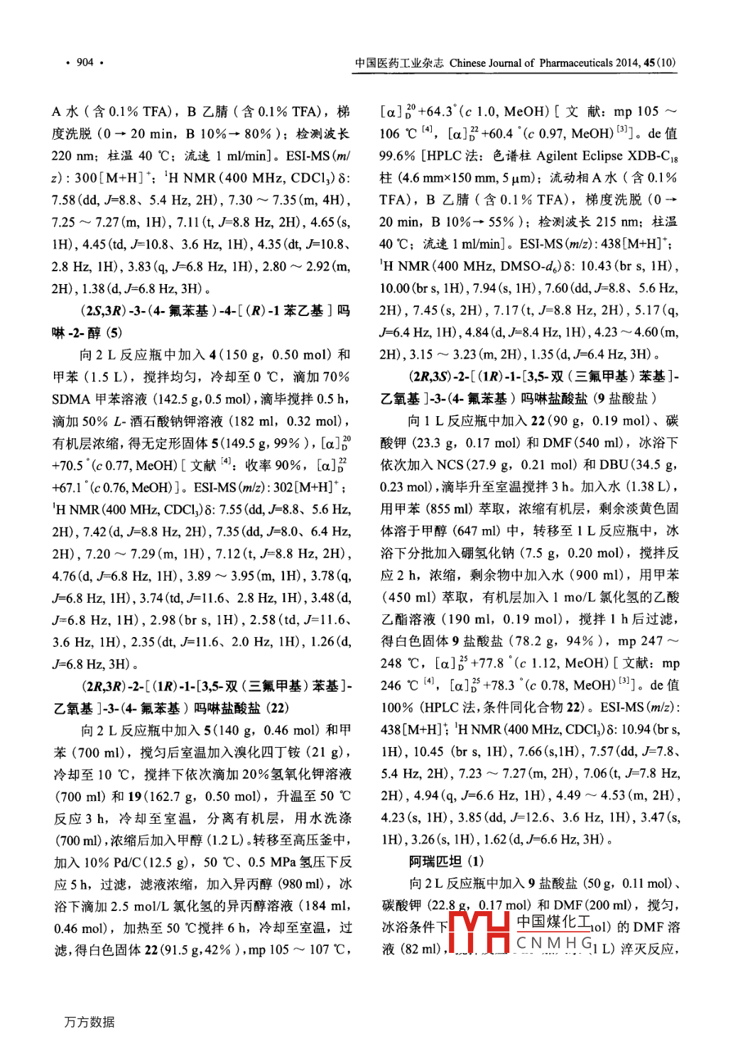 中國醫(yī)藥工業(yè)雜志Chinese Joumal of Pharmaceuticals 2014, 45(10)阿瑞匹坦的合成蘇溫柔',倪峰',張瑾',朱舞”,李建其'*(1.中國醫(yī)藥工業(yè)總院上海醫(yī)藥工業(yè)研究院,化學制藥新技術(shù)中心,上海200437; 2. 上海開義醫(yī)藥化工有限公司,上海201512)摘要: (R)-苯乙胺與2-溴乙醇縮合后,與1-(4-氟苯基)-2,2-二羥基乙酮通過結(jié)晶誘導的不對稱轉(zhuǎn)化環(huán)合得(R) -3-(4-氟苯基)-4-[(R)-1-苯乙基]嗎啉-2-酮鹽酸鹽,經(jīng)立體位阻控制的還原后選擇性得到單--光學異構(gòu)體(2S,3R)-3-(4- 氟苯基)-4-[(R)-1-苯乙基]嗎啉-2- 醇,然后經(jīng)親核取代反應、脫保護和優(yōu)先結(jié)晶得(2R,3R)-2-[(1R)-1-[3,5- 雙(三氟甲基)-苯基]乙氧基]-3-(4-氟苯基)嗎啉鹽酸鹽,再經(jīng)脫氫和還原得(2R,3S) 2-[(1R)-1-[3,5-雙(三氟甲基)苯基]乙氧基]-3-(4-氟苯基)嗎啉鹽酸鹽,最后與5-氯甲基-2,4-二氫-1,2,4-三唑-3-酮縮合制得阿瑞匹坦,總收率約21% [以(R)-苯乙胺計]。關(guān)鍵詞:阿瑞匹坦;化療引起的惡心嘔吐;合成中圖分類號: R975*.4文獻標志碼: A文章編號: 1001-8255 (2014) 10-0901-05Synthesis of AprepitantSU Wenrou', NI Feng', ZHANG Jin', ZHU Ben', LI Jianqil*(I. Novel Technology Center of Pharmaceutical Chemistry, Shanghai Institute of Pharmaceutical Industry,China State Instiue of Pharmaceutical Industry, Shanghai 200437; 2. Shanghai Kaiyi Pharmaceutical Co, Ltd, Shanghai 201512)ABSTRACT: (R) -Phenylethylamine reacted with 2-bromoethanol to give (R) -2-[ (1-phenylethyl) amino ] ethanolhydrobromide, which was subjected to cyclization with 1-(4-fluorophenyl) -2,2-dihydroxyethanone followed byreduction to afford optical pure isomer (2S,3R)-3- (4-fluorophenyl) -4-[ (R)- l-phenylethyl]morpholin-2-ol(5).Isomer 5 underwent nucleophilic substitution, deprotection and recrystallization to provide (2R,3R) -2-[(1R)-1-[3,5-di (trifluoromethy) phenyl]ethoxy ]-3- (4- fluorophenyl) morpholine hydrochloride, which was transformed to its(2R,3S) -diastereomer (9) hydrochloride via dehydrogenation and reduction process. Aprepitant was finally obtained bycondensation of 9 hydrochloride with 5- (chloromethyl) -2,4-dihydro- I ,2,4-triazol-3-one with an overall yield of about21% [based on (R)-phenylethylamine].Key Words: aprepitant; chemotherapy-induced nausea and vomiting; synthesis阿瑞匹坦(aprepitant, 1),化學名為5-批準上市,臨床用于治療放化療引起的惡心和嘔吐,[[(2R,S) -2-[(1R)-1-[3,5-雙(三氟甲基)苯基]-以及術(shù)后惡心嘔吐(1.2]。其膠囊劑于2013年7月16乙氧基]-3-(4-氟苯基)-4-嗎啉基]甲基]-1,2-二日在我國獲得進口注冊批準。氫-3H-1,2,4-三唑-3-酮,是由美國Merck & Co原已有文獻綜述1的合成路線51。其中較好的路研的神經(jīng)激肽1受體拮抗劑,2003 年獲美國FDA線有以下兩條(圖1):①用(R)-2-[(1-苯乙基)-氨基]乙醇與1-(4-氟苯基)-2,2-二羥基乙酮(3)環(huán)收稿日期: 2014-08-18作者簡介:蘇溫柔(1987-), 女,碩士研究生,專業(yè)方向:藥物合得(R)-3-(4-氟苯基)-4-[(R)-1-苯乙基]嗎啉-2-酮鹽酸鹽(4),再經(jīng)二異丁基氫化鋁(DIBALH)化學。通信聯(lián)系人:李建其(1957-), 男,研究員,從事創(chuàng)新藥物及藥物還原得(2S,3R)-3-(4- 氟苯基)-4-[(R)-1-苯乙基]-合成工藝研究。Tel: 021-555 146008.8 Hz, 2H), 4.65(s,20 min, B 10%→55% );檢測波長215 nm;柱溫1H), 4.45(td, J=10.8、3.6 Hz, 1H), 4.35 (dt, =10.8、40 C;流速1 m/min]。ESI-MS (m/z): 438[M+H]*;2.8 Hz, 1H), 3.83(q, J=6.8 Hz, 1H), 2.80 ~ 2.92 (m,'H NMR (400 MHz, DMSO-d)8: 10.43 (br s, 1H),2H), 1.38(d, J=6.8 Hz, 3H)。10.00(br s, 1H), 7.94(s, 1H), 7.60(dd,J=8.8、5.6 Hz,(2S,3R) -3-(4-氟苯基)-4-[(R)-1苯乙基]嗎2H), 7.45(s, 2H), 7.17(t,J=8.8 Hz, 2H), 5.17(q,啉-2~醇(5)J=6.4 Hz, 1H), 4.84 (d,J=8.4 Hz, 1H), 4.23 ~ 4.60 (m,向2L反應瓶中加入4(150g, 0.50 mol)和2H), 3.15 ~ 3.23 (m, 2H), 1.35(d, J=6.4 Hz, 3H)。甲苯(1.5 L),攪拌均勻,冷卻至0 C,滴加70%(2R,3S)-2-[ (1R)-1-[3,5-雙(三氟甲基)苯基]-SDMA甲苯溶液(142.5 g, 0.5 mol),滴畢攪拌0.5 h,乙氧基]-3-(4- 氟苯基)嗎啉鹽酸鹽(9 鹽酸鹽)滴加50% L-酒石酸鈉鉀溶液(182 ml, 0.32 mol),向1 L反應瓶中加入22(90g,0.19 mol)、碳有機層濃縮,得無定形固體5(149.5g, 99%), [a]30駿鉀(23.3 g, 0.17 mol)和DMF(540 ml), 冰浴下+70.5 '(c 0.77, MeOH)[文獻[4:收率90%,[a]?2依次加入NCS(27.9 g, 0.21 mol)和DBU(34.5 g,+67.1 °(c 0.76, MeOH)]。ESI-MS (mlz): 302[M+H]*;0.23 mol) ,滴畢升至室溫攪拌3h。加入水(1.38 L),'H NMR (400 MHz, CDC],)8: 7.55(dd,JF-8.8、 5.6 Hz,用甲苯(855 ml)萃取,濃縮有機層,剩余淡黃色固2H), 7.42(d, J=8.8 Hz, 2H), 7.35(dd, J=8.0、6.4 Hz,體溶于甲醇(647 ml)中,轉(zhuǎn)移至1L反應瓶中,冰2H), 7.20 ~ 7.29(m, 1H), 7.12(t, J=8.8 Hz, 2H),浴下分批加入硼氫化鈉(7.5 g, 0.20 mol),攪拌反4.76(d,J=6.8 Hz, 1H), 3.89 ~ 3.95 (m, 1H), 3.78 (q,應2h,濃縮,剩余物中加入水(900 ml),用甲苯JF-6.8 Hz, 1H), 3.74(td,J=11.6、2.8 Hz, 1H), 3.48 (d,(450 ml)萃取,有機層加入1 mo/L氯化氫的乙酸J=6.8 Hz, 1H), 2.98(brs, 1H), 2.58(td,J=11.6、乙酯溶液(190 ml, 0.19 mol),攪拌1 h后過濾,3.6 Hz, 1H), 2.35(dt,J=11.6、2.0 Hz, 1H), 1.26 (d,得白色固體9鹽酸鹽(78.2 g, 94% ),mp 247~J=6.8 Hz, 3H)。248 C,[a]B +77.8 (c 1.12, MeOH)[文獻: mp(2R,3R)-2-[(1R)-1-[3,5-雙(三氟甲基)苯基]-246 C 4),[a]S +78.3 °(c 0.78, MeOH)別]。de 值乙氧基]-3-(4- 氟苯基)嗎啉鹽酸鹽(22)100% (HPLC 法,條件同化合物22)。ESI-MS (m/z2):向2 L反應瓶中加入5(140 g, 0.46 mol)和甲438[M+H]; 'H NMR (400 MHz, CDCI])δ: 10.94 (br s,苯(700 ml),攪勻后室溫加入溴化四丁銨(21 g),1H), 10.45 (br s, 1H), 7.66(s,1H), 7.57 (dd, J=7.8、冷卻至10C,攪拌下依次滴加20%氫氧化鉀溶液5.4 Hz, 2H), 7.23 ~ 7.27(m, 2H), 7.06(t, J=7.8 Hz,(700 ml)和19(162.7 g,0.50 mol),升溫至50 C2H), 4.94(q,J=6.