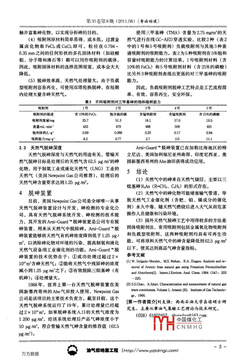 第30卷第8期(2011.08)〈專論綜述〉天然氣脫砷工藝劉支強(qiáng)'蔣洪'馬利21西南石油大學(xué)石油工程學(xué)院2中國(guó)石化天然氣川氣東送管道分公司摘要:天然氣中的砷來(lái)自天然氣儲(chǔ)層,主要以三烷基砷RAs(R=CH3、CH)的形式存在。天然氣中砷的危害主要體現(xiàn)在砷化物可能堵塞輸氣管道,導(dǎo)致天然氣工業(yè)催化劑永久中毒,其隨天然氣燃燒后進(jìn)入大氣從而危害操作人員健康和污染環(huán)境等。天然氣脫砷方法主要有溶液吸收法和固體吸附法兩種,最常用的固體吸附脫砷工藝包括金屬氧化物吸附劑脫砷工藝和負(fù)載型吸附劑脫砷,固體吸附脫砷工藝可將原料天然氣中的砷含量降低到625邸/m以下,使其達(dá)到商品氣砷含量指標(biāo)。關(guān)鍵詞:天然氣;砷;脫砷工藝;吸附劑;應(yīng)用doi:103969/ssn.1006-6896.2011.8001砷的來(lái)源與存在形式然界的無(wú)機(jī)砷和有機(jī)砷,自然界中砷的廣泛分布為天然氣中砷的來(lái)源提供了物質(zhì)基礎(chǔ)天然氣儲(chǔ)層中的砷最有可能來(lái)自古生物遺體中天然氣中的砷絕大多數(shù)以三烷基砷RAs(R的有機(jī)砷和微生物的代謝活動(dòng),也可能來(lái)自深層的CH3、CH)形式存在。天然氣中的砷化合物以地下水,還可能來(lái)源于細(xì)菌、微生物的代謝作用。CH)As形式存在的占5%~80%,其余的砷化合在高壓、高溫和還原環(huán)境等地質(zhì)條件下,海洋和湖物以(CH)AsCH5、CHAs(CHl2、As(CHb形式存泊中生物有機(jī)體內(nèi)的砷將經(jīng)歷一系列的烷基化、脫在叫。美國(guó)天然氣工藝研究所(IGT)在1993年使烷基作用和脫羥基作用,生成多種有機(jī)砷化合物。用氣相色譜-原子發(fā)射光譜法(GC-AED)對(duì)新墨在經(jīng)過(guò)一系列的演變后,有機(jī)砷化物(三甲基砷西哥州的不同氣井產(chǎn)出的天然氣進(jìn)行了砷的形態(tài)分等)就進(jìn)入天然氣。因此,天然氣中的砷來(lái)源于自析,相關(guān)結(jié)果見表1表1天然氣樣品中的揮發(fā)性砷化物樣品氣來(lái)源1號(hào)氣井2號(hào)氣井3號(hào)氣井4號(hào)氣井1號(hào)站總砷濃度/μgm3甲基砷(TMA)二甲基乙基砷(DMEA)形態(tài)分析/%丙基二甲基砷(PDMA)甲基二乙基砷(MDEA)652三乙基砷(TEA2砷的危害造成危害,可能引起急性中毒或慢性中毒。天然氣中砷化物將對(duì)工藝設(shè)備和操作人員健康產(chǎn)生危害,砷及其化合物均是有毒物質(zhì),根據(jù)《職業(yè)性接其主要危害形式如下:觸毒物危害程度分級(jí)(GB504-1985)》的規(guī)定1)與天然氣中HS等其他物質(zhì)反應(yīng)生成固體砷及其無(wú)機(jī)化合物的毒物危害程度分級(jí)是I級(jí)(極物質(zhì),一旦在天然氣管線中聚集就可能堵塞閥門和度危害)。對(duì)于長(zhǎng)期接觸含砷天然氣的工作人員,管道,對(duì)管道和工藝設(shè)備的安全運(yùn)行造成危害《工作場(chǎng)所有害因素職業(yè)接觸限值化學(xué)有害因素(2)砷及其化合物具有毒性,含砷天然氣作為(GBZ21-2007)》對(duì)砷及其無(wú)機(jī)化合物(按As燃?xì)馊紵螽a(chǎn)生毒性更大的氧化砷,危害人體健計(jì))的工作場(chǎng)所接觸限值作了規(guī)定,工作場(chǎng)所空氣康并污染環(huán)境。中砷及其化合物的時(shí)間加權(quán)平均容許濃度為001(3)含砷中國(guó)煤化工將導(dǎo)致工業(yè)mg/m3,短時(shí)間接觸容許濃度為002mg/m3催化劑(含CNMH永久中毒當(dāng)人體直接接觸含砷天然氣時(shí),將對(duì)人體健康從而增加了設(shè)奮停上時(shí)向和還仃繼費(fèi)用,直接影油氣團(tuán)地面工程(http://www.yqtdmgc.com)第30卷第8期(201.08)〈專論綜述〉響生產(chǎn)。砷化物;③吸附劑微粒擁有合適的比表面、合適的3脫砷方法形狀及合適的尺寸。該金屬氧化物吸附劑的再生工藝流程為:天然氣中砷的脫除方法主要有溶液吸收法和固(1)從再生塔底部通入含有自由氧的再生氣,體吸附法兩種。溶液吸收法是利用強(qiáng)氧化劑溶液將吸附砷部分地氧化成砷氧化物(如RAsO)(高錳酸或者其鹽類,硝酸或者過(guò)氧化物)對(duì)天然(2)從再生塔頂部通入含有H2O的水溶液(或氣的砷化合物進(jìn)行氧化,經(jīng)處理得到不可溶的環(huán)者其他一些合適的氧化劑),使其流過(guò)再生塔,以保、安全的砷酸鹽,從而脫除天然氣中的砷化合便分解砷化物,比如分解RAsO。物。其技術(shù)特點(diǎn)是氧化劑濃度影響脫砷深度,氧化(3)加熱被沖洗過(guò)的吸附材料,加熱溫度最好劑對(duì)鋼設(shè)備有較強(qiáng)的腐蝕作用,此工藝方法在工業(yè)在50~120℃,加熱時(shí)間在10min~10h之間(根化裝置中應(yīng)用較少。固體吸附法是利用固體吸附劑據(jù)吸附塔的實(shí)際尺寸和天然氣處理量?jī)?yōu)選參數(shù)對(duì)天然氣中砷化合物具有的較強(qiáng)物理、化學(xué)吸附能值),使吸附劑獲得再生;通過(guò)閥門切換,該再生力,從而脫除天然氣中的砷化物。固體吸附脫砷后塔可以在后續(xù)工藝中作為吸附塔再次使用??墒固烊粴庵械目偵楹啃∮?25gm3。其技術(shù)根據(jù)天然氣的實(shí)際含砷量及砷的存在形態(tài),采特點(diǎn)是砷脫除效果好,可同時(shí)脫除無(wú)機(jī)砷和有機(jī)用不同吸附劑的組合模式來(lái)脫砷是經(jīng)濟(jì)合理的。比砷,且吸附劑可回收利用。如,用含有 PbO/AL2O或 CuO/znO材料的第一吸附目前,國(guó)外天然氣脫砷工藝中用得較多的方法塔來(lái)脫除大