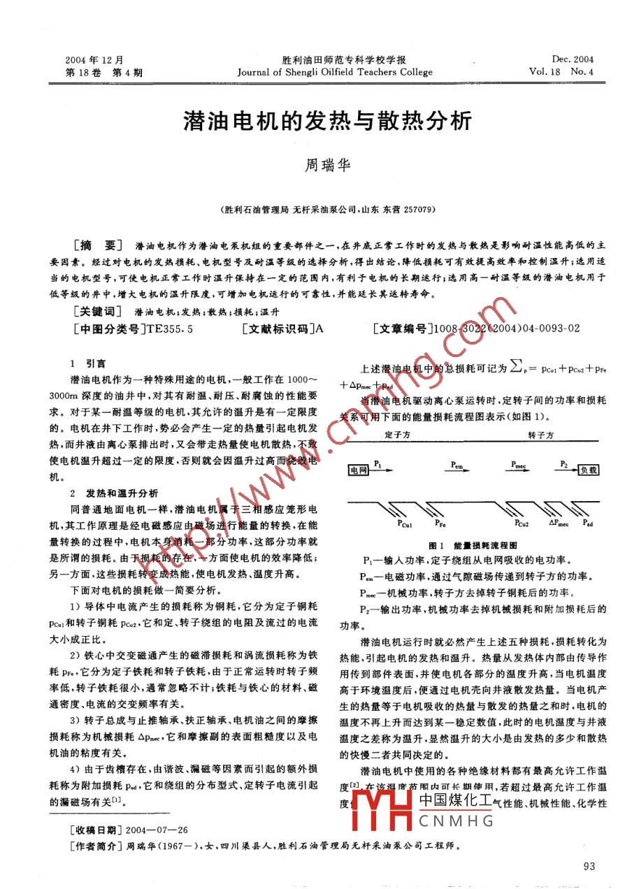 2004年12月勝利油田師范專科學校學報Dec.2004第18卷第4期Journal of Shengli Oilfield Teachers CollegeVol 18 No4潛油電機的發(fā)熱與散熱分析周瑞華(勝利石油管理局無桿采油泵公司山東東營257079)[摘要]潛油電杌作為潛油電泵機組的重要部件之一,在井底正常工作時的發(fā)熱與散熱是彩響耐溫性能高低的主要因素。經(jīng)過對電機的發(fā)熱損耗、電機型號及耐溫等級的選擇分析,得出結(jié)論,降低損耗可有效提高效率和控制溫升;選用適當?shù)碾姍C型號,可使電機正常工作時溫升保持在一定的范圍內(nèi),有利于電機的長期運行;選用高一耐溫等級的潛油電機用于低等級的井中,增大電機的溫升限度,可增加電機運行的可靠性,并能廷長其運轉(zhuǎn)壽[關(guān)鍵詞]潛油電機;發(fā)熱;散熱;損耗;溫升[中圖分類號]TE355.5[文獻標識碼]A[文章編號]1008-3022(2004)040093-02引言上述潛油電機中的總損耗可記為∑=pen+pe2+p潛油電機作為一種特殊用途的電機,一般工作在1000~+△pm+pnd3000m深度的油井中,對其有耐溫、耐壓、耐腐蝕的性能要當潛油電機驅(qū)動離心泵運轉(zhuǎn)時,定轉(zhuǎn)子間的功率和損耗求。對于某一耐溫等級的電機其允許的溫升是有一定限度關(guān)系可用下面的能量損耗流程圖表示(如圖1)的。電機在井下工作時,勢必會產(chǎn)生一定的熱量引起電機發(fā)熱,而井液由離心泵排出時,又會帶走熱量使電機散熱,不致使電機溫升超過一定的限度,否則就會因溫升過高而燒毀電電網(wǎng)負載2發(fā)熱和溫升分析同普通地面電機一樣,潛油電機屬于三相感應(yīng)籠形電機,其工作原理是經(jīng)電磁感應(yīng)由磁場進行能量的轉(zhuǎn)換,在能量轉(zhuǎn)換的過程中,電機本身消耗一部分功率,這部分功率就圖1能量損耗流程圖所謂的損耗。由于損耗的存在,一方面使電機的效率降低;P1-輸入功率,定子繞組從電網(wǎng)吸收的電功率另一方面,這些損耗轉(zhuǎn)變成熱能,使電機發(fā)熱、溫度升高。P-電磁功率,通過氣隙磁場傳遞到轉(zhuǎn)子方的功率。下面對電機的損耗做一簡要分析P-機械功率,轉(zhuǎn)子方去掉轉(zhuǎn)子銅耗后的功率1)導(dǎo)體中電流產(chǎn)生的損耗稱為鋼耗,它分為定子鋼耗P2一輸出功率,機械功率去掉機械損耗和附加損耗后的pca:和轉(zhuǎn)子銅耗po2,它和定、轉(zhuǎn)子繞組的電阻及流過的電流功率大小成正比潛油電機運行時就必然產(chǎn)生上述五種損耗,損耗轉(zhuǎn)化為2)鐵心中交變磁通產(chǎn)生的磁滯損耗和渦流損耗稱為鐵熱能,引起電機的發(fā)熱和溫升。熱量從發(fā)熱體內(nèi)部由傳導(dǎo)作耗pr它分為定子鐵耗和轉(zhuǎn)子鐵耗,由于正常運轉(zhuǎn)時轉(zhuǎn)子頻用傳到部件表面,并使電機各部分的溫度升高,當電機溫度率低,轉(zhuǎn)子鐵耗很小,通常忽略不計;鐵耗與鐵心的材料、磁高于環(huán)境溫度后,便通過電機殼向井液散發(fā)熱量。當電機產(chǎn)通密度、電流的交變頻率有關(guān)生的熱量等于電機吸收的熱量與散發(fā)的熱量之和時,電機的3)轉(zhuǎn)子總成與止推軸承、扶正軸承電機油之間的摩擦溫度不再上升而達到某一穩(wěn)定數(shù)值,此時的電機溫度與井液損耗稱為機械損耗△p,它和摩擦副的表面粗糙度以及電溫度之差稱為溫升,顯然溫升的大小是由發(fā)熱的多少和散熱機油的粘度有關(guān)。的快慢二者共同決定的4)由于齒槽存在,由諧波、漏磁等因素而引起的額外損潛油電機中使用的各種絕緣材料都有最高允許工作溫耗稱為附加損耗p它和繞組的分布型式、定轉(zhuǎn)子電流引起度[2唐范圍內(nèi)可長期伸用,若超過最高允許工作溫的漏磁場有關(guān)度中國煤化工氣性能、機械性能、化學性[收稿日期]2004-07—26CNMHG[作者簡介]周瑞華(1967—),女,四川渠縣人,勝利石油管理局無桿采油泵公司工程師第18卷勝利油田師范??茖W校學2004年第4期能破壞,使用壽命迅速縮短,嚴重時被燒毀,造成電機的損進入離心泵,由泵舉升井液至地面,從而帶走電機所產(chǎn)生的壞。電機的絕緣等級是由它采用的絕緣材料中耐熱等級最低熱量。當潛油電機欠載運行或因故障而使電機空載時,就會的材料決定的,國家標準規(guī)定了電機的五級絕緣等級,見下因熱量散發(fā)不出去而導(dǎo)致電機燒毀。下面對減少電機的發(fā)熱和加快散熱作探討。絕緣等級1)降低潛油電機的各種損耗Pca、poa2、P、△pas、ps定轉(zhuǎn)子銅耗主要與導(dǎo)體中的電流和電阻有關(guān)系,其中與電流最高允許溫度(℃)105120130155180的平方成正比。在電機設(shè)計時采用高電壓低電流技術(shù),可有理論和實踐證明,若工作溫度每超過A級絕緣極限溫度·效地降低電機銅耗;鐵耗主要與鐵心中的磁通密度、硅鋼片8℃(B級10℃,F級12C,H級14℃),絕緣材料的使用壽命的厚度和性能有關(guān),采用優(yōu)化設(shè)計的方法,選擇合適比例的就要縮短一半,這將嚴重影響整個電機的使用壽命。電磁負荷,提高硅鋼片的沖疊工藝水平,可有效地降低鐵耗;電機不同部件的結(jié)構(gòu)材料熱導(dǎo)率相差很大,且電機中有通過提高零部件的加工精度和整機的裝配質(zhì)量,減少摩擦系多個熱源,如繞組、鐵心,故實際電機的發(fā)熱過程是很復(fù)雜數(shù)降低機械損耗;采用近槽配合減少氣隙磁場的諧波含量的。為簡化分析并近似研究發(fā)熱規(guī)律和最后的溫升,作如下選用合適的槽