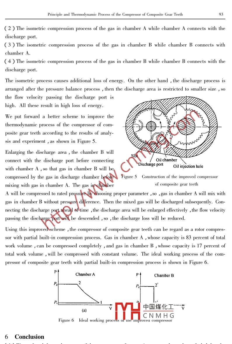 International Joumal of Plant Engineering and ManagementVol. 10 No.2June 2005Principle and Thermodynamic Process of the Compressorof Composite Gear TeethXIONG Wei , YU Xiao-ling , PENG Xue-yuan , FENG Quan-keSchool of Energy and Power Engineering , Xi' an Jiaotong University ,Xi'an , Shaanxi 710049 , P. R. ChinaAbstract : The compressor of composite gear teeth is a new type of rotor compressor with partial built-incompression process. Analysis of its thermodynamic process indicates that the built-in process is incom-plete. The thermodynamic process of the comupressor of composite gear teeth can be considered as fiveprocesses : the suction process , the isometric process , the compression process , the pressure-balanceprocess at high pressure and low pressure gas , and discharge process. Here ,it is necessary to explainfurther the pressure-balance process. The pressure-balance process is isometric process. It is found thatthe isometric process of gas in chamber A whose capacity is 83 percent of total work volume can be elim-inated basically through extending the discharge port to connect early the discharge port with the cham-ber B. By the above-mentioned method ,the loss of energy will be reduced.Key word : rotor compressor , pressure-balance , isometric process1 IntroductionThe gear pump is used extensively as a pumping-liquid mechanism. However , the gear pump trans-mits relatively lttle liquid in one rotation due to lttle inter-lobe area on the end face. For this prob-lem , Erich , proposed the mechanism of composite gear teeth in 19681. In the proposed mecha-nism , some of the small gear teeth are replaced by several big gear teeth respectively , correspond-ingly , some of the small grooves are replaced by several big grooves. By this way , the inter-lobe ca-pacity increases greatly ,resulting in high capacity transported in one rotation. The design refers to agear type rotary mechanism for transporting liquid , compressing and expending gas. It is composedof a case and a pair of gear-type rotors installed in the case. The driving shaft of the rotors is drivenby synchromesh gear which is installed out of the case for transmitting torque. In this design , thegear teeth do not contact with each other. Each gear includes several sets of small teeth and one ormore big teeth alternated with them.In fact , although the two rotors keep engaging with each other , they are out of actual metallic contactwith each other. Therefore , additional gears (中國煤化工be mounted out of thecase so as to drive the shaft of the rotor. Several kMYHC N M H Gned as the flank profileof the big teeth of the gear type rotor , without being the same as the small teeth. The effective areaused for fluid transferring by the rotors of the gear pump is greatly increased. Unfortunately , the seal .effect cannot be kept between the two big teeth , resulting in a great amount of backflow , thus the ef-Received 17 July 200490International Joumal of Plant Engineering and ManagementVol. 10 No.2June 2005ficiency of the fluid transmission is low , with nearly no function of compressing or expanding gas.The principle of an engaging rotor , proposed by Liao Zhenyf21 , in 1993 , resolved the transmissionof the gear composed of big gear teeth and small teeth. However , there are shortcomings in the prin-ciple , such as inflection point in the profile of the big teeth and imperfect seal. In the compressor ofcomposite gear teeth , suggested by Shen Jinfeng et al.C31 , in 1997 ,the inflection point between thebig teeth and the small teeth was eliminated , and the profile was replaced with none-symmetry pro-file to improve seal function. Subsequently , we carried out theoretic analysis and experiment of thiscompressor. An improved scheme was put forward according to the results of the theoretic analysisand experiment result.-Discharge pipe2 Construction of the prototype compressorDesigned for application in split type air conditioner , theprototype compressor which adopts hermetic upright con-Driving shaftostruction has the similar construction to a typical rotary air-Driven shaf修利主Discharge portconditioning compressor , except that it has two shafts , notDriving gc作期Upper capCylindersingle shaft. As shown in Figure 1. The manner of pumping Driven gear-oil in the lubricating system adapts differential pressureSuction pipeBottom cappumping and helical blade pumping consulting typical rota-ry air-conditioning compressor.Figure 1 Sctional view of the compressorThe compressor of composite gear teeth is composed of cyI-of composite gear teethinder , upper cap , bottom cap , driving gear and driven gear. As shown in Figure 2 ,a pair of en-gaged gear-type rotors is located in the cylinder , three big teeth are distributed evenly in circumfer-ential direction on the driving rotor , and three grooves on the driven rotor. A certain number of smallinvolute gear teeth on the two rotors are functioned as timing and torque transmission. The chambersurrounded by the three big teeth and grooves is used for gas compression. Evidently , the three bigteeth and grooves are also functioned as sealing and torque transmission.Suction portDriven gear ;中CylinderDChamber B1 Driving gearDischarge portChamber Aa)b)Figure2 Working principle of中國煤化工h”YHCNMHGThe suction port is so constructed that the inlet gas is drawn into the working chamber through thecylinder approximately in radial direction. The discharge port is arranged axially in the end plate.It is obvious that , compared with most of other positive displacement compressors , the compressor ofcomposite gear teeth has the advantages as below :Principle and Thermodynamic Process of the Compressor of Composite Gear Teeth9( 1 ) The compressor is composed of 5 parts :a pair of rotors , the case , the upper cap and the bottom .cap. Therefore , its construction is simple.(2 ) The inertia force of the compressor can be cancelled out completely. As a result , the compres-sor is alwa