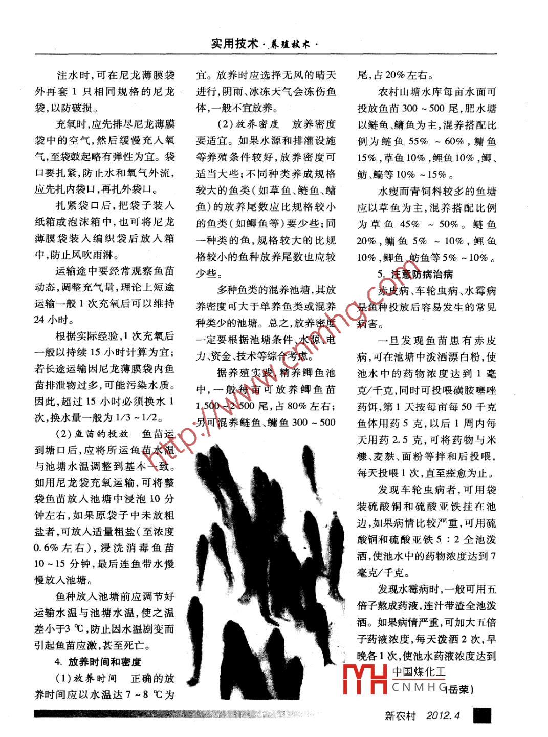 實用技術(shù).養(yǎng)殖技術(shù)●注水時,可在尼龍薄膜袋宜。放養(yǎng)時應(yīng)選擇無風(fēng)的晴天尾,占20%左右。外再套1只相同規(guī)格的尼龍進行,陰雨、冰凍天氣會凍傷魚農(nóng)村山塘水庫每畝水面可袋,以防破損。.體,-般不宜放養(yǎng)。投放魚苗300 ~ 500尾,肥水塘充氧時,應(yīng)先排盡尼龍薄膜(2)放養(yǎng)密度放養(yǎng) 密度以鰱魚.鱅魚為主,混養(yǎng)搭配比袋中的空氣,然后緩慢充人氧要適宜。如果水源和排灌設(shè)施例為鰱魚55%~60%,鳙魚氣,至袋鼓起略有彈性為宜。袋等養(yǎng)殖條件較好,放養(yǎng)密度可15%,草魚10%,鯉魚10%,鯽、口要扎緊,防止水和氧氣外流,適當(dāng)大些;不同種類養(yǎng)成規(guī)格魴、鳊等10% ~15%。應(yīng)先扎內(nèi)袋口,再扎外袋口。.較大的魚類(如草魚、鰱魚、鳙水瘦而青飼料較多的魚塘扎緊袋口后,把袋子裝人魚)的放養(yǎng)尾數(shù)應(yīng)比規(guī)格較小應(yīng)以草魚為主,混養(yǎng)搭配比例紙箱或泡沫箱中,也可將尼龍的魚類(如鯽魚等)要少些;同為草魚45% ~ 50%。鰱魚薄膜袋裝人編織袋后放人箱-種類的魚,規(guī)格較大的比規(guī)20%,鳙魚5%~10%,鯉魚中,防止風(fēng)吹雨淋。格較小的魚種放養(yǎng)尾數(shù)也應(yīng)較10%,鯽魚、魴魚等5%~10%。運輸途中要經(jīng)常觀察魚苗少些。5.注意防病治病動態(tài),調(diào)整充氣量,理論上短途多種魚類的混養(yǎng)池塘,其放赤皮病、車輪蟲病、水霉病運輸-般1次充氧后可以維持養(yǎng)密度可大于單養(yǎng)魚類或混養(yǎng)是魚種投放后容易發(fā)生的常見24小時。種類少的池塘??傊?放養(yǎng)密度病害。根據(jù)實際經(jīng)驗,1次充氧后-定要根據(jù)池塘條件、水源、電一旦發(fā)現(xiàn)魚苗患有赤皮一般以持續(xù)15小時計算為宜;力資金、技術(shù)等綜合考慮。病,可在池塘中潑灑漂白粉,使若長途運輸因尼龍薄膜袋內(nèi)魚據(jù)養(yǎng)殖實踐,精養(yǎng)鯽魚池池水中的藥物濃度達(dá)到1毫苗排泄物過多,可能污染水質(zhì)。中,一般每畝可放養(yǎng)鯽魚苗克/千克,同時可投喂磺胺噻唑因此,超過15小時必須換水11 500~2 500尾,占80%左右;藥餌,第1天按每畝每50千克次,換水量- -般為1/3 ~1/2。另可混養(yǎng)鰱魚、鳙魚300~500魚體用藥5克,以后1周內(nèi)每(2)魚苗的投放魚苗運天用藥2.5克,可將藥物與米到塘口后,應(yīng)將所運魚苗水溫糠、麥麩、面粉等拌和后投喂,與池塘水溫調(diào)整到基本--致。每天投喂1次,直至痊愈為止。如用尼龍袋充氧運輸,可將整發(fā)現(xiàn)車輪蟲病者,可用袋袋魚苗放人池塘中浸泡10分裝硫酸銅和硫酸亞鐵掛在池鐘左右,如果原袋子中未放粗邊,如果病情比較嚴(yán)重,可用硫鹽者,可放人適量粗鹽(至濃度酸銅和硫酸亞鐵5 : 2全池潑0.6%左右),浸洗消毒魚苗灑,使池水中的藥物濃度達(dá)到710~15分鐘,最后連魚帶水慢.毫克/千克。慢放人池塘。發(fā)現(xiàn)水霉病時,一-般可用五魚種放人池塘前應(yīng)調(diào)節(jié)好倍子熬成藥液,連汁帶渣全池潑運輸水溫與池塘水溫,使之溫灑。如果病情嚴(yán)重,可加大五倍差小于3 C,防止因水溫劇變而子藥液濃度,每天潑灑2次,早引起魚苗應(yīng)激,甚至死亡。晚各1次,使池水藥液濃度達(dá)到4.放養(yǎng)時間和密度中國煤化工(1)放養(yǎng)時間 正確的放YHCN MH G岳榮)養(yǎng)時間應(yīng)以水溫達(dá)7~8C為新農(nóng)村2012.4.