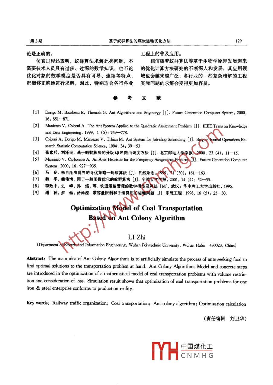 第25卷,第3期中國(guó)鐵道科學(xué)Vol.25 No.30022004年6月CHINA RAILWAY SCIENCEJune, 2004文章編號(hào): 1001-4632 (2004) 03-0126-04基于蟻群算法的煤炭運(yùn)輸優(yōu)化方法李智(武漢工業(yè)學(xué)院電氣信息工程系,湖北武漢430023)摘要: 蟻群算法是指通過人工模擬螞蟻搜索食物的過程來求解運(yùn)輸優(yōu)化問題的一種算法。給出蟻群算法模型及算法步驟。研究- -種帶容限制和考慮損耗的煤炭運(yùn)輸數(shù)學(xué)模型的優(yōu)化計(jì)算,并給出算法步驟。運(yùn)用蟻群算法對(duì)某- -鋼鐵企業(yè)煤埃運(yùn)輸問題進(jìn)行優(yōu)化計(jì)算,計(jì)算結(jié)果符合實(shí)際生產(chǎn)情況。關(guān)鍵詞:鐵路運(yùn)輸組織;煤炭運(yùn)輸;蟻群算法;優(yōu)化計(jì)算中圈分類號(hào): U294.15: TP18文獻(xiàn)標(biāo)識(shí)碼: A力,不僅利用了正反饋原理,在一定程度上加快了1引言進(jìn)程的速度,而且是一種本質(zhì)并行的算法,不同個(gè)體之間不斷進(jìn)行著信息交流和傳遞,從而能夠相互人工螞蟻算法是受到人們對(duì)自然界中真實(shí)螞蟻協(xié)作,有利于發(fā)現(xiàn)較好的解。群體行為的研究成果的啟發(fā)而提出的一種基于種群的模擬進(jìn)化算法,屬于隨機(jī)搜索算法的-種。最早2蟻群算法由意大利學(xué)者M(jìn).Dorigo 等人提出,在充分利用螞蟻群體搜索食物的過程和著名的旅行商問題2.1 蚊群算法原理”(TSP)之間的相似性,通過人工模擬螞蟻搜索食自然界螞蟻群體協(xié)作行為主要包括:在沒有任物的過程求解TSP問題,獲得了成功,故稱之為何外界指導(dǎo)信息的情況下,螞蟻群體總是能找到從“人工蟻群算法”,簡(jiǎn)稱“蟻群算法”1。在隨后的食物源到巢穴的最短路徑;蟻群中個(gè)體從事不同的研究中,又成功地將螞蟻算法應(yīng)用于二次分配問勞動(dòng),群體可以很好地完成個(gè)體的勞動(dòng)分工;蟻群題[2]、Job-shop調(diào)度問題[3]、網(wǎng)絡(luò)動(dòng)態(tài)路由優(yōu)化4]、中死去螞蟻的個(gè)體可以聚集在一-起,形成相對(duì)較大信帶頻率分配問題[fs!等的求解。的墳?zāi)?。受這些螞蟻群體行為的啟迪,Dorigo 等人蟻群算法是一種隨機(jī)搜索算法,與遺傳算法、提出了幾類不同的螞蟻算法模型。其中,對(duì)螞蟻群模擬退火算法等模擬進(jìn)化算法-樣,通過候選解組體總是能找到從食物源到巢穴的最短路徑這種情況成的群體在進(jìn)化過程來尋求最優(yōu)解6),具有以下特而抽象建立的算法模型被稱為螞蟻系統(tǒng)。理論和實(shí)點(diǎn)。踐上都證明這種算法模型對(duì)求解組合優(yōu)化問題效果(1)較強(qiáng)的魯櫸性:對(duì)基本蟻群算法模型稍加良好,下面說明螞蟻系統(tǒng)的生物原型一真實(shí)螞蟻修改,即可應(yīng)用于其它問題的求解。群體的工作原理。(2)分布式計(jì)算:蟻群算法是一種基于種群的研究表明,自然界螞蟻尋找到從巢穴到食物源算法,具有并行性。的最短路徑是通過一種正反饋的機(jī)制實(shí)現(xiàn)的,單個(gè)(3)易于與其它的方法相結(jié)合:蟻群算法很容螞蟻在自己行走的路徑下留下一種揮發(fā)性分泌物,易與其它的啟發(fā)式算法相結(jié)合,以改善算法的性稱之為信息激素,后來的螞蟻根據(jù)前進(jìn)道路上信息能。數(shù)量的多少選擇前進(jìn)方向,在經(jīng)過一個(gè)長(zhǎng)的過程諸多研究表明,蟻群算法具有很強(qiáng)的尋優(yōu)能中國(guó)煤化工息激素的量變得較收稿日期: 2003-07-11作者簡(jiǎn)介:李智(1964-), 男,湖北武漢人,博士研究生,副教授。fYHCNMHG第3期基于蟻群算法的煤炭運(yùn)輸優(yōu)化方法27大,而螞蟻越來越多地集中在信息激素量較大的路Or,= Q/L,(3)徑上,從而找到了- -條最短路徑。Ot,表示第j只在本次循環(huán)中吸引強(qiáng)度的增加;螞蟻行為的實(shí)質(zhì)是簡(jiǎn)單個(gè)體的自組織行為體現(xiàn)Q為正常數(shù),其范圍0< Q< 10 000; L,表示本次出來的群體行為,每個(gè)螞蟻行為對(duì)環(huán)境產(chǎn)生影響,循環(huán)中f(x)的增量,定義為f(x+r)-f(x);0≤環(huán)境的改變進(jìn)而對(duì)蟻群行為產(chǎn)生控制壓力,影響其ρ≤1, 體現(xiàn)強(qiáng)度的持久性。于是,函數(shù)f(x)的尋他螞蟻的行為。通過這種機(jī)制,簡(jiǎn)單的螞蟻個(gè)體可優(yōu)就借助m個(gè)螞蟻的不斷移動(dòng)來進(jìn)行:當(dāng)η≥0以相互影響,相互協(xié)作,完成- -些復(fù)雜的任務(wù)。時(shí),螞蟻i按概率p。從其鄰城i移至螞蟻j的鄰域;自組織使得螞蟻群體的行為趨向結(jié)構(gòu)化,其原當(dāng)η≤0時(shí),螞蟻i做鄰域搜索(搜索半徑或步長(zhǎng)為因就是包含了一個(gè)反饋的過程,這也是螞蟻算法最r),即每個(gè)螞蟻要么轉(zhuǎn)移至其他螞蟻處,要么進(jìn)行重要的特征。正反饋是系統(tǒng)演化發(fā)展的原因,這個(gè)鄰域搜索。過程利用了全局信息作為反饋,通過對(duì)系統(tǒng)演化過由此可見,當(dāng)螞蟻的數(shù)量足夠多,搜索半徑足程中較優(yōu)解的自增強(qiáng)作用,使得問題的解向著全局夠小,這種尋優(yōu)方式相當(dāng)于一群螞蟻對(duì)定義區(qū)間最優(yōu)的方向不斷進(jìn)化,最終能有效地獲得相對(duì)較優(yōu)[a, b]做窮盡的搜索,逐漸收斂到問題的全局最的解。優(yōu)解。2.2蚊群算法模型及其實(shí)現(xiàn)上述函數(shù)優(yōu)化過程不受優(yōu)化函數(shù)是