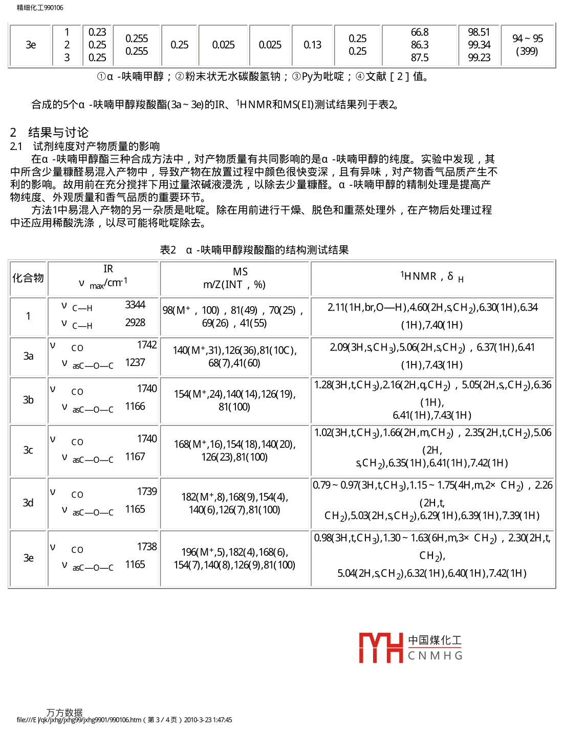 精細(xì)化工990105精細(xì)化工舊數(shù)據(jù)資源系統(tǒng)FINE CHEMICALS數(shù)亨化期刊DIGITIZED PERIODICAL1999年第16卷第1期Vo!16No.11999α-呋喃甲醇羧酸酯的合成研究姚立紅蘇長(zhǎng)安鄧敏劉春景胡予敏趙虹摘要:以α-呋喃甲醇為基本原料,通過(guò)(1)吡啶/酰氯、(2)4二甲氨基吡啶/酸酐/無(wú)水碳酸氫鈉、(3)4吡咯烷基吡啶/酸酐/無(wú)水碳酸氫鈉三種方法,分別合成了α-呋喃甲醇的乙酸酯、丙酸酯、丁酸酯、戊酸酯和己酸酯。結(jié)果表明:方法2和3中各產(chǎn)物的收率比方法1約高7%~20%;方法2和3中產(chǎn)物收率和含量相近,收率868%~945%,含量均高于9%。所合成的5個(gè)α-呋喃甲醇酯的香氣特征為帶有輕微甜香的水果芳香。關(guān)鍵詞:α-呋喃甲醇羧酸酯;φ二甲氨基吡啶;ψ吡咯烷基吡啶;合成;香料分類號(hào):TQ655文獻(xiàn)標(biāo)識(shí)碼:A文章編號(hào):1003-5214(19901-0016-19Synthesis of a-Furfuryl CarboxylatesYAO Lihong, SU Chang'an, DENG Min!, LIU Chunjing, HU Yumin2, ZHAO Hong2I Institue of Chemistry and Engineering, Liaoning Univesity, Shenyang, China 110036R/D Center of Photographic Materials of the Ministry of Chemical Industry, Shenyang, China 110015Abstract: The five a-furfuryl carboxylates (i.e, acetate, propionate, butyrate, valerate and hexanoate)weresynthesized separately from a-furfuryl alcohol by the following three methods: 1) acyl chlorides/pyridine; (2)4-dimethylaminopyridine/carboxylic anhydrides/sodium hydrogen carbonate anhydrous; 3)4-pyrrolidinopyridine/carboxylic anhydrides/sodium hydrogen carbonate anhydrous. The results indicated that the yields of the five afurfuryl esters in the method 2 and 3 are higher by about 7% to 20%than the method 1, and the yields and puritiesof the above five esters in the method 2 are similar to the method 3 (yields: 86. 8% to 94.5%0; purities: >99%).Theflavor characteristics of the five a-furfuryl esters are fruity aromatic odor with light sweetKey words: a-furfuryl carboxylate; 4-dimethylaminopyridine 4-pyrrolidinopyridine; synthesis; flavorPaper No:1003-5214(1999)010016-19Foundation item: Granted by the education committee scientific research funds of liaoning province(960132088)Granted by the natural science funds of liaoning province (962208)近年已研究開(kāi)發(fā)岀一系列以水果香型為主要特征的α-呋喃甲醇羧酸酯類香料,可作香味修飾及增香劑用于食品、飲料、化妝品[1,2]。作者合成的5個(gè)α-呋喃甲醇羧酸酯在許多天然食品中均存在[3],某些品種已用作食品調(diào)香原料[4]。該系列香料研究開(kāi)發(fā)的關(guān)鍵是選擇合適的工藝路線、提高產(chǎn)物的收率和香氣品質(zhì)。文獻(xiàn)[2]以吡啶作催化劑,通過(guò)酰氯進(jìn)行酯化。由于酰氯本身不穩(wěn)定,產(chǎn)物收率受其影響較大,加之很難將混入產(chǎn)物中的微量吡啶除凈,故產(chǎn)物收率和香氣品質(zhì)都不理想。作者分別探索了用4吡咯烷基吡啶(PPY)和4二甲氨基吡啶(DMA門)作催化劑,以粉末狀無(wú)水碳酸氫鈉作縛酸劑,用酸酐作?;噭?合成α-呋喃甲醇羧酸酯,并與吡啶酰氯法進(jìn)行了比較。合成反應(yīng)如下O籽+(RO)2O-DMP或YaHO, PrCHCHO-C-R中國(guó)煤化工(1)(3)CNMHGR=CH3(a), C2H5(b),n-C3H,c), n-C4H(d), n-C5HM(e)fle∥Eyqk/ xhg/jxhg 9/jxhg9901/990106hm(第1/4頁(yè))20103231:4745精細(xì)化工990105實(shí)驗(yàn)1.1儀器與試劑PE983G型紅外光譜儀(液膜法); Brukerac-250E型超導(dǎo)T核磁共振儀(CDCl3作溶劑,TMS作內(nèi)標(biāo))VG加0-sE型高分辨質(zhì)譜儀(EI);島津GC-16A型氣相色譜儀(面積歸一法定量)。酸酐均為分析純(用前經(jīng)重蒸);分析純無(wú)水碳酸氫鈉經(jīng)干燥和研磨;分析純吡啶經(jīng)干燥脫色及重蒸;酰氯由相應(yīng)旳分析純羧酸和氯化亞砜反應(yīng)制取(用前經(jīng)重蒸);α-呋喃甲醇通過(guò)糠醛的c?ηηiz?ro反應(yīng)制取(用前在充分?jǐn)嚢柘掠?MNaOH)=25‰%的溶液浸洗后,再經(jīng)重蒸)。其它試劑均為分析純。4吡咯烷基吡啶(正己烷中重結(jié)晶,無(wú)色或微黃色晶體,熔點(diǎn)57-58℃·,溶解度10g/100 ml meOh)和4甲氨基吡啶(乙酸乙酯中重結(jié)晶,無(wú)色或微黃色晶體,熔點(diǎn)112-113°℃)分別按文獻(xiàn)[5]方法合成。1.2α-呋喃甲醇羧酸酯的合成1.21α-呋喃甲醇乙酸酯(3)的合成211方法1[2]在干燥的反應(yīng)瓶中加入20m(0.23moα-呋喃甲醇、20m(0.25mo吡啶,攪拌下于沸水浴中加熱至50℃,于30~40min內(nèi)滴加93m103g0.13mo乙酰氯,繼續(xù)攪拌3。冷卻后將反應(yīng)液傾入30m冰水中分岀油層,水層每次用40m苯萃取,共3次。合并有機(jī)相,依次用wHC)=5%的鹽酸和飽和氯化鈉溶液洗滌,用無(wú)水硫酸鈉干燥。蒸除苯后,減壓蒸餾收集68~π0℃/933P?餾分,得淡黃色清亮液體;再次精餾收集69~70℃C/93Pa餾分,得微黃色清亮液體147g,收率80.8%,含量98.30%。121.2方法2在干燥的反應(yīng)瓶中依次加入25.5g(025mo)乙酸酐、3.05g(0025mo)4二甲氨基吡啶、250m甲苯、24.5g025mo)α-呋喃甲醇和23g(0.25mo粉末狀無(wú)水碳酸氬鈉,充分?jǐn)嚢柘掠谑覝胤磻?yīng)3h后,加熱回流至分水器中無(wú)水珠生成。冷卻后濾除固體物,并用少許甲苯浸洗固體。將濾液傾入300m冰水中,分岀油層,水層每次用50ml甲苯萃取,共3次。合并油層,用飽和食鹽水洗至中性,用無(wú)水硫酸鈉干燥。蒸除甲苯后減壓蒸餾收集68~π0℃/933Pa餾分,得微黃色液體;再次精餾收集69-η0°c⑨33?餾分,得無(wú)色清亮液體325g,收率929%,含量9904%1213方法3用3g(025mo4吡咯烷基吡啶作催化劑,其它試劑及用量、反應(yīng)條件、操作方法均與方法2相同。得無(wú)色清