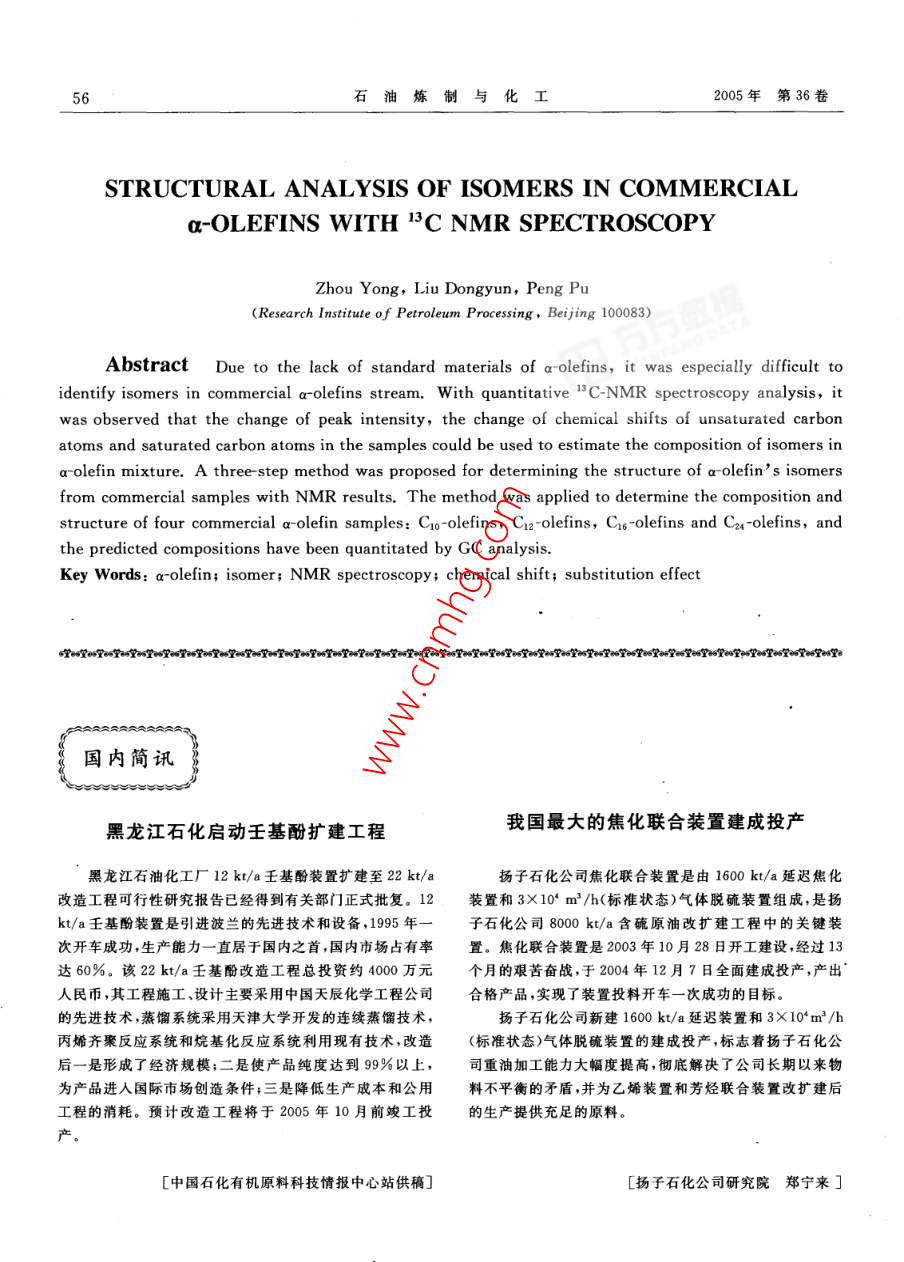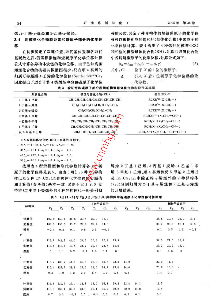 石油煉制與化工2005年5月PETROLEUM PROCESSING AND PETROCHEMICALS第36卷第5期工業(yè)a-烯烴中異構體結構的核磁共振分析周勇,劉冬云,彭樸(石油化工科學研究院,北京100083)摘要針對已知結構a烯烴的標準譜圖缺少的問題,提出了歸屬工業(yè)a烯烴中異構體的核磁共振碳譜的“三步法”,即按強度把各譜峰歸屬給各組分;按雙鍵碳原子化學位移加和規(guī)律歸屬各組分的不飽和碳原子,初步確定各組分結構;根據(jù)雙鍵對飽和碳原子化學位移的取代效應計算烷鏈碳原子的化學位移,佐證各組分的結構。通過對4種工業(yè)a烯烴樣品Cro,Ci,C和Ci的組成和各組分結構的測定實例說明該方法可行。關鍵詞:a烯烴異構體核磁共振譜法化學位移取代效應樣品配制:在5mm玻璃樣品管中加入50mg樣a-烯烴是基本的石油化工原料,是生產線型聚品,0.5mL CDCIs ,20 mmol弛豫試劑Cr(AcAc)s ,將烯烴必不可少的共聚單體,還可以用來生產洗滌管帽封嚴后待用。劑:潤滑劑和增塑劑等。C.~C;的a烯烴用來生定量核磁共振碳譜測試參數(shù):共振頻率產乙烯共聚物,Co的ar烯烴聚合后作高級潤滑油125. 683 MHz,脈沖寬度3. 8 μs(傾倒角45*),延遲基礎油,C。~Co的a烯烴制備增塑劑醇,Cio~C.時間3s,累積采樣次數(shù)1 000次。數(shù)據(jù)處理參數(shù):的a烯烴制備洗滌劑醇,Cx~Cis的ar烯烴制備表加權函數(shù)LB=3。面活性劑”。DEPT核磁共振碳譜測試參數(shù):共振頻率a烯烴的來源很多,一般均按碳數(shù)分成牌號不125. 683 MHz,脈沖寬度:H; PWox=15. 1 μs,同的產品,碳數(shù)相同的異構體,由于沸點相近很難PW80x= 30.2 μs,PWe =22.6 μs(θ為135*);"C:分離。一般工業(yè)a烯烴均是以正構a烯烴為主的PWox=7.7 μs,PW8o,=15.4 μs,延遲時間1s,累積混合物。正構a烯烴以外的異構體含量可以用氣采樣次數(shù) 100次。數(shù)據(jù)處理參數(shù):加權函數(shù)LB=3。相色譜法測定,但由于a-烯烴標樣很少,各異構體2.3 氣相色譜結構很難確定。用核磁共振碳譜法可以測定a-烯色譜柱:HP-PONA柱50mX0.2mmX烴中每個碳原子的化學位移(譜峰位置) ,但同樣由0.5μm;溫度:進樣口250C,檢測器300'C;柱溫條于已知標樣少,很難歸屬各碳原子。本研究根據(jù)譜件:以2C/min的升溫速率從35C升至180C;柱峰強度、不飽和碳原子化學位移加和規(guī)律和飽和碳前壓86. 2kPa,分流比150: 1,進樣量0.5uL。原子化學位移加和規(guī)律來歸屬組成不是十分復雜3結果與討論的未知a烯烴異構體,介紹了用該方法歸屬工業(yè)工業(yè)a烯烴Co,Ciz,C%。和Ca的定量a烯烴樣品Co,Cr,C16,Cu中各異構體結構的實1C-NMR譜見圖1(sp2碳原子譜區(qū)的化學位移δ為105~155;sp’碳原子譜區(qū)的化學位移δ為10~例。45)。由圖1可知Cro的組成很復雜,而Ciz,C%,Ca的組成相對簡單。另外結合DEPT 1C-NMR2.1工業(yè) a-烯烴樣品Cro :工業(yè)品,取自燕山石化化工二廠;Cz:工譜(圖略), 108~116的譜峰歸屬為a烯烴雙鍵業(yè)品,購自愛格富集團公司;Ci:工業(yè)品,購自愛格收稿日期:2004-10-29;修改稿收到日期:2004-12-20.富集團公司;Ca :工業(yè)品,購自三菱化成株式會社。作者簡介:周勇,工學碩士,工程師,2000年畢業(yè)于石油化工科2.2核磁共振碳譜學研究院應用化學專業(yè)。現(xiàn)從事催化重整及異構化方面的分500核T5土振沽遵心第5期周勇等.工業(yè)a烯烴中異構體結構的核磁共振分析53表2正構a-烯烴以外異構體的'C-NMR譜峰化學位移譜峰異構體碳原子類型CH:= -。-仲碳仲碳仲碳 伯碳化學位移108. 3150. 335. 729. 922.4 14.0譜峰強度1.10.2.242.342.30.CH2=一CH=叔碳伯伯碳113.8143. 643.834.729.322.714.037.220.213.93. 403.243. 343. 453.323.25CH2= - CH=115.4 137. 738. 837. 632.528. 923.05.610.82.712.552.642.70.2.66CH2- - - CH=仲碳 仲碳 仲碳113.9 139.431.336.136.529. 22.919, 44.38 4. 334.62.4.424.60CH= -CH≈ 仲碳13.729.2129. 7130. 226. 829. 331.22.6諧峰強度0.500.490.55伯碳-CH= -CH=叔碳仲碳仲伯碳伯碳17.8 125. 6130. 040.133.122.14.019. 3“譜峰強度0.52 0.47 0. 45.0.520.470. 51CH2= _ c-仲碳仲碳仲碳仲碳仲碳27.9 29.4 29.6 31.9 22. 714. 10.51 0. 47CH2= _ c_仲碳.仲碳仲碳仲碳仲碳仲碳伯碳仲碳伯碳107.3 151. 536. 327.929.429.631.922.7 , 14.129.2 12.0.24o, 24S- 校正因子。烯烴為順式結構時,S=δ' ββδ-1.2;烯烴雙鍵被測碳原子相鄰側的aA,-取代參數(shù) a=11.0,β=6.0,r= -1.0,8位碳原子為烷基雙取代時,S=-4.8;烯=0.7,p'=-7.1,r'=-1.9,8'=1.5,烴雙鍵被測碳原子相隔側的β位碳原子e=0.2。為烷基雙取代時,S=1.2。表3 C=C的核磁共振碳譜歸屬雙鍵位置取代基類型取代基位置CH2=(-CH=)的化學位移=CH-(= C -)的化學位移計算實測誤差1位丁基2位107.9108.3-0.4150. 6150. 30.3丙基3位144.7143.61.1乙基4位115.7115.4138. 7137.71.0甲基5位114.6113.90.7139.7139.4順-4位129. 6129.7-0.1130. 3.1反-2位127.3125.61.7130. 9130.0.9-0.5150.6150. 10.5106. 6107.3-0.7151. 1151. 5由表3可知,根據(jù)不飽和碳原子化學位移加和可將6種C%異構體和2種Cz,C1 ,Ci異構體分規(guī)律得出的計算值與實測值最大誤差為1.7,數(shù)值別歸屬為2-丁基-1-己烯、3-丙基1-庚烯、4-乙基-1-基本-一致。由雙鍵位置、取代基類型和取代基位置辛烯、5-甲基-1-千烯、順-4-癸烯和反-5-甲基-2-千54石油煉制與化工2005年第36卷烯、2-丁基-a-烯烴和2-乙基-a-烯烴。移的公式,其余7種異構體的烷鏈碳原子的化學位3.4用模型化合物驗證飽和碳原子部分的化學位移可以根據(jù)相應的飽和烴(母體化合物)中碳原子的移化學位移計算。表4給出了4種烯烴的模型(RX)在初步確定了雙鍵位置、取代基位置和各取代和相應的