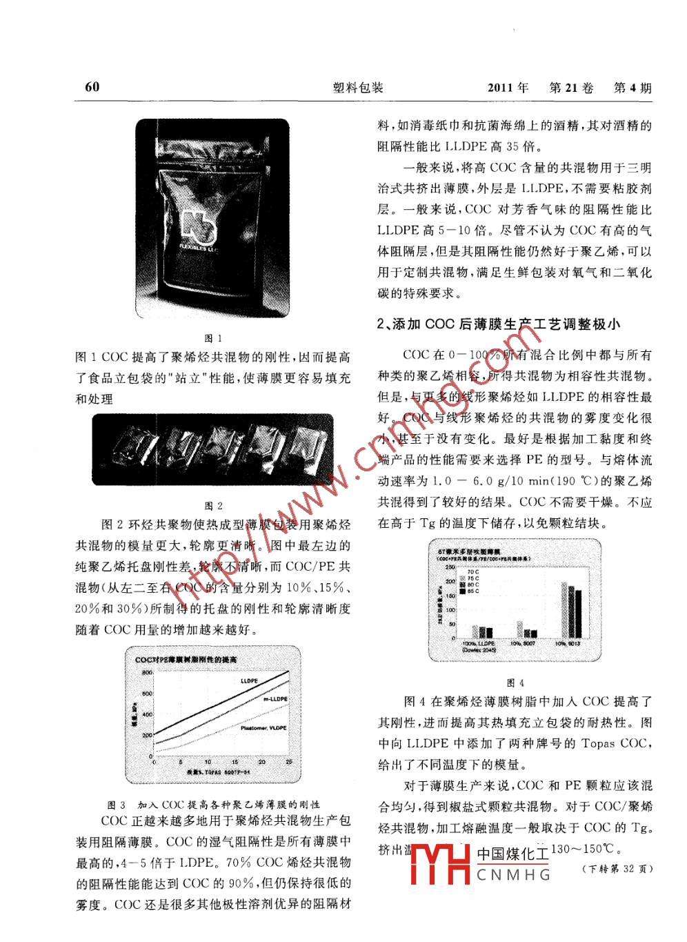 2011年第21卷第4期塑料包裝譯文選集環(huán)烴共聚物提高了簿膜包裝用聚烯烴共混物的性能張玉霞!劉偉2譯(1北京工商大學(xué)輕工業(yè)塑料加工應(yīng)用研究所2北京工商大學(xué)材料與機(jī)械工程學(xué)院)環(huán)烴共聚物(COC)是非結(jié)晶性熱塑性塑料,COC添加到 LLDPE中后,能將其模量增加一倍,在醫(yī)藥、消費(fèi)和工業(yè)領(lǐng)域用聚烯烴包裝薄膜中作甚至是2倍,而霧度保持不變。不論是在單層薄為共混材料的用量在不斷增加。環(huán)烴共聚物本身膜還是在共擠多層薄膜中, LLDPE/COC共混物透明度高,阻隔性能優(yōu)異,剛度和強(qiáng)度髙,生物降薄膜都可以更薄,但性能保持不變,成本降低。解性優(yōu)異,在醫(yī)療器械、食品藥品包裝和光學(xué)與電對(duì)于玻璃化轉(zhuǎn)變溫度更高的COC,模量提高子器件等領(lǐng)域廣泛應(yīng)用。在聚烯烴共混物中,環(huán)能一直維持到溫度接近Tg,這樣就提高了薄膜的烴共聚物提高塑料袋、立包袋、托盤等熱成型產(chǎn)品熱灌裝性和高溫性能。要記住的重要一點(diǎn)是將的模量、耐熱性和阻隔性。COC加到 LLDPE中后大大降低了其 ElmendorfTopas環(huán)烴共聚物是茂金屬乙烯和降冰片烯撕裂強(qiáng)度,尤其是縱向方向,即使是在薄膜的沖擊共聚物其玻璃化轉(zhuǎn)變溫度在33~180℃,具體取性能也得到提高時(shí)。COC在商業(yè)上用作可控的線決于共聚單體的比例。作為非結(jié)晶性聚合物,環(huán)性撕裂添加劑。此外,很多烯烴/COC薄膜在商業(yè)烴共聚物沒(méi)有結(jié)晶熔點(diǎn),而是在玻璃化轉(zhuǎn)變溫度上用于熱成型,COC的無(wú)定形性質(zhì)提高了熱成型以上開(kāi)始軟化。這種無(wú)色、品狀透明的材料與通的均勻性,深拉截面和角的厚度能夠得到更好的用聚乙烯具有很好的相容性,其與高線性聚乙烯控制如線性低密度聚乙烯的相容性最大,但是相比而LLDPE/COC也是熱封薄膜的一個(gè)很好選言,與低密度聚乙烯和高密度聚乙烯的稍差,僅達(dá)擇。熱封性能由熱封強(qiáng)度、熱粘強(qiáng)度和熱封起始到可以接受的程度。 Topas先進(jìn)聚合物公司生產(chǎn)溫度表征。COC共混物模量的增加一般能將熱封的用于烯烴共混物的環(huán)烴聚合物牌號(hào)有 Topas強(qiáng)度提高10%~20%。隨著冷卻的進(jìn)行,COC迅9903D-10(Tg為33℃), Topas9506F-04(Tg速?gòu)腡g以上的橡膠態(tài)轉(zhuǎn)變成Tg以下的高模量為6℃)和Top800F-04(Tg為738℃),其態(tài)。這種突變一般能將熱粘強(qiáng)度(冷卻0.1s后的高玻璃化轉(zhuǎn)變溫度這一優(yōu)勢(shì)用于特殊產(chǎn)品的生熱封強(qiáng)度)提高多達(dá)10%。熱粘強(qiáng)度對(duì)于立式成產(chǎn),也有用于提高薄膜的耐熱性。型/灌裝/封合T藝來(lái)說(shuō)十分重要,因?yàn)樵谶@種T藝中,是在熱封材料仍然處于熱態(tài)時(shí)就將包裝物1、cOC的高剛性可使薄膜減薄放入其中中國(guó)煤化工堤高了立包袋COC最常用作共混組分,提高單層薄膜的模的“站立”性CNMHG量,減小薄膜厚度。將模量為2.1GPa的10%的60塑料包裝2011年第21卷第4期料,如消毒紙巾和抗菌海綿上的酒精,其對(duì)酒精的阻隔性能比 LLDPE高35倍。般來(lái)說(shuō),將高COC含量的共混物用于三明治式共擠出薄膜,外層是 LLDPE,不需要粘膠劑層。一般來(lái)說(shuō),COC對(duì)芳香氣味的阻隔性能比LLDPE高5-10倍。盡管不認(rèn)為COC有高的氣體阻隔層,但是其阻隔性能仍然好于聚乙烯,可以用于定制共混物,滿足生鮮包裝對(duì)氧氣和二氧化碳的特殊要求。2、添加coC后簿膜生產(chǎn)工藝調(diào)整極小圖1圖1COC提高了聚烯烴共混物的剛性,因而提高COC在0-100%所有混合比例中都與所有了食品立包袋的”站立"性能,使薄膜更容易填充種類的聚乙烯相容,所得共混物為相容性共混物和處理但是,與更多的線形聚烯烴如 LLDPE的相容性最好。COC與線形聚烯烴的共混物的霧度變化很等可小,甚至于沒(méi)有變化。最好是根據(jù)加工黏度和終端產(chǎn)品的性能需要來(lái)選擇PE的型號(hào)。與熔體流動(dòng)速率為1.0-6.0g/10min(190℃)的聚乙烯圖共混得到了較好的結(jié)果。COC不需要干燥。不應(yīng)圖2環(huán)烴共聚物使熱成型薄膜包裝用聚烯烴在高于Tg的溫度下儲(chǔ)存,以免顆粒結(jié)塊共混物的模量更大,輪廓更清晰。圖中最左邊的豪米多居吹裂薄展純聚乙烯托盤剛性差,輪廓不清晰,而COC/PE共混物(從左二至右COC的含量分別為10%、15%、20%和30%)所制得的托盤的剛性和輪廓清晰度隨著COC用量的增加越來(lái)越好10B0070%01了coc對(duì)P薄樹脂剛性的提高圖4在聚烯烴薄膜樹脂中加入COC提高了mdf VLDPE其剛性,進(jìn)而提高其熱填充立包袋的耐熱性。圖中向 LLDPE中添加了兩種牌號(hào)的 Topas COC,我量,TA6001P給出了不同溫度下的模量對(duì)于薄膜生產(chǎn)來(lái)說(shuō),COC和PE顆粒應(yīng)該混圖3加入COC提高各種聚乙烯薄膜的剛性合均勻,得到椒鹽式顆粒共混物。對(duì)于COC/聚烯COC正越來(lái)越多地用于聚烯烴共混物生產(chǎn)包烴共混物,加工熔融溫度一般取決于COC的Tg。裝用阻隔薄膜。COC的濕氣阻隔性是所有薄膜中最高的,4-5倍于LDPE。70%COC烯烴共混物H擠出中國(guó)煤化工130~150℃。CNMH(下轉(zhuǎn)第32頁(yè))的阻隔性能能達(dá)到COC的90%,但仍保持很低的霧度。CC還是很多其他極性溶劑優(yōu)異的阻隔材塑料包裝2011年第21卷第4期表3不同溫度下