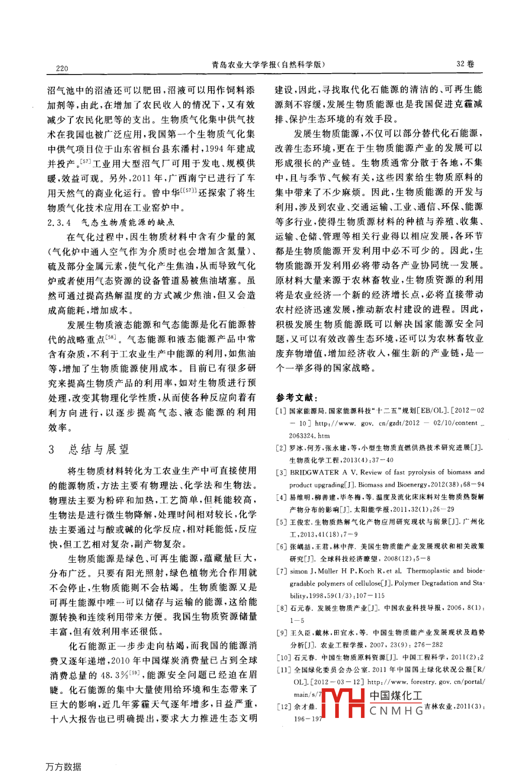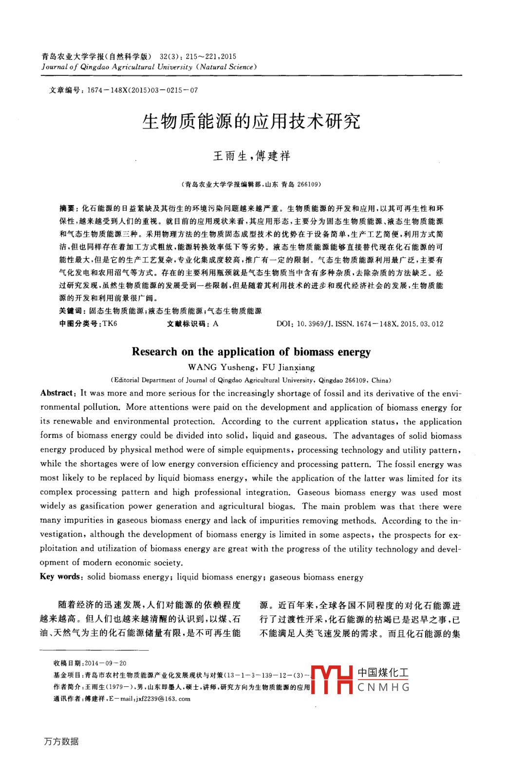 青島農(nóng)業(yè)大學學報(自然科學版)32(3):215~221,2015Journal of Qingdao Agricultural University(Natural Science)文章編號:1674-148X(2015)03-0215-07生物質(zhì)能源的應用技術(shù)研究王雨生,傅建祥(青島農(nóng)業(yè)大學學報編輯部,山東青島266109)摘要:化石能源的日益緊缺及其衍生的環(huán)境污染問題越來越嚴重。生物質(zhì)能源的開發(fā)和應用,以其可再生性和環(huán)保性,越來越受到人們的重視。就目前的應用現(xiàn)狀來看,其應用形態(tài),主要分為固態(tài)生物質(zhì)能源、液態(tài)生物質(zhì)能源和氣態(tài)生物質(zhì)能源三種。采用物理方法的生物質(zhì)固態(tài)成型技術(shù)的優(yōu)勢在于設(shè)備簡單,生產(chǎn)工藝簡便,利用方式簡潔,但也同樣存在著加工方式粗放,能源轉(zhuǎn)換效率低下等劣勢。液態(tài)生物質(zhì)能源能夠直接替代現(xiàn)在化石能源的可能性最大,但是它的生產(chǎn)工藝復雜,專業(yè)化集成度較高,推廣有一定的限制。氣態(tài)生物質(zhì)能源利用最廣泛,主要有氣化發(fā)電和農(nóng)用沼氣等方式。存在的主要利用瓶頸就是氣態(tài)生物質(zhì)當中含有多種雜質(zhì),去除雜質(zhì)的方法缺乏。經(jīng)過研究發(fā)現(xiàn),雖然生物質(zhì)能源的發(fā)展受到一些限制,但是隨著其利用技術(shù)的進步和現(xiàn)代經(jīng)濟社會的發(fā)展,生物質(zhì)能源的開發(fā)和利用前景很廣闊關(guān)鍵詞:固態(tài)生物質(zhì)能源;液態(tài)生物質(zhì)能源;氣態(tài)生物質(zhì)能源中圖分類號:TK6文獻標識碼:ADOI:10.3969/J.ISSN.1674-148X.2015.03.012Research on the application of biomass energyWANG Yusheng, Fu JianxiangEditorial Department of Journal of Qingdao Agricultural University, Qingdao 266109, China)Abstract: It was more and more serious for the increasingly shortage of fossil and its derivative of the environmental pollution. More attentions were paid on the development and application of biomass energy forits renewable and environmental protection. According to the current application status, the applicationforms of biomass energy could be divided into solid, liquid and gaseous. The advantages of solid biomassenergy produced by physical method were of simple equipments, processing technology and utility patternwhile the shortages were of low energy conversion efficiency and processing pattern. The fossil energy wasmost likely to be replaced by liquid biomass energy, while the application of the latter was limited for itcomplex processing pattern and high professional integration. Gaseous biomass energy was used mostwidely as gasification power generation and agricultural biogas. The main problem was that there weremany impurities in gaseous biomass energy and lack of impurities removing methods. According to the investigation, although the development of biomass energy is limited in some aspects, the prospects for ex-ploitation and utilization of biomass energy are great with the progress of the utility technology and development of modern economic society.Key words: solid biomass energy; liquid biomass energy; gaseous biomass energy隨著經(jīng)濟的迅速發(fā)展,人們對能源的依賴程度源。近百年來,全球各國不同程度的對化石能源進越來越高。但人們也越來越清醒的認識到,以煤、石行了過渡性開采,化石能源的枯竭已是遲早之事,已油、天然氣為主的化石能源儲量有限,是不可再生能不能滿足人類飛速發(fā)展的需求。而且化石能源的集收稿日期:2014-09-20基金項目:青島市農(nóng)村生物質(zhì)能源產(chǎn)業(yè)化發(fā)展現(xiàn)狀與對策(13-1-3-139-12-(3)-H中國煤化工作者簡介:王雨生(1979-),男,山東即墨人,碩士,講師,研究方向為生物質(zhì)能源的應用CNMHG通訊作者:傅建祥,E-mail:jxf2239@163.com216青島農(nóng)業(yè)大學學報(自然科學版)32卷中大量消耗,對人類居住的環(huán)境造成嚴重的污染,引先進的流化床反應器、循環(huán)流化床反應器、真空熱裂發(fā)全球氣溫升高,從而影響了生態(tài)環(huán)境。因此能源解反應器等生物質(zhì)制備設(shè)備。3-4美國在生物質(zhì)氣緊缺問題、環(huán)境污染問題已成為當今世界必須面對化發(fā)電方面處于世界領(lǐng)先地位,發(fā)電量已超過其利解決的重要問題,開發(fā)新的可再生綠色能源便成為用風能、太陽能、地熱能發(fā)電的總和。1980年,美各國面臨的重要課題。世界能源發(fā)展已進入新一輪國提出以生物柴油代替化石柴油戰(zhàn)略,2005年成為戰(zhàn)略調(diào)整期。生物質(zhì)能源是目前人類可利用綠色世界第一燃料乙醇生產(chǎn)大國。。巴西長期以來將推可再生能源之一,世界能源委員會將生物質(zhì)能源列廣乙醇燃料作為國家重要能源政策之一。美國和巴為可再生能源的首選。生物質(zhì)能源分布廣泛,幾乎西是世界上最大的燃料乙醇生產(chǎn)國。處處都有,各國對生物質(zhì)能源的開發(fā)與利用早已如1.2.2國內(nèi)研究現(xiàn)狀火如茶的展開了,有些技術(shù)已經(jīng)產(chǎn)業(yè)化我國生物質(zhì)直燃發(fā)電和氣化發(fā)電已逐步實現(xiàn)了產(chǎn)業(yè)化燃料乙醇技術(shù)正在起步應用,已建成燃料乙1生物質(zhì)能源概述醇示范廠;生物柴油技術(shù)已進入產(chǎn)業(yè)示范階段;大中1.1生物質(zhì)能源的生成機理型制氣工程工藝技術(shù)已日趨成熟。生物質(zhì)的直接、生物質(zhì)能源是地球上最普遍的一種可再生能間接液化生產(chǎn)液體燃料技術(shù)準備進行工業(yè)示范源,它