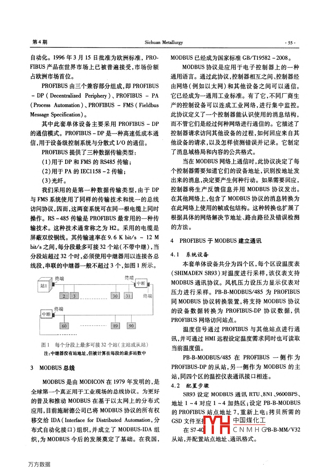第34卷第4期川冶金Vol 34 No 42012年8月Sichuan metallurgyAug.,2012文章編號(hào):1001-5108(2012)04-0054-04PROFIBUS與 MODBUS通訊應(yīng)用史劍(攀鋼集團(tuán)成都板材有限責(zé)任公司,四川成都610300)【摘要】本文以介紹攀鋼集團(tuán)成都板材連續(xù)熱鍍鋅鋁機(jī)組某一單體設(shè)備功能為引子,以實(shí)例重點(diǎn)介紹RROFIBUS與 MODBUS通訊協(xié)議的建立。【關(guān)鍵詞】熱鍍鋅鋁 PROFIBUS MODBUS【中圖分類號(hào)】TP273【文獻(xiàn)標(biāo)識(shí)碼】ATHE COMMUNICATION APPLICATION OF PROFIBUSBETWEEN MODBUSShi JiCold Strip Mill of PANZHIHUa iron STEEL Co., Chengdu 610300, Sichuan, ChiAbstract] This article introduced the device of continuous hot-dip galvanizing aluminum line, andbased on example PROFIBUS and MODBUS communicationKey words] hot-dip galvanizing aluminum, PROFIBUS, MODBUS1前言工處理環(huán)節(jié)多、全線張力控制嚴(yán)格、對(duì)生產(chǎn)的連續(xù)性要求高。成都板材連續(xù)熱鍍鋅鋁生產(chǎn)線按工藝可劃分為由于全線工藝復(fù)雜,其中焊機(jī)、糾偏裝置、鋅層入口段、清洗段、光整和拉矯段、出口段四大部分。測(cè)厚儀涂油機(jī)等單體設(shè)備均是由不同的公司單獨(dú)入口段分為上下兩通道交替運(yùn)行,以保證帶鋼在整設(shè)計(jì)及設(shè)備成套。絕大多數(shù)單體設(shè)備均采用同一種個(gè)機(jī)組的連續(xù)運(yùn)行,包括開(kāi)卷機(jī)焊機(jī)、張力輥、人口通訊協(xié)議,例如 PROFIBUS通訊協(xié)議其中某一套單活套等清洗段和光整拉矯段總稱為工藝段其作用體設(shè)備中采用兩種通訊協(xié)議,分別為 PROFIBUS和是對(duì)帶鋼進(jìn)行清洗退火涂鍍、光整、拉矯、表面涂 MODBUS協(xié)議,本文重點(diǎn)介紹如何將這兩種協(xié)議融層處理等,主要包括張力輥、電解清洗、立式退火爐合在同一設(shè)備中。鋅/鋅鋁鍋、氣刀、鍍后冷卻、光整機(jī)、拉矯機(jī)、臥/立式輥涂機(jī)、感應(yīng)加熱爐等;出口段同樣分為兩個(gè)通道2 PROFIBUS現(xiàn)場(chǎng)總線運(yùn)行,兩通道均迅速對(duì)帶鋼進(jìn)行卷取,保證生產(chǎn)的連PROFIBUS是一種國(guó)際化、開(kāi)放式、不依賴于設(shè)續(xù),主要包括出口活套、張力輥、卷取機(jī)等。整個(gè)熱備生產(chǎn)商的現(xiàn)場(chǎng)總線標(biāo)準(zhǔn)。廣泛適用于制造業(yè)自動(dòng)鍍鋅鋁機(jī)組的特點(diǎn)是生產(chǎn)線長(zhǎng)傳動(dòng)設(shè)備多帶鋼加化、流程工業(yè)自中國(guó)煤化工海其他領(lǐng)域CNMHG作者簡(jiǎn)介:史劍,男,現(xiàn)在成都板材從事熱鍍鋅鋁機(jī)組設(shè)備管理工作。第4期Sichuan Metallurgy55·自動(dòng)化。1996年3月15日批準(zhǔn)為歐洲標(biāo)準(zhǔn),PRO- MODBUS已經(jīng)成為國(guó)家標(biāo)準(zhǔn)GBT19582-2008。FIBUS產(chǎn)品在世界市場(chǎng)上已被普遍接受,市場(chǎng)份額MODBUS協(xié)議是應(yīng)用于電子控制器上的一種占?xì)W洲市場(chǎng)首位。通用語(yǔ)言。通過(guò)此協(xié)議,控制器相互之間、控制器經(jīng)PROFIBUS由三個(gè)兼容部分組成,即 PROFIBUS由網(wǎng)絡(luò)(例如以太網(wǎng))和其他設(shè)備之間可以通信。DP( Decentralized Periphery)、 PROFIBUS-PA它已經(jīng)成為一通用工業(yè)標(biāo)準(zhǔn)。有了它,不同廠商生( Process Automation)、 PROFIBUS-FMs( Fieldbus產(chǎn)的控制設(shè)備可以連成工業(yè)網(wǎng)絡(luò),進(jìn)行集中監(jiān)控。Message Specification)此協(xié)議定義了一個(gè)控制器能認(rèn)識(shí)使用的消息結(jié)構(gòu),其中此套單體設(shè)備主要采用 PROFIBUS-DP而不管它們是經(jīng)過(guò)何種網(wǎng)絡(luò)進(jìn)行通信的。它描述了的通信模式。 PROFIBUS-DP是一種高速低成本通控制器請(qǐng)求訪問(wèn)其他設(shè)備的過(guò)程,如何回應(yīng)來(lái)自其信,用于設(shè)備級(jí)控制系統(tǒng)與分散式LO的通信。他設(shè)備的請(qǐng)求,以及怎樣偵測(cè)錯(cuò)誤并記錄。它制定PROFIBUS提供了三種數(shù)據(jù)傳輸類型:了消息域格局和內(nèi)容的公共格式。(1)用于DP和FMS的RS485傳輸;當(dāng)在 MODBUS網(wǎng)絡(luò)上通信時(shí),此協(xié)議決定了每(2)用于PA的IEC1158-2傳輸個(gè)控制器需要知道它們的設(shè)備地址,識(shí)別按地址發(fā)(3)光纖。出來(lái)的消息,決定要產(chǎn)生何種行動(dòng)。如果需要回應(yīng),我們采用的是第一種數(shù)據(jù)傳輸類型,由于DP控制器將生產(chǎn)反饋信息并用 MODBUS協(xié)議發(fā)出與FMS系統(tǒng)使用了同樣的傳輸技術(shù)和統(tǒng)一的總線在其他網(wǎng)絡(luò)上,包含了 MODBUS協(xié)議的消息轉(zhuǎn)換為訪問(wèn)協(xié)議,因而,這兩套系統(tǒng)可在同一根電纜上同時(shí)在此網(wǎng)絡(luò)上使用的幀或包結(jié)構(gòu)。這種轉(zhuǎn)換也擴(kuò)展了操作。RS-485傳輸是 PROFIBUS最常用的一種傳根據(jù)具體的網(wǎng)絡(luò)解決節(jié)地址、路由路徑及錯(cuò)誤檢測(cè)輸技術(shù)。這種技術(shù)通常稱之為H2。采用的電纜是的方法。屏蔽雙絞銅線。其傳輸速率在9.6Kbi/s~12M4 PROFIBUS于 MODBUS建立通訊bit/s之間,每分段最多可接32個(gè)站(不帶中繼),當(dāng)分段站超過(guò)32個(gè)時(shí),必須使用中繼器用以連接各總41系統(tǒng)設(shè)備線段串聯(lián)的中繼器一般不超過(guò)3個(gè),如圖1所示。本套單體設(shè)備共分為四個(gè)區(qū),每個(gè)區(qū)設(shè)溫度表(