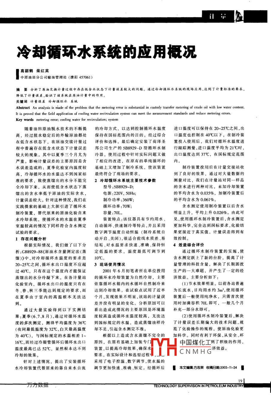 i|:冷卻循環(huán)水系統(tǒng)的應(yīng)用概況高韶鶴柴紅英中原油田分公司輸油管理處(濮陽(yáng)457061)摘要分析了原油交換計(jì)量過(guò)程中存在低含水狀態(tài)下計(jì)量誤差較大的冋題。通過(guò)冷卻循環(huán)水系統(tǒng)的現(xiàn)場(chǎng)應(yīng)用,達(dá)到了計(jì)量標(biāo)準(zhǔn)的要求,降低了計(jì)量誤差,驗(yàn)證了該系統(tǒng)在原油計(jì)量中的作用關(guān)鍵詞計(jì)量誤差冷卻循環(huán)水系統(tǒng)Abstract An analysis is made of the problem that the metering error is substantial in custody transfer metering of crude oil with low water content.It is proved that the field application of cooling water recirculation system can meet the measurement standards and reduce metering errors.Key words metering error; cooling water for recirculation; system隨著油田原油脫水技術(shù)的不斷提的冷卻方式,以達(dá)到控制循環(huán)水溫度進(jìn)口溫度可以保持在20~25℃之間,出高,經(jīng)過(guò)脫水穩(wěn)定后的外輸原油都處保持在國(guó)標(biāo)范圍內(nèi)的目的。經(jīng)過(guò)綜合口溫度也控制在40℃以下,在制冷裝在低含水狀態(tài)下,在原油交接計(jì)量過(guò)評(píng)價(jià)和選擇,最后確定安裝了荷澤圣置投入使用后,我們對(duì)循環(huán)水溫度進(jìn)程中普遍存在低含水狀態(tài)下計(jì)量誤差邦公司生產(chǎn)的SB8929-D型循環(huán)水制行跟蹤測(cè)量,進(jìn)口溫度平均為21℃時(shí),較大的現(xiàn)象。其中以夏季三個(gè)月尤為冷器。使用過(guò)程中針對(duì)實(shí)際問(wèn)題又做出口溫度達(dá)到37℃,在國(guó)標(biāo)規(guī)定范嚴(yán)重。影響計(jì)量誤差的主要原因是含了相應(yīng)的改進(jìn),在原有的單純循環(huán)的內(nèi)水誤差造成的:夏季化驗(yàn)室內(nèi)溫度較基礎(chǔ)上又增加了制冷系統(tǒng),使該裝置制冷裝置投用后在計(jì)量交接站收高,冷卻循環(huán)水的水溫達(dá)不到國(guó)家標(biāo)最終符合了現(xiàn)場(chǎng)的要求到了良好的效果,通過(guò)對(duì)大量數(shù)據(jù)的準(zhǔn)的要求,致使蒸餾出的水分不能完2冷卻循環(huán)水系統(tǒng)主要技術(shù)參數(shù)測(cè)量對(duì)比,我們?cè)谟?jì)量站對(duì)同一樣品全冷卻下來(lái),從而使低含水狀態(tài)下蒸型號(hào):SB8929-D的含水進(jìn)行兩種對(duì)比,未加冷卻裝置餾出的含水率低于原油的實(shí)際含水,電源:220V,50Hz;的平均含水為0.035%,加制冷裝置后計(jì)量誤差較大。針對(duì)這種情況,我們?cè)谥评涔β?360W;的平均含水為0061%。實(shí)踐摸索的基礎(chǔ)上大膽引進(jìn)了循環(huán)水循環(huán)功率:70W;含水測(cè)定使用制冷裝置以后含水制冷裝置,替代原來(lái)的原油化驗(yàn)自來(lái)容量:70L明顯上升,平均上升0.026%。由此可水冷卻系統(tǒng),使循環(huán)水的水溫在夏季裝置特點(diǎn):該儀器具有節(jié)約用水、見(jiàn),使用循環(huán)水制冷裝置后,含水測(cè)定室溫較高的情況下同樣符合含水測(cè)定自動(dòng)循環(huán)、快速制冷等特點(diǎn),并且采用更加科學(xué),完全達(dá)到國(guó)標(biāo)要求,化驗(yàn)結(jié)試驗(yàn)的要求。數(shù)字調(diào)節(jié)溫度自動(dòng)恒溫(制冷系統(tǒng)自果更接近于真實(shí)值,計(jì)量誤差得到有1存在問(wèn)題分析動(dòng)開(kāi)啟、關(guān)閉),很適合前線水質(zhì)差、易效控制。根據(jù)實(shí)際情況,我們做了以下分結(jié)垢、對(duì)水溫要求快速、準(zhǔn)確、保持恒4效益線合評(píng)價(jià)析:GB8929-88《原油水含量測(cè)定法(蒸定低溫的要求,溫度最低可調(diào)節(jié)到通過(guò)循環(huán)水制冷裝置的實(shí)施,使餾)》中,對(duì)冷卻循環(huán)水溫度的要求是10℃。含水測(cè)定躍上了新的臺(tái)階,提高了計(jì)20~25℃之間,循環(huán)水出口溫度不應(yīng)超3現(xiàn)場(chǎng)使用情況量管理的科技含量,解決了長(zhǎng)期困擾過(guò)40℃,只有在這個(gè)溫度內(nèi)才能保證2001年6月初筆者所在單位投用生產(chǎn)的一大難題,并產(chǎn)生了一定的經(jīng)蒸餾出的水分冷凝下來(lái)。在各計(jì)量站的循環(huán)水冷卻裝置為自然冷卻,主要濟(jì)效益。主要分析如下:化驗(yàn)室內(nèi),循環(huán)水出口的溫度只有在依靠循環(huán)水箱內(nèi)的水循環(huán)自然制冷來(lái)(1)節(jié)水效果明顯。以前各站普遍冬、春、秋三季能達(dá)到規(guī)定的要求,而達(dá)到冷卻效果。在試驗(yàn)點(diǎn)試用了近半為長(zhǎng)流水,日均用水約3m3,使用循環(huán)在夏季由于室內(nèi)的高溫根本無(wú)法達(dá)個(gè)月,發(fā)現(xiàn)效果不明顯,該站的計(jì)量誤裝置后一般使用純凈水,只需首次使到差并沒(méi)有明顯的變化。分析原因可以用時(shí)加滿容積70L即可,一般幾個(gè)月通過(guò)大量實(shí)驗(yàn)得到以下實(shí)測(cè)結(jié)看出造成此情況的主要原因是環(huán)境溫補(bǔ)充一部分水即可果:夏季(6、7、8月),通過(guò)對(duì)循環(huán)水溫度較高造成循環(huán)水溫度較高,無(wú)法達(dá)(2)使用循環(huán)水制冷裝置后,解決度的多次測(cè)定,測(cè)得平均溫度為36℃到國(guó)標(biāo)規(guī)定的水溫,造成蒸餾油樣冷了計(jì)量誤差長(zhǎng)期偏大的技術(shù)問(wèn)題,規(guī)(夜間最低溫度為32℃,白天最高溫度卻不足,引起含水測(cè)定不準(zhǔn)。范了化驗(yàn)操作的規(guī)程,使原