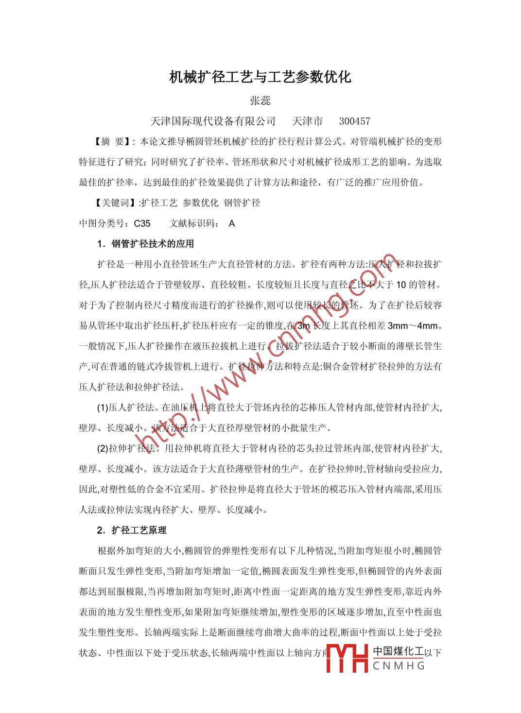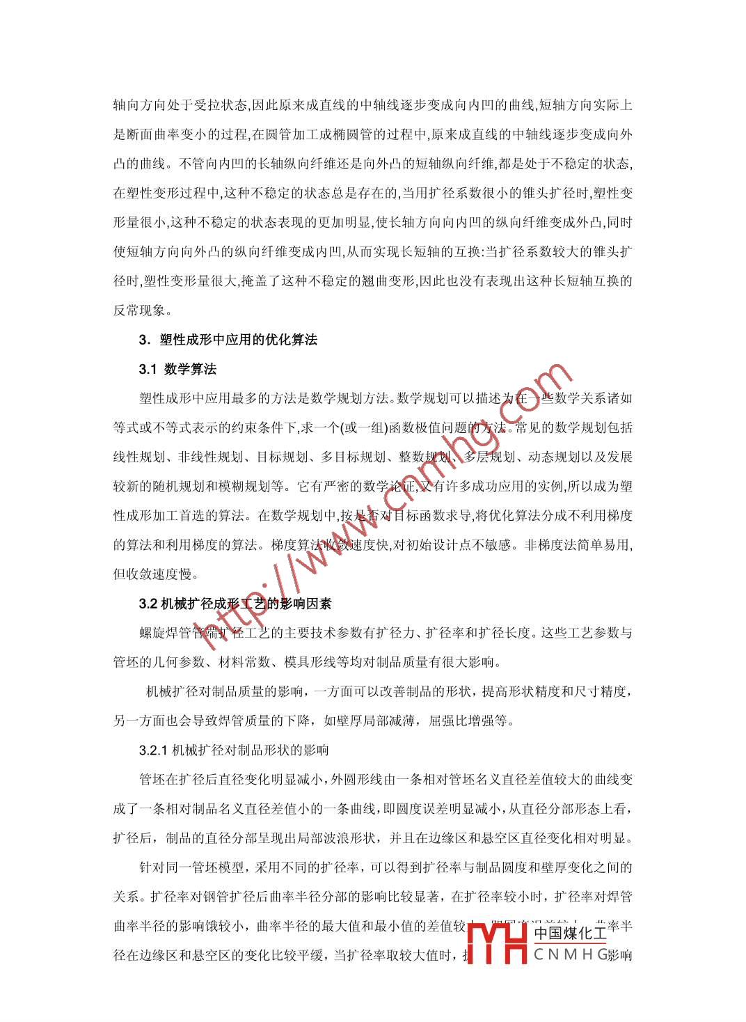 機(jī)械擴(kuò)徑工藝與工藝參數(shù)優(yōu)化張蕊天津國(guó)際現(xiàn)代設(shè)備有限公司天津市300457【摘要】:本論文推導(dǎo)橢圓管坯杋械擴(kuò)徑的擴(kuò)徑行程計(jì)算公式。對(duì)管端機(jī)械擴(kuò)徑的變形特征進(jìn)行了研究;同時(shí)研究了擴(kuò)徑率、管坯形狀和尺寸對(duì)機(jī)械擴(kuò)徑成形工藝的影響。為選取最佳的擴(kuò)徑率,達(dá)到最佳的擴(kuò)徑效果提供了計(jì)算方法和途徑,有廣泛的推廣應(yīng)用價(jià)值。【關(guān)鍵詞】:擴(kuò)徑工藝參數(shù)優(yōu)化鋼管擴(kuò)徑中圖分類號(hào):C35文獻(xiàn)標(biāo)識(shí)碼:A1.鋼管擴(kuò)徑技術(shù)的應(yīng)用擴(kuò)徑是一種用小直徑管坯生產(chǎn)大直徑管材的方法。擴(kuò)徑有兩種方法:壓人擴(kuò)徑和拉拔擴(kuò)徑,壓人擴(kuò)徑法適合于管壁較厚、直徑較粗、長(zhǎng)度較短且長(zhǎng)度與直徑之比不大于10的管材。對(duì)于為了控制內(nèi)徑尺寸精度而進(jìn)行的擴(kuò)徑操作,則可以使用較長(zhǎng)的管坯。為了在擴(kuò)徑后較容易從管坯中取出擴(kuò)徑壓桿,擴(kuò)徑壓桿應(yīng)有一定的錐度,在3m長(zhǎng)度上其直徑相差3mm~4mm。般情況下,壓人擴(kuò)徑操作在液壓拉拔杋上進(jìn)行。拉拔擴(kuò)徑法適合于較小斷面的薄壁長(zhǎng)管生產(chǎn),可在普通的鏈?zhǔn)嚼浒喂軝C(jī)上進(jìn)行。擴(kuò)徑拉伸方法和特點(diǎn)是:銅合金管材擴(kuò)徑拉伸的方法有壓人擴(kuò)徑法和拉伸擴(kuò)徑法。(1)壓人擴(kuò)徑法。在油壓杋上將直徑大于管坯內(nèi)徑的芯棒壓人管材內(nèi)部使管材內(nèi)徑擴(kuò)大,壁厚、長(zhǎng)度減小。該方法適合于大直徑厚壁管材的小批量生(2)拉伸擴(kuò)徑法。用拉伸機(jī)將直徑大于管材內(nèi)徑的芯頭拉過管坯內(nèi)部,使管材內(nèi)徑擴(kuò)大,壁厚、長(zhǎng)度減小。該方法適合于大直徑薄壁管材的生產(chǎn)。在擴(kuò)徑拉伸時(shí),管材軸向受拉應(yīng)力,因此對(duì)塑性低的合金不宜采用。擴(kuò)徑拉伸是將直徑大于管坯的模芯壓入管材內(nèi)端部,采用壓人法或拉伸法實(shí)現(xiàn)內(nèi)徑擴(kuò)大、壁厚、長(zhǎng)度減小。2.擴(kuò)徑工藝原理根據(jù)外加彎矩的大小,橢圓管的彈塑性變形有以下幾種情況,當(dāng)附加彎矩很小時(shí),橢圓管斷面只發(fā)生彈性變形,當(dāng)附加彎矩增加一定值,橢圓表面發(fā)生彈性變形,但橢圓管的內(nèi)外表面都達(dá)到屈服極限,當(dāng)再增加附加彎矩時(shí),距離中性面一定距離的地方發(fā)生彈性變形,靠近內(nèi)外表面的地方發(fā)生塑性變形,如果附加彎矩繼續(xù)增加,塑性變形的區(qū)域逐步增加,直至中性面也發(fā)生塑性變形。長(zhǎng)軸兩端實(shí)際上是斷面繼續(xù)彎曲增大曲率的過程,斷面中性面以上處于受拉狀態(tài)、中性面以下處于受壓狀態(tài),長(zhǎng)軸兩端中性面以上軸向方TH中國(guó)煤化工以下CNMHG軸向方向處于受拉狀態(tài),因此原來成直線的中軸線逐步變成向內(nèi)凹的曲線,短軸方向?qū)嶋H上是斷面曲率變小的過程,在圓管加工成橢圓管的過程中,原來成直線的中軸線逐步變成向外凸的曲線。不管向內(nèi)凹的長(zhǎng)軸縱向纖維還是向外凸的短軸縱向纖維都是處于不穩(wěn)定的狀態(tài),在塑性變形過程中,這種不穩(wěn)定的狀態(tài)總是存在的,當(dāng)用擴(kuò)徑系數(shù)很小的錐頭擴(kuò)徑時(shí),塑性變形量很小,這種不穩(wěn)定的狀態(tài)表現(xiàn)的更加明顯,使長(zhǎng)軸方向向內(nèi)凹的縱向纖維變成外凸,同時(shí)使短軸方向向外凸的縱向纖維變成內(nèi)凹,從而實(shí)現(xiàn)長(zhǎng)短軸的互換:當(dāng)擴(kuò)徑系數(shù)較大的錐頭擴(kuò)徑時(shí),塑性變形量很大,掩蓋了這種不穩(wěn)定的翹曲變形,因此也沒有表現(xiàn)岀這種長(zhǎng)短軸互換的反常現(xiàn)象。3.塑性成形中應(yīng)用的優(yōu)化算法3.1數(shù)學(xué)算法塑性成形中應(yīng)用最多的方法是數(shù)學(xué)規(guī)劃方法。數(shù)學(xué)規(guī)劃可以描述為在一些數(shù)學(xué)關(guān)系諸如等式或不等式表示的約束條件下,求一個(gè)(或一組)函數(shù)極值問題的方法。常見的數(shù)學(xué)規(guī)劃包括線性規(guī)劃、非線性規(guī)劃、目標(biāo)規(guī)劃、多目標(biāo)規(guī)劃、整數(shù)規(guī)劃、多層規(guī)劃、動(dòng)態(tài)規(guī)劃以及發(fā)展較新的隨機(jī)規(guī)劃和模糊規(guī)劃等。它有嚴(yán)密的數(shù)學(xué)論證,又有許多成功應(yīng)用的實(shí)例,所以成為塑性成形加工首選的算法。在數(shù)學(xué)規(guī)劃中,按是否對(duì)目標(biāo)函數(shù)求導(dǎo),將優(yōu)化算法分成不利用梯度的算法和利用梯度的算法。梯度算法收斂速度快,對(duì)初始設(shè)計(jì)點(diǎn)不敏感。非梯度法簡(jiǎn)單易用,但收斂速度慢。32機(jī)械擴(kuò)徑成形工藝的影響因素螺旋焊管管端擴(kuò)徑工藝的主要技術(shù)參數(shù)有擴(kuò)徑力、擴(kuò)徑率和擴(kuò)徑長(zhǎng)度。這些工藝參數(shù)與管坯的幾何參數(shù)、材料常數(shù)、模具形線等均對(duì)制品質(zhì)量有很大影響。機(jī)械擴(kuò)徑對(duì)制品質(zhì)量的影響,一方面可以改善制品的形狀,提高形狀精度和尺寸精度,另一方面也會(huì)導(dǎo)致焊管質(zhì)量的下降,如壁厚局部