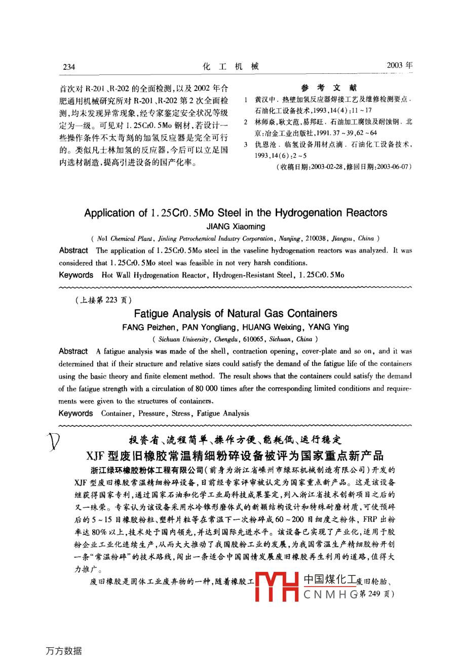 第30卷第4期化工機(jī)械221天然氣貯罐的疲勞分析方佩珍**潘永亮黃衛(wèi)星楊穎(四川大學(xué))摘要用壓力容器的基本理論和有限單元法等對(duì)夭然氣貯罐的殼體、緊縮口、平蓋等構(gòu)件進(jìn)行疲勞性能分祈,確定結(jié)構(gòu)及相關(guān)尺寸是否滿足該設(shè)備疲勞壽命的要求。結(jié)果表明,在對(duì)貯罐結(jié)構(gòu)給出了相應(yīng)的限制條件和要求后,該貯罐滿足循環(huán)次數(shù)n=80000次條件下的疲勞強(qiáng)度要求。關(guān)鍵詞貯罐壓力應(yīng)力疲勞分析中圖分類號(hào)TQ53.2文獻(xiàn)標(biāo)識(shí)碼A文章編號(hào)02546094(2003)04022404天然氣貯罐是供貯存精脫硫天然氣的容器。當(dāng)貯罐裝入高壓天然氣后,再通過它向車用鋼瓶充氣。貯罐工作過程承受升壓、降壓的交變載荷作用,在貯罐焊縫、接管及其他結(jié)構(gòu)不連續(xù)的區(qū)域,因產(chǎn)生塑性應(yīng)變的高應(yīng)力區(qū)容易導(dǎo)致容器的疲勞破壞。為了避免貯罐的失效,必須對(duì)貯罐各部件進(jìn)行詳細(xì)應(yīng)力計(jì)算,并根據(jù)應(yīng)力計(jì)算結(jié)果對(duì)貯罐進(jìn)行疲勞分析。1貯罐技術(shù)參數(shù)介質(zhì)精脫硫天然氣pns<2mg/m(標(biāo))設(shè)計(jì)壓力P26Ma最低工作壓力pm7MP圖1貯罐的結(jié)構(gòu)簡(jiǎn)圖工作溫度50℃2.1筒體循環(huán)次數(shù)n80000次筒體采用多層包扎式結(jié)構(gòu),內(nèi)層材料為202貯罐的疲勞分析厚度20m,層板材料為16MnR,板厚8mm,共7貯罐的結(jié)構(gòu)如圖1所示。罐體由筒體、球形層。由于采用優(yōu)質(zhì)薄板而承擔(dān)該設(shè)備的制造廠封頭和緊縮口組成,緊縮頭小端通過螺栓與平蓋家具有長(zhǎng)期生產(chǎn)多層包扎式厚壁筒的成熟經(jīng)驗(yàn),連接。通過對(duì)貯罐各部件的詳細(xì)應(yīng)力分析,圖1因此能完全保證設(shè)備的質(zhì)量。在對(duì)該筒體進(jìn)行應(yīng)中各部件的結(jié)構(gòu)尺寸均滿足按應(yīng)力分類法設(shè)計(jì)的力分析時(shí),將多層包扎式殼體等效為整體殼壁。強(qiáng)度條件。在此基礎(chǔ)上進(jìn)行疲勞分析以確保結(jié)容器在工作過程中的壓力波動(dòng)范圍△P=9MPa。構(gòu)承受預(yù)計(jì)的循環(huán)載荷而不發(fā)生疲勞破壞的能筒體疲勞問題主要考慮筒體焊縫及筒體上的力。因?yàn)楣ぷ鳒囟炔惑{,計(jì)算時(shí)忽略溫度對(duì)材料開孔接管影響對(duì)于筒體焊縫,根據(jù)JB4732,其疲彈性模量的影響。在以下分析中,材料的許用應(yīng)勞強(qiáng)度減弱系數(shù)取K=2.0。計(jì)算表明,筒體在力幅按JB4732標(biāo)準(zhǔn)確定?!鱬影響下的交變應(yīng)力幅為68.01MPa,而由材料*四川省應(yīng)用基礎(chǔ)研究項(xiàng)目(01GY051406)中國(guó)煤化工方佩珍,女,1975年6月生碩士生。四川省成都市,.61006CNMHG222化工機(jī)械2003年的設(shè)計(jì)疲勞曲線查得許可應(yīng)力幅為146.4MPa,即K=146.4/68.01=2.15>K,這表明筒體的疲勞強(qiáng)度是滿足要求的對(duì)于筒體上開孔問題,開孔接管采用與殼體全焊透的形式按應(yīng)力指數(shù)法計(jì)算出應(yīng)力集中系數(shù)K=33,即K1>K,這表明筒體上開孔不能滿足疲勞強(qiáng)度的要求。設(shè)計(jì)要求筒體上不得設(shè)置任何形式的開孔,而應(yīng)將必要的開孔設(shè)置在端蓋上。圖2平蓋示意圖22球形封頭條件下板中心處的交變應(yīng)力幅為29.51MPa,板材球形封頭采用鋼板沖壓成型,材料為20R,由的許用應(yīng)力強(qiáng)度幅與操作時(shí)的交變應(yīng)力幅之比K于沖壓過程中的變形導(dǎo)致封頭厚度不等,即使經(jīng)=4.54。平板中心附近開孔接管的應(yīng)力集中系數(shù)過機(jī)加工后保證封頭與筒體厚度相等但封頭頂K不會(huì)超過上述K值表明平板中心區(qū)域能滿足點(diǎn)處仍然較薄。分析時(shí)以封頭最薄處考慮。計(jì)算相應(yīng)疲勞壽命的要求。表明,由材料的設(shè)計(jì)疲勞曲線得到的許用應(yīng)力幅平板密封面處環(huán)形斷面是平蓋的薄弱環(huán)節(jié)與操作時(shí)的交變應(yīng)力幅之比K=3.82。封頭因沖計(jì)算該處的彎曲應(yīng)力和剪應(yīng)力按第三強(qiáng)度理論壓成型使厚度不均但厚度變化是平緩的經(jīng)機(jī)加得交變應(yīng)力幅為9.86MPa,許用應(yīng)力幅與交變應(yīng)工后其厚度變化的絕對(duì)值并不大,不會(huì)對(duì)分析結(jié)力幅之比K=4.48,考慮到結(jié)構(gòu)造成的應(yīng)力集中果產(chǎn)生大的影響。因此封頭自身滿足工作條件和偏于保守的計(jì)算方法,其結(jié)構(gòu)的疲勞強(qiáng)度是滿下的疲勞強(qiáng)度要求。足要求的因工藝需要球形封頭上有開孔接管設(shè)計(jì)采2.5螺栓用厚壁管,并與殼體完全焊透,內(nèi)、外表面圓滑過考慮螺栓連接系統(tǒng)的剛度修正后,螺栓波動(dòng)渡。按應(yīng)力指數(shù)法可得該結(jié)構(gòu)的應(yīng)力集中系數(shù)K=22,則KK,所以螺栓疲勞壽命滿足n=8000次的要求2.6緊縮口緊縮口將內(nèi)徑D,=805mm筒體逐漸過渡至d=400mm的人孔接口。緊縮口結(jié)構(gòu)有多種形周向應(yīng)力式,通過對(duì)不同結(jié)構(gòu)的分析比較,并結(jié)合緊縮口的經(jīng)向座力加工特點(diǎn),設(shè)計(jì)時(shí)使過渡區(qū)具有更多金屬的平滑軸向距離/mm過渡,最后采用不同半徑的反向曲線過渡結(jié)構(gòu),如圖3所示圖5外壁徑向、周向應(y