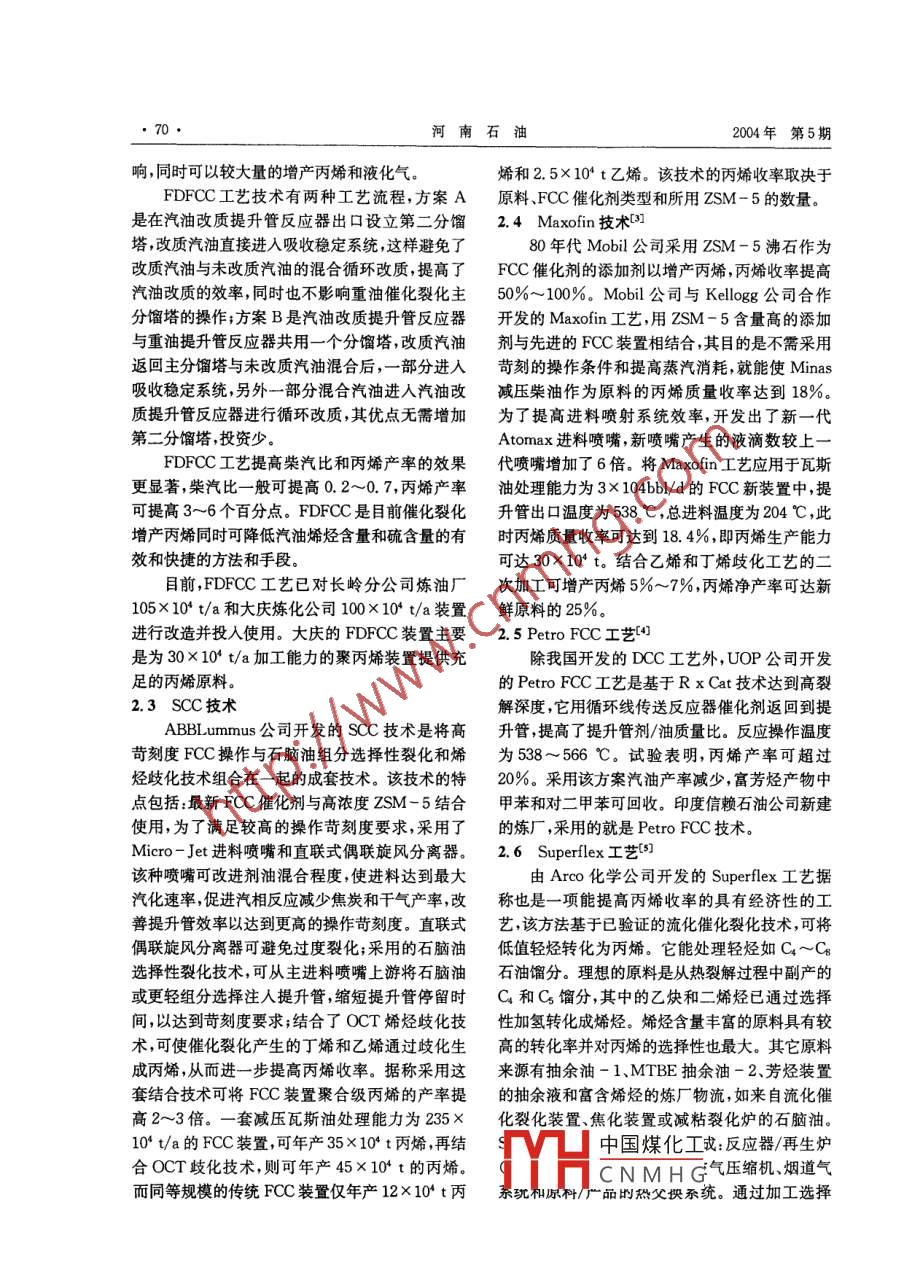 004年9月Henan Petroleum第18卷第5期文章編號(hào):1006-4095(200405-0069-03FCC裝置增產(chǎn)丙烯技術(shù)魏小波(洛陽(yáng)石化工程公司工程研究院,河南洛陽(yáng)471003)摘要:為了滿足丙烯霄求量增加的需要,依托FCC開(kāi)發(fā)了增產(chǎn)丙烯的工藝和催化劑以及助劑技術(shù),工藝技術(shù)包括:深度催化裂化(DC)、靈活多效催化裂化工藝( FDFCC)、選擇性裂化(SCC)技術(shù);利用ZSM-5分子篩開(kāi)發(fā)的LP助劑和催化劑均有良好的增產(chǎn)丙烯效果關(guān)鍵詞:丙烯;催化裂化;工藝;催化劑;助劑中圖分類(lèi)號(hào):TE622文獻(xiàn)標(biāo)識(shí)碼:B1丙烯的需求Superflex工藝技術(shù),KBR和 Mobil公司的Maxofin工藝, Exxon公司的 FlexicrackingⅢR丙烯是僅次于乙烯的最重要的基本有機(jī)原料工藝,UOP公司的 PetroFAC技術(shù)之一,其最大用途是生產(chǎn)聚丙烯約占52%,其次2.1DCC技術(shù)是丙烯腈12%環(huán)氧丙烷7%異丙苯7%異丙DCC技術(shù)被認(rèn)為是解決丙烯資源短缺的醇4%羰基醇9%和其他9%。據(jù)CMAI報(bào)道,條有效途徑,該技術(shù)工藝流程類(lèi)似于催化裂化工近年來(lái)全球丙烯需求年增長(zhǎng)率達(dá)到6.3%其需藝,以蠟油為原料,在538~582℃、10%~30%蒸求增長(zhǎng)速度已大大超過(guò)乙烯。丙烯需求量快速增汽條件下生產(chǎn)低分子烯烴。根據(jù)所用催化劑的不長(zhǎng)的主要原因是由于衍生物聚丙烯的需求高速增同分為最大量丙烯(DCC-I型)和最大量異構(gòu)烯長(zhǎng)所致,聚丙烯需求年均增長(zhǎng)率為9%,大大高于烴(DCC-Ⅱ)兩種操作方案。DCC-I方案以制其他丙烯行生物的增長(zhǎng)率。2002年世界化工用取丙烯為主,兼產(chǎn)丁烯、乙烯和高辛烷值汽油組丙烯產(chǎn)量為5950×104t。專(zhuān)家預(yù)測(cè)全世界將面分??蓪⒅販p壓餾分(HvGO轉(zhuǎn)化成50%以上臨丙烯短缺問(wèn)題,到2010年全球丙烯需求量將達(dá)的氣體,其中3/4為液化氣,而液化氣中85%左到8920×104t。據(jù)估計(jì),到2005年我國(guó)丙烯右為丙烯。該技術(shù)于1990年在濟(jì)南煉油廠6需求量將達(dá)705×10t,而到2010年丙烯生產(chǎn)能10t/a工業(yè)裝置上試運(yùn)轉(zhuǎn)成功。目前已有6套力才達(dá)660×10t,因而增產(chǎn)丙烯符合我國(guó)未來(lái)DC工藝裝置處于運(yùn)轉(zhuǎn)建設(shè)或設(shè)計(jì)中。DCC石油化工原料市場(chǎng)的需要。丙烯與其他化學(xué)品不I型技術(shù)的丙烯和丁烯收率明顯高于傳統(tǒng)FCC同,它一般是以聯(lián)產(chǎn)品或副產(chǎn)品方式得到。目前工藝,也高于蒸汽裂解制乙烯的聯(lián)產(chǎn)丙烯,可生產(chǎn)全球丙烯約有70%來(lái)自蒸汽裂解制乙烯的聯(lián)產(chǎn),3.5倍FCC裝置的聚合級(jí)丙烯。28%來(lái)自煉廠(主要是催化裂化裝置)副產(chǎn),還有2.2 FDFCC工藝2%來(lái)自丙烷脫氫1洛陽(yáng)石化工程公司工程研究院開(kāi)發(fā)的FDF2工藝技術(shù)CC工藝,采用雙提升管工藝流程分別對(duì)劣質(zhì)重油和汽油在不同的工藝條件下進(jìn)行催化改質(zhì),不僅利用催化裂化增產(chǎn)丙烯已成為目前催化裂化可大幅度提高汽油改質(zhì)的效率,也避免了對(duì)重油技術(shù)發(fā)展的一大熱點(diǎn),已推出的技術(shù)有:中國(guó)石油催化裂化提升管反應(yīng)器的操作帶來(lái)任何不利影化工集團(tuán)公司石油化工科學(xué)研究院開(kāi)發(fā)的DCC技術(shù),中國(guó)石化集團(tuán)洛陽(yáng)石化工程公司工中國(guó)煤化工程研究院開(kāi)發(fā)的 FDFCC2; ABB Lummus公司收作業(yè)年生,1990年畢CNMHG化學(xué)專(zhuān)業(yè),一直從的選擇性組份裂化(SCC)技術(shù),Arco化學(xué)公司的開(kāi)發(fā)工作。電話:0379-4330530河南石油2004年第5期響同時(shí)可以較大量的增產(chǎn)丙烯和液化氣烯和2.5×10t乙烯。該技術(shù)的丙烯收率取決于FDFCC工藝技術(shù)有兩種工藝流程,方案A原料、FCC催化劑類(lèi)型和所用ZSM-5的數(shù)量。在汽油改質(zhì)提升管反應(yīng)器出口設(shè)立第二分餾2.4 Maxofin技術(shù)塔,改質(zhì)汽油直接進(jìn)入吸收穩(wěn)定系統(tǒng),這樣避免了80年代Mob公司采用ZSM-5沸石作為改質(zhì)汽油與未改質(zhì)汽油的混合循環(huán)改質(zhì)提高了FCC催化劑的添加劑以增產(chǎn)丙烯丙烯收率提高汽油改質(zhì)的效率同時(shí)也不影響重油催化裂化主50%~100%。Mobl公司與 Kellogg公司合作分餾塔的操作;方案B是汽油改質(zhì)提升管反應(yīng)器開(kāi)發(fā)的 Maxofin工藝,用ZSM-5含量高的添加與重油提升管反應(yīng)器共用一個(gè)分餾塔,改質(zhì)汽油劑與先進(jìn)的FCC裝置相結(jié)合,其目的是不需采用返回主分餾塔與未改質(zhì)汽油混合后,一部分進(jìn)入苛刻的操作條件和提高蒸汽消耗,就能使 Minas吸收穩(wěn)定系統(tǒng),另外一部分混合汽油進(jìn)入汽油改減壓柴油作為原料的丙烯質(zhì)量收率達(dá)到18%質(zhì)提升管反應(yīng)器進(jìn)行循環(huán)改質(zhì),其優(yōu)點(diǎn)無(wú)需增加為了提高進(jìn)料噴射系統(tǒng)效率,開(kāi)發(fā)出了新一代第二分餾塔,投資少Atomax進(jìn)料噴嘴,新噴嘴產(chǎn)生的液滴數(shù)較上FDFCC工藝提高柴汽比和丙烯產(chǎn)率的效果代噴嘴增加了6倍。將 Maxofin工藝應(yīng)用于瓦斯更顯著,柴汽比一般可提高0.2~0.7,丙烯產(chǎn)率油處理能力為3×104bbd的FCC新裝置中,提可提高3~6個(gè)百分點(diǎn)。 FDFCC是目前催化裂化升管